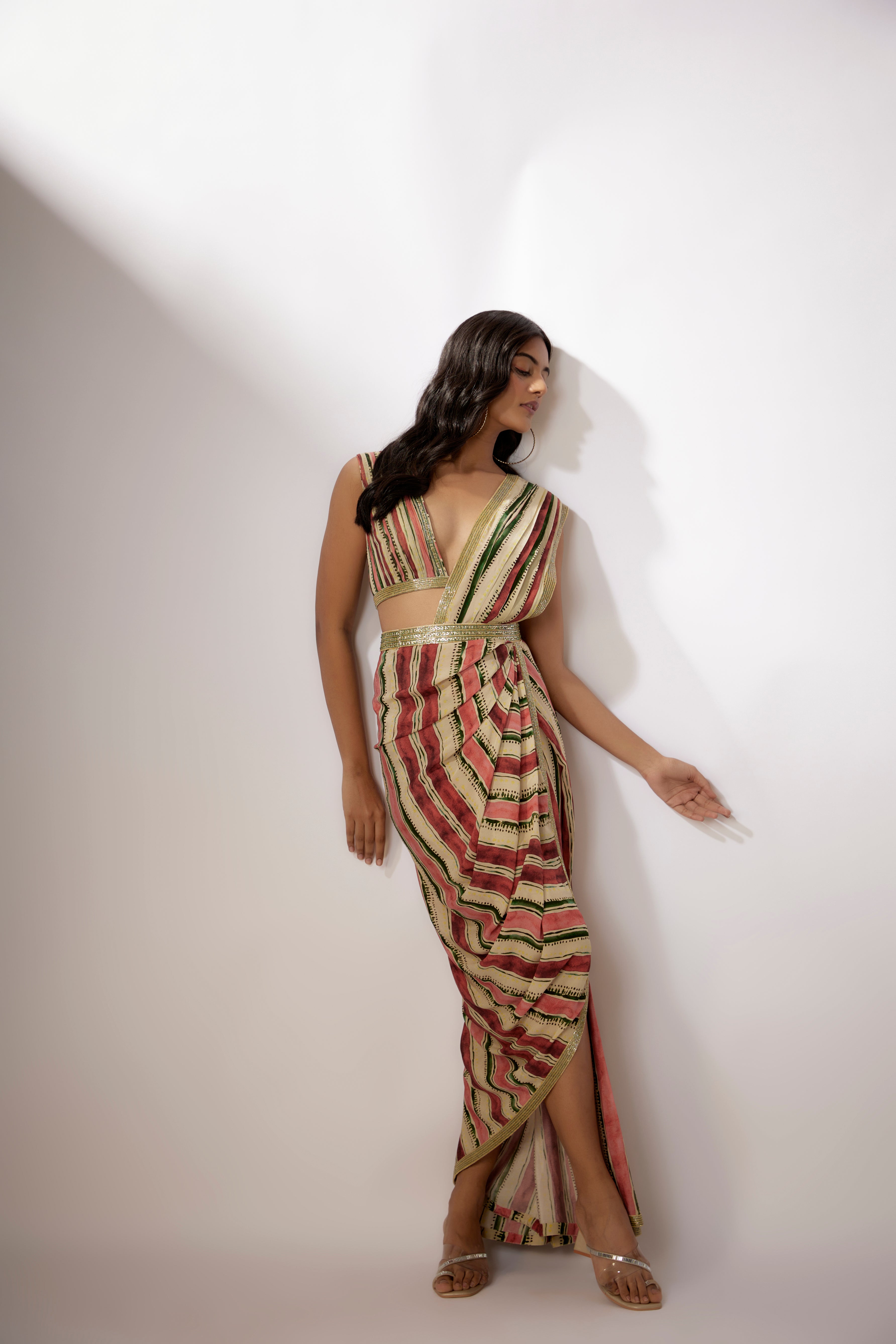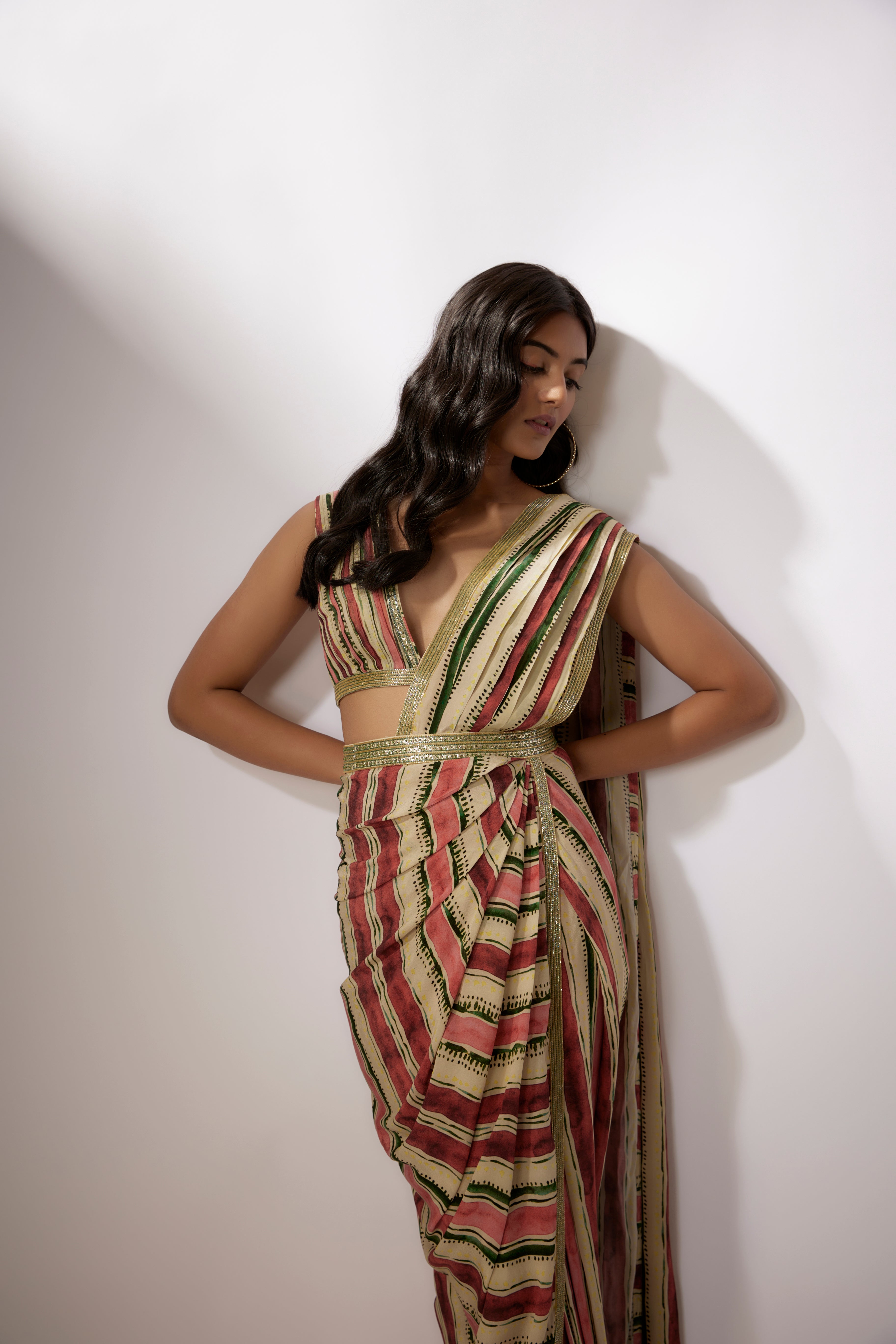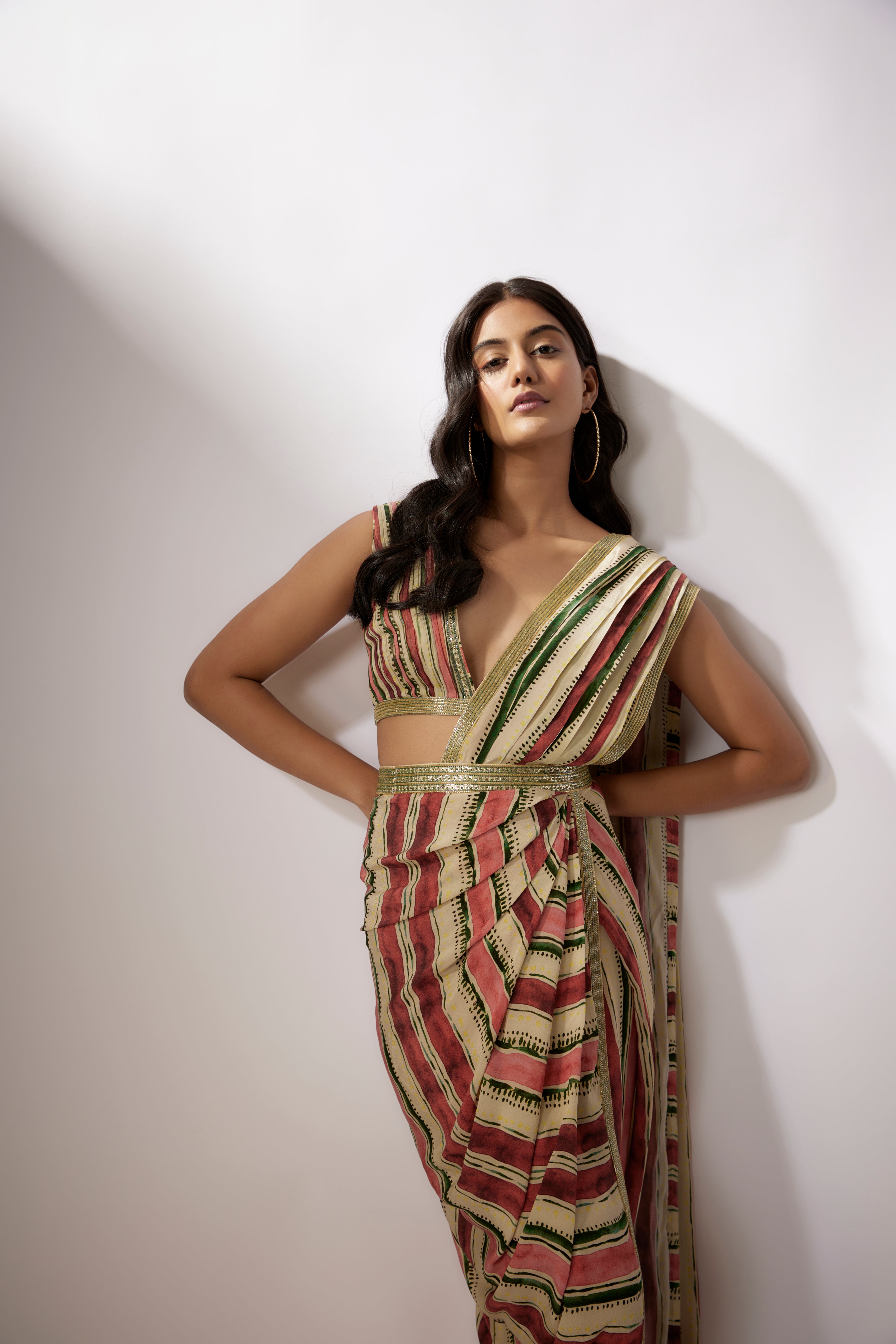 Featuring a Beige printed pre-draped saree in crepe fabric and printed blouse in crepe & georgette with sequins work.