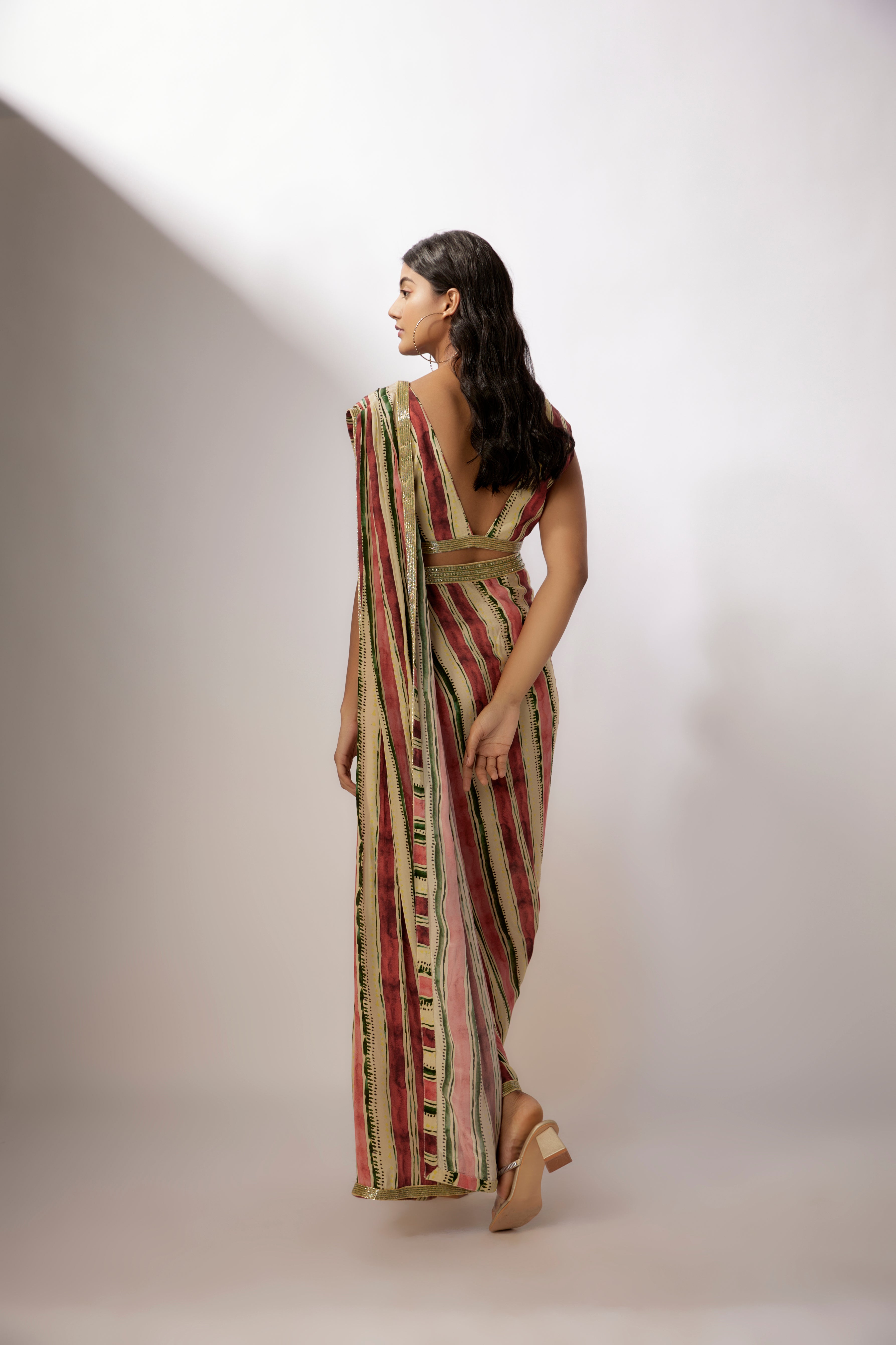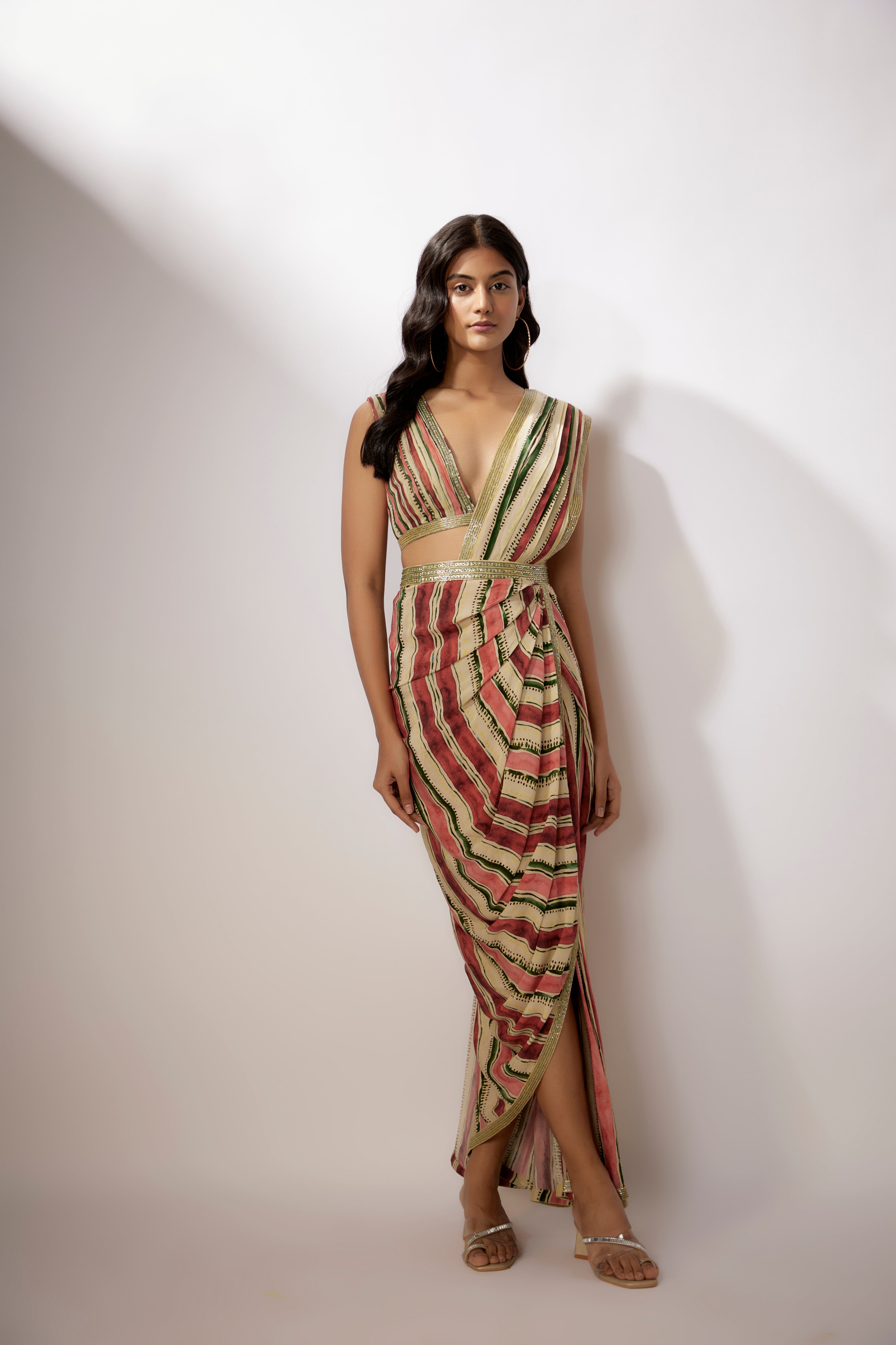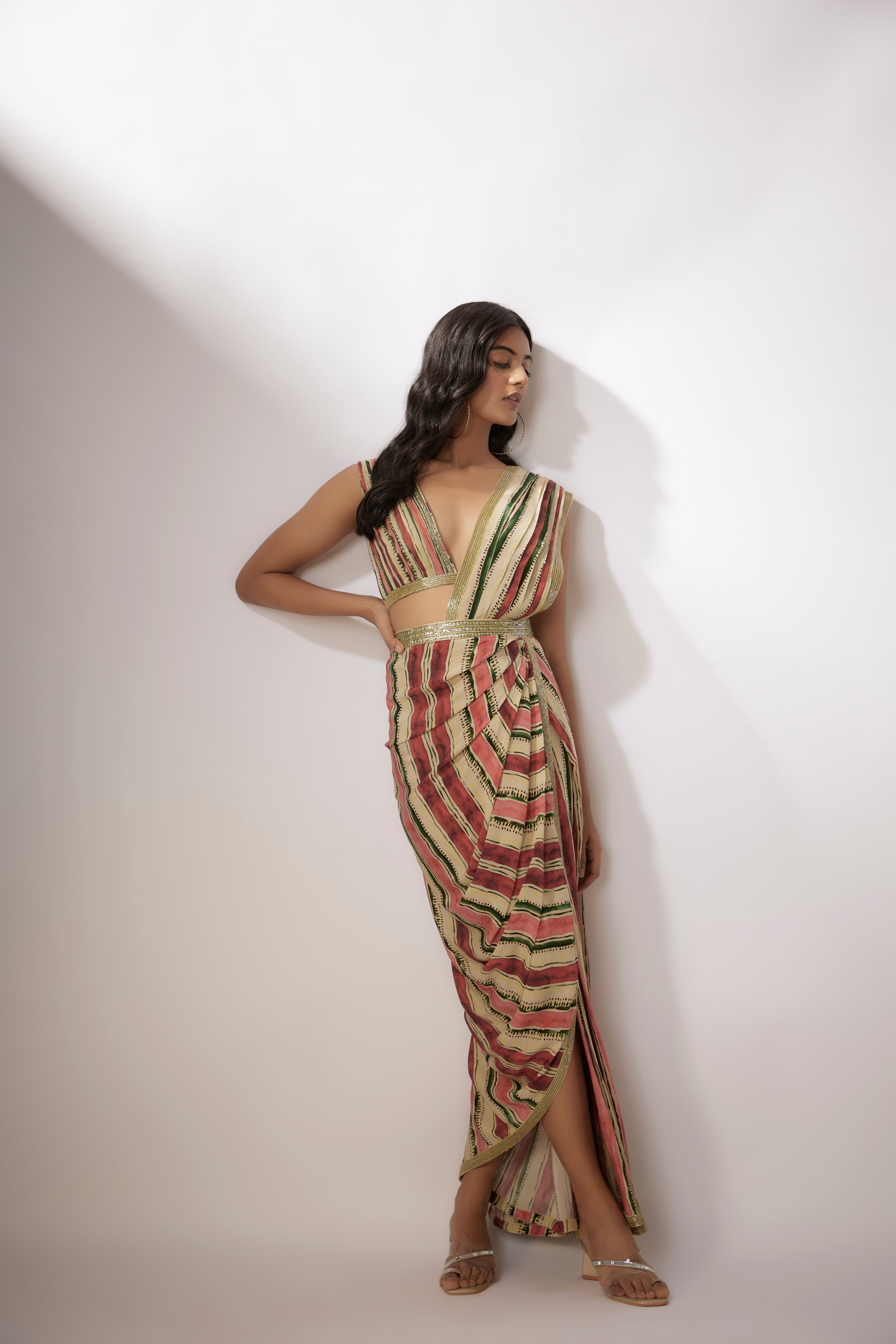 Featuring a Beige printed pre-draped saree in crepe fabric and printed blouse in crepe & georgette with sequins work.