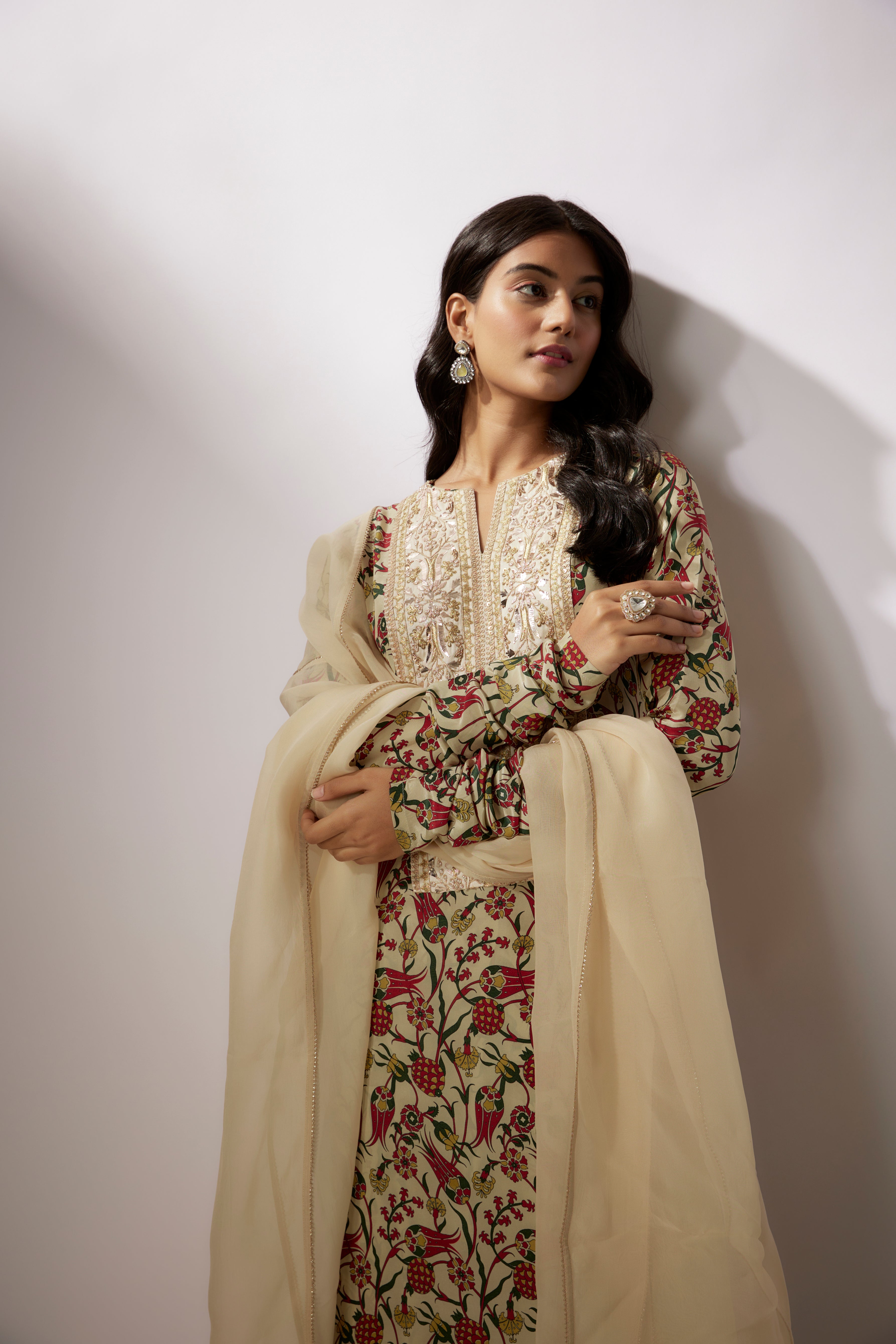 Featuring a beige printed kurta & pallazzo set in crepe fabric with zardosi and marodi work embroidery on the yoke. Comes with dupatta in organza with lace edging.