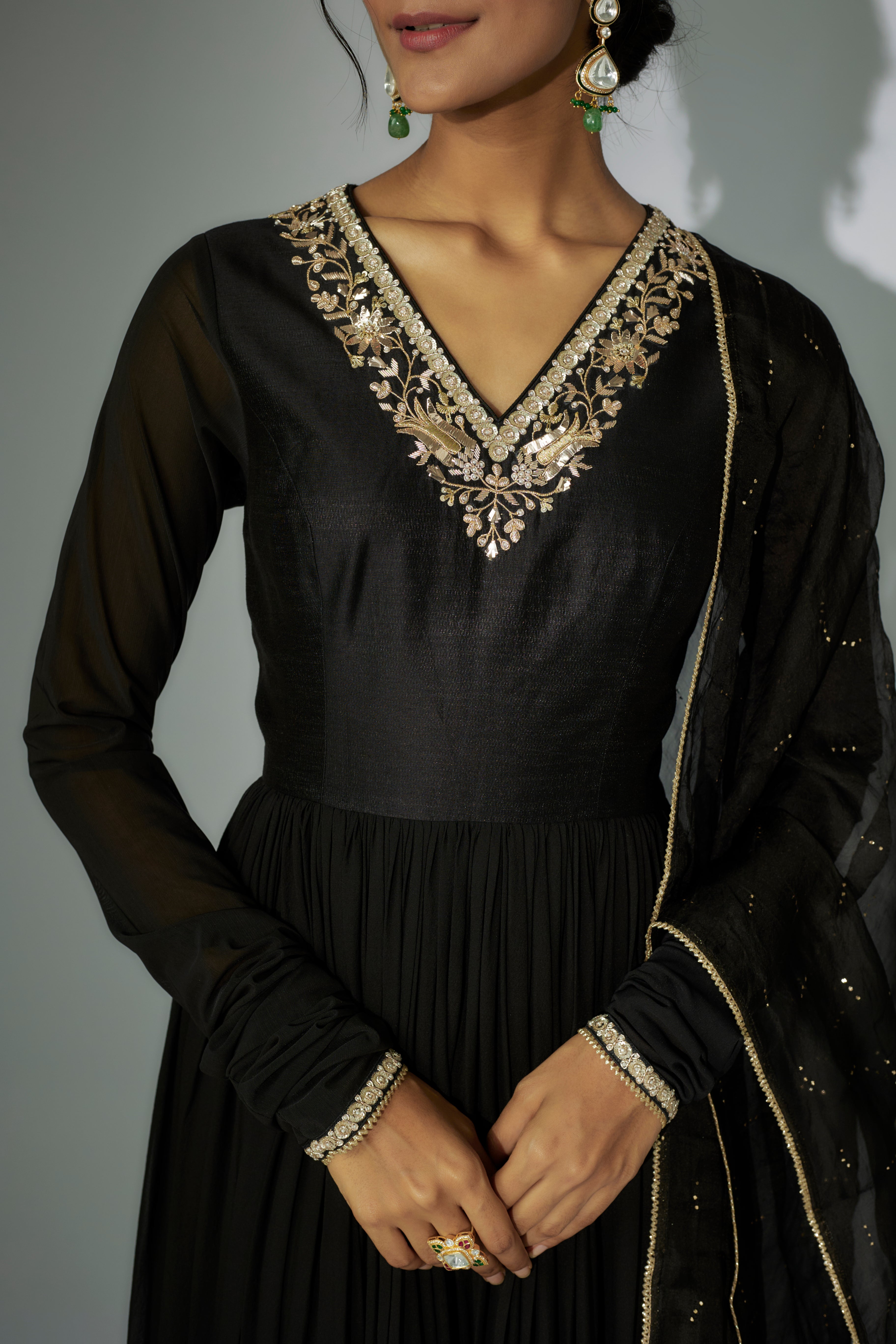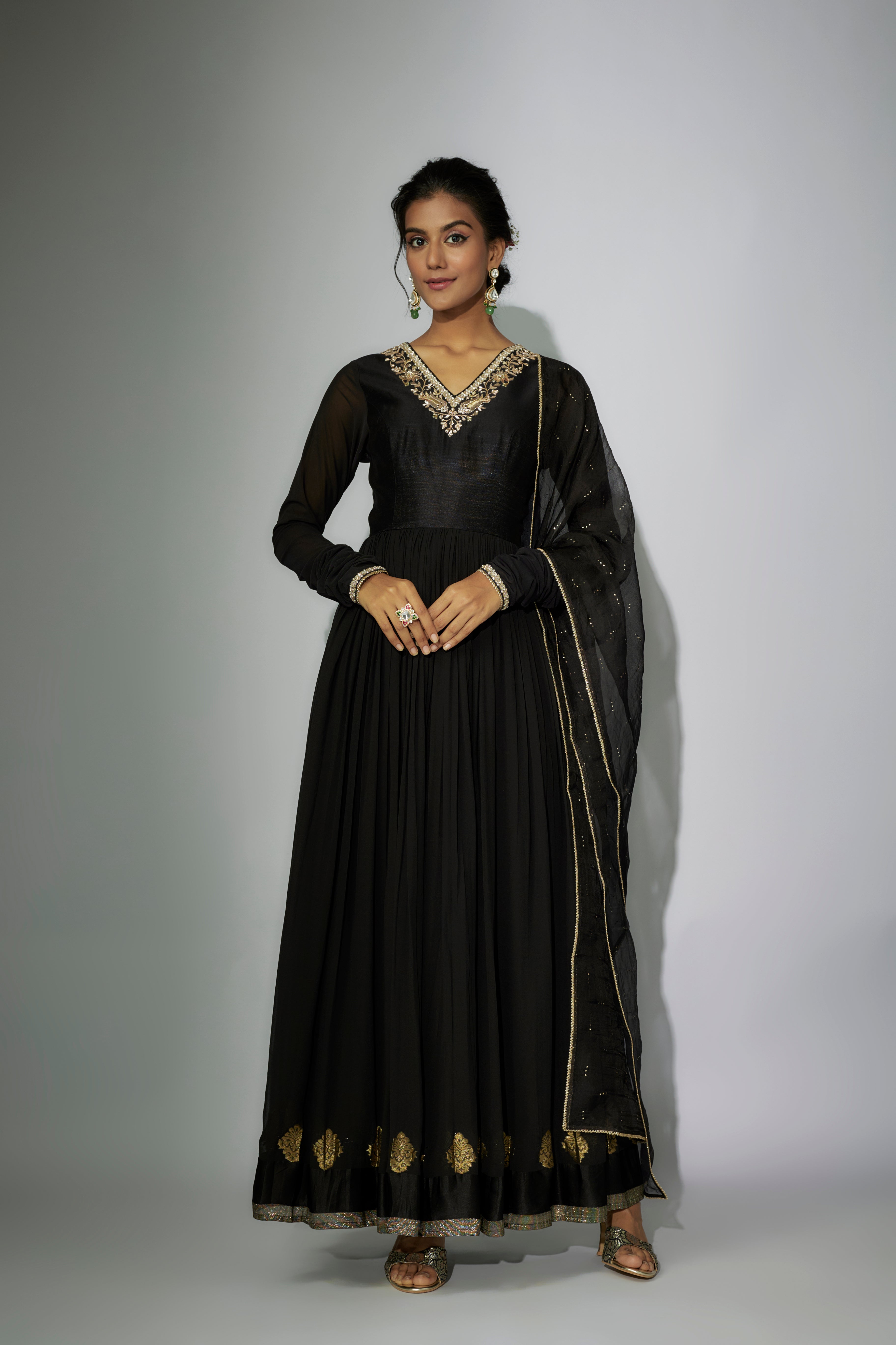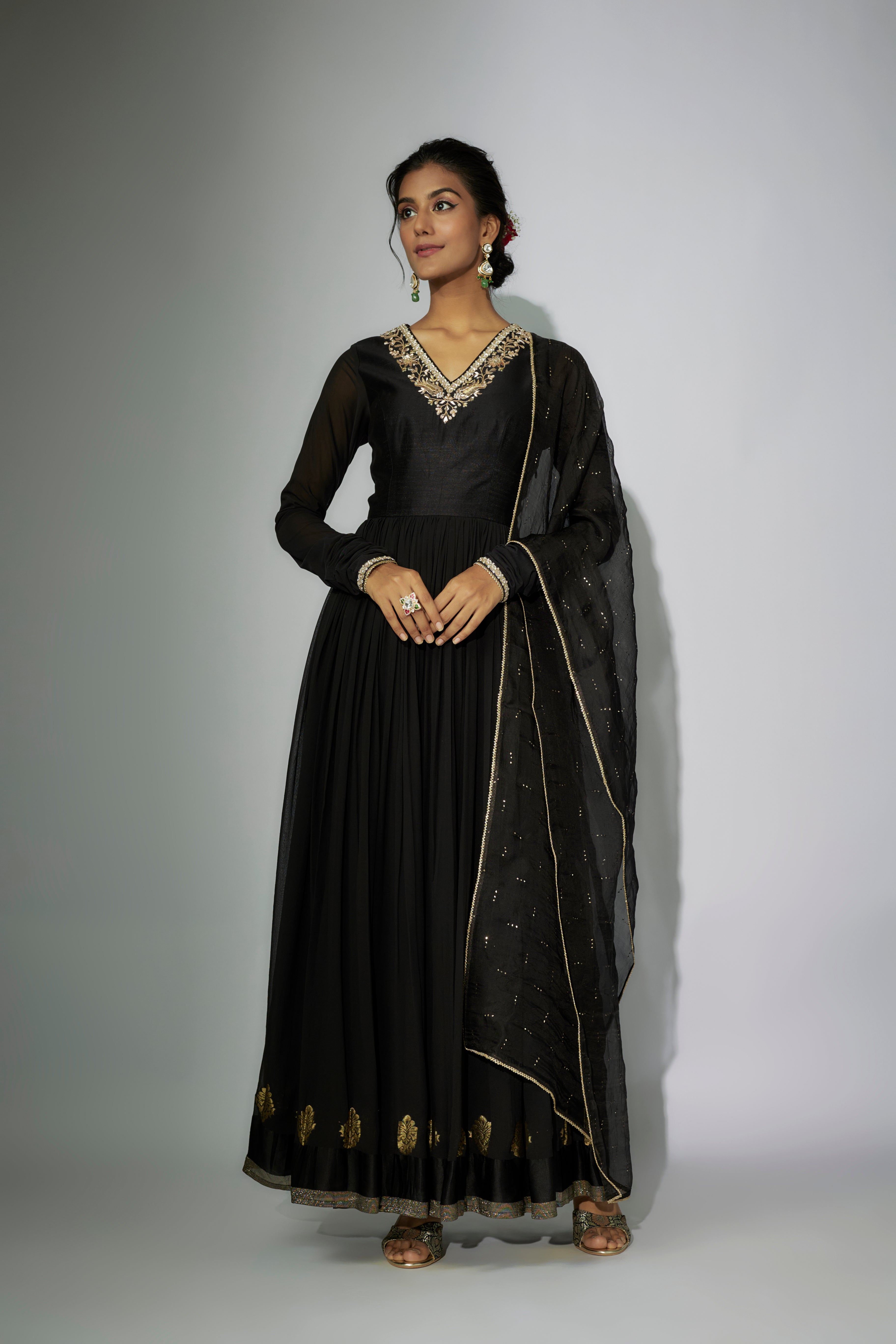 "أنركالي أسود بطول الأرضية من تشانديري وجورجيت منسوج مع عمل زاردوسي ومارودي مطرز عند خط العنق ومرفق بدوباتا من الأورجانزا."