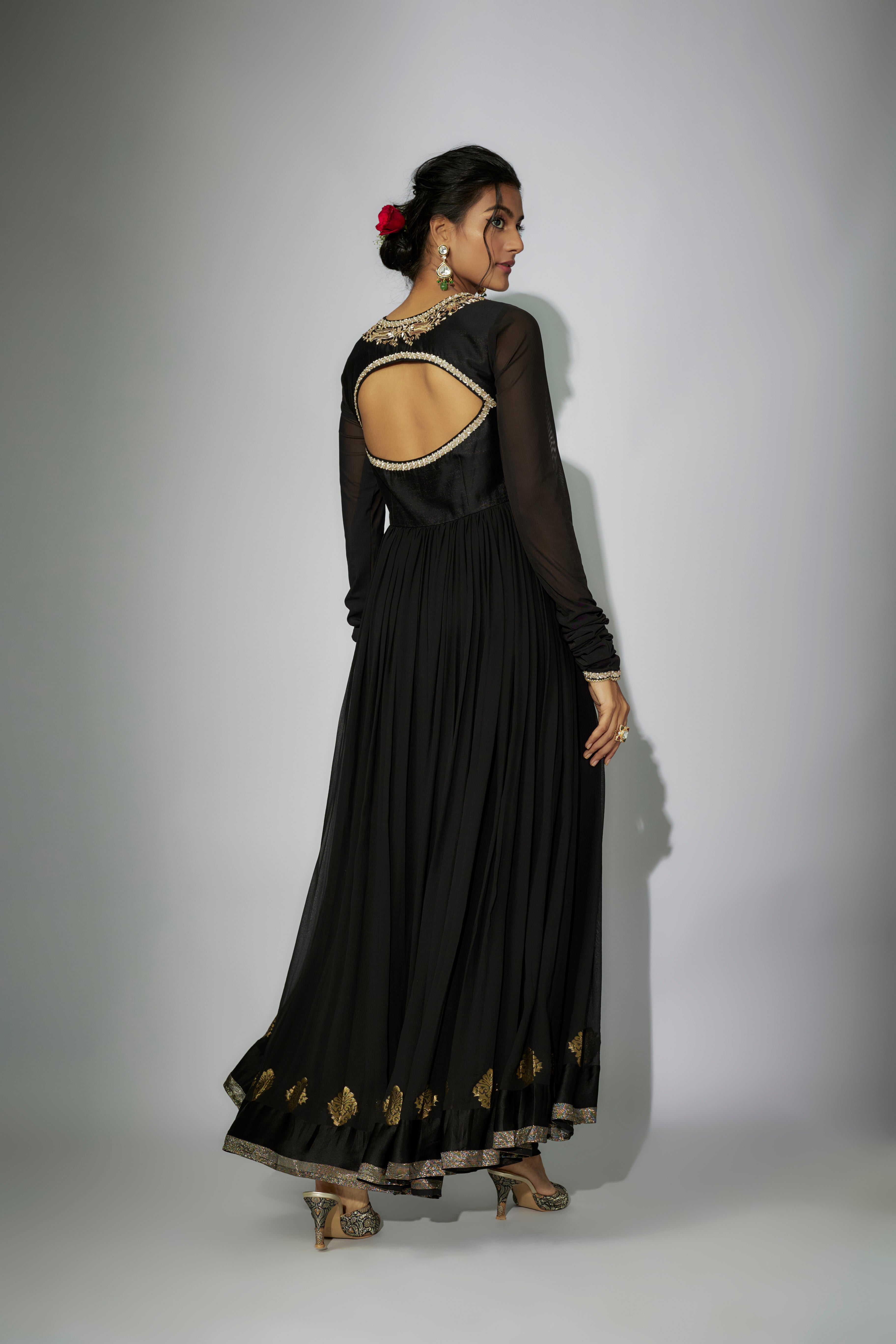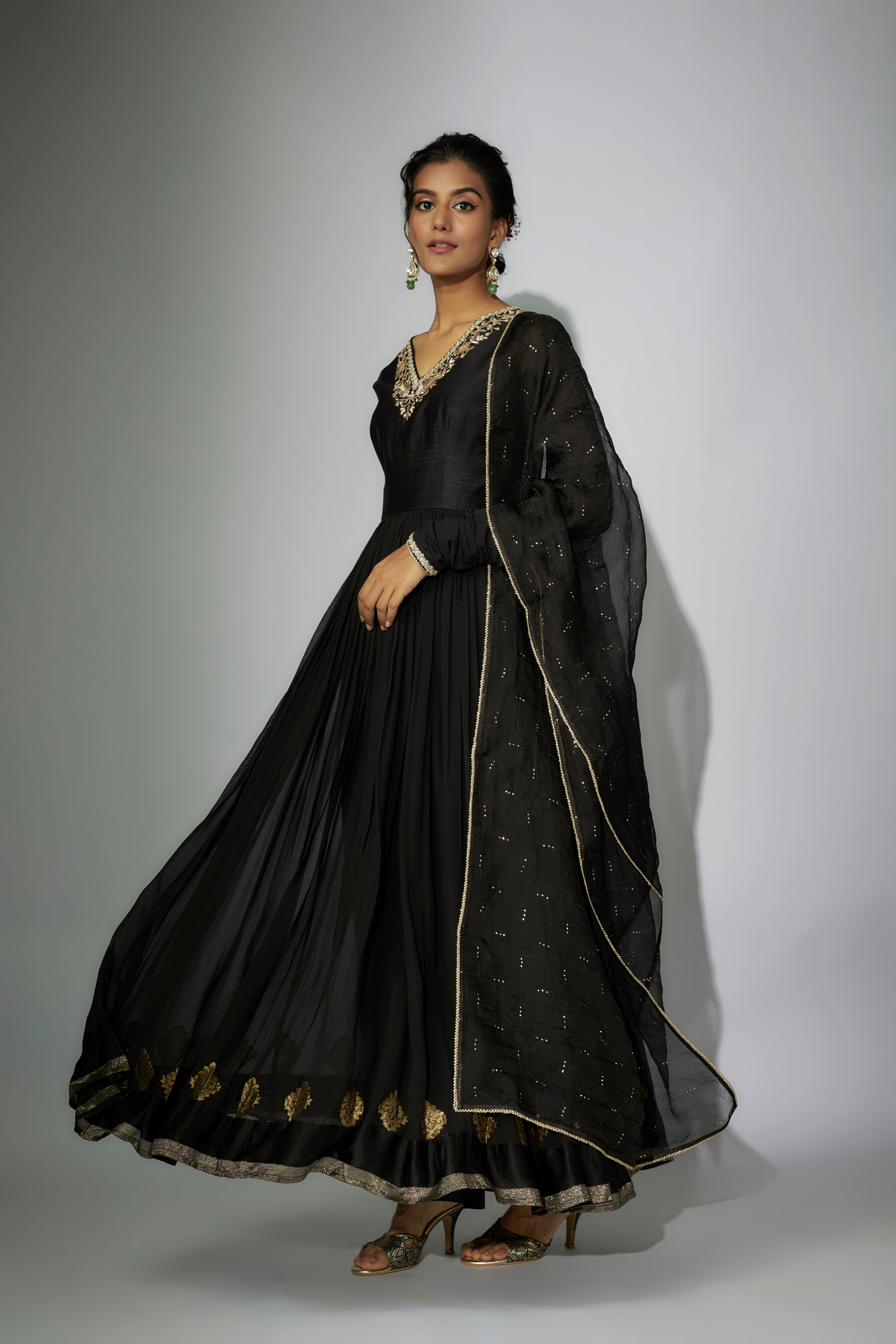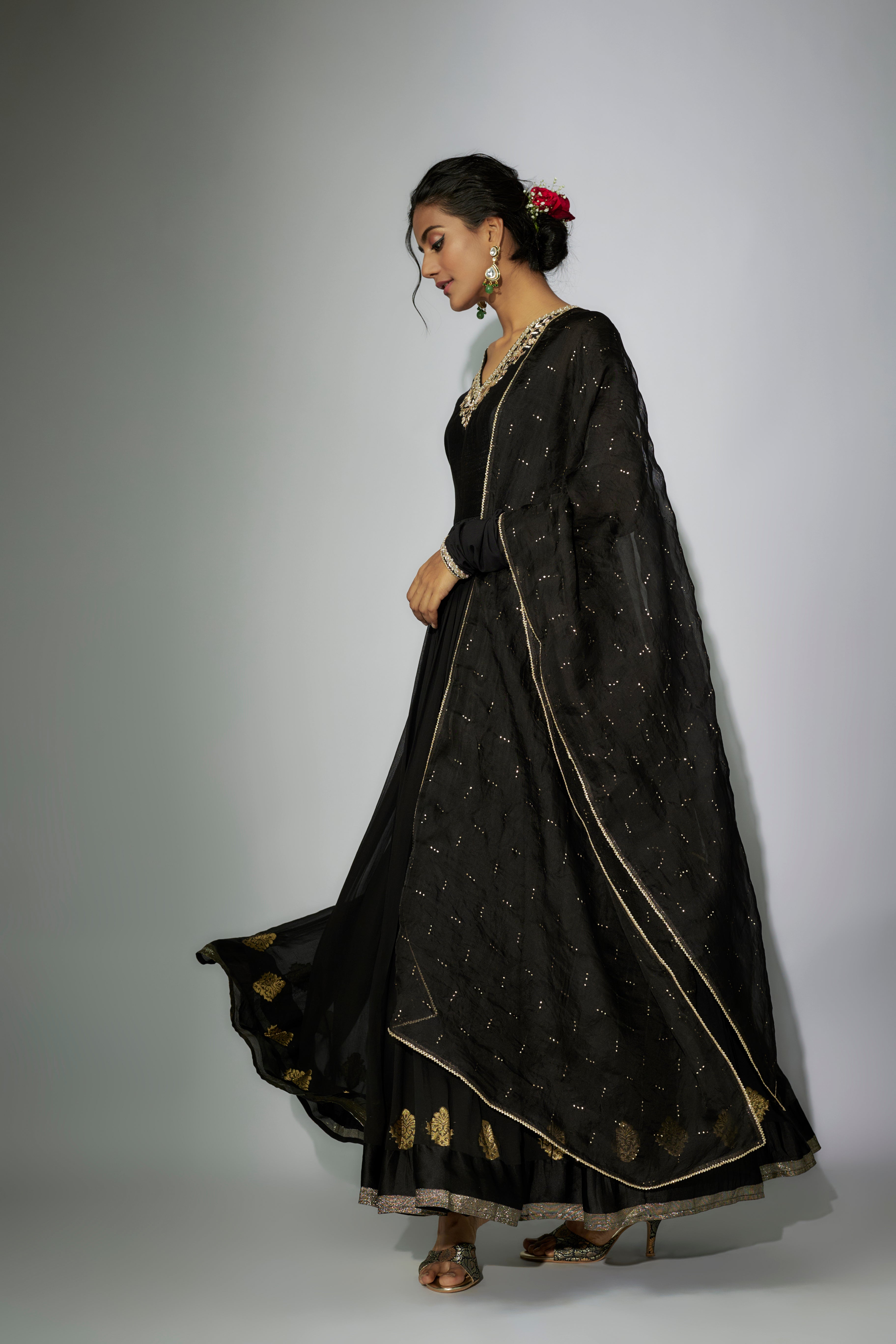 "أنركالي أسود بطول الأرضية من تشانديري وجورجيت منسوج مع عمل زاردوسي ومارودي مطرز عند خط العنق ومرفق بدوباتا من الأورجانزا."