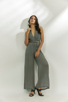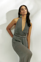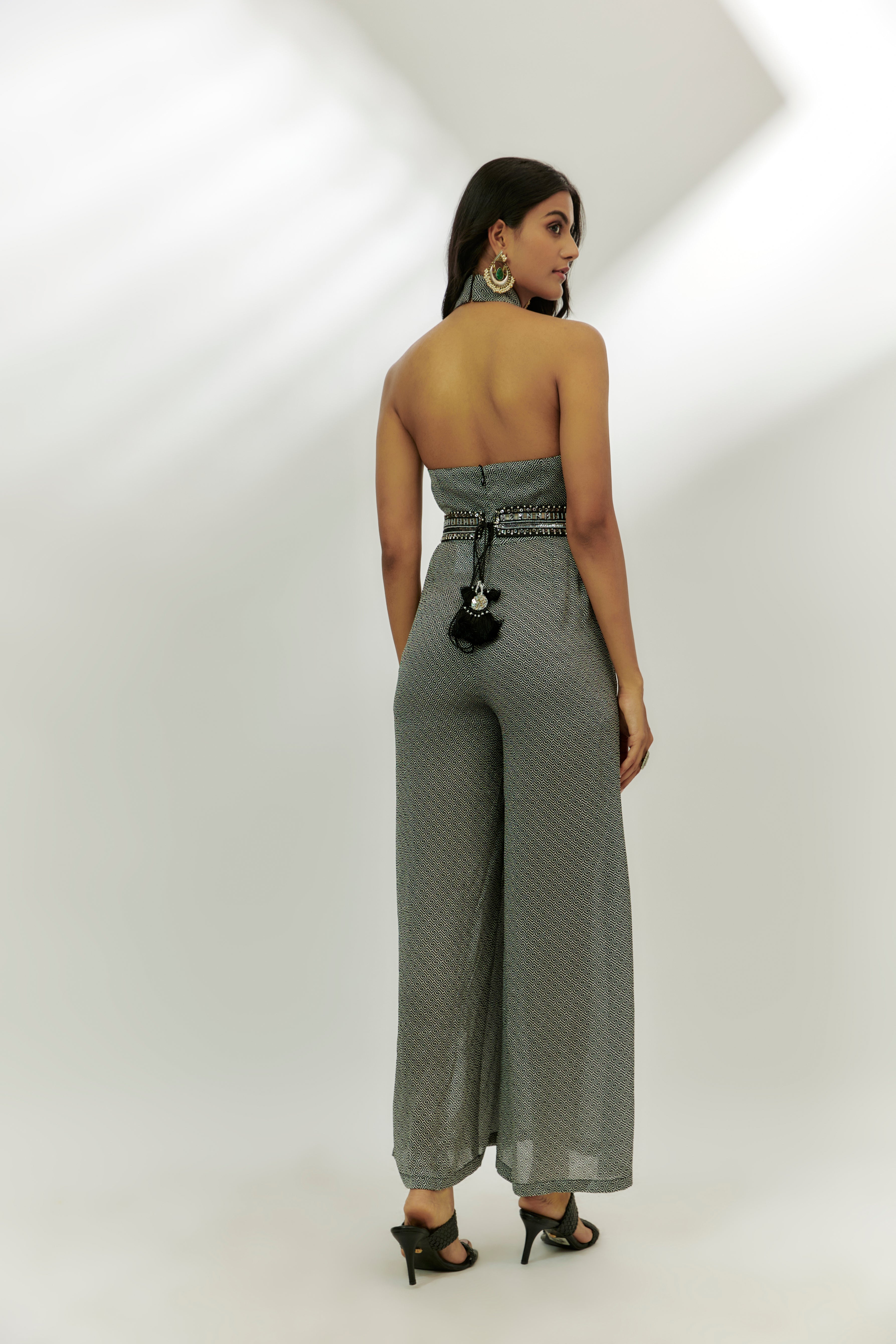 يتميز ببدلة سوداء من قطن مضغوط مع طباعة رقمية. يتم إقرانها بحزام مزين بخيوط حريرية وخرز. أبرزه بمجوهرات بارزة وكعب عالٍ للحصول على مظهر كامل.
