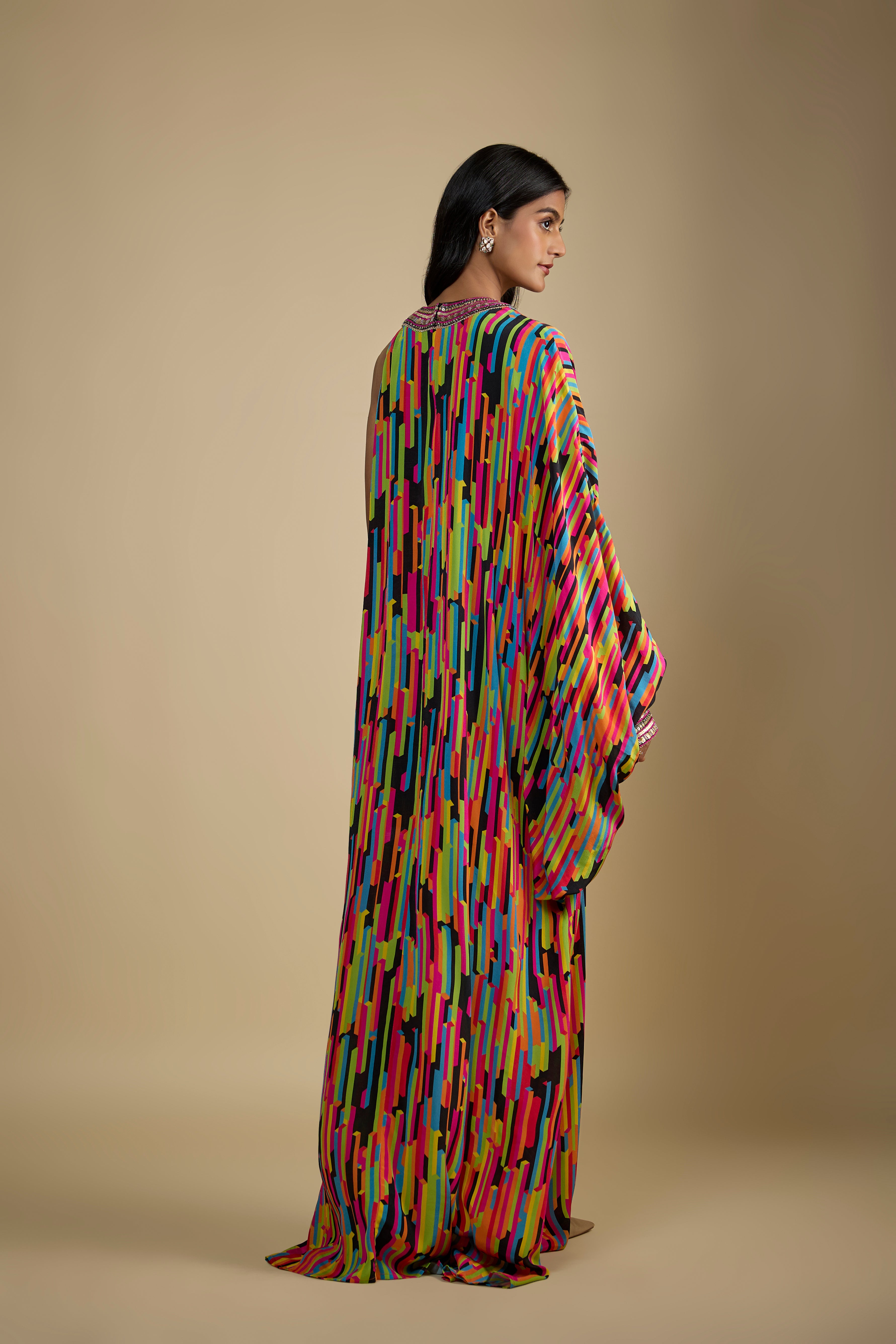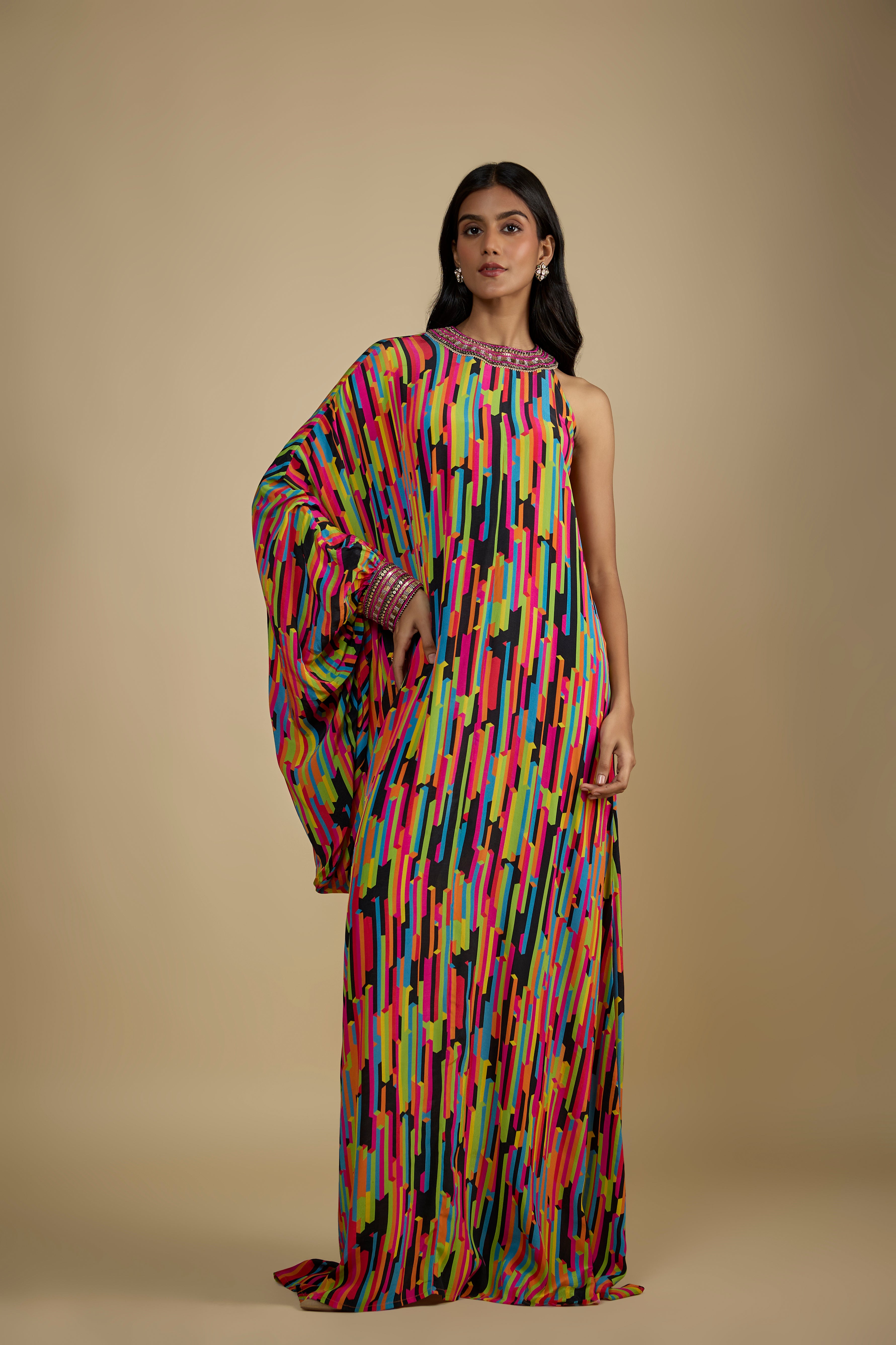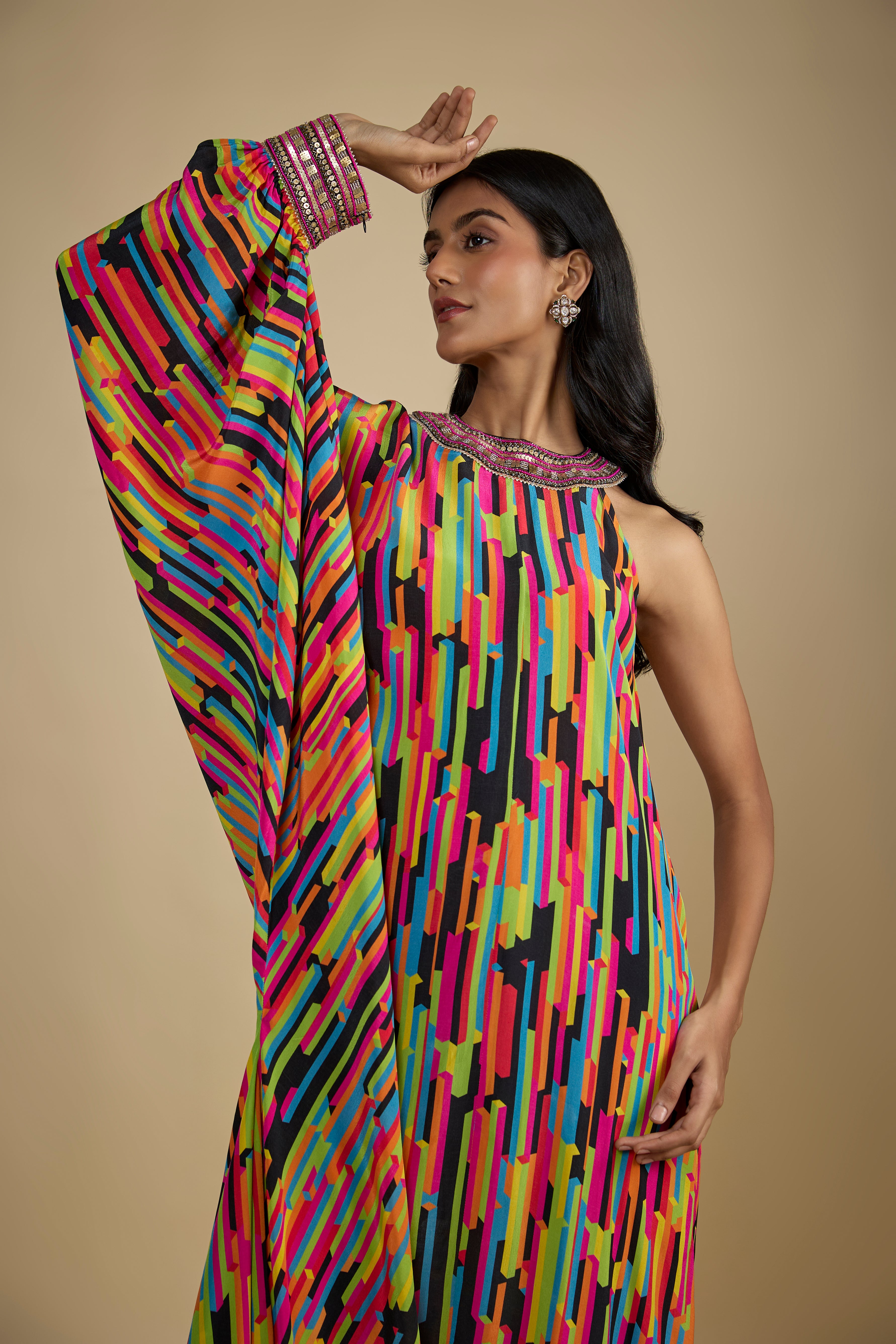 يتميز بفستان كافتان برتقالي من الكريب المطبوع مع ترتر وتطريز لؤلؤ وتفاصيل شرابة ذهبية.