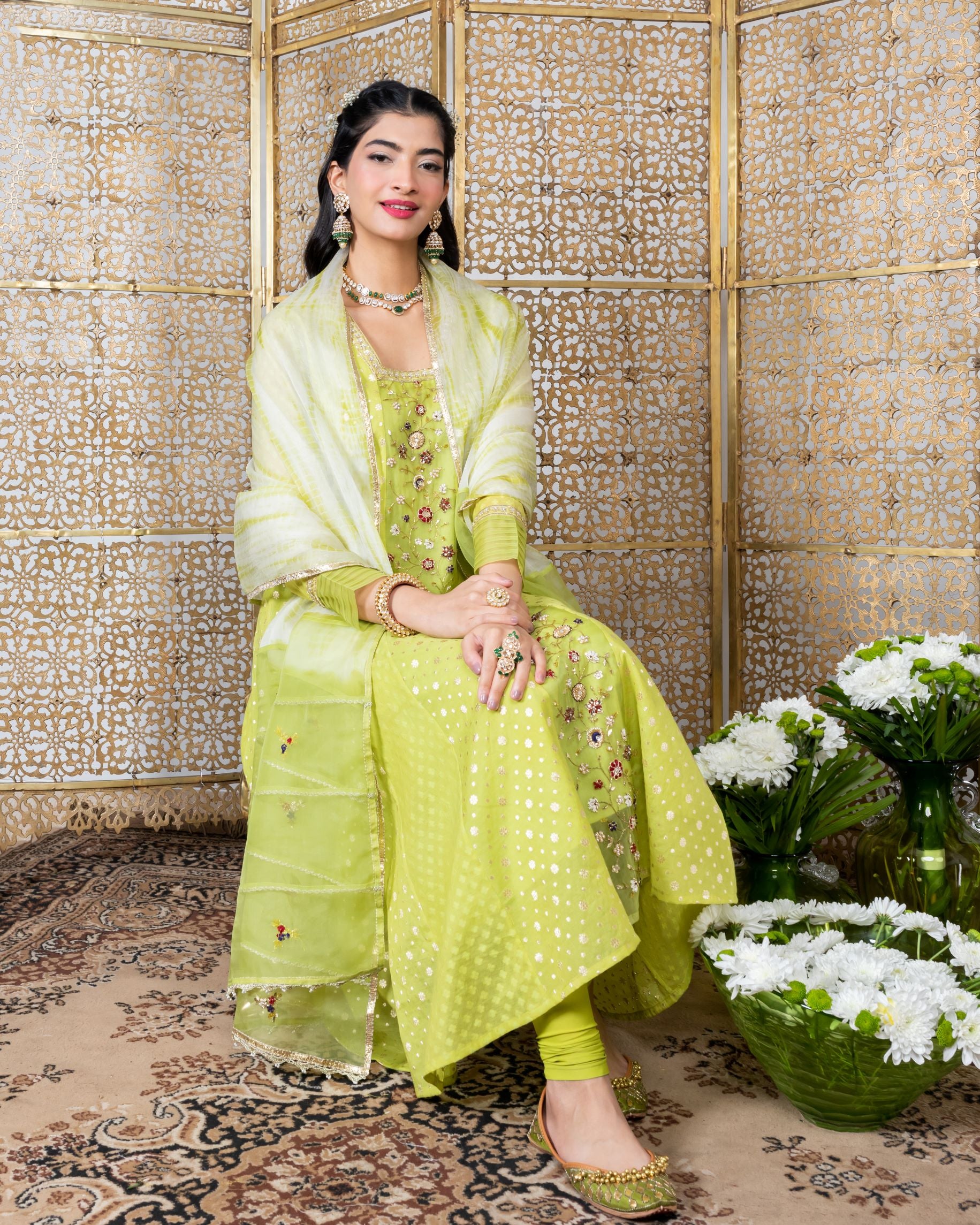 قميص أخضر مطرز من قماش تشانديري مع ليقنز متناسق من قماش ليكرا. يأتي مع دوباتا مطرزة من قماش الأورجانزا.