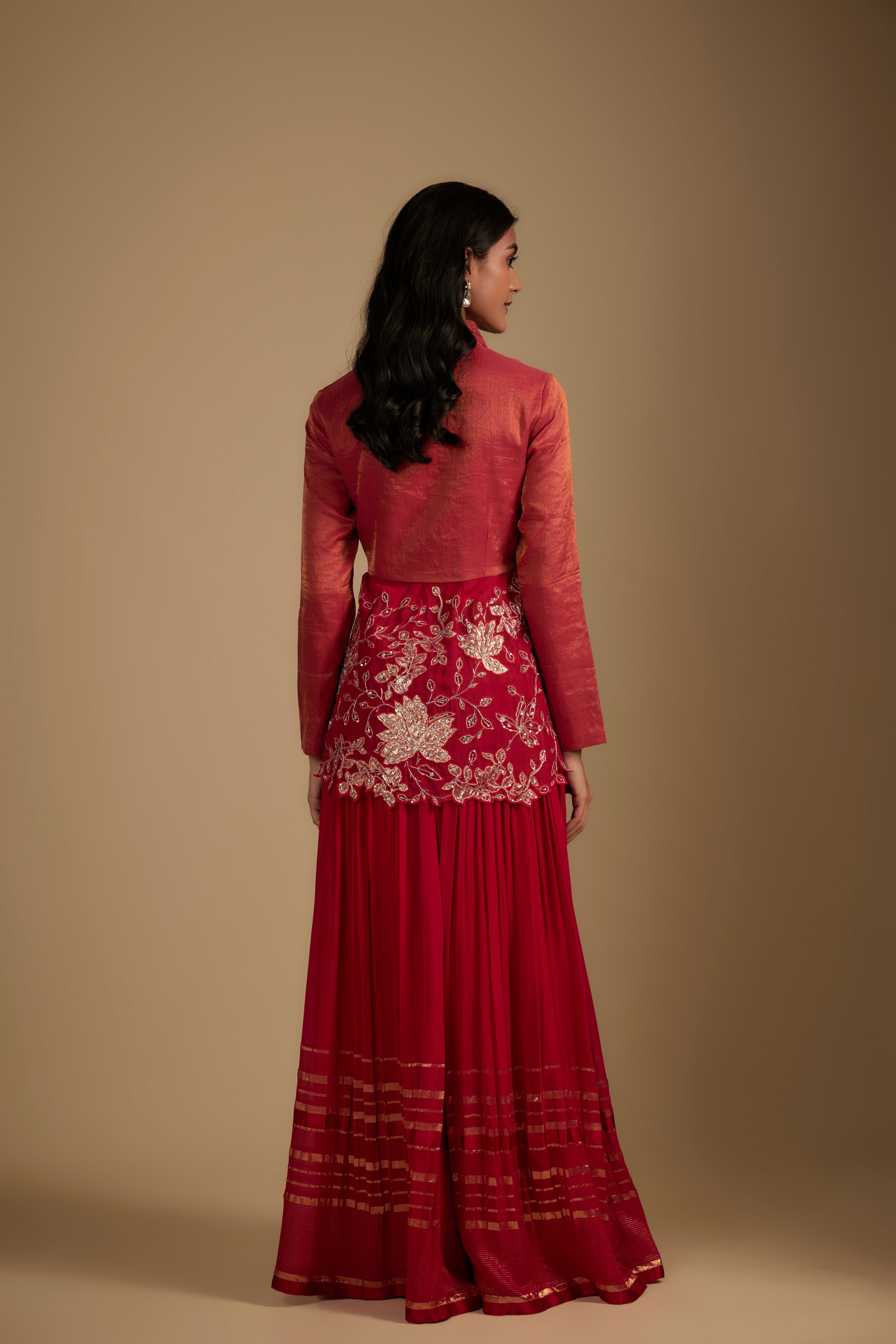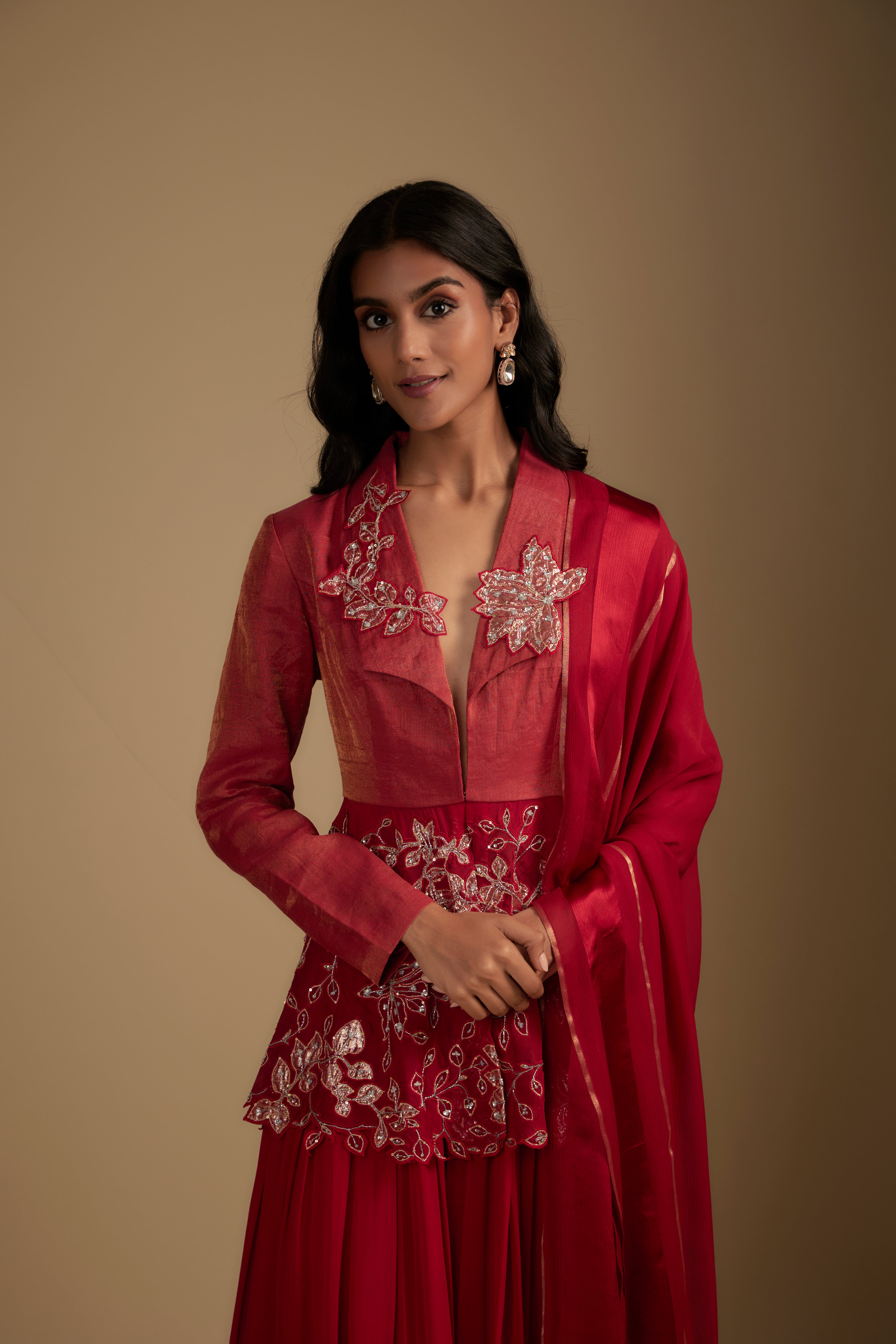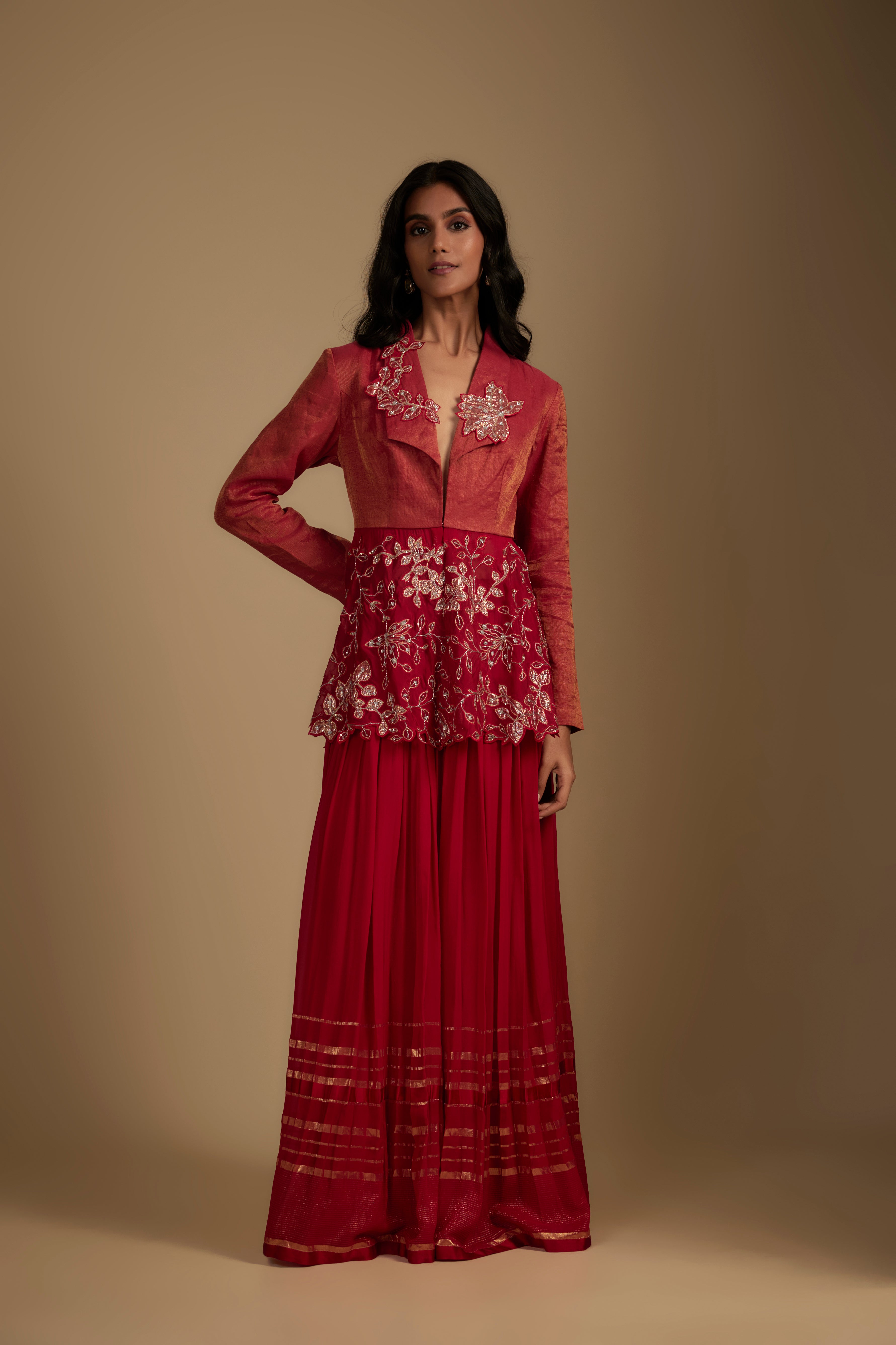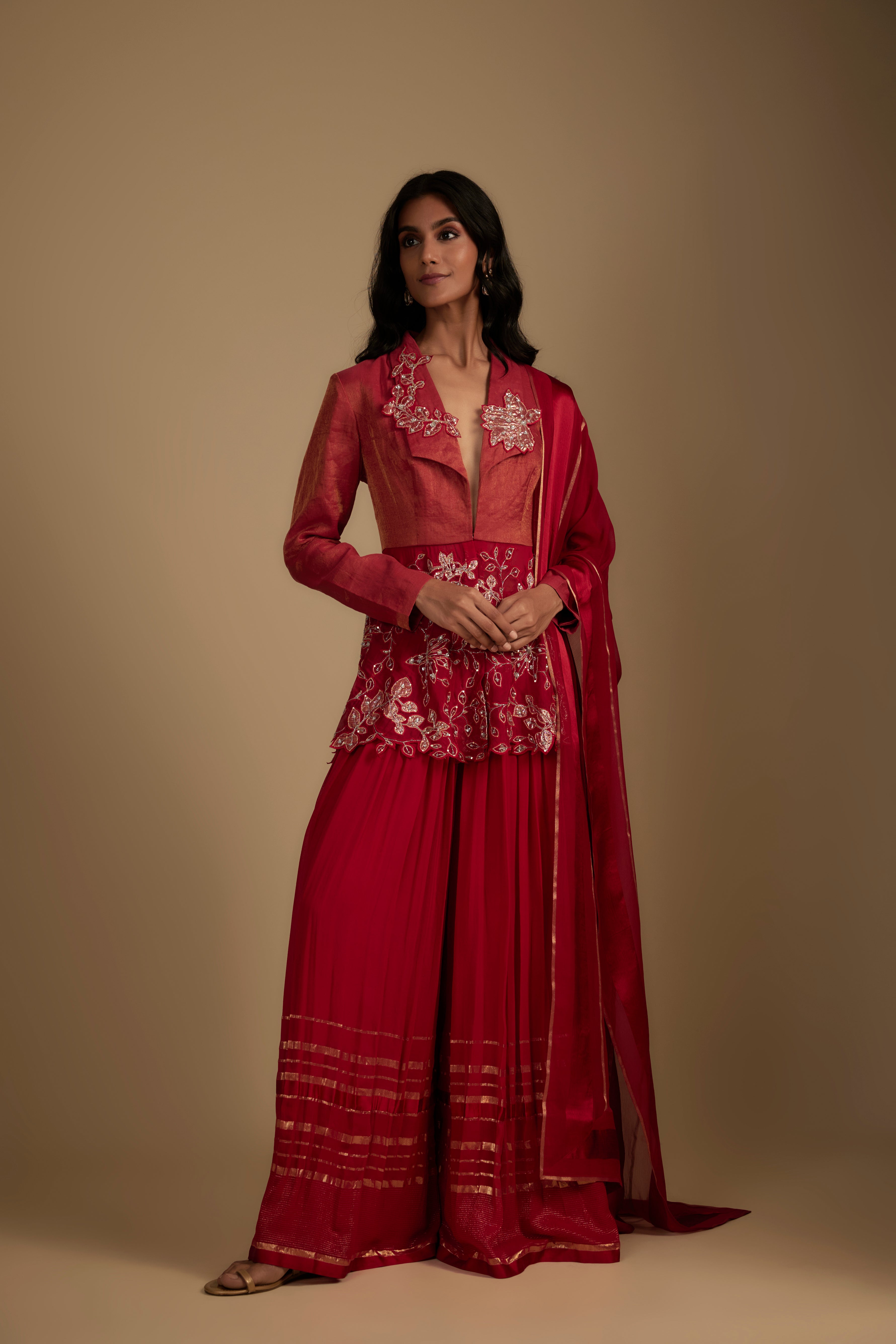 يتميز بتوب بيبلوم على طراز بليزر أحمر من نسيج تشانديري وأقمشة الأورجانزا مع تطريز قطع وزردوسي. يأتي مع بنطلون شرارة ودوباتا متطابقين من قماش الجورجيت.