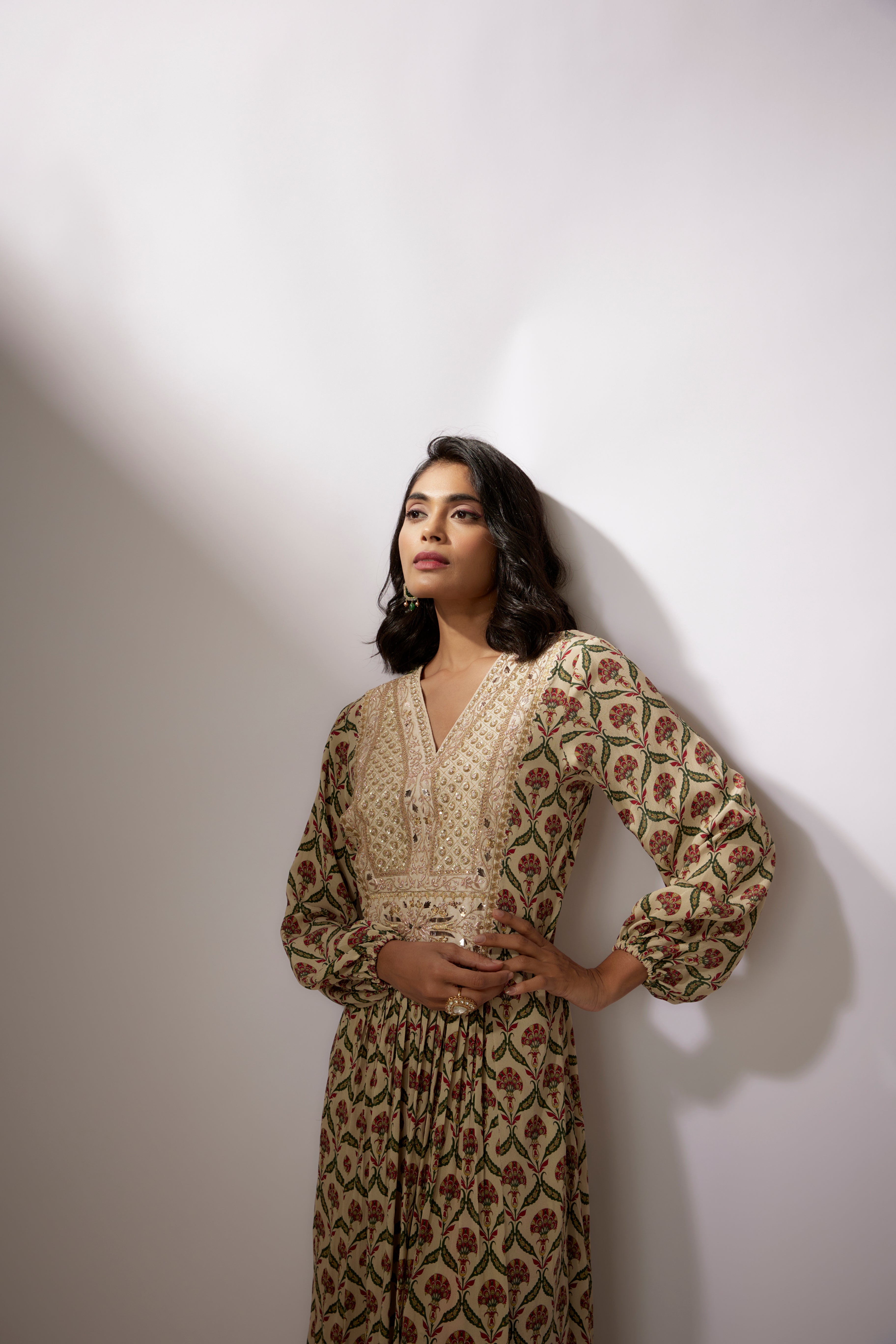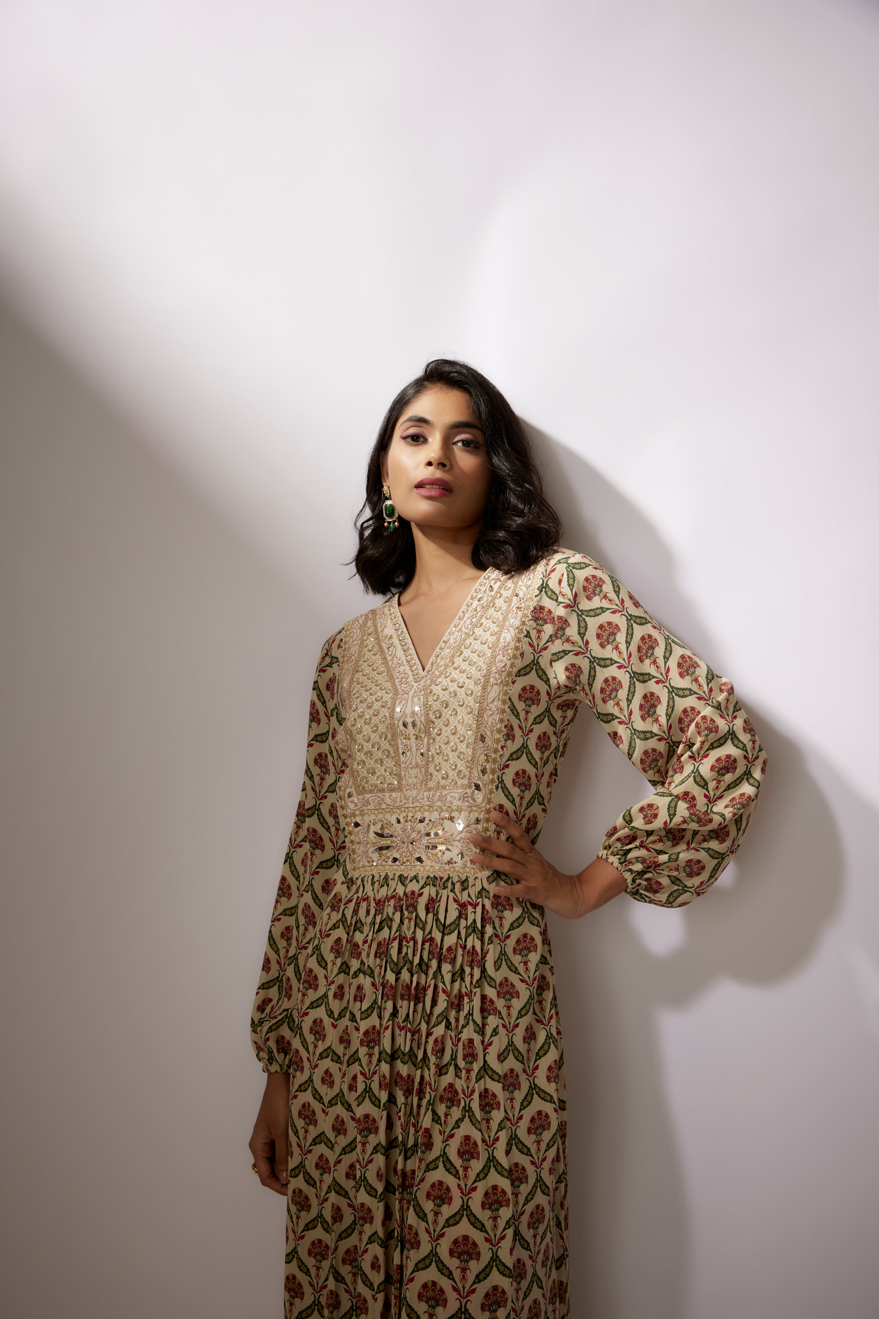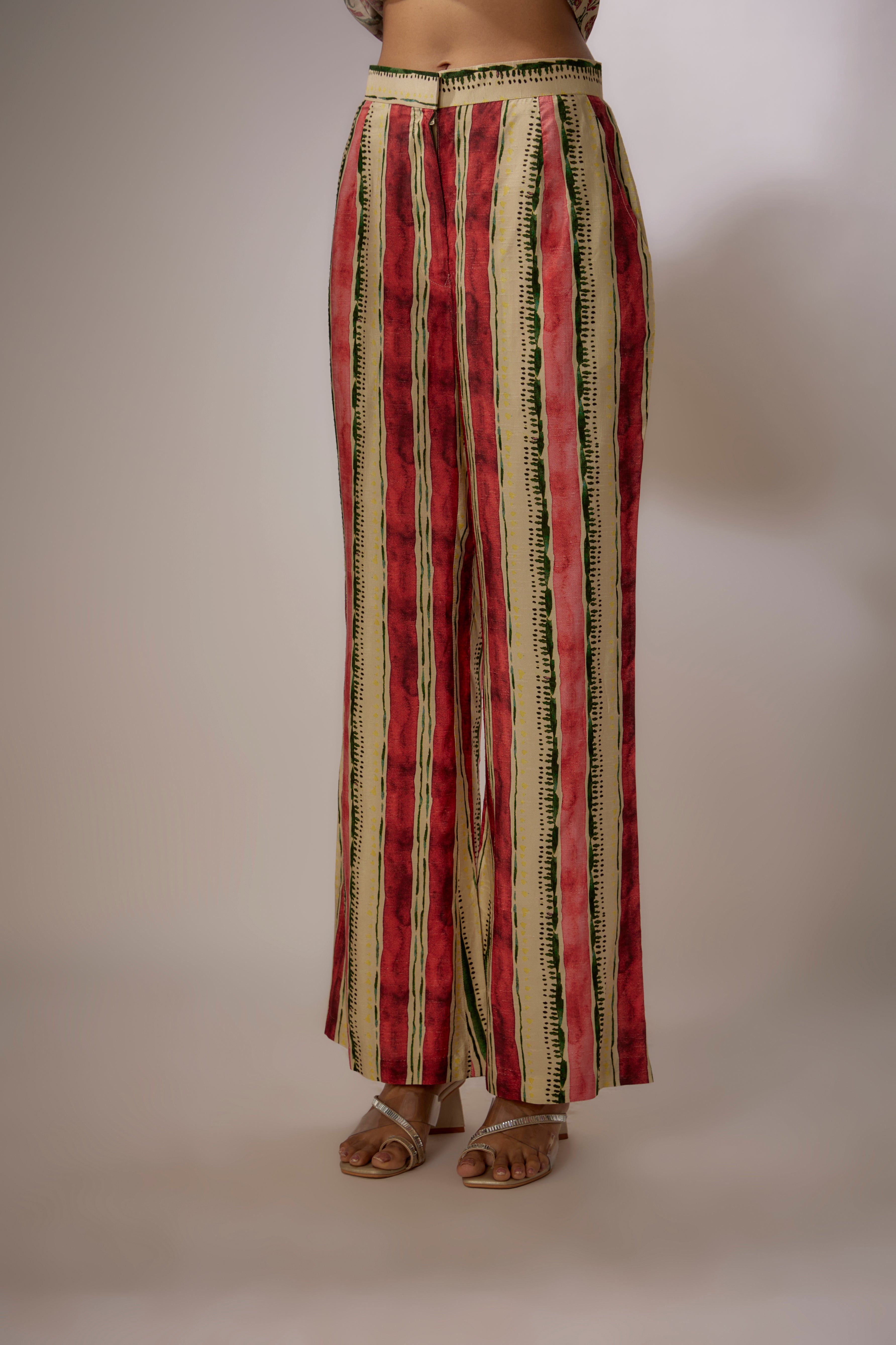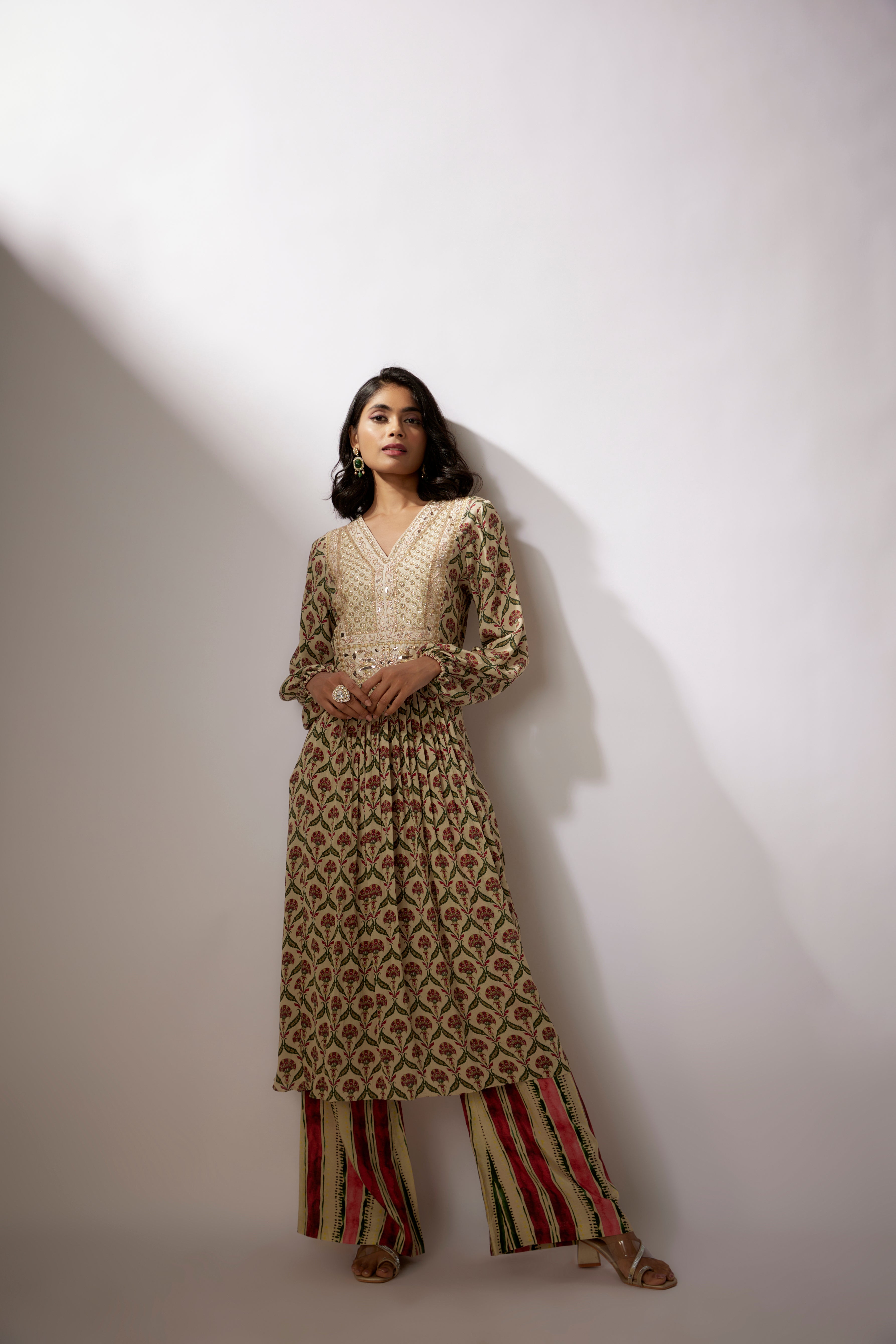 تتميز بكورتا بيج مطبوع من الكريب مع تطريز زاردوسي ومارودي. تأتي مع بنطلون مخطط مطبوع من الكريب.
