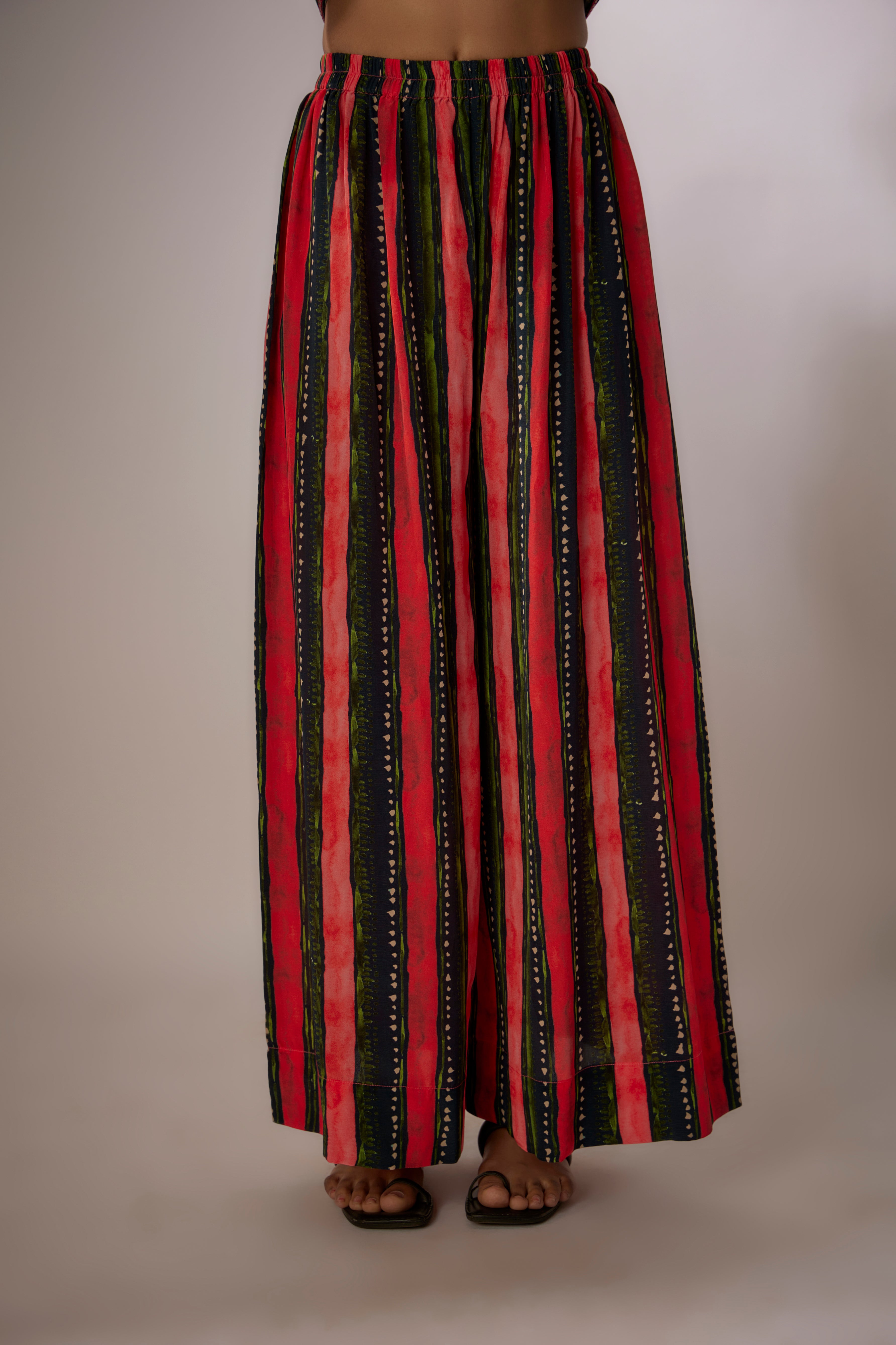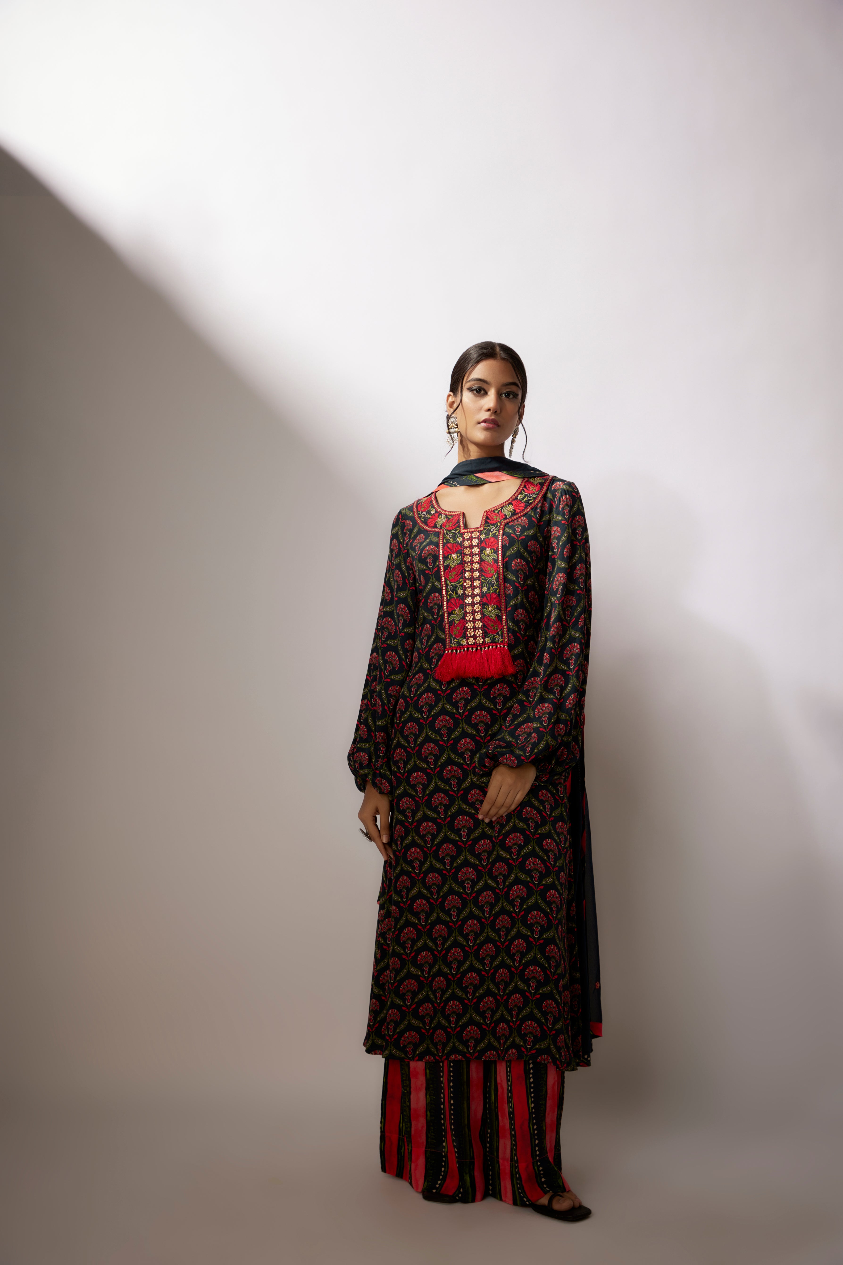 تتميز هذه الكورتا بطباعة باللون الأزرق البحري على قماش كريب مع تطريز بالخيوط والترتر على الصدر وتفاصيل شرابات. تأتي مع بنطلونات مخططة من الكريب وطرحة من الشبك مع عمل الترتر.