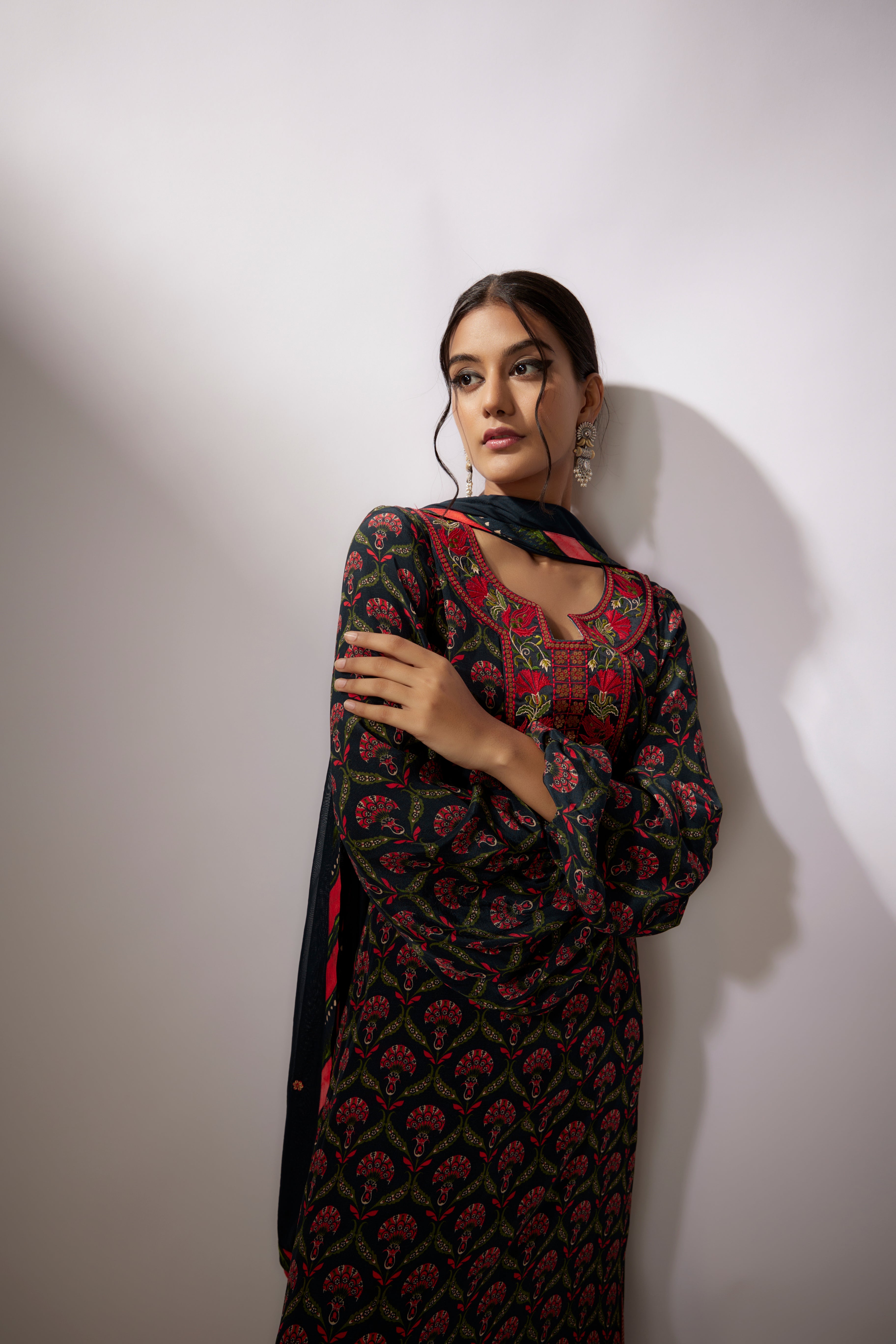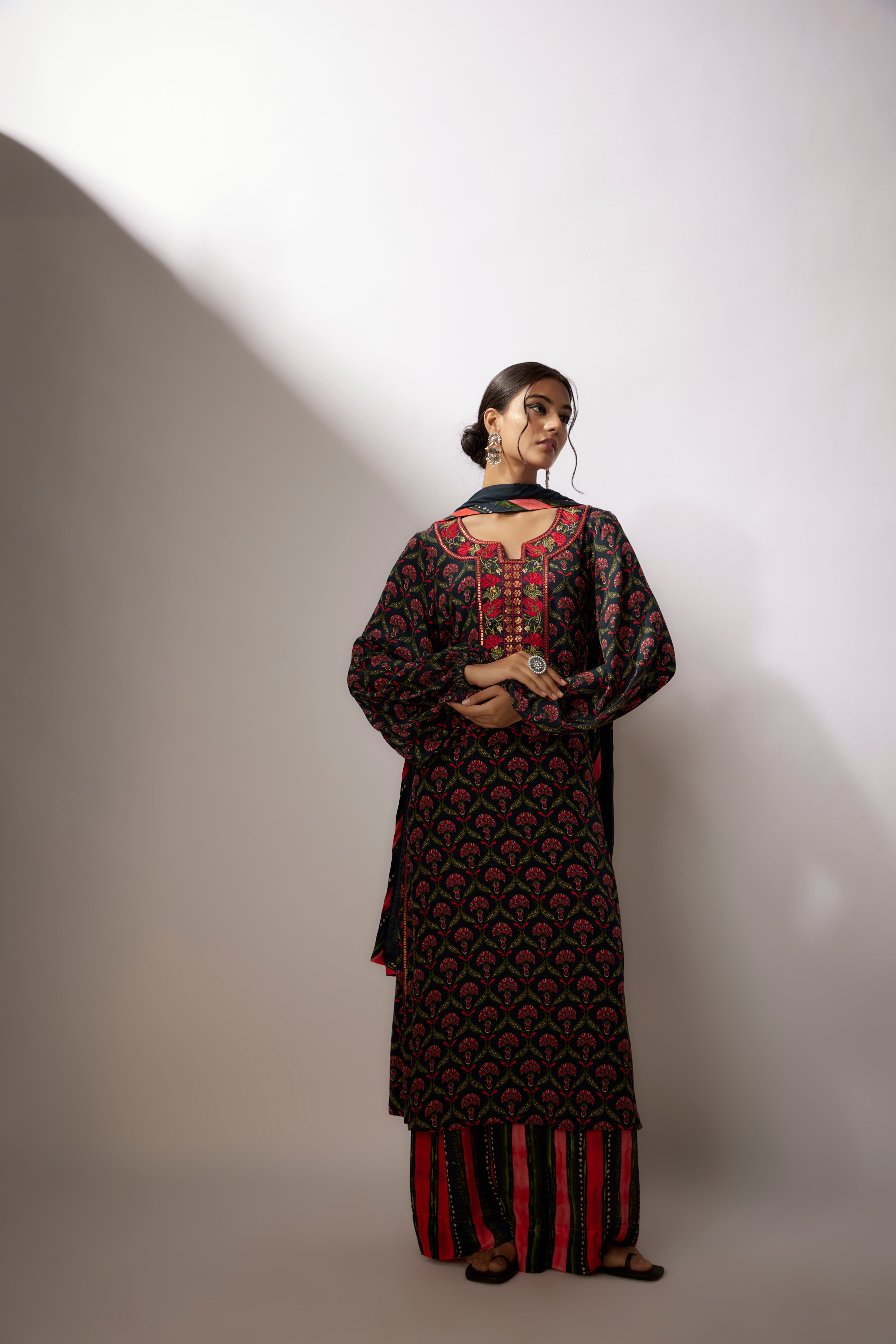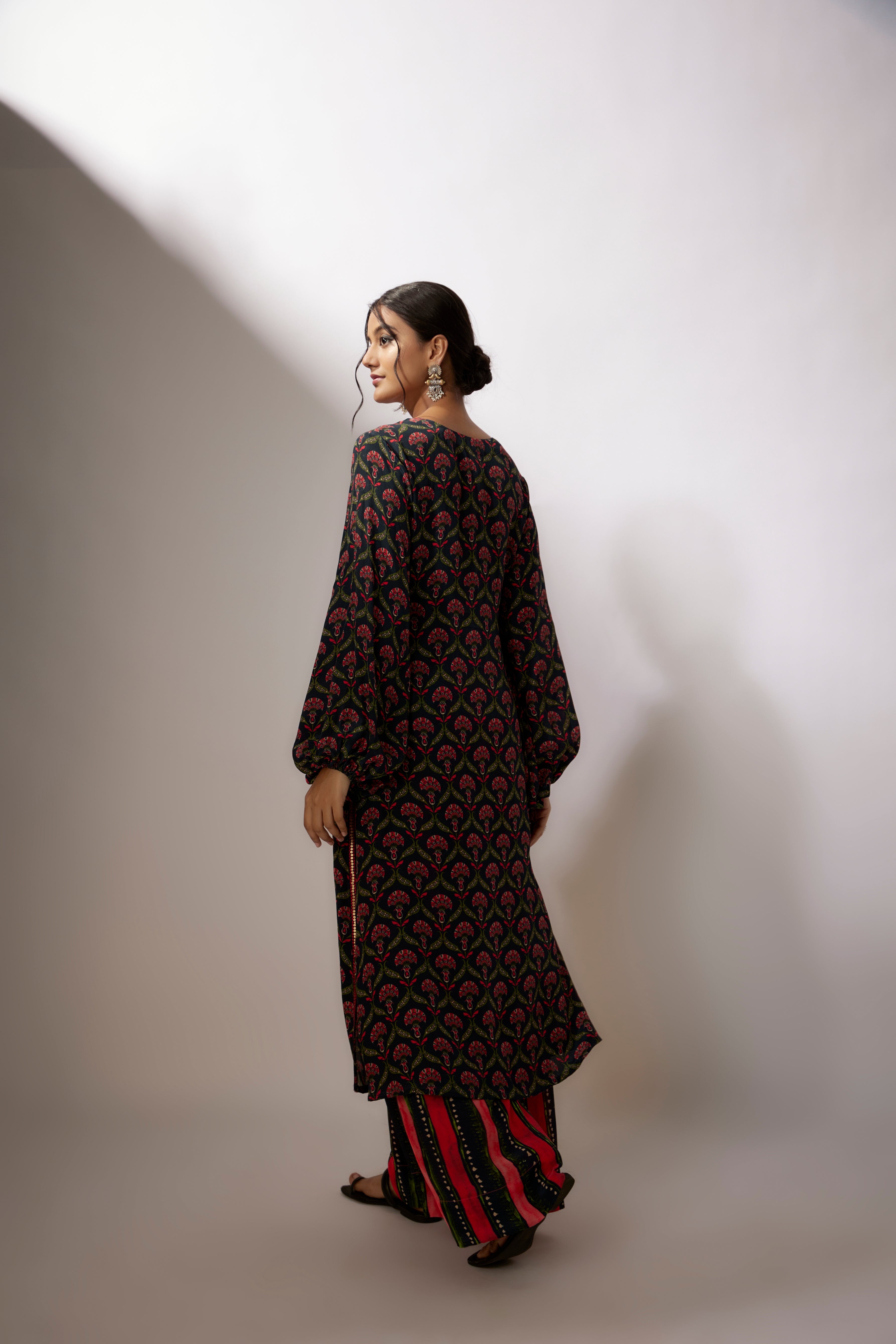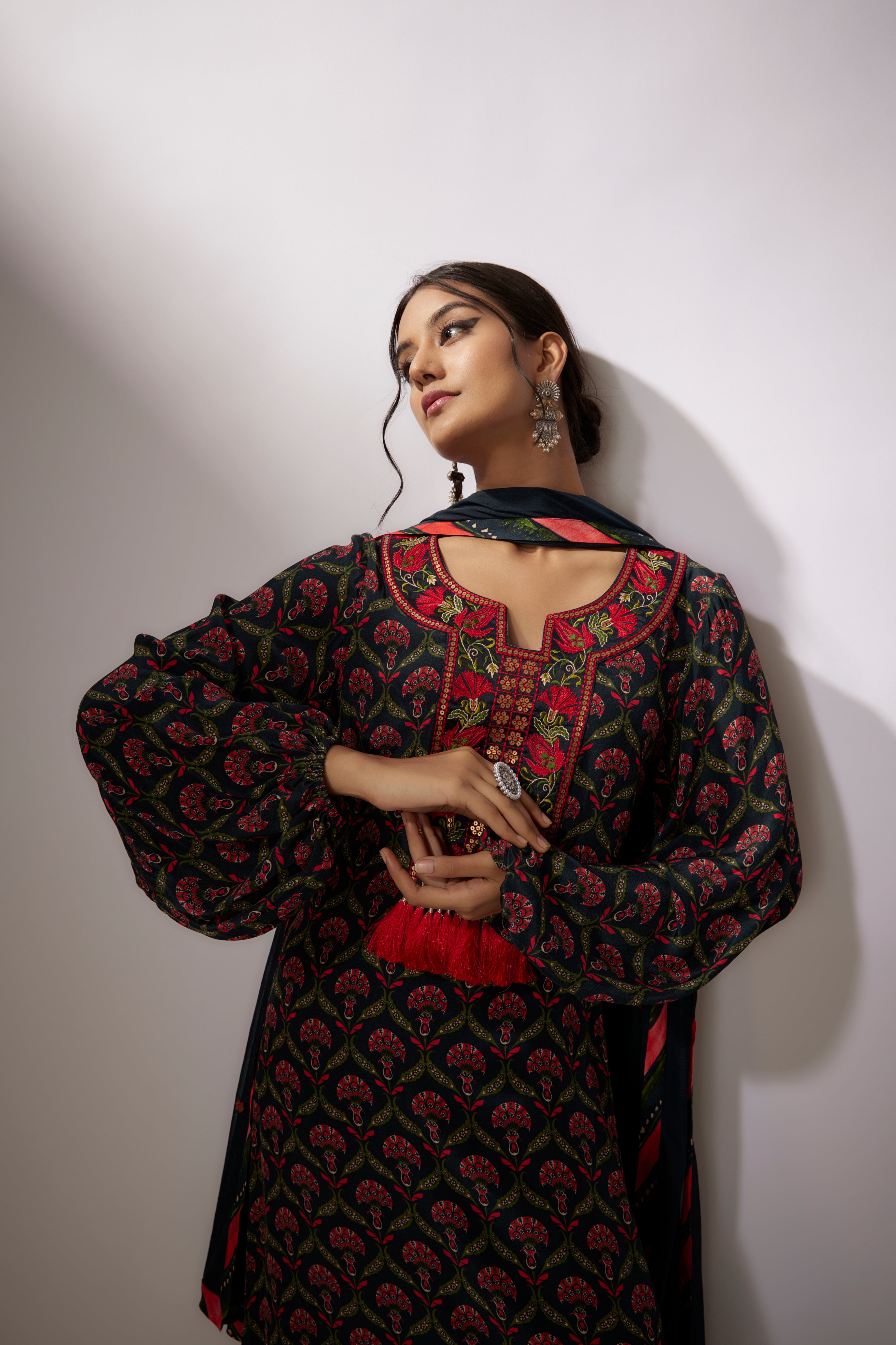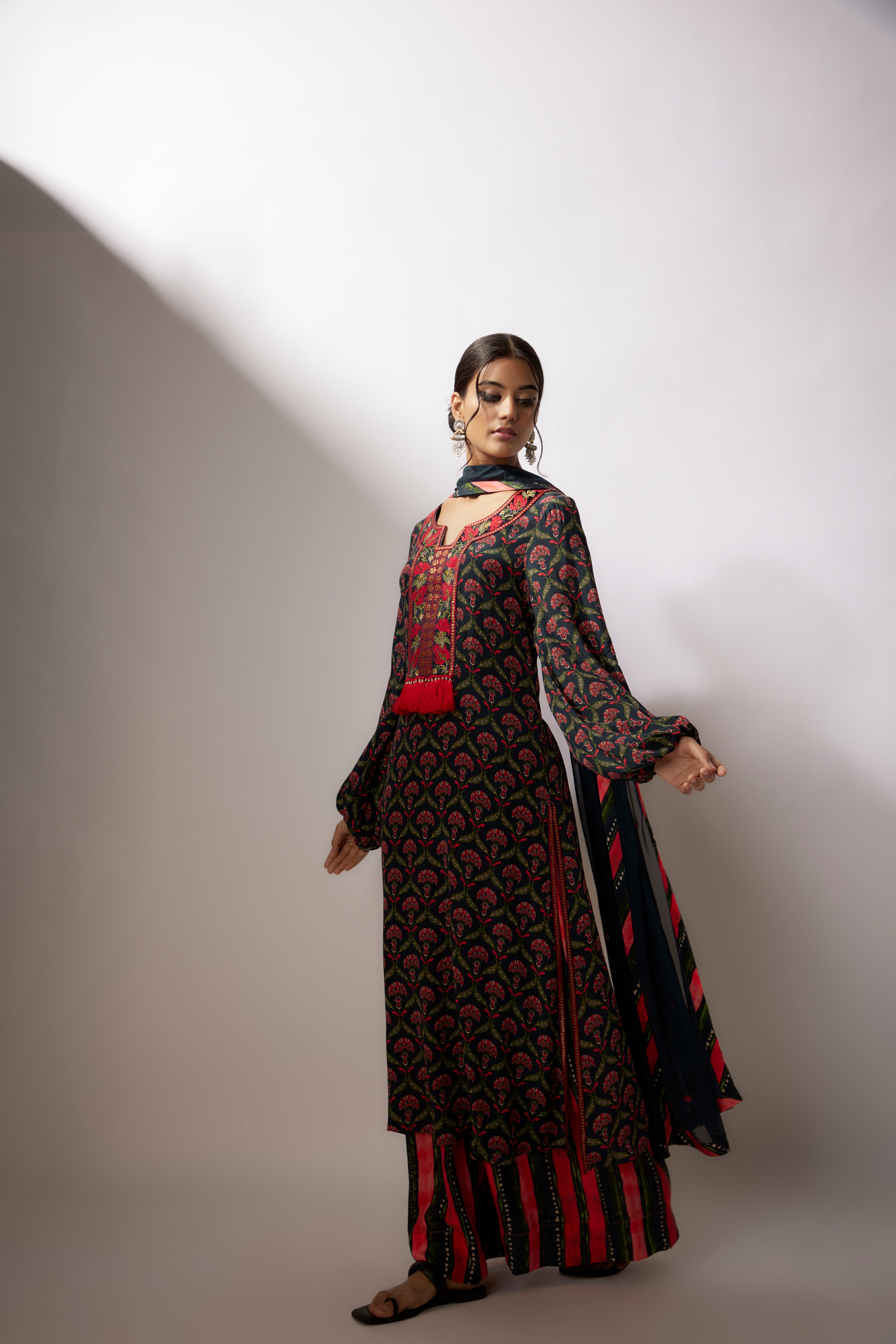 طقم كورتا مطبوع من الكريب باللون الأزرق الداكن