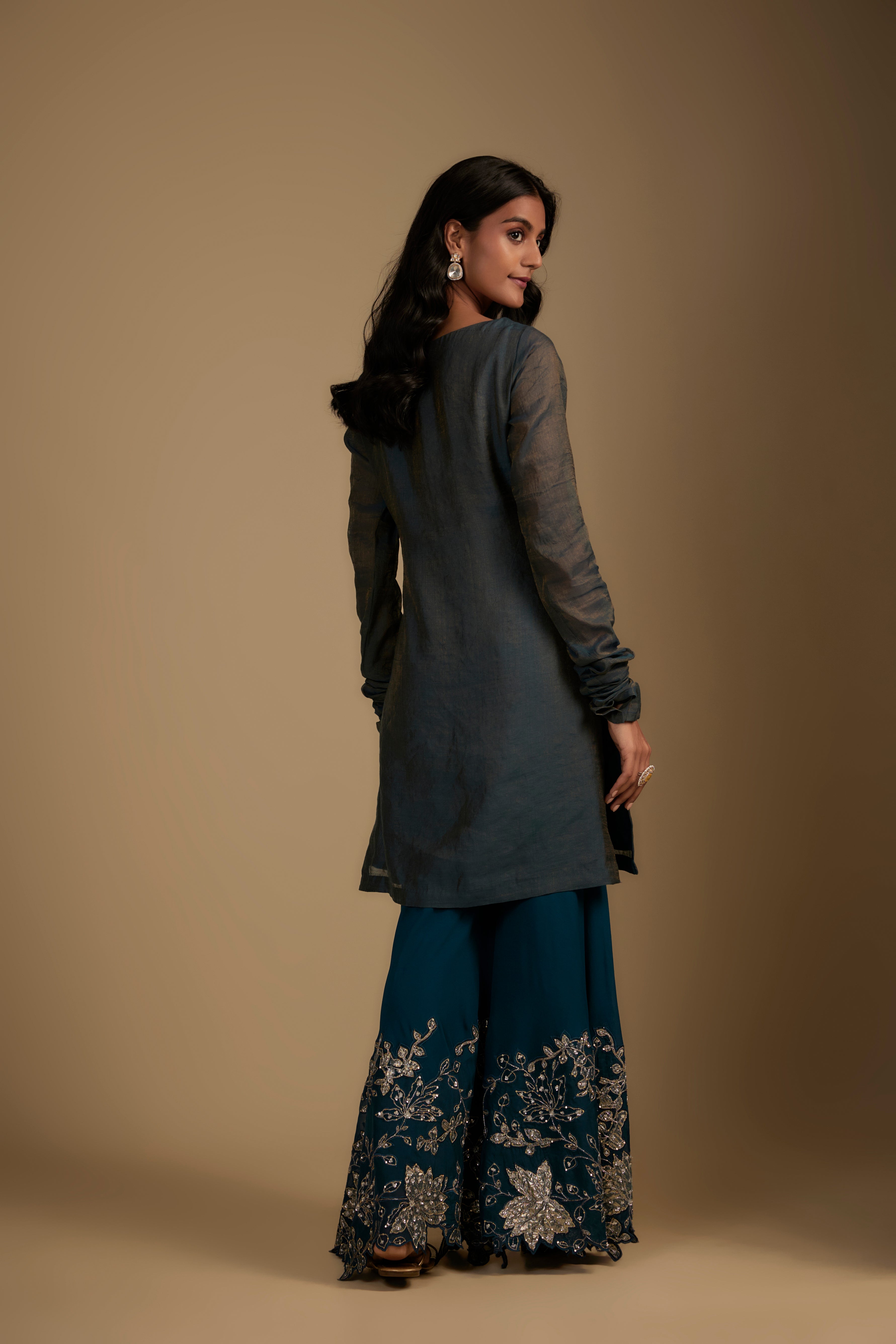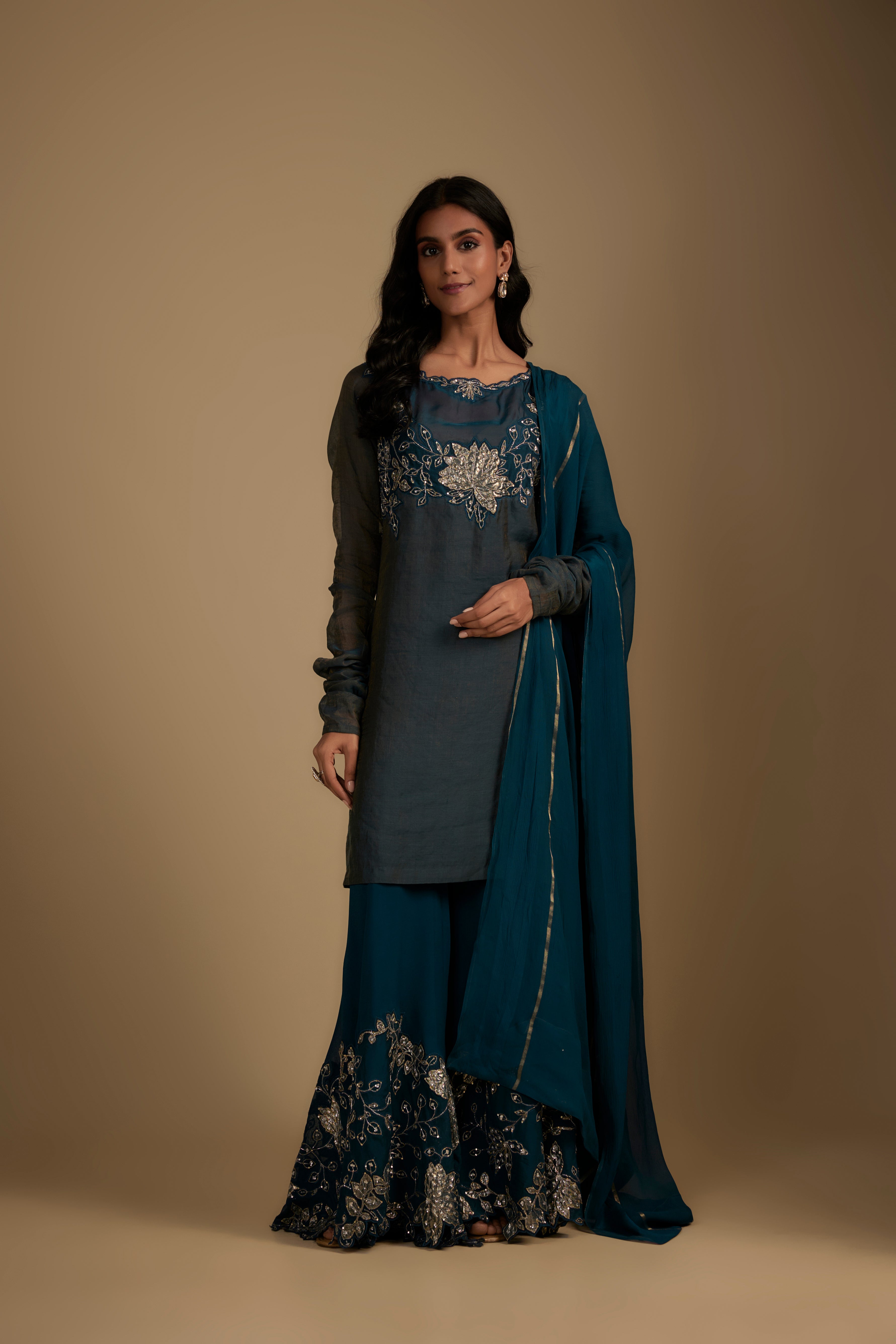 تتميز بكورتا باللون الأزرق الكوبالت من قماش تشانديري مع تطريز قطع وزاردوسي مع بنطلون جارارا مطرز مطابق من قماش جورجيت وأورجانزا. تأتي مع دوباتا جورجيت مطابقة.