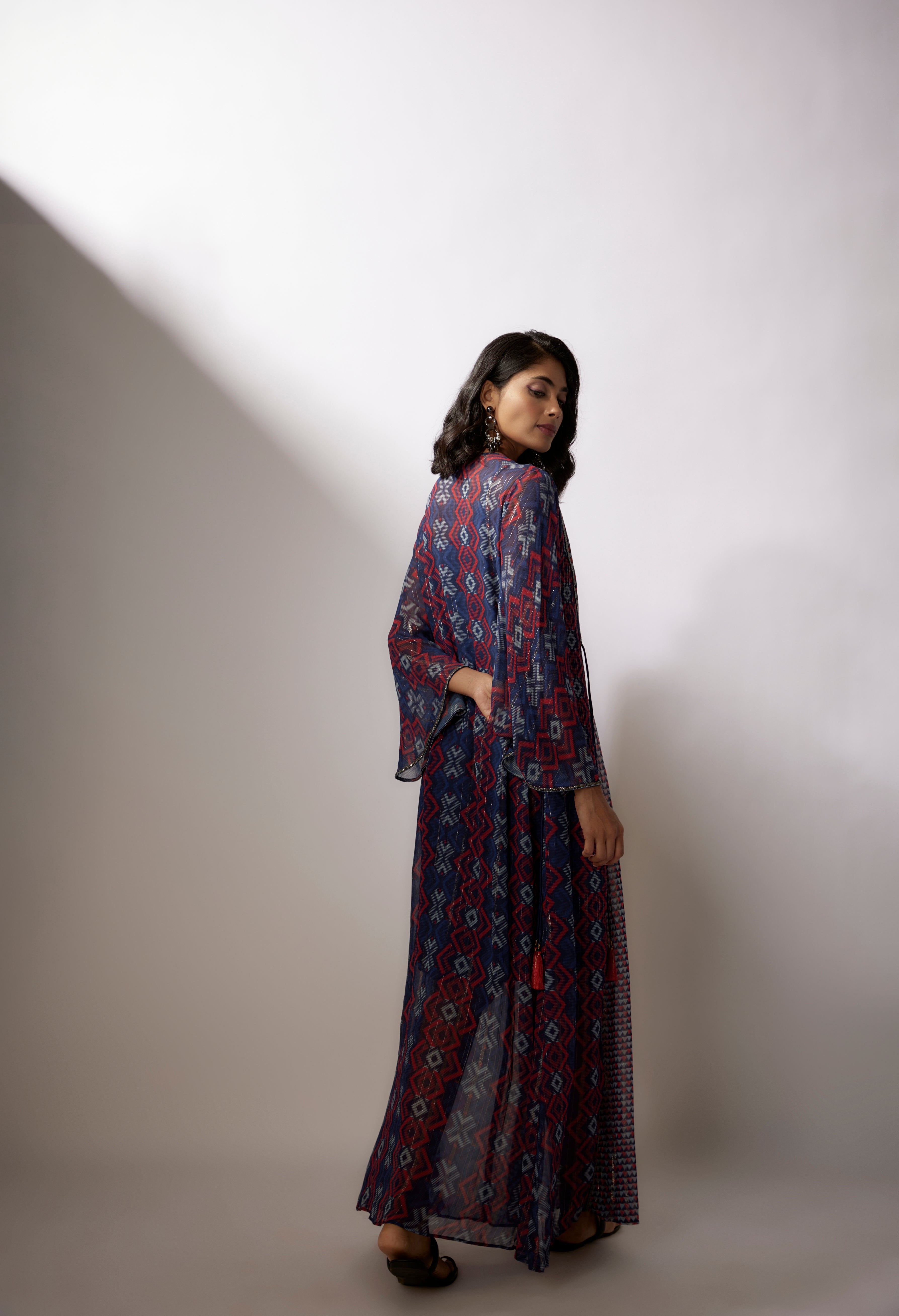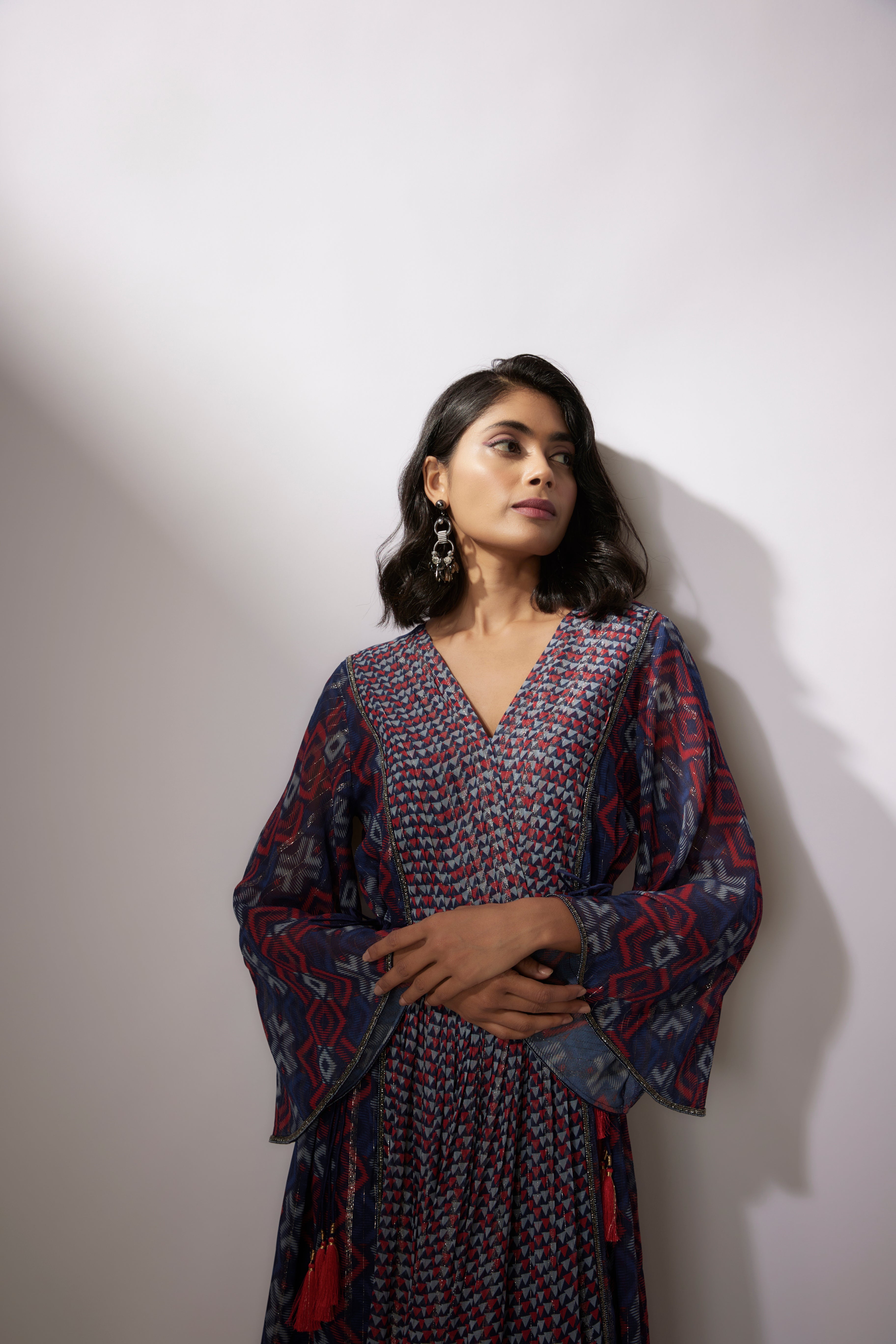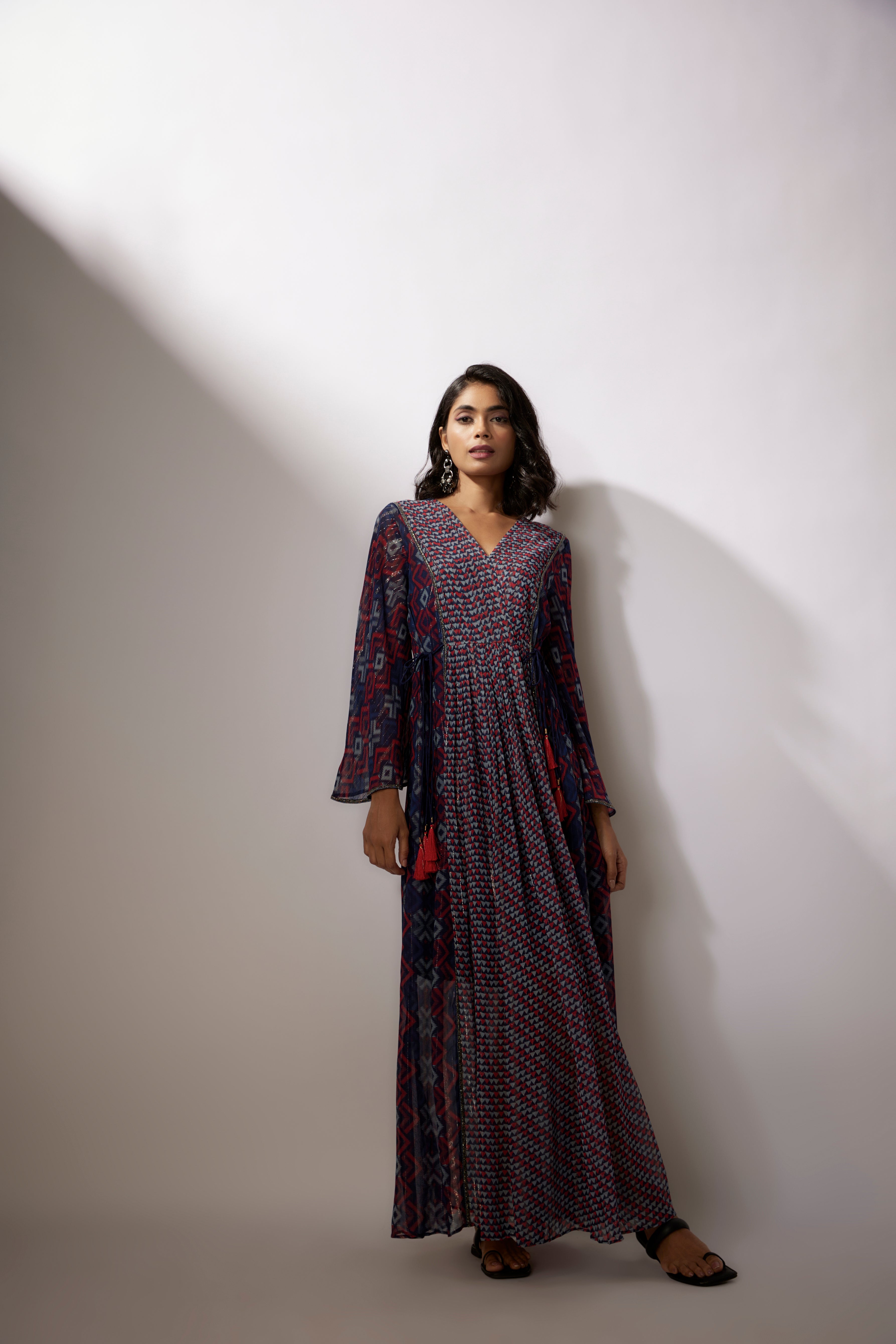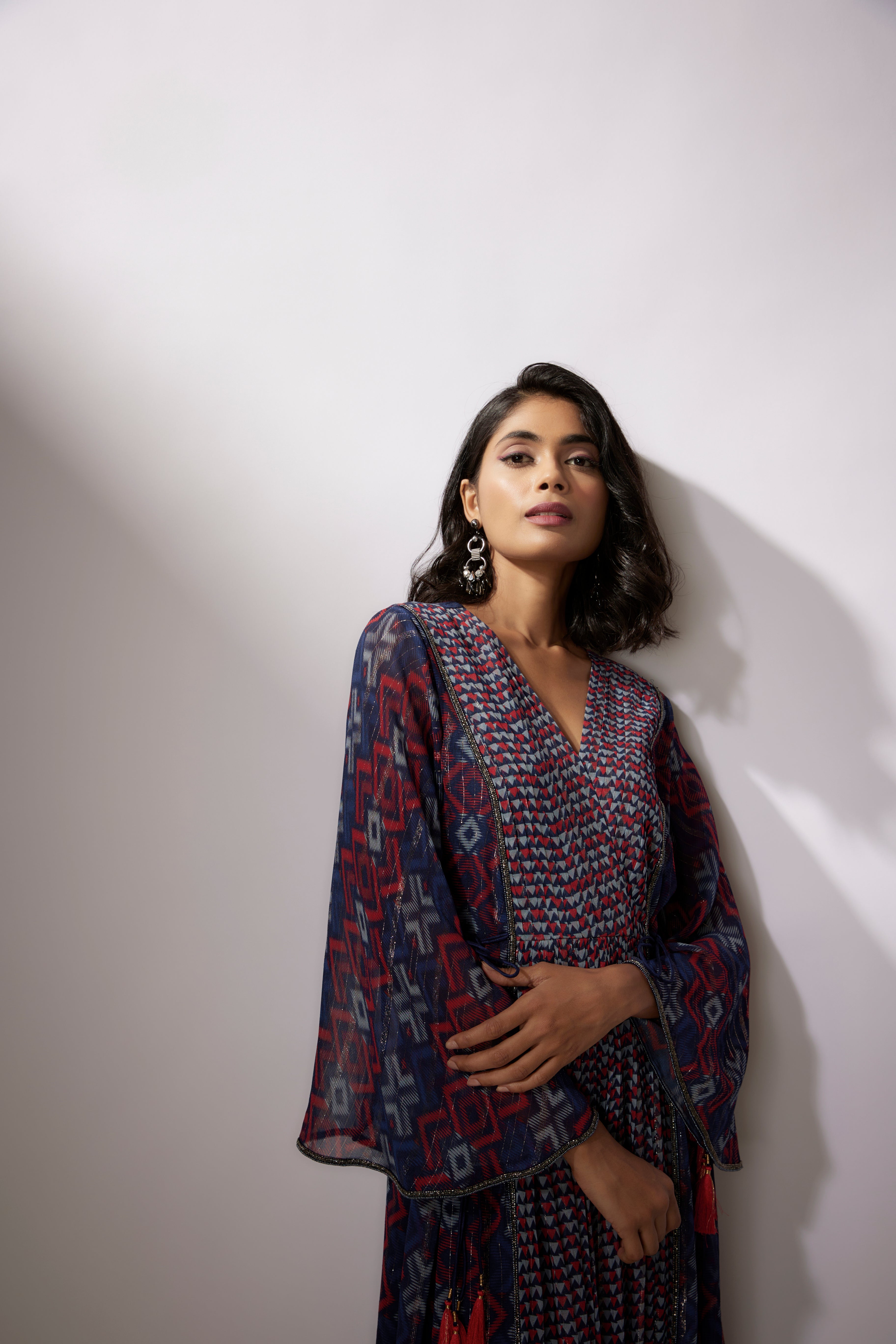 تتميز بفستان مطبوع باللون الأزرق من قماش جورجيت لوريكس مع تطريز وتفاصيل من الخيوط. يأتي مع بطانة من قماش سانتون
