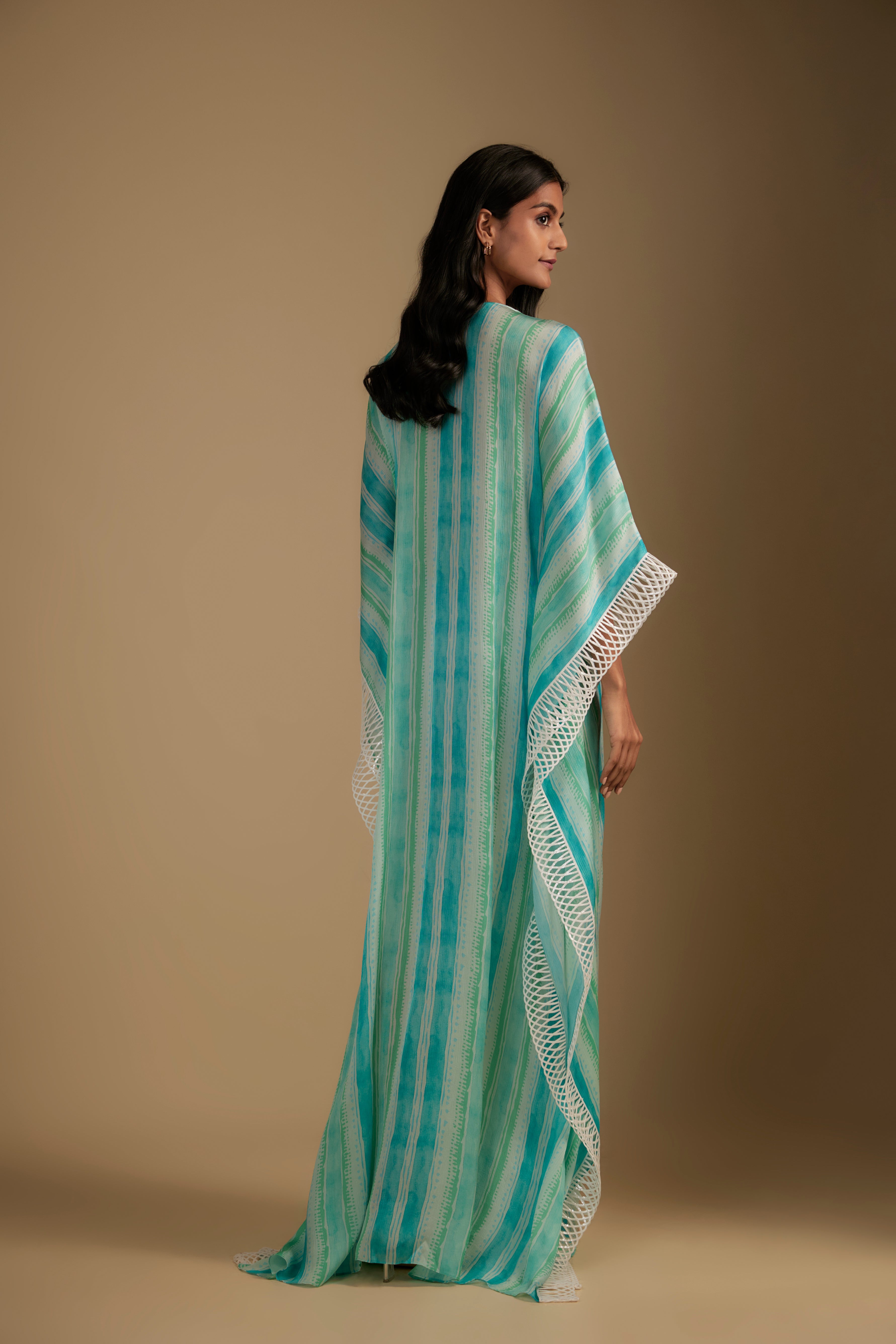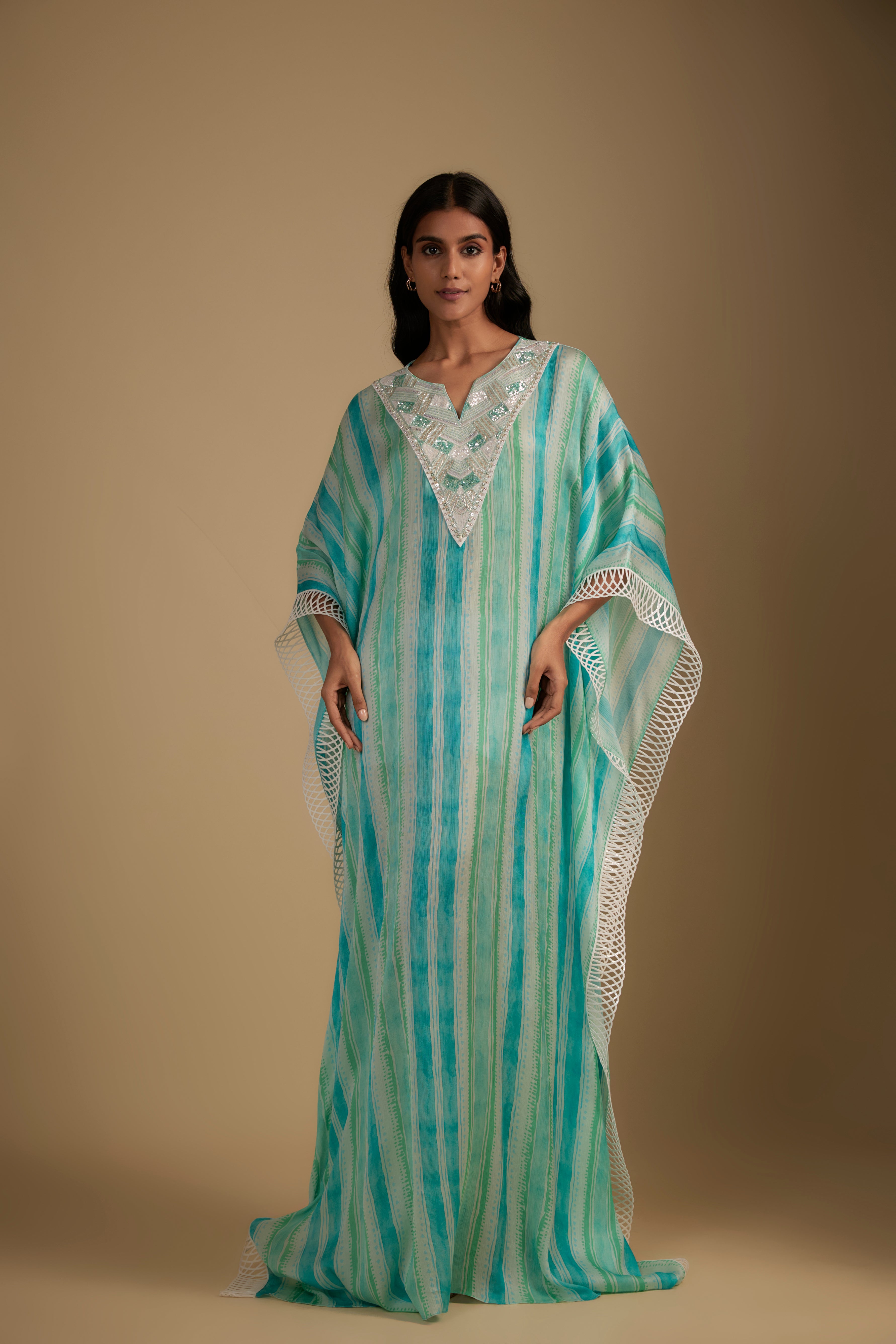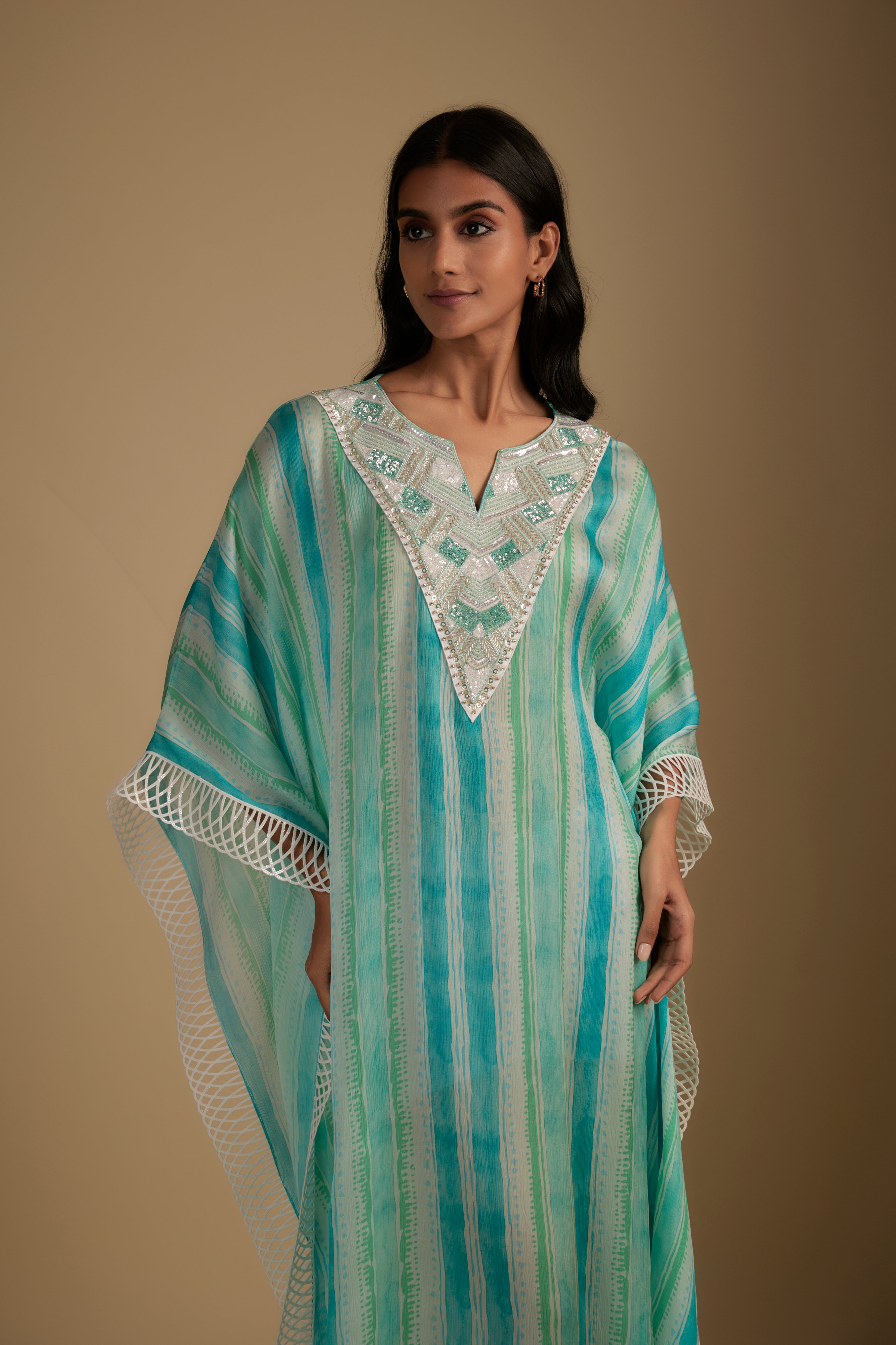 يتميز بقفطان أزرق سماوي على قاعدة من قطن كراش مع طباعة رقمية وتطريز بالترتر وتقليمات من الدانتيل.