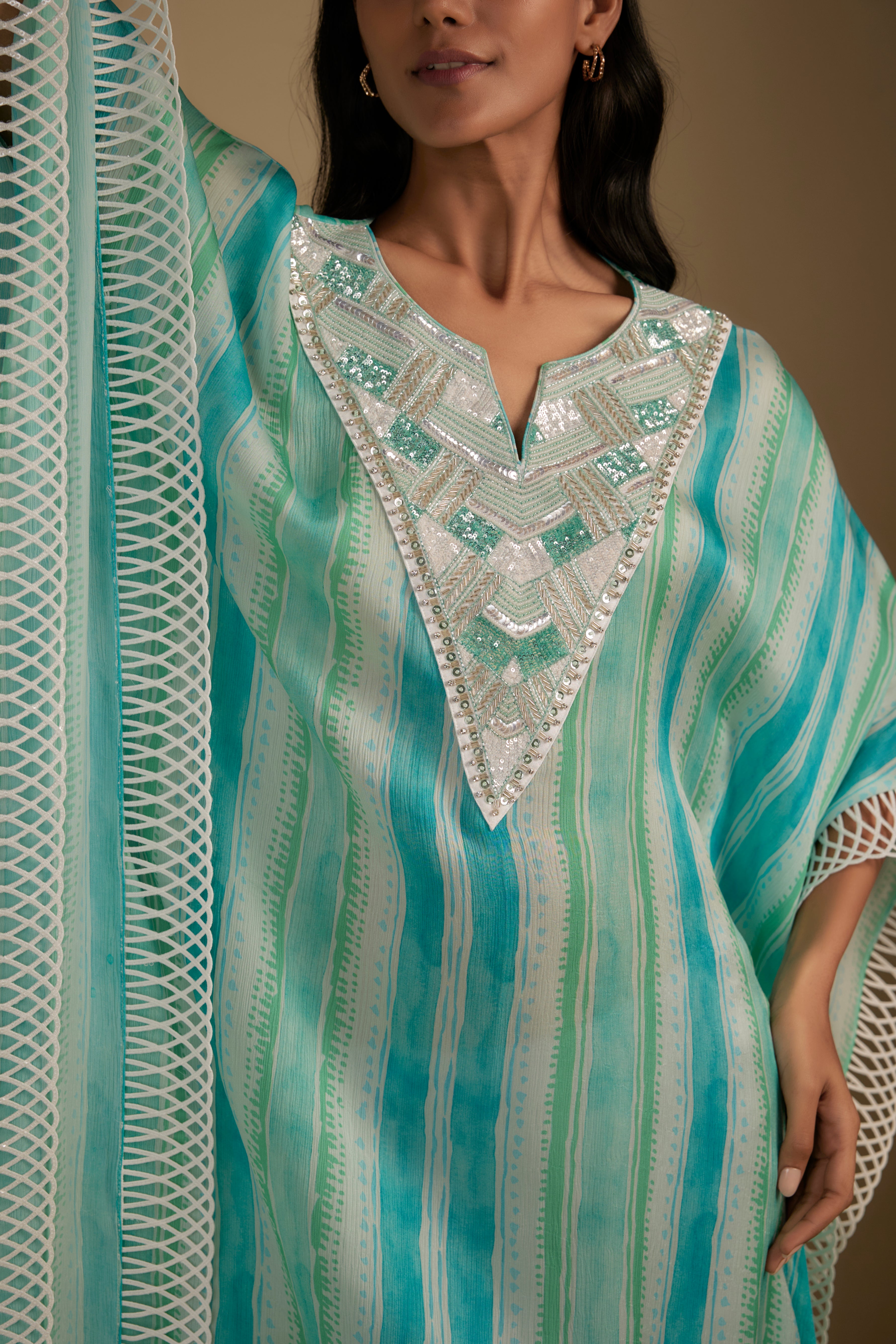 كافتان مطبوع رقميًا ومزين بالترتر من القطن الأزرق السماوي