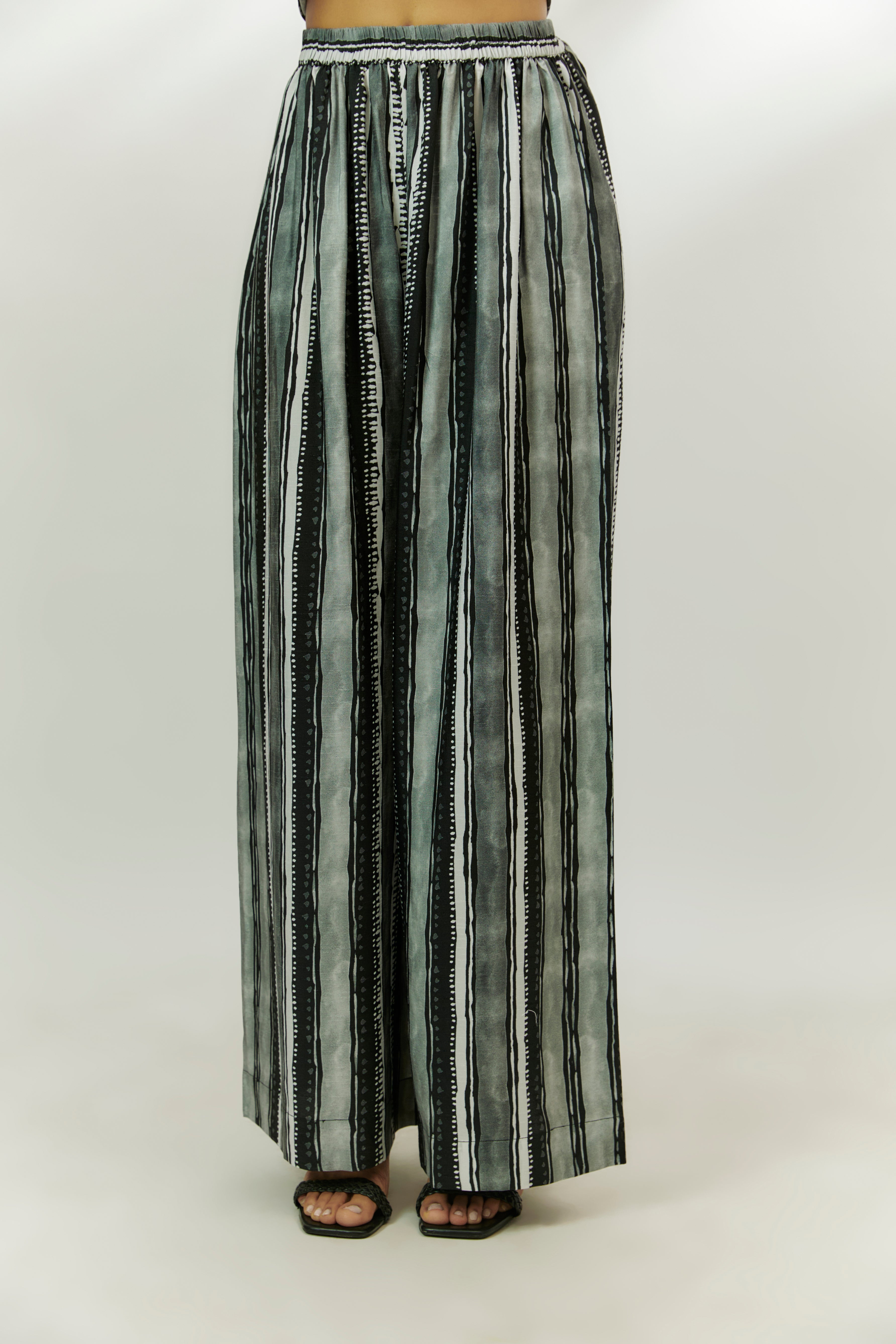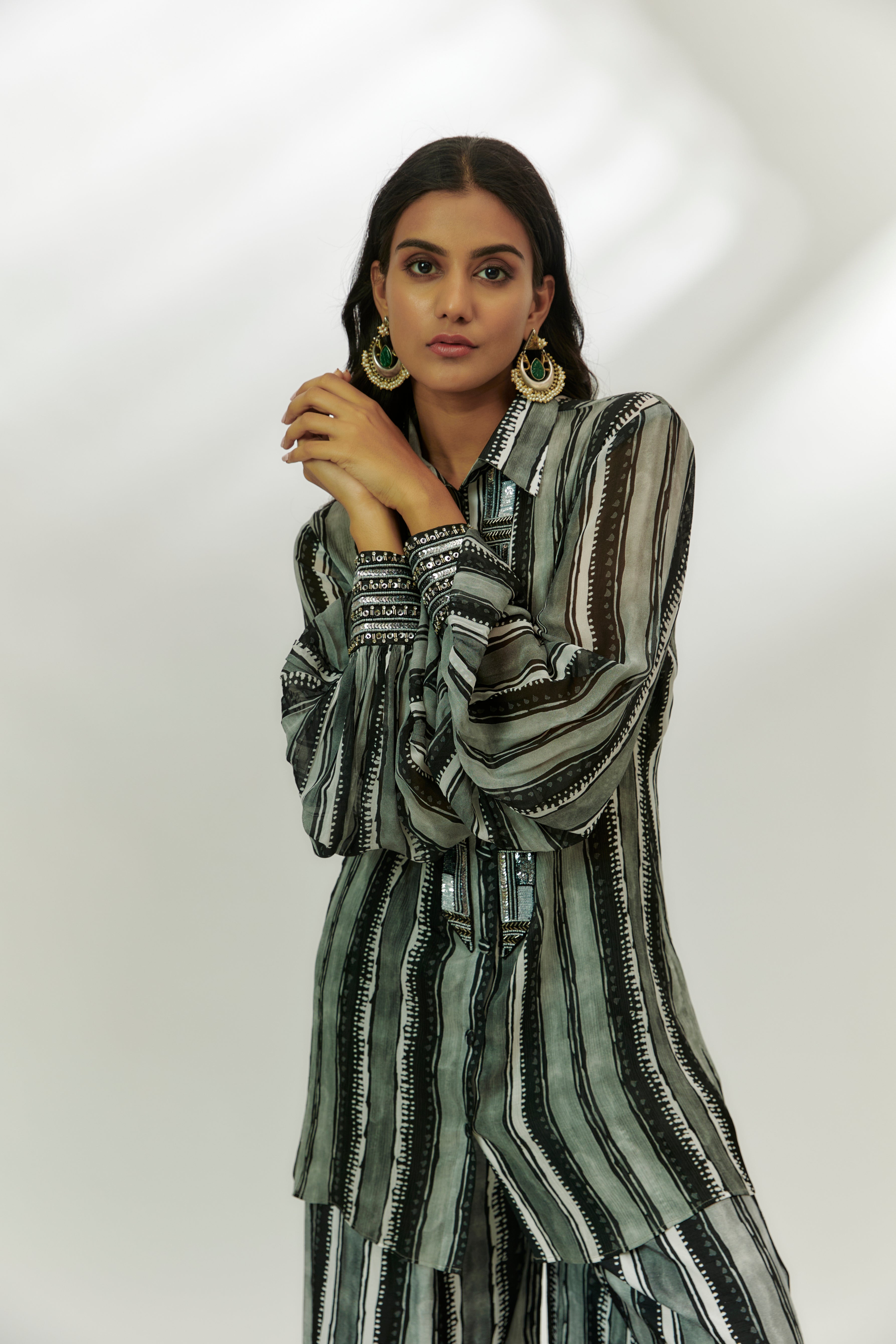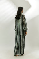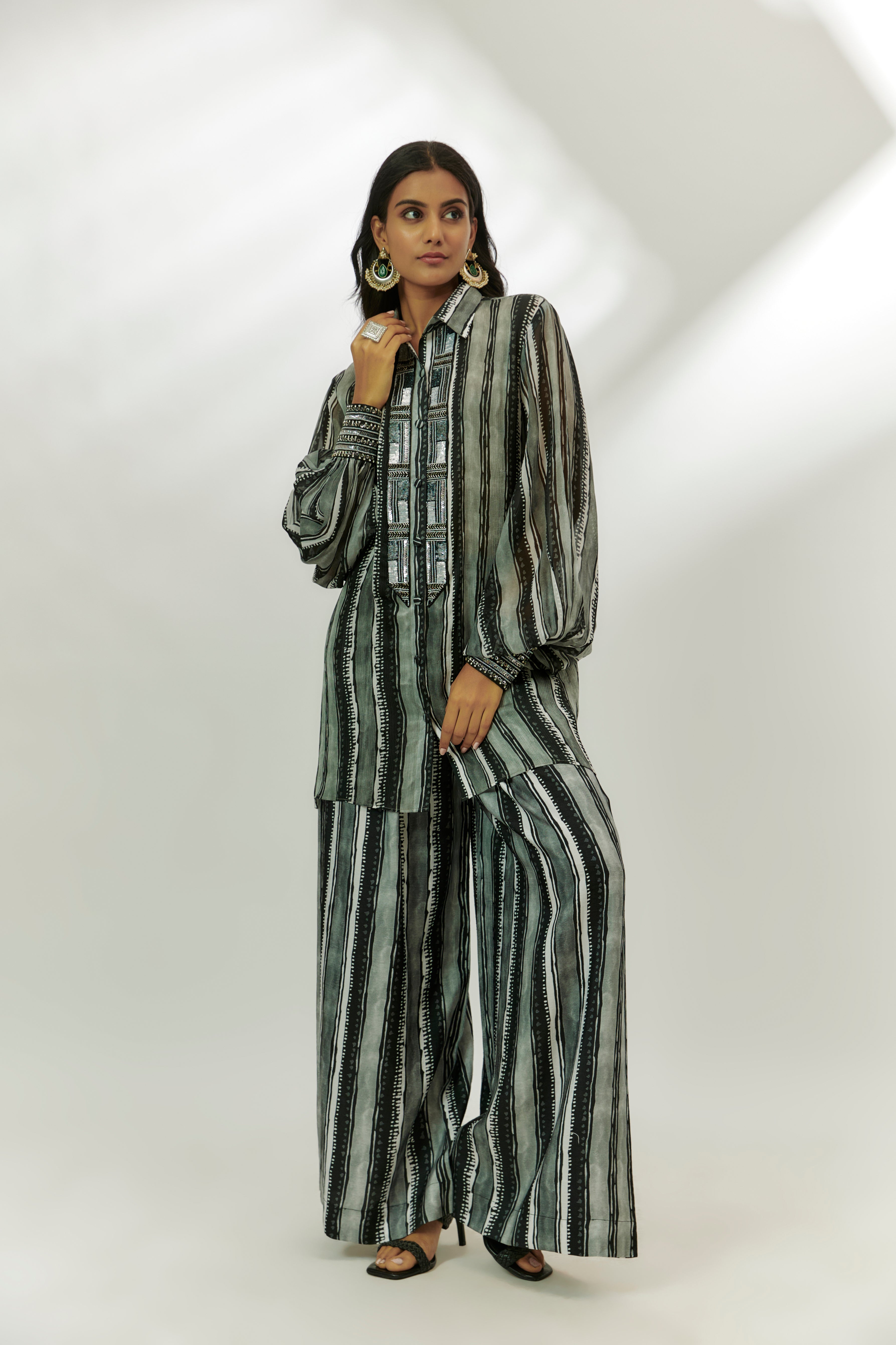 يتميز بقميص أسود من قماش كوتن كراش مع طباعة رقمية مخططة، وتطريز بالخرز والزردوزي. يتم تنسيقه مع بنطلون دوبون. أبرزيه مع مجوهرات بارزة وكعب عالٍ لمظهر كامل.