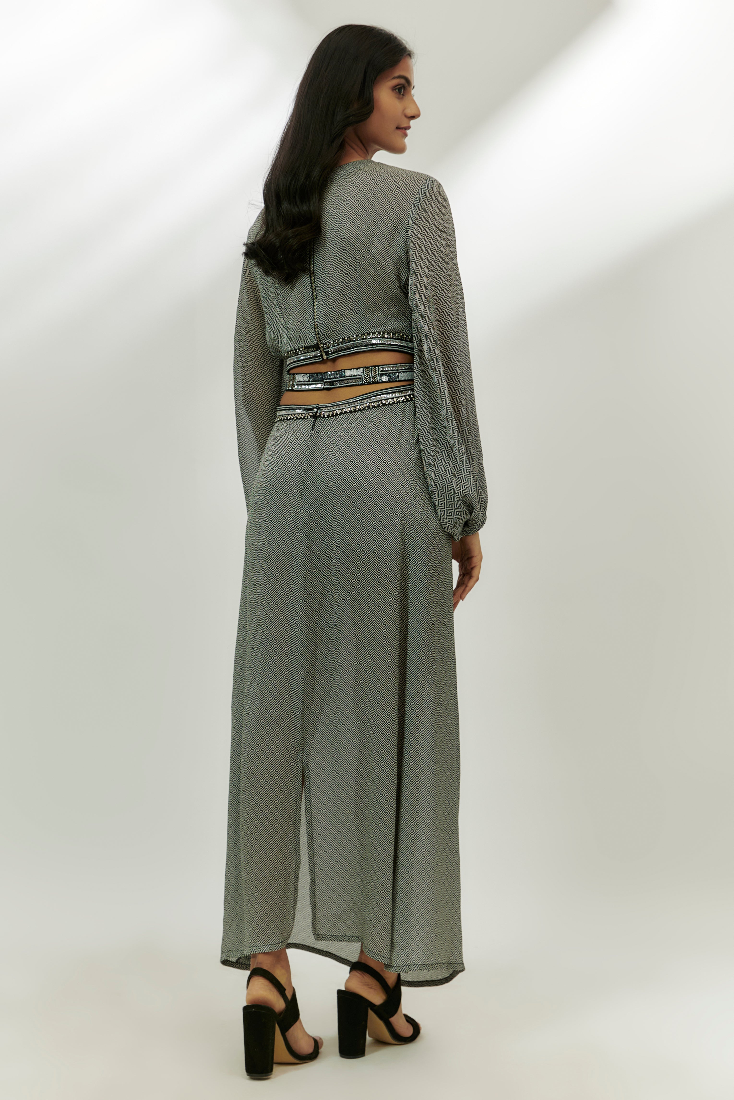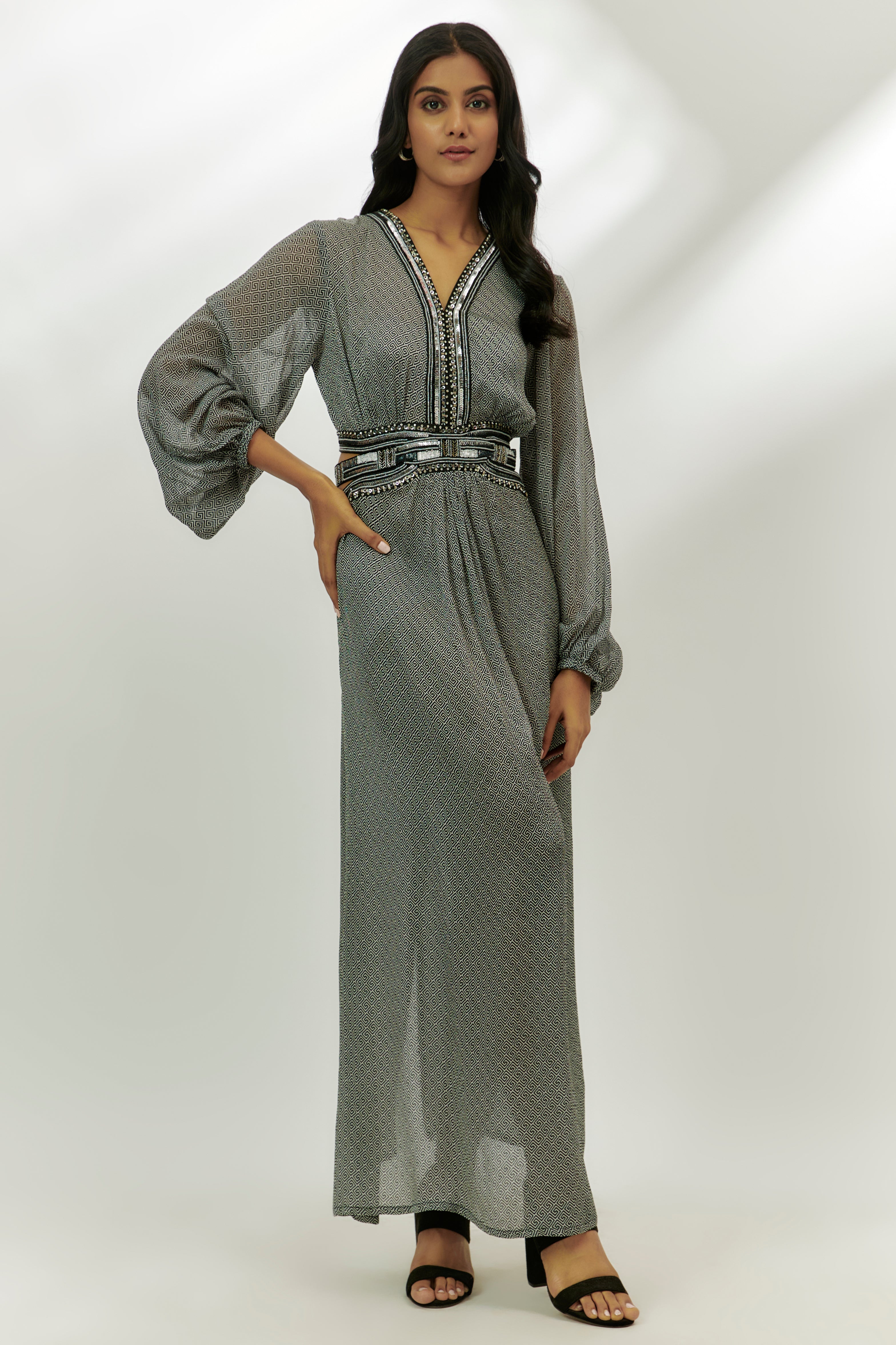 يتميز بفستان ماكسي أسود من قماش القطن مع طباعة رقمية، وخرز، وتطريز زردوسي. أبرزيه مع مجوهرات بارزة وكعب عالٍ لمظهر كامل.