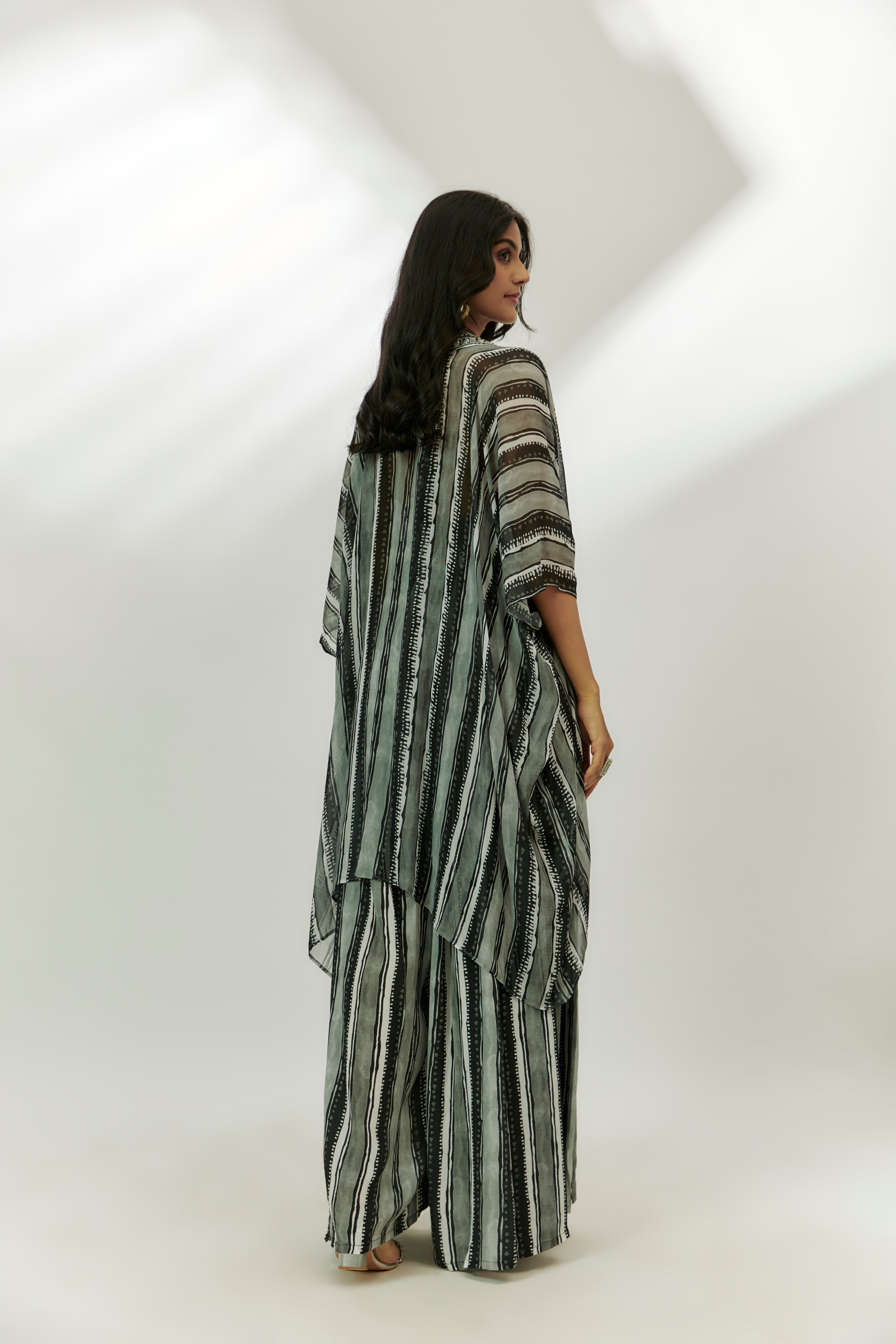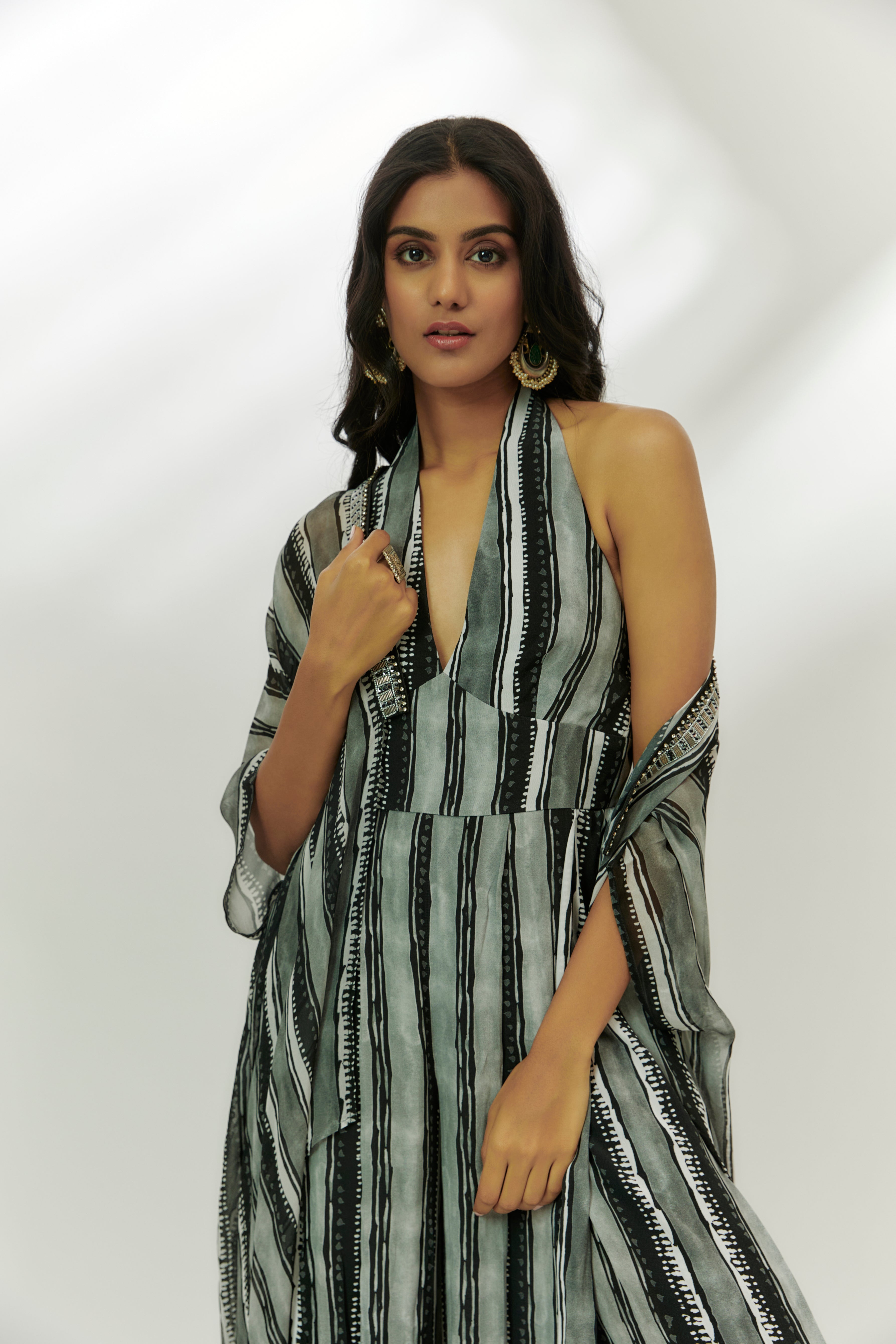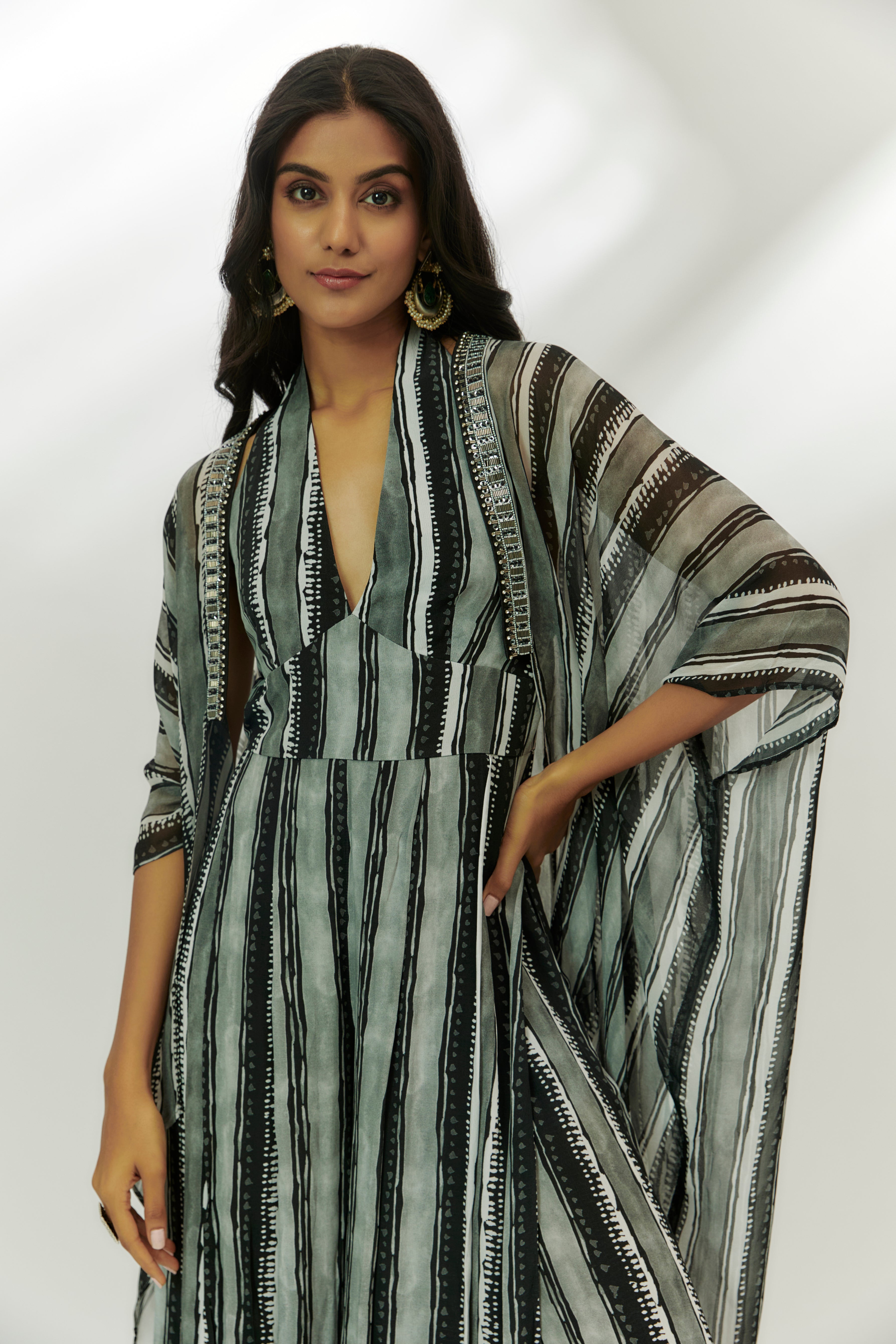 يتميز ببدلة سوداء من قاعدة كريب مع طباعة رقمية مخططة. يتم إقرانها بكاب جورجيت مزين بخيوط لامعة وتطريز زردوزي. أضف إليها مجوهرات بارزة وكعب عالٍ للحصول على مظهر كامل.