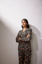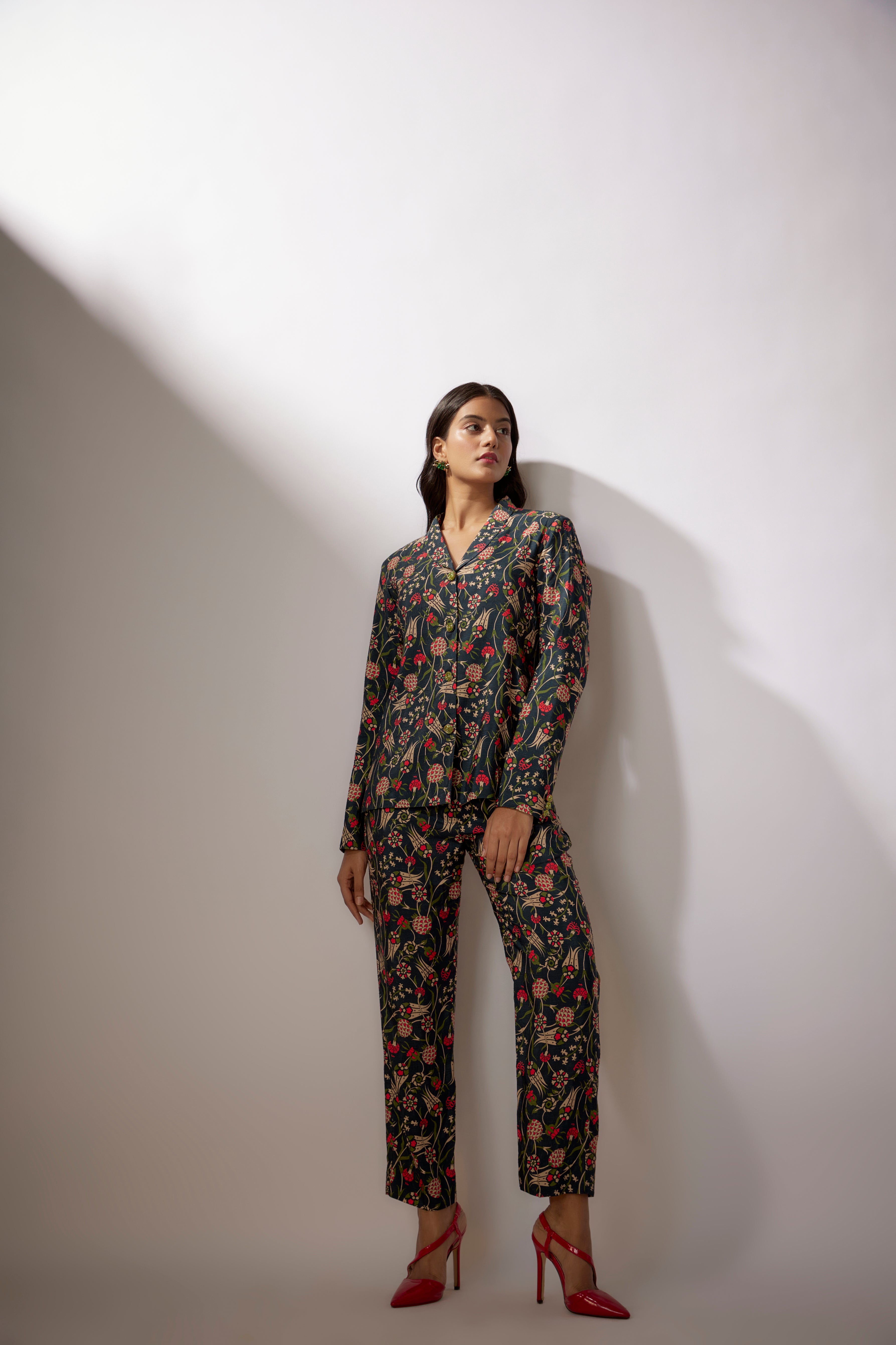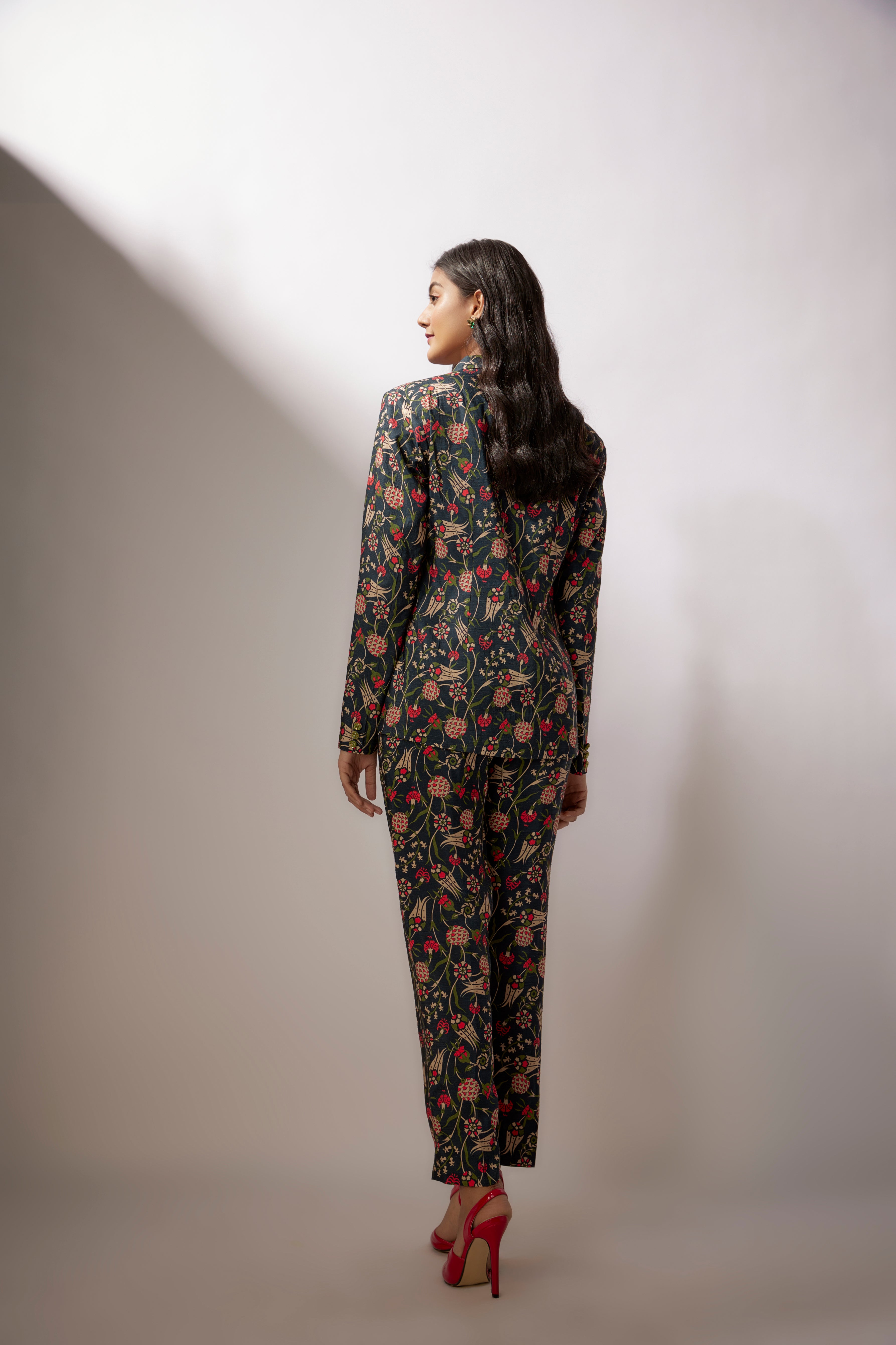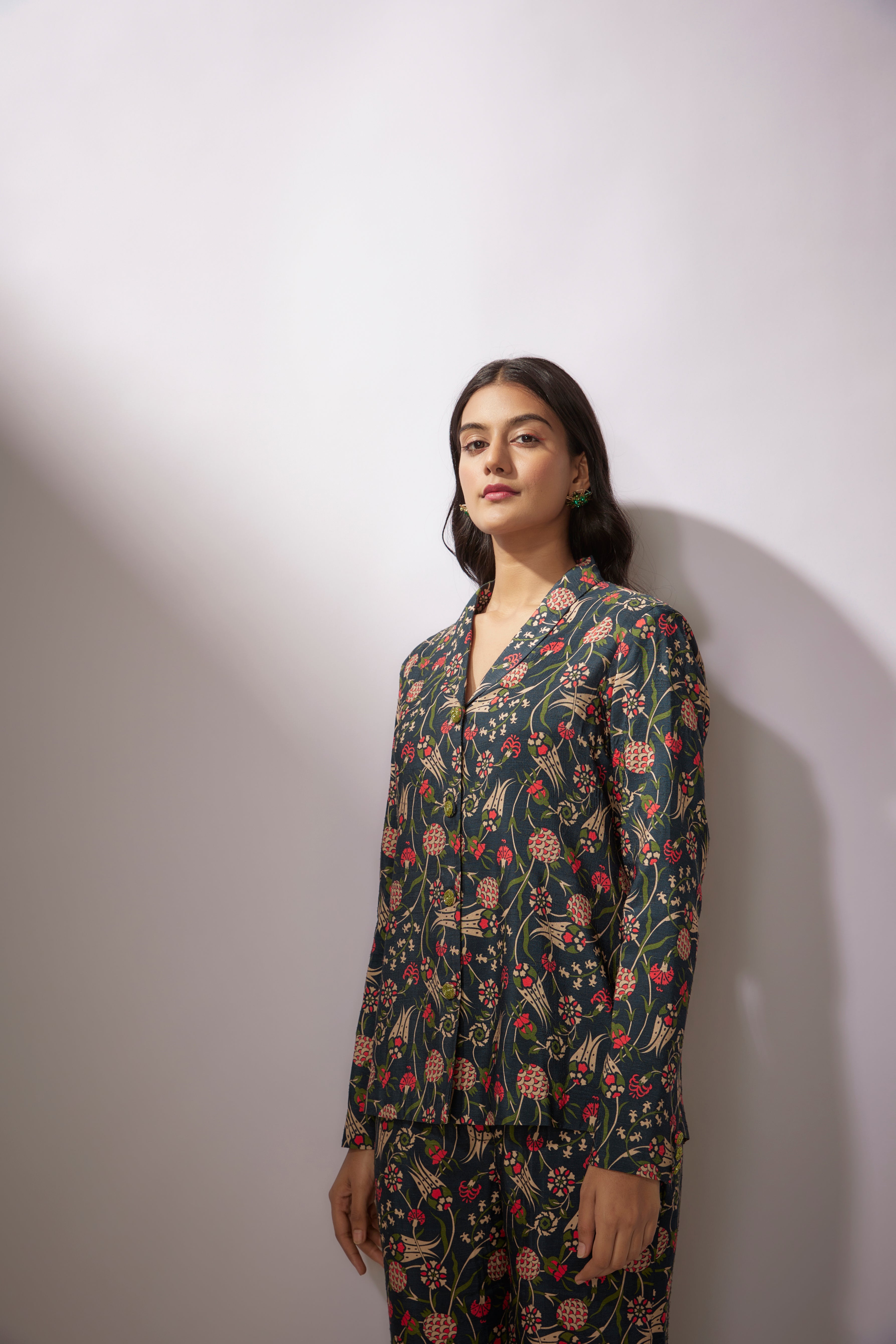يتميز طقم بلايزر مطبوع باللون الأزرق البحري من قماش الدوبيون مع تطريز بالترتر على الأزرار.