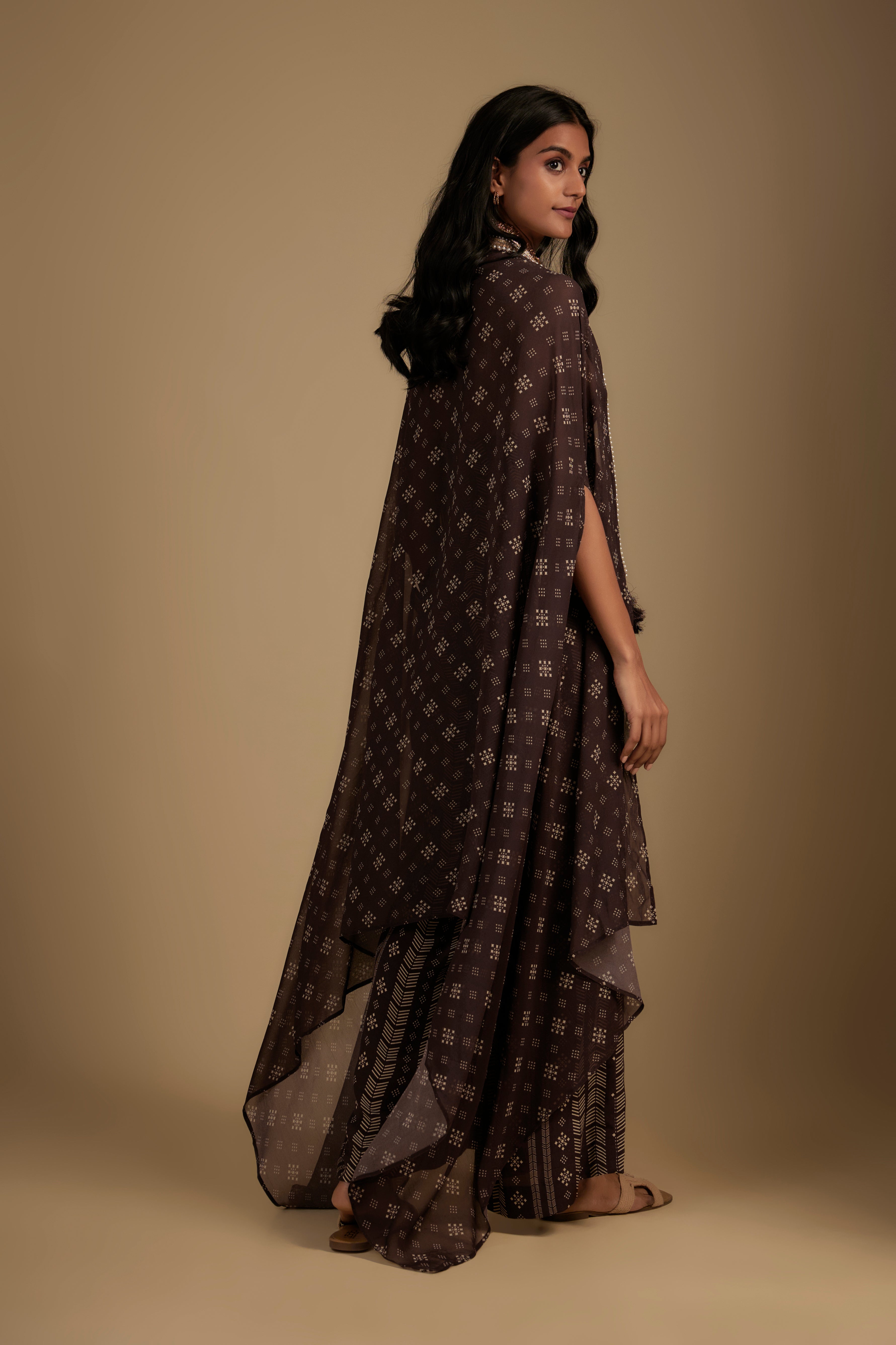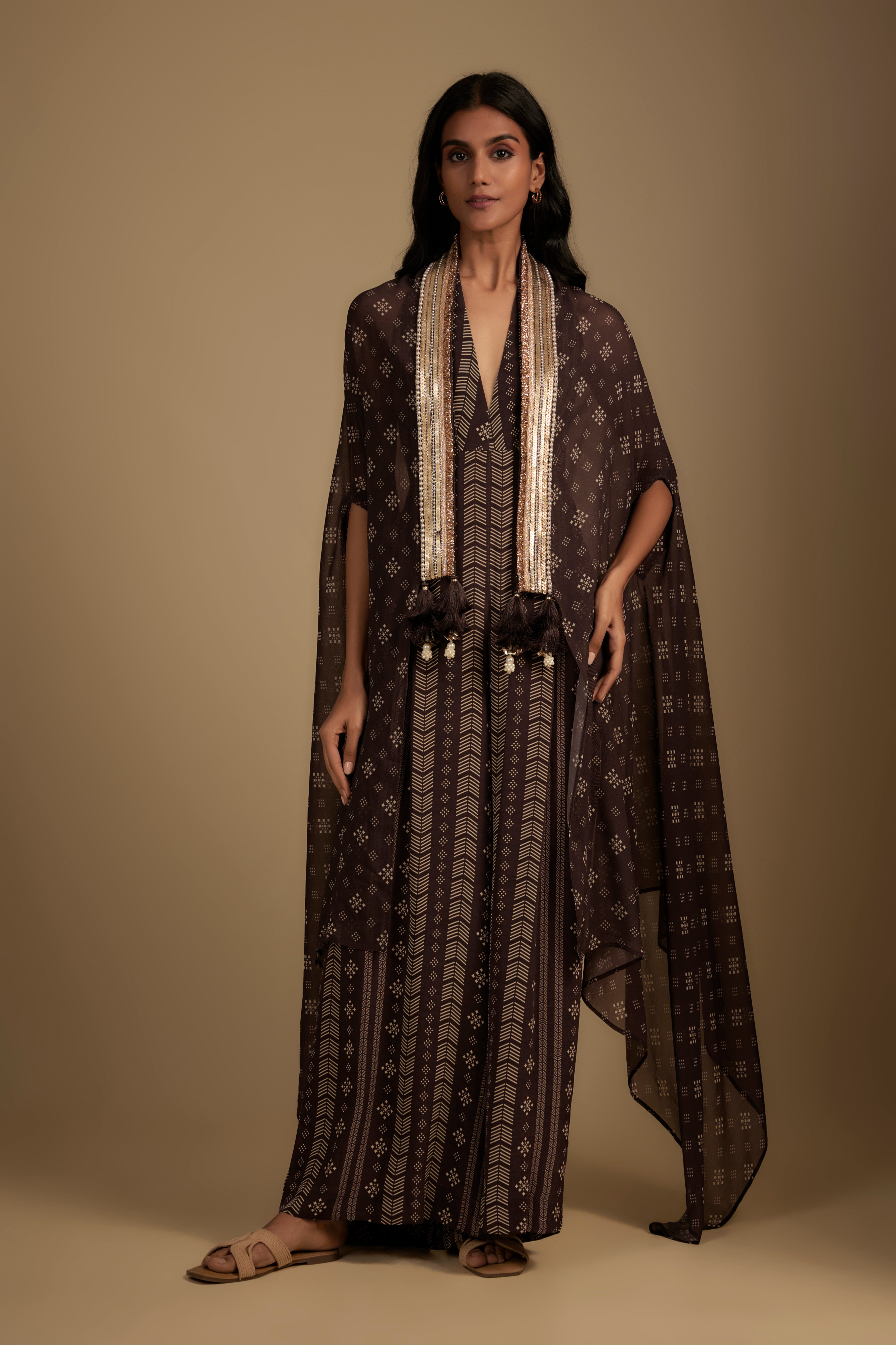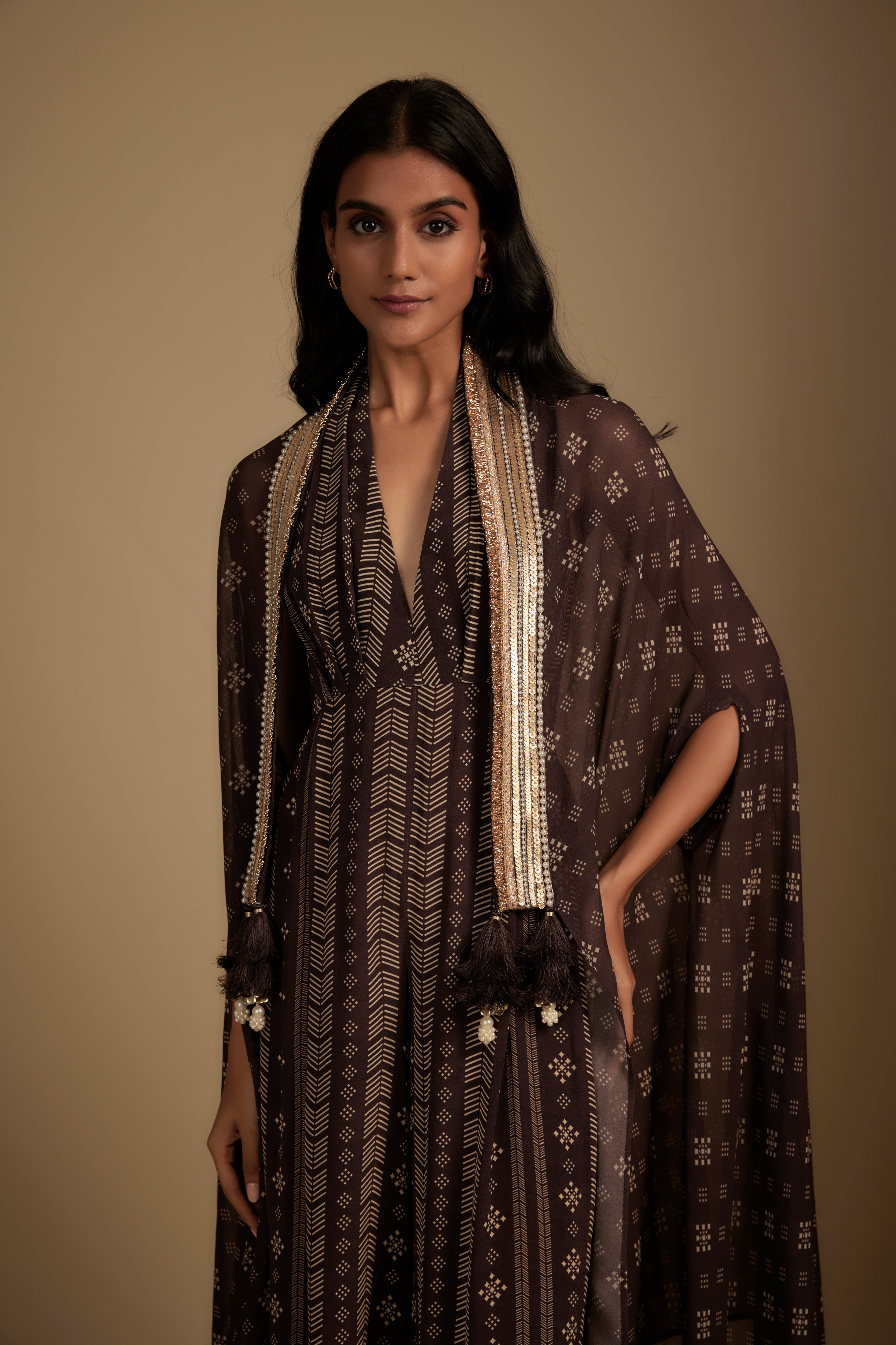تتميز بذلة بنية اللون مصنوعة من قماش الكريب. تم تنسيقها مع عباءة من الجورجيت مزينة بتطريز الترتر والزردوزي. أبرزيها بمجوهرات بارزة وكعب عالي لإطلالة كاملة.