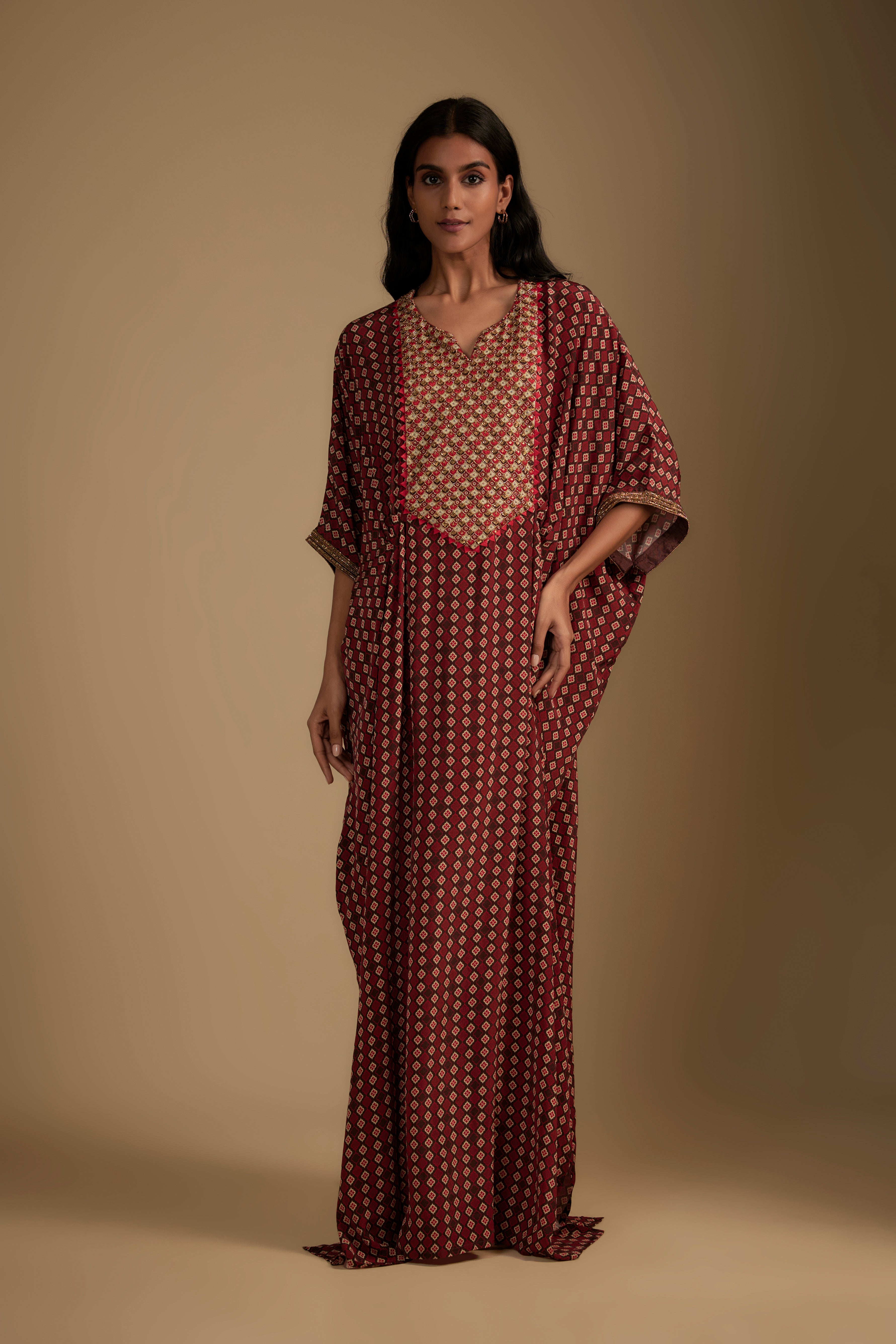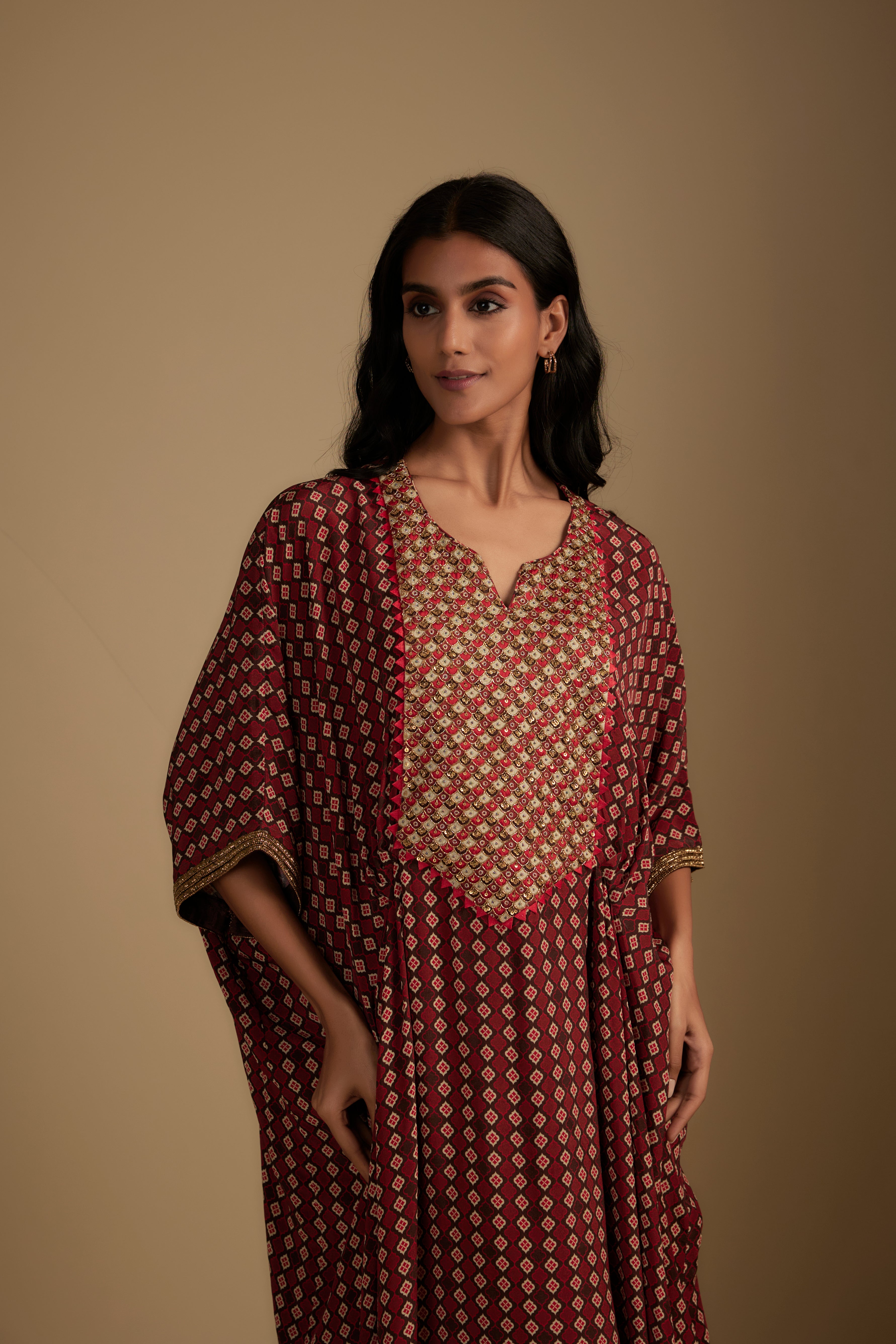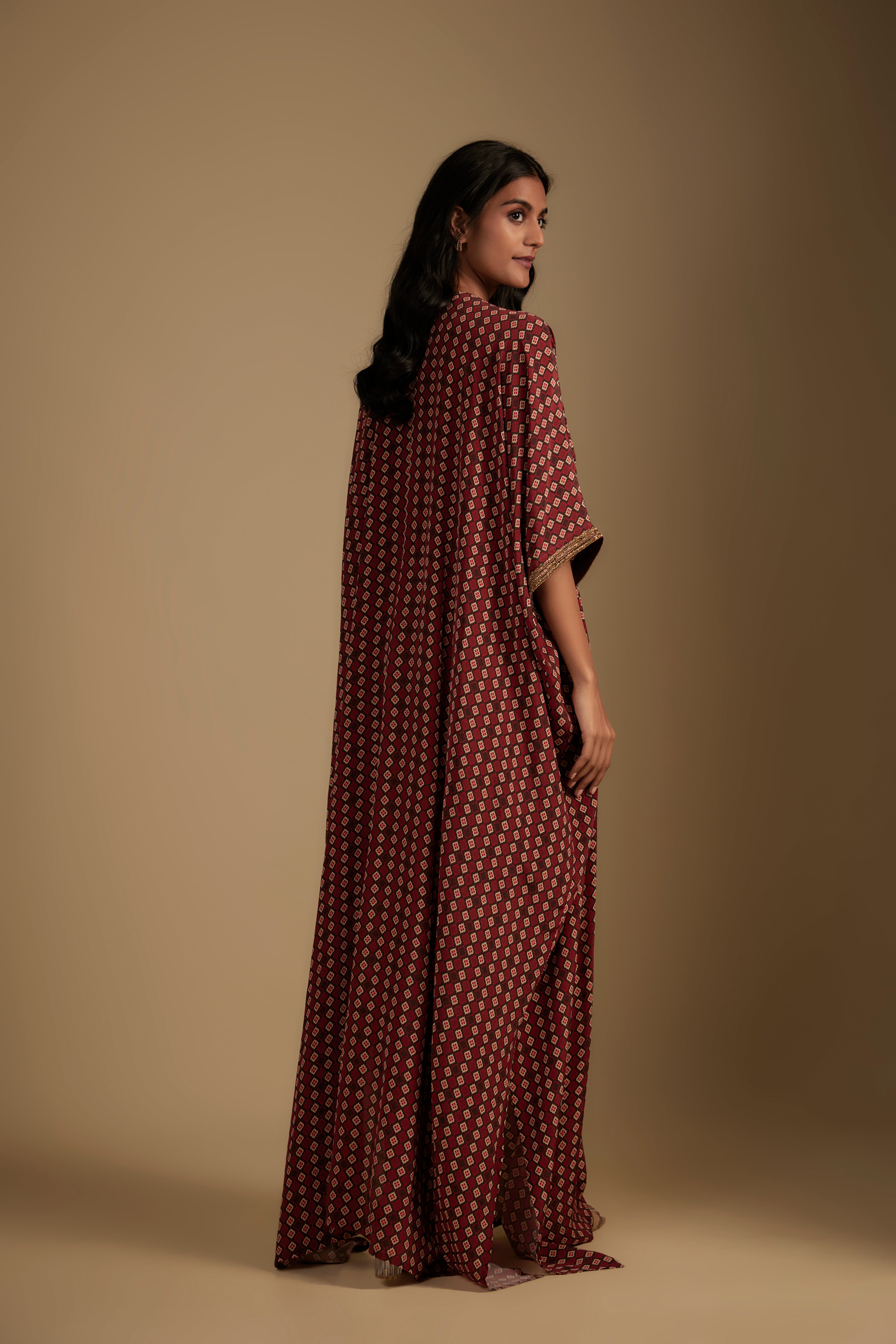 يتميز بكفتان بني مطبوع ومطرز على قاعدة كريب