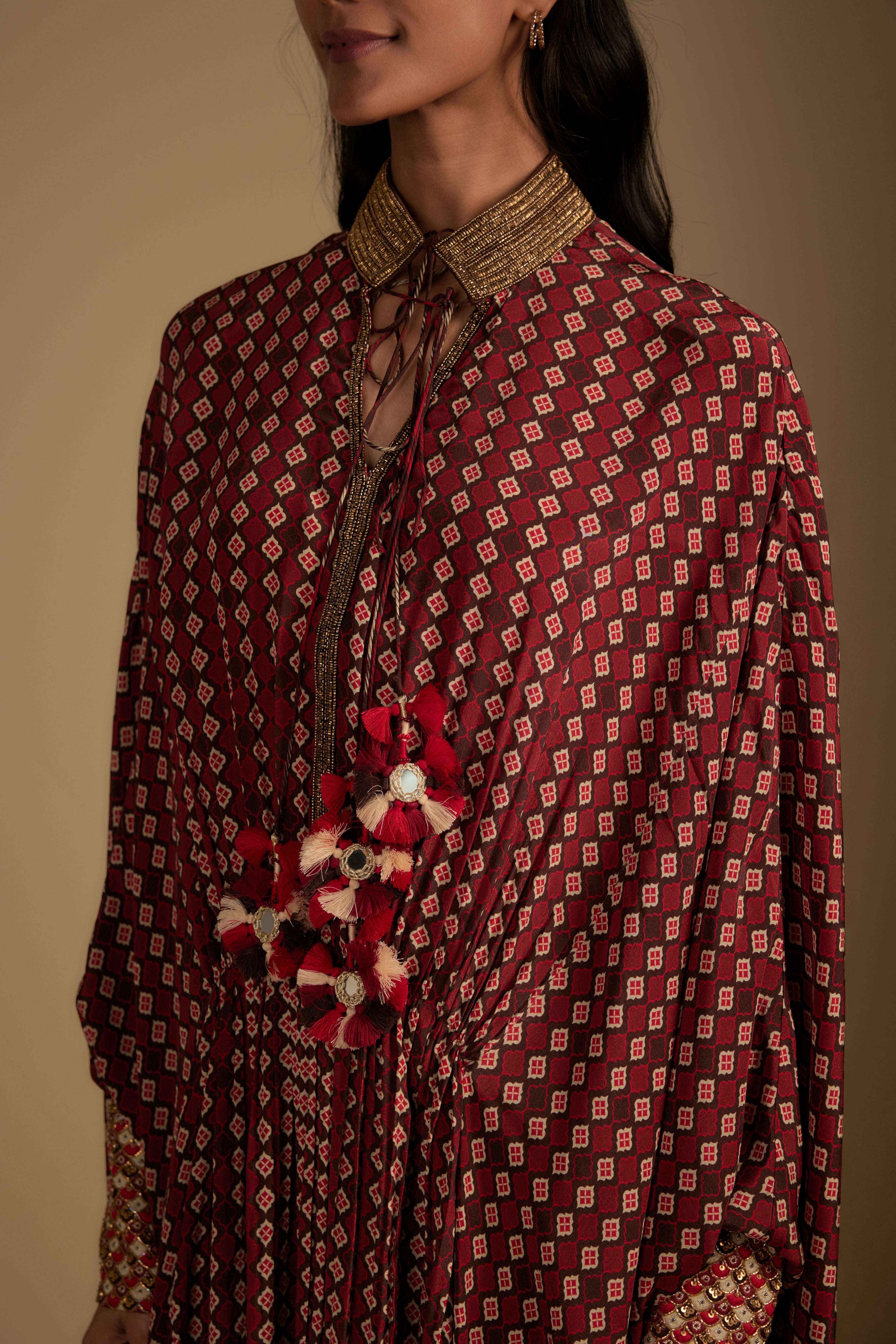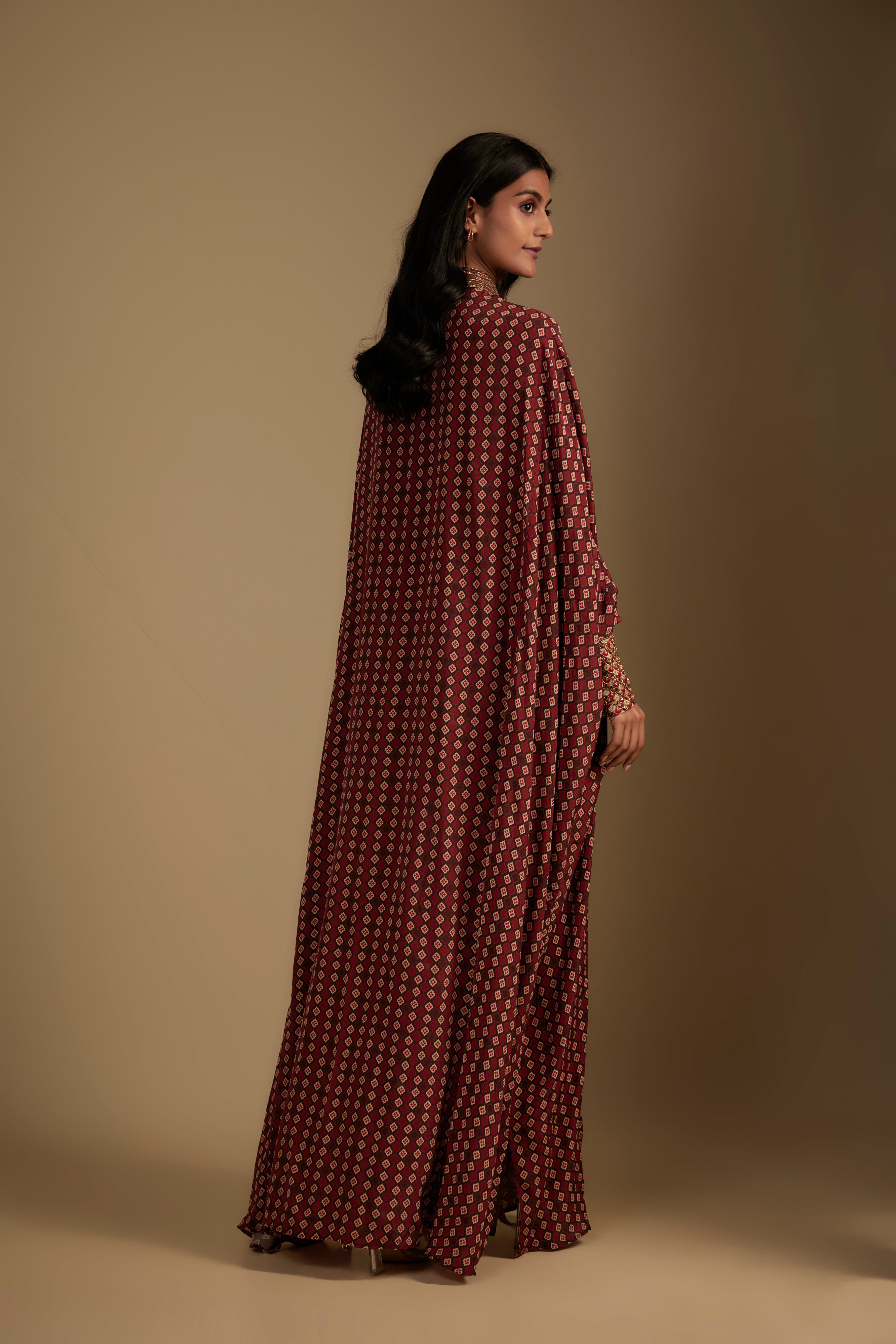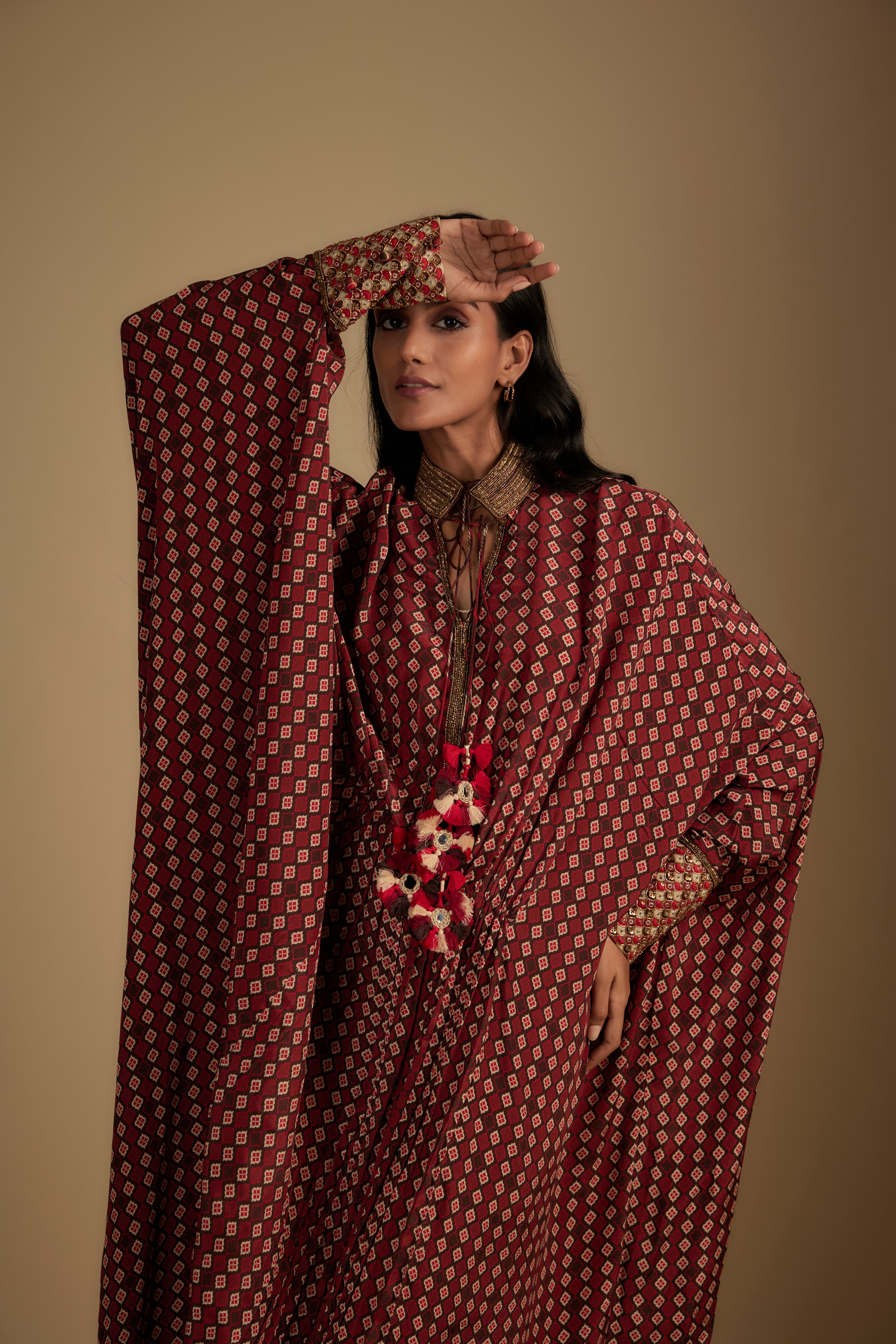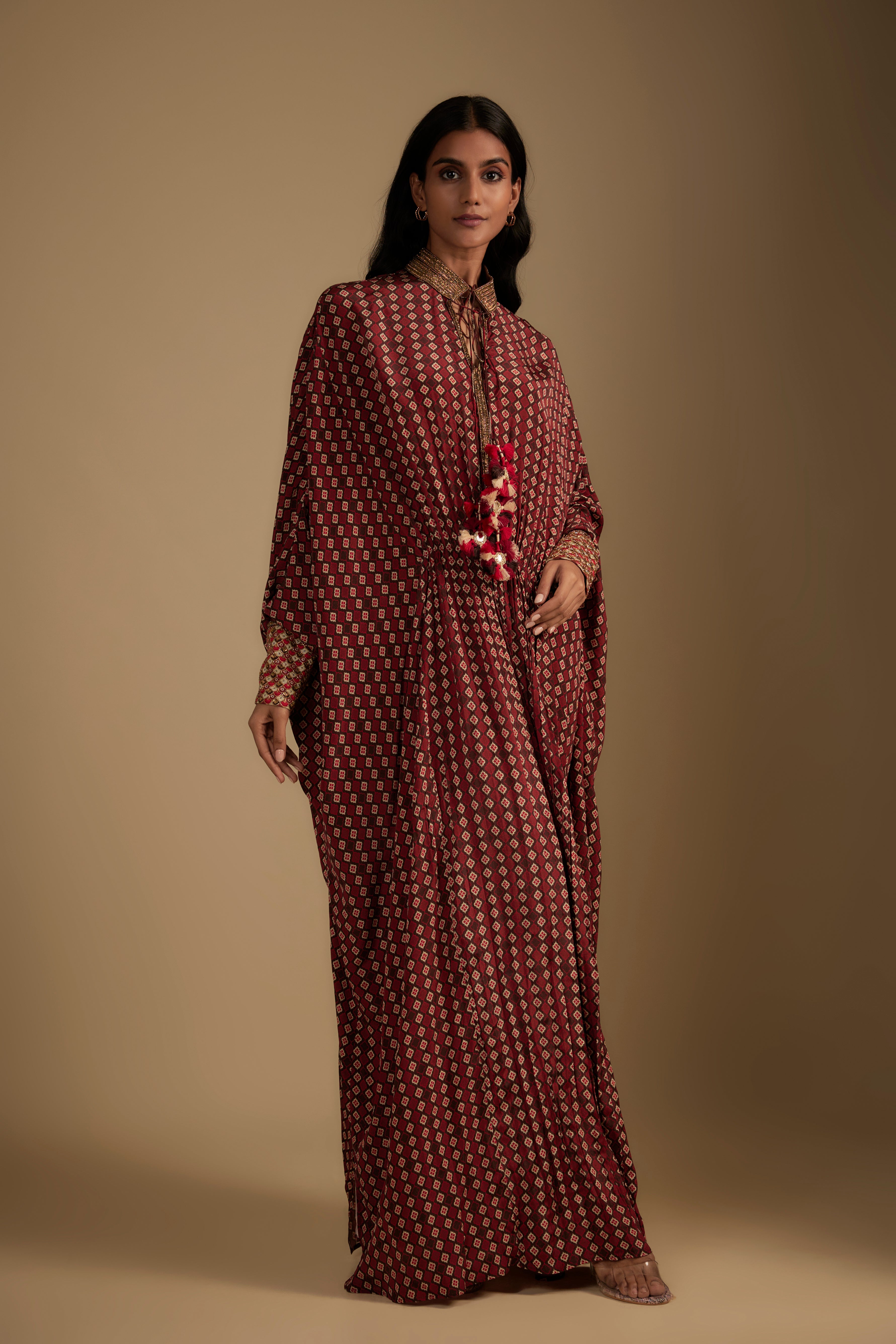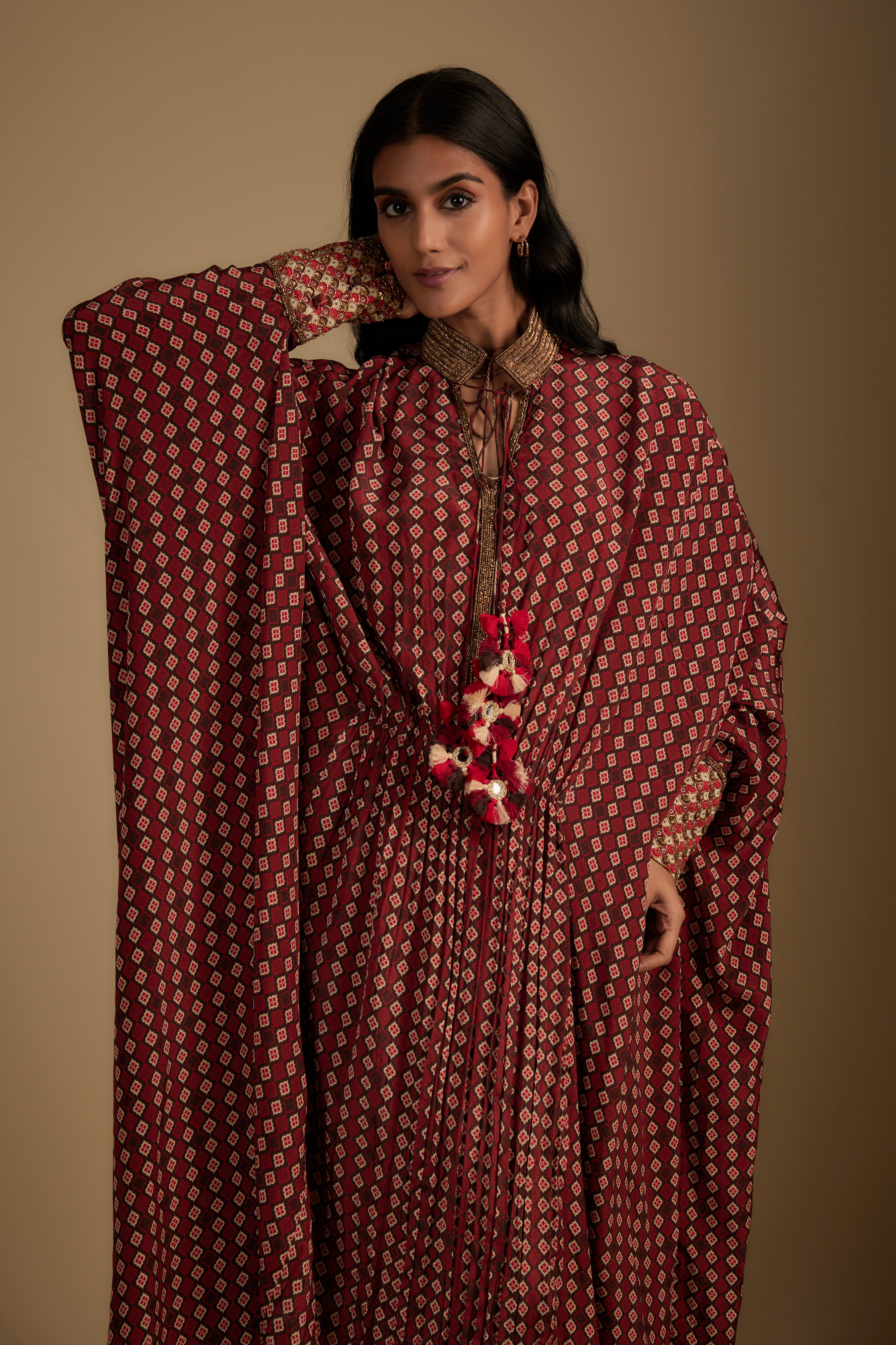 يتميز بكفتان بني مطبوع ومطرز مع تفاصيل من الخيوط.