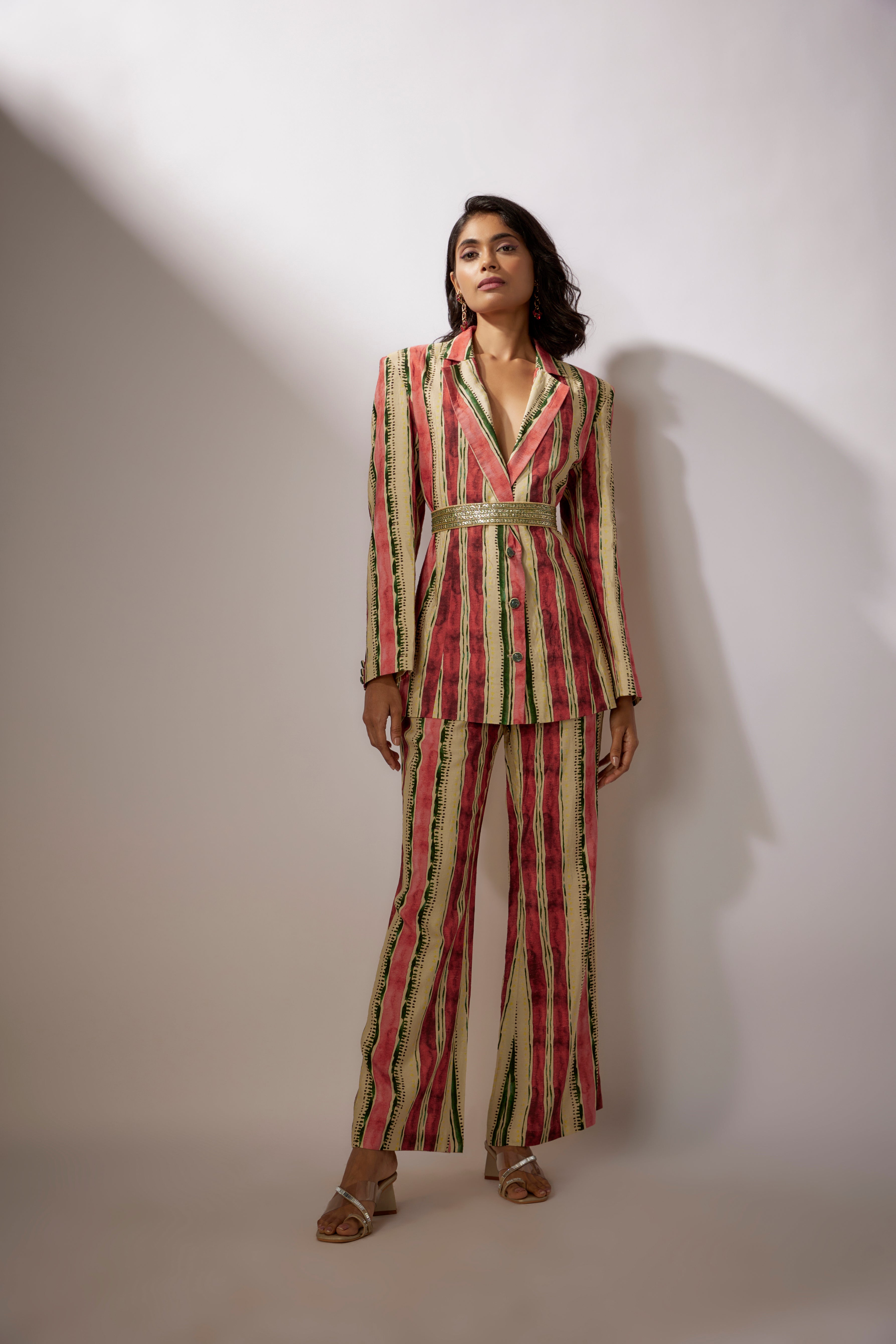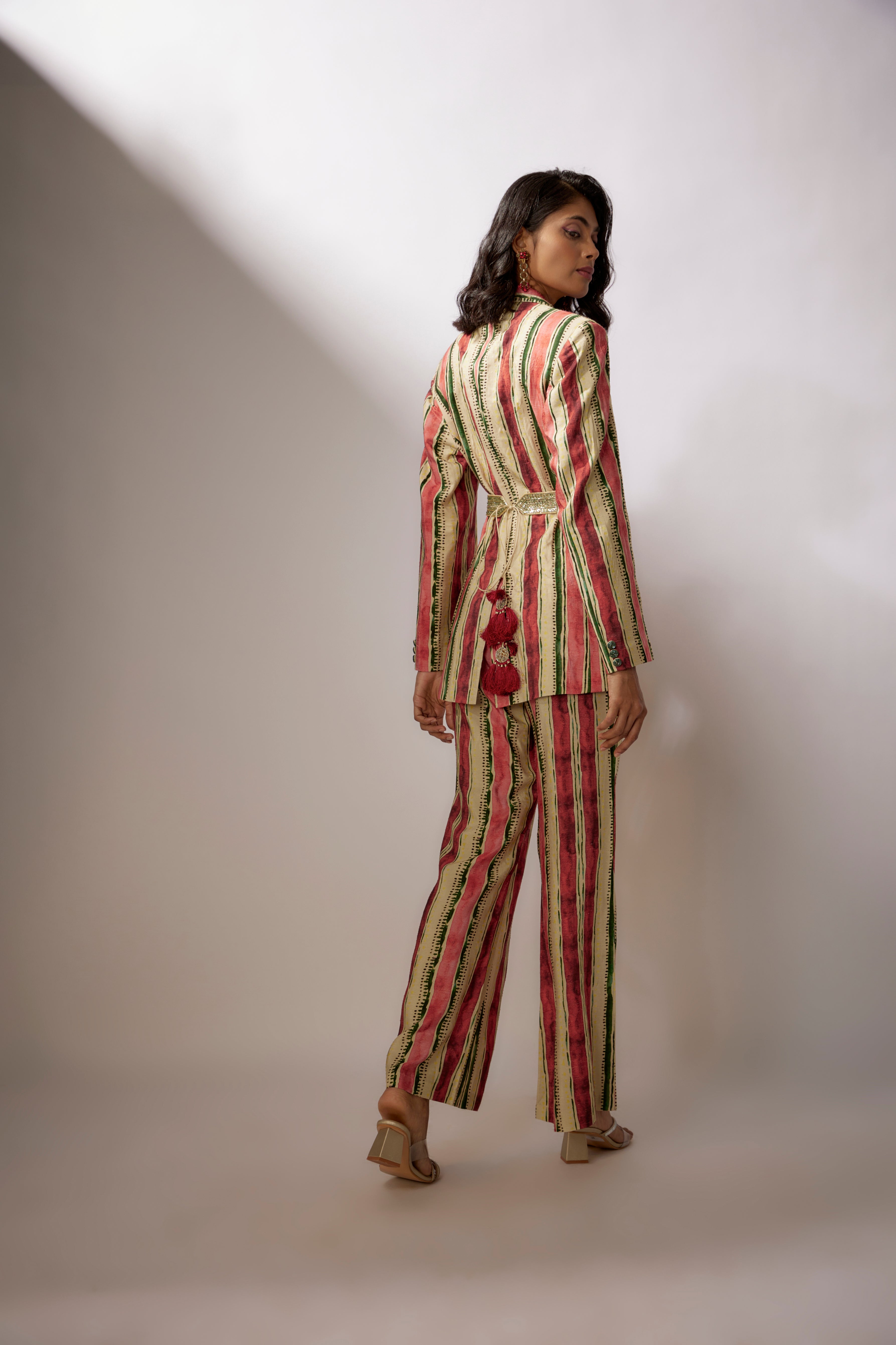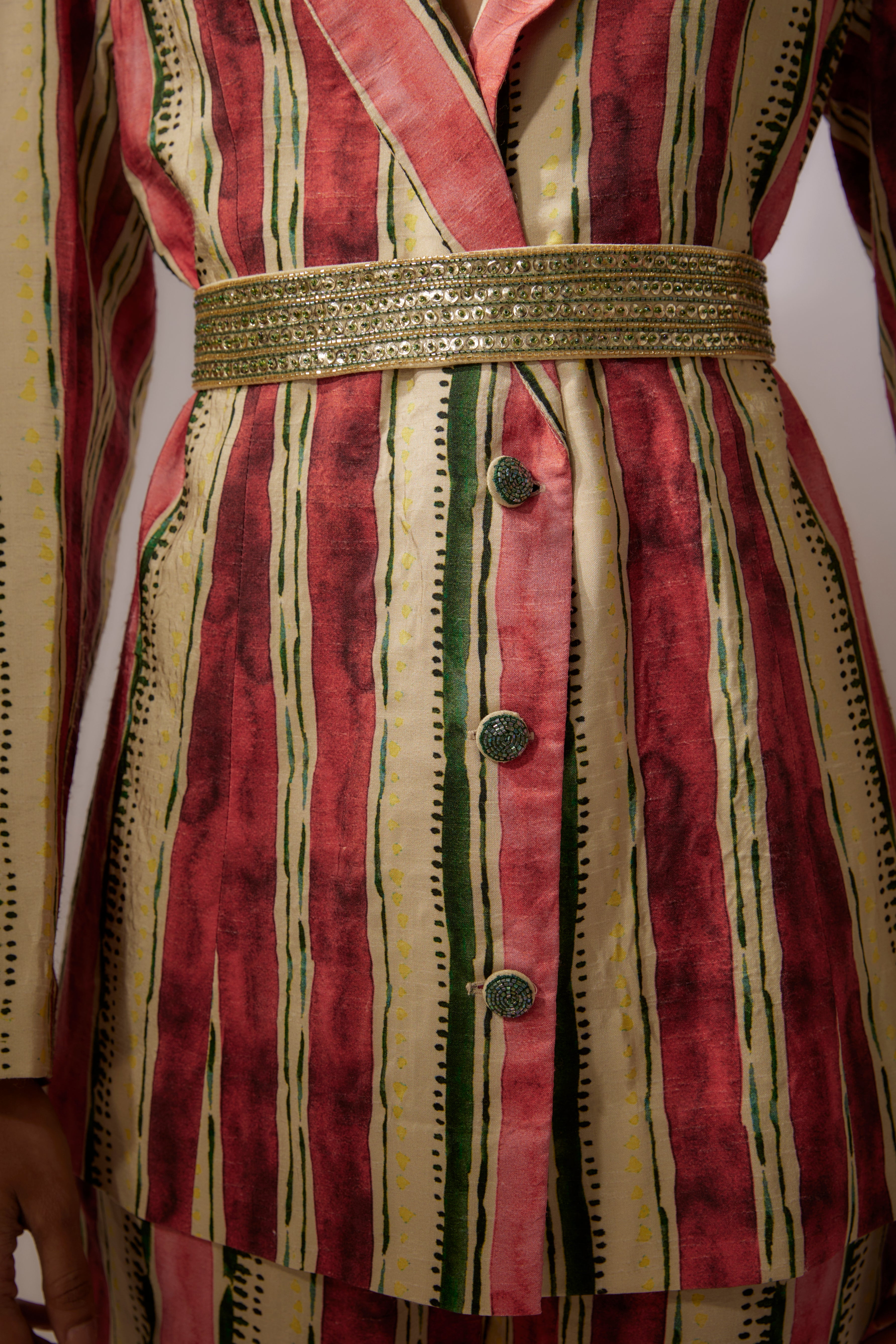 يتميز طقم بليزر بيج مطبوع مع خطوط حمراء وخضراء مطبوعة في حرير دوبون مع ترتر على الأزرار. يأتي مع بنطلون مطابق من قماش حرير دوبون وحزام مطرز بالترتر من قماش الحرير الخام مع أربطة شرابة.