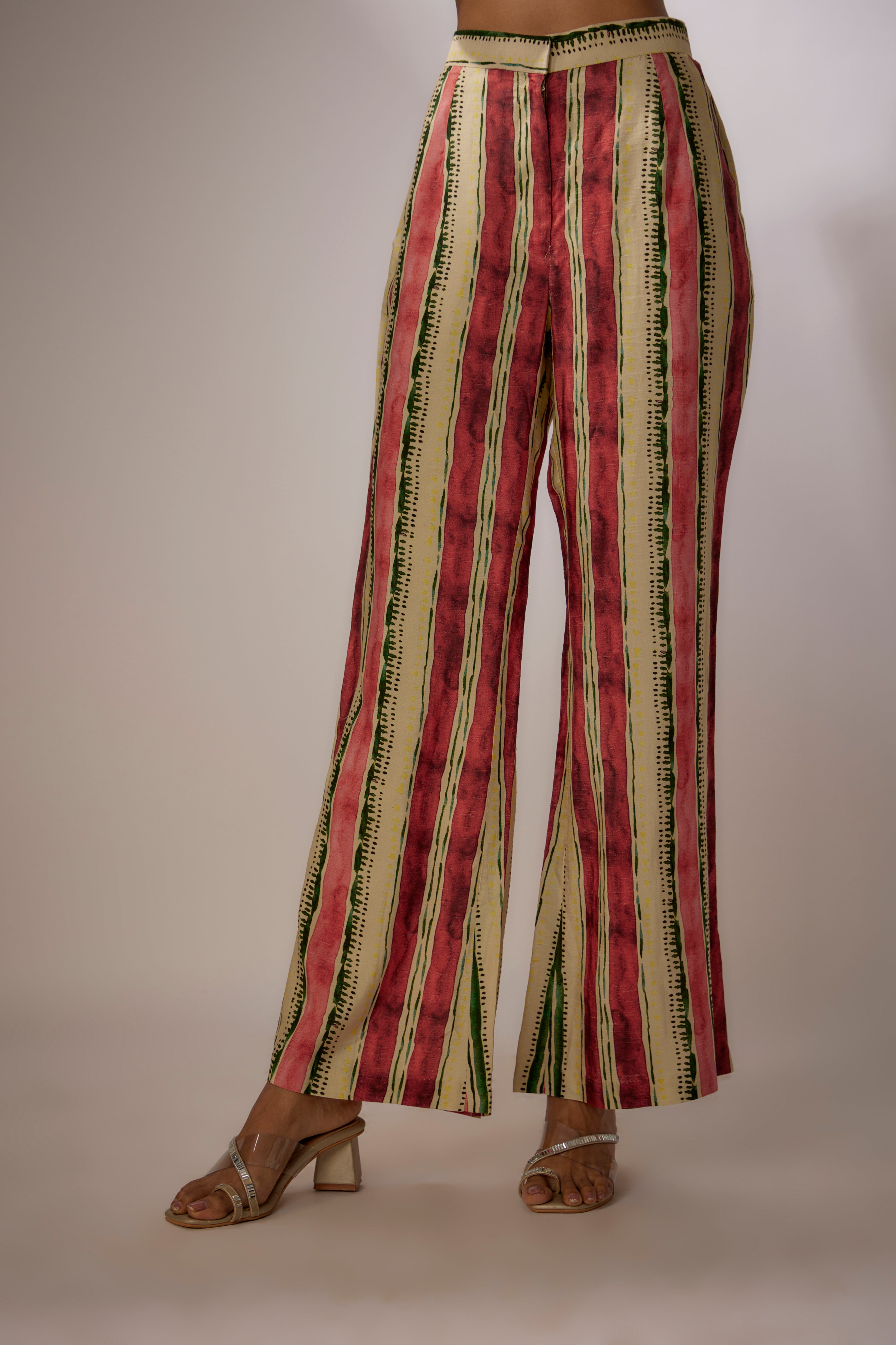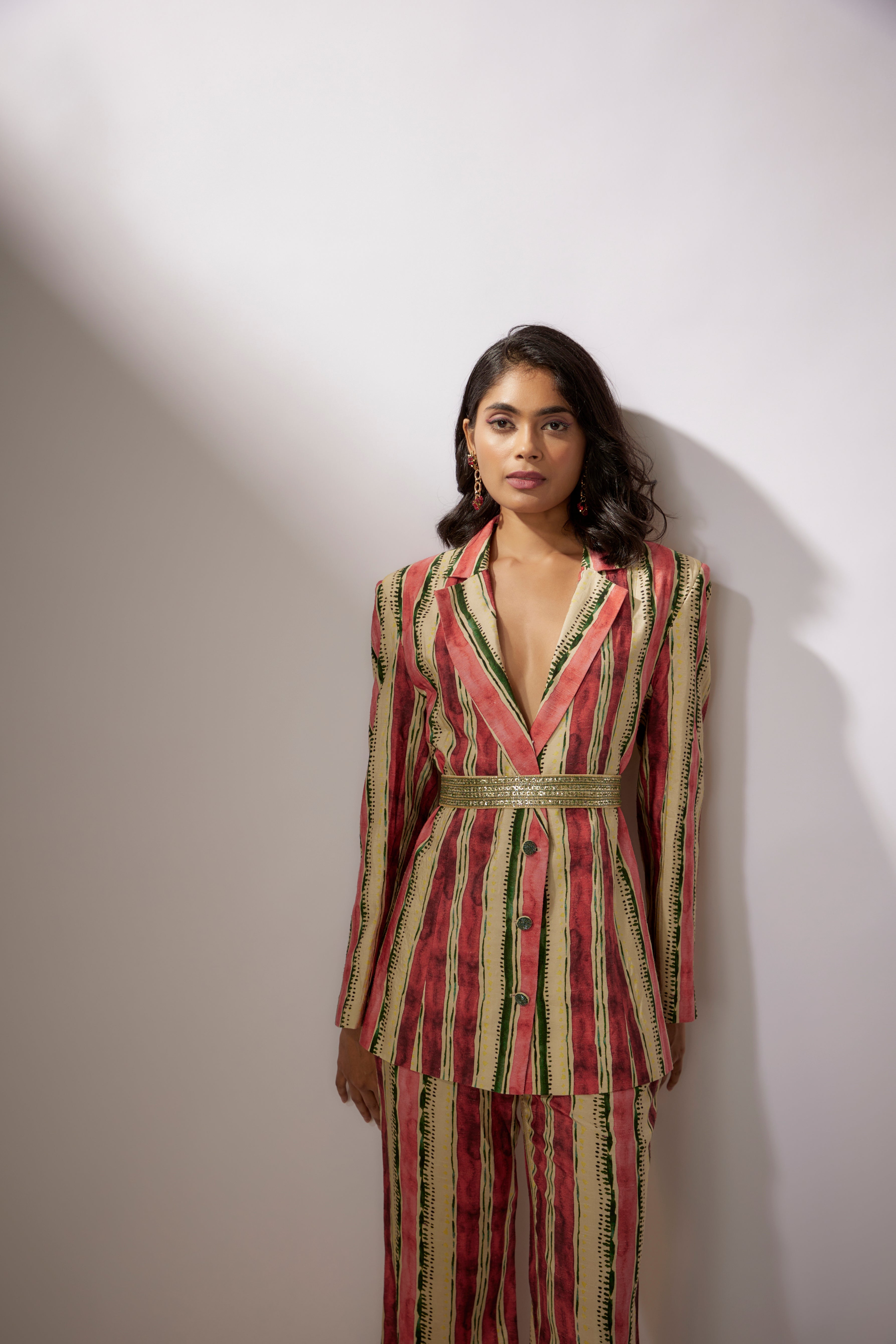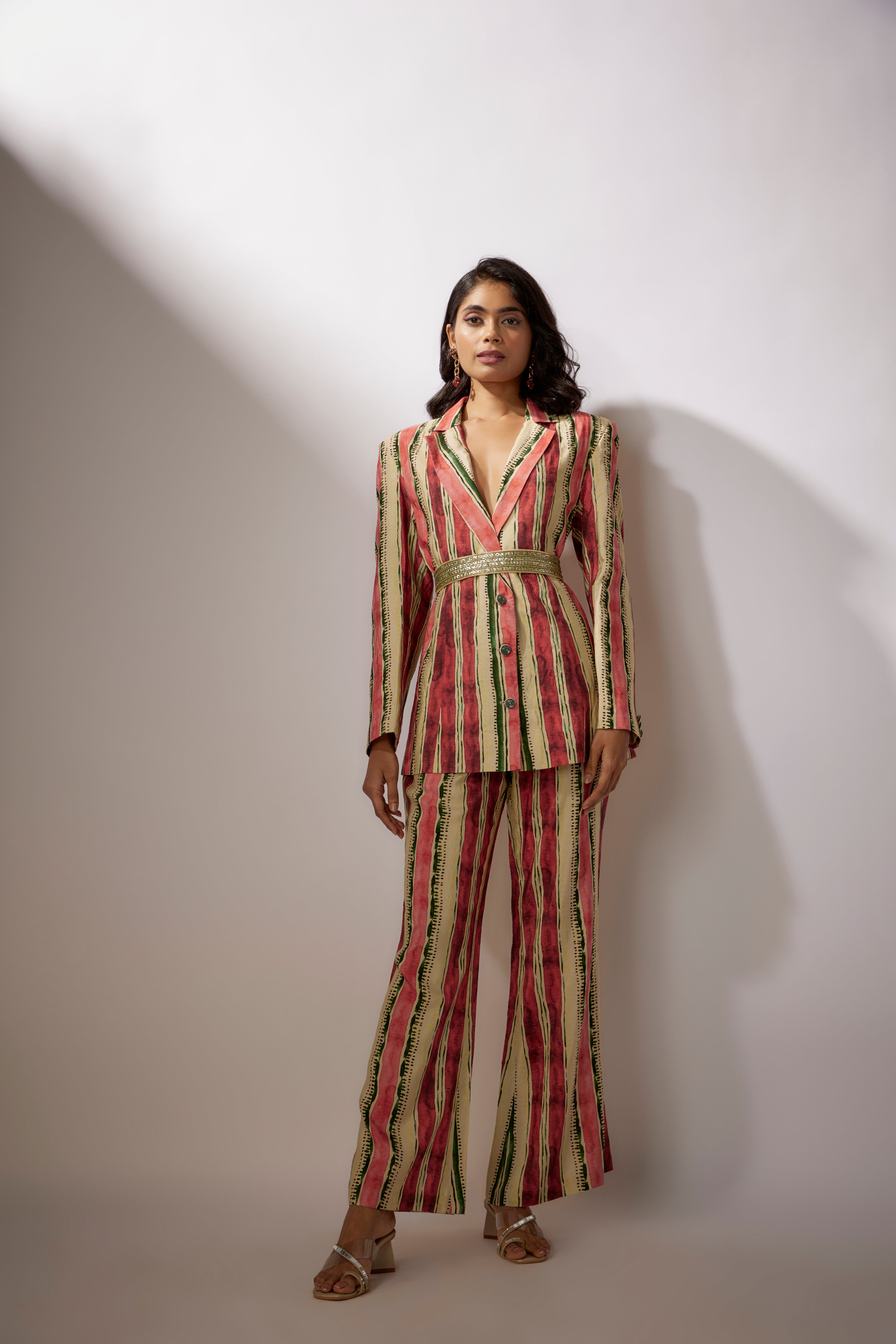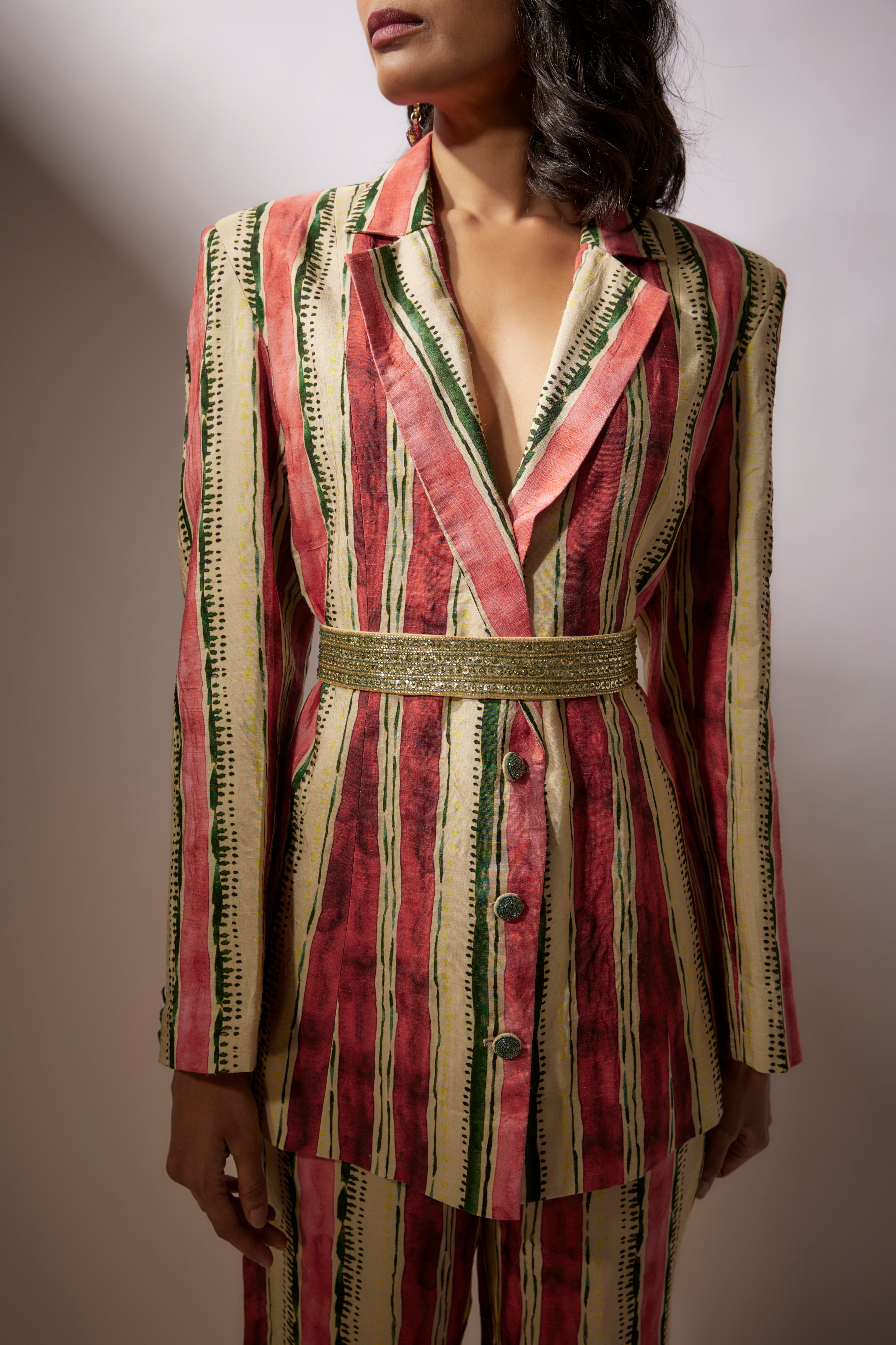 يتميز طقم بليزر بيج مطبوع مع خطوط حمراء وخضراء مطبوعة في حرير دوبون مع ترتر على الأزرار. يأتي مع بنطلون مطابق من قماش حرير دوبون وحزام مطرز بالترتر من قماش الحرير الخام مع أربطة شرابة.