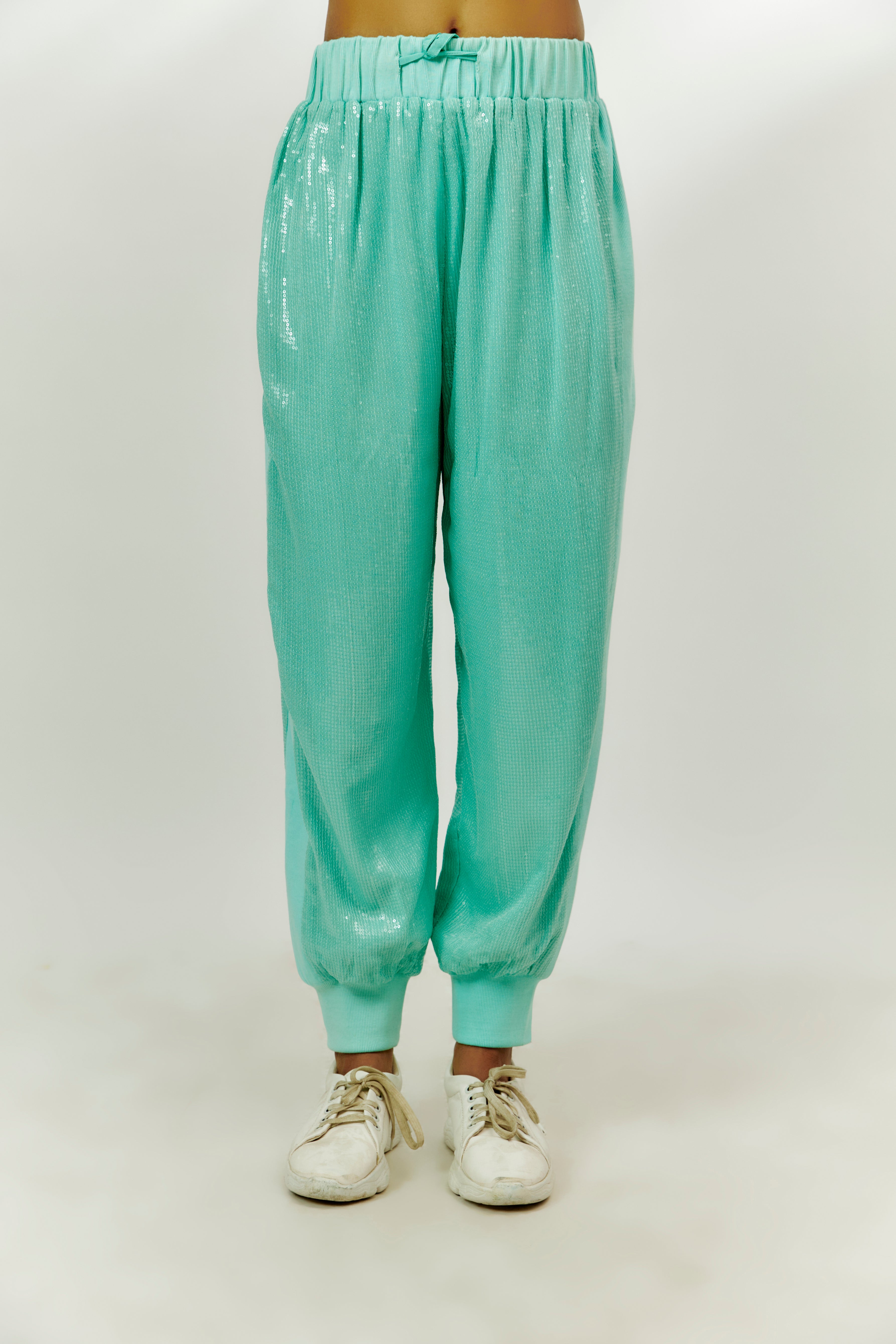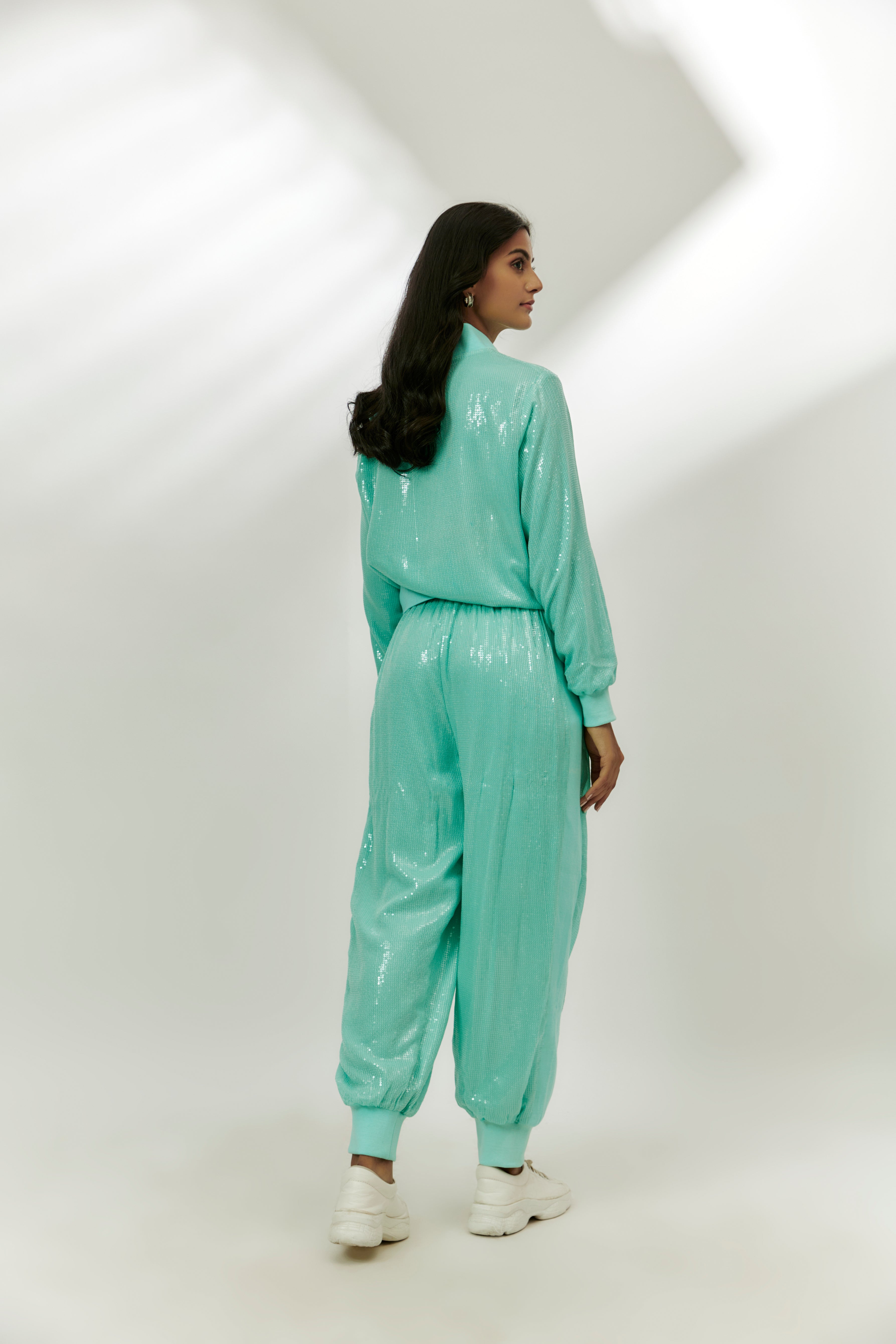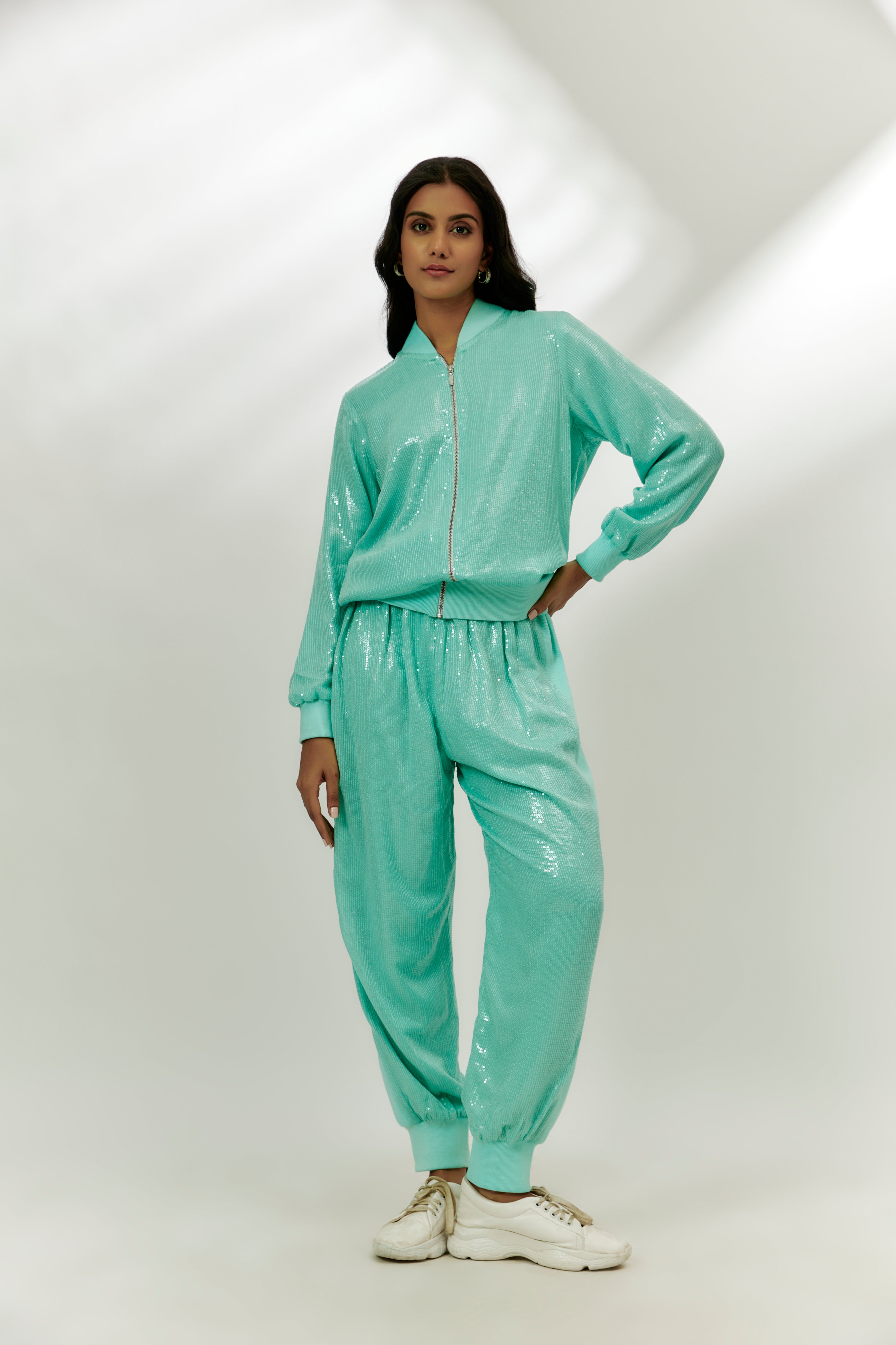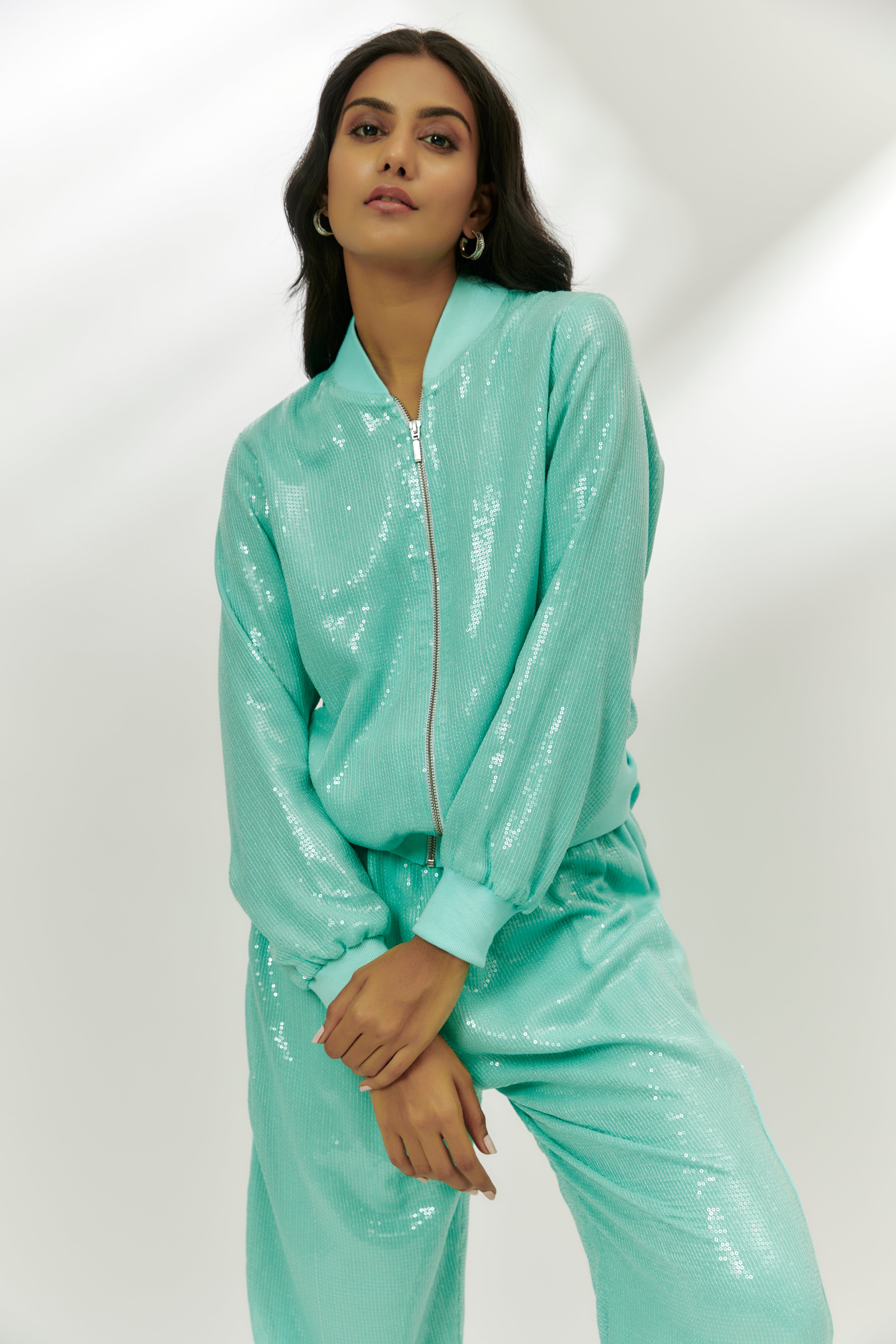 تتميز بسترة بومبر زرقاء سماوية من قماش الجورجيت مع تطريز من الترتر. يتم تنسيقها مع بنطلون رياضي مزود بتفاصيل إغلاق بحبل. أبرزيها مع مجوهرات بارزة وكعب عالٍ للحصول على مظهر كامل.