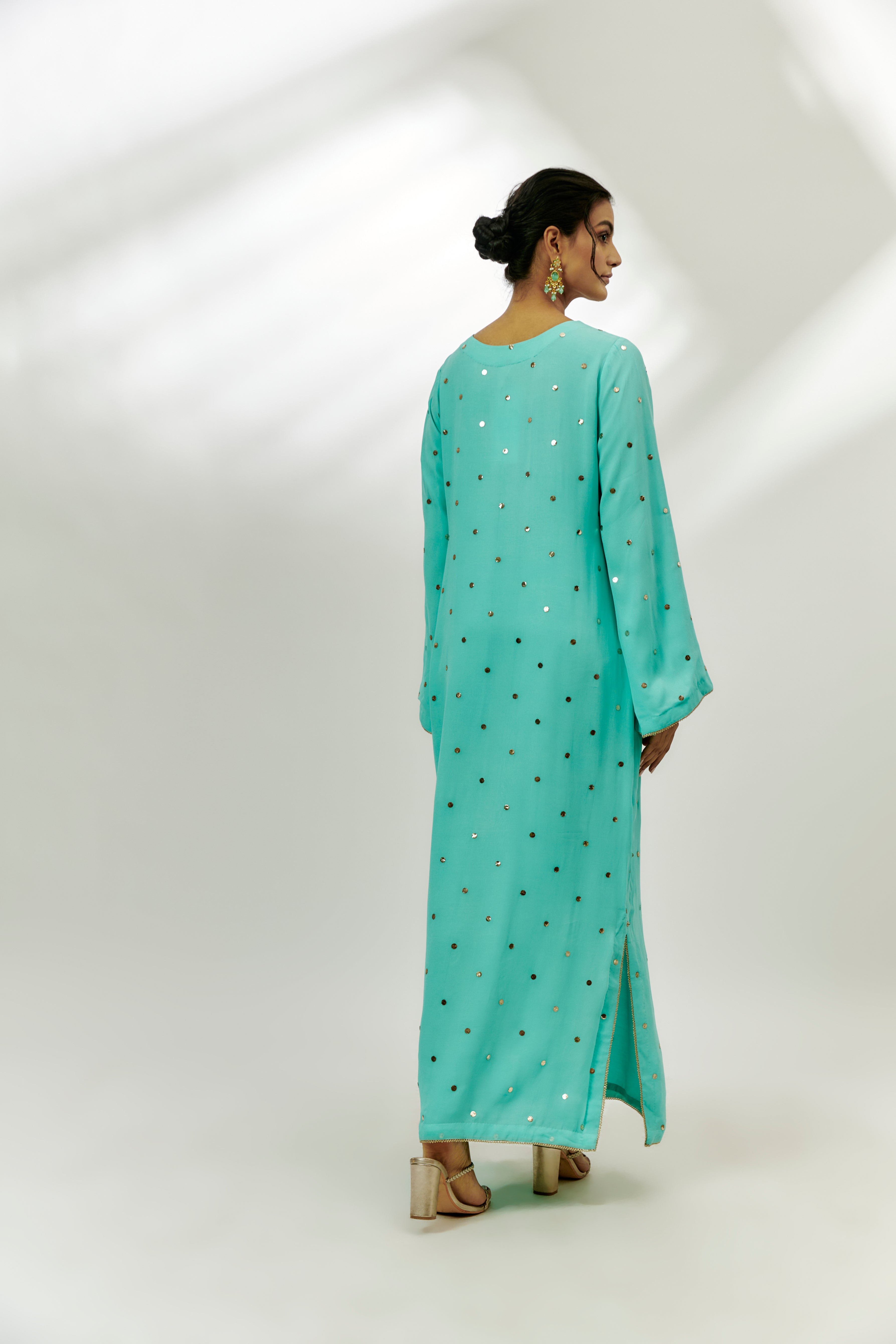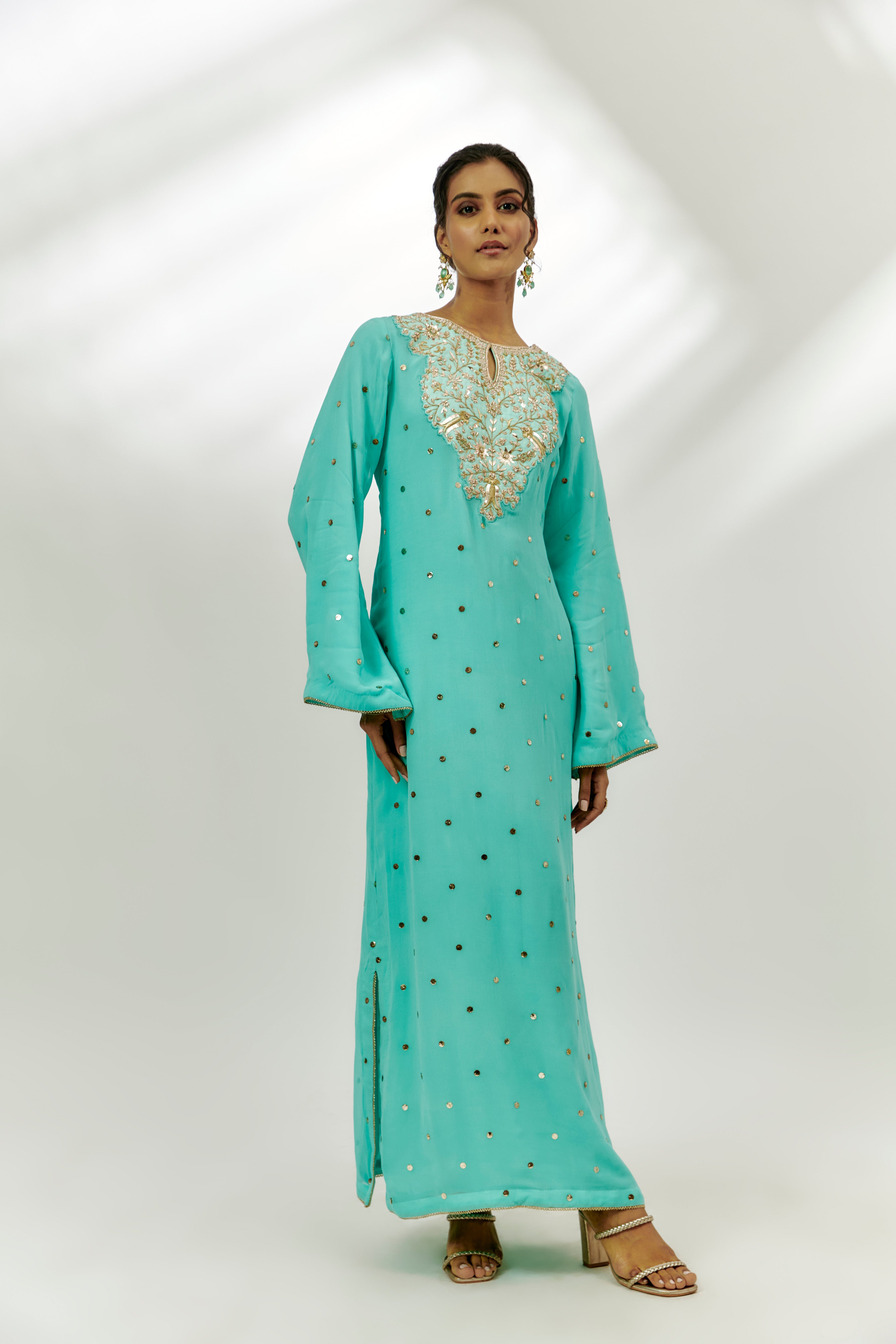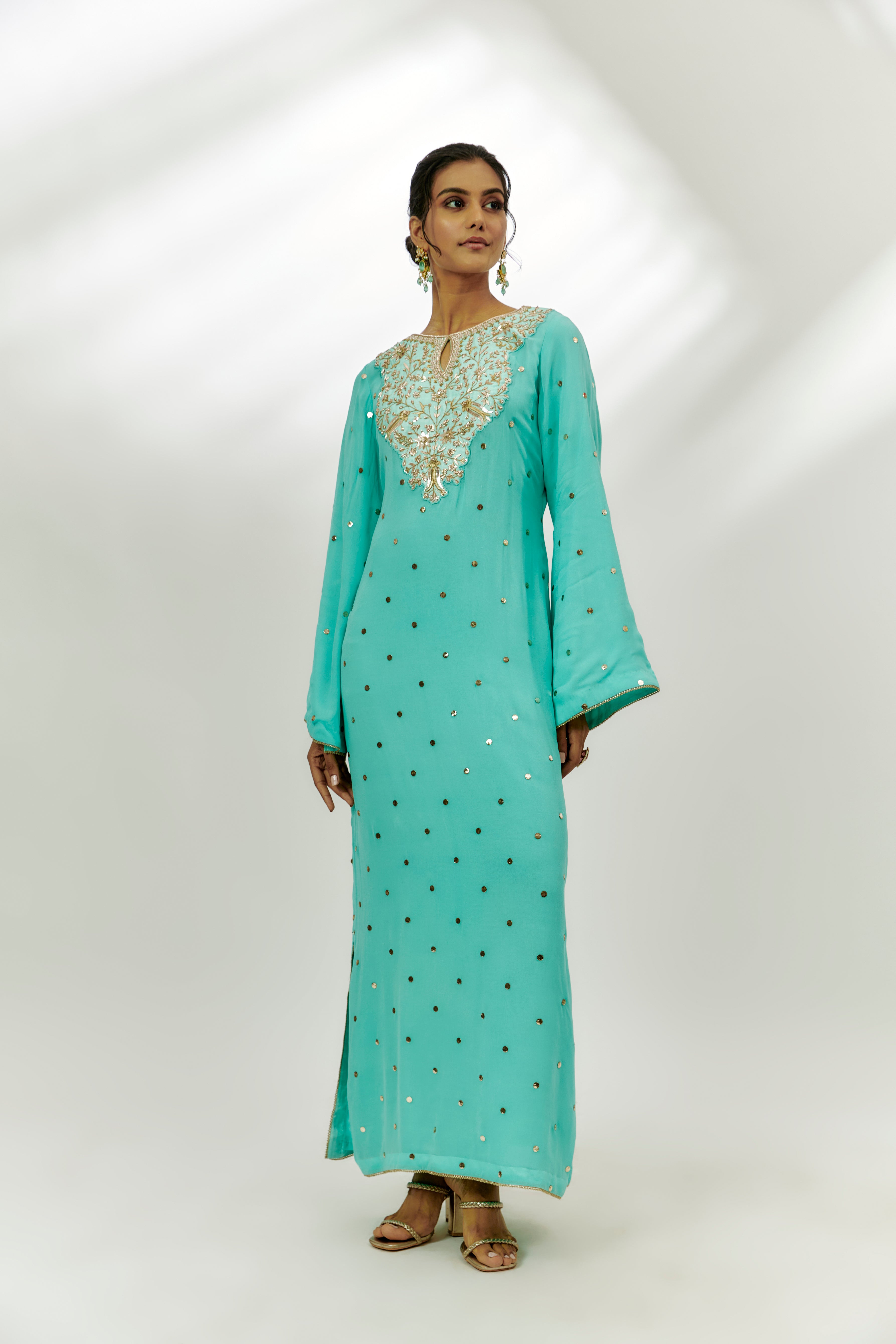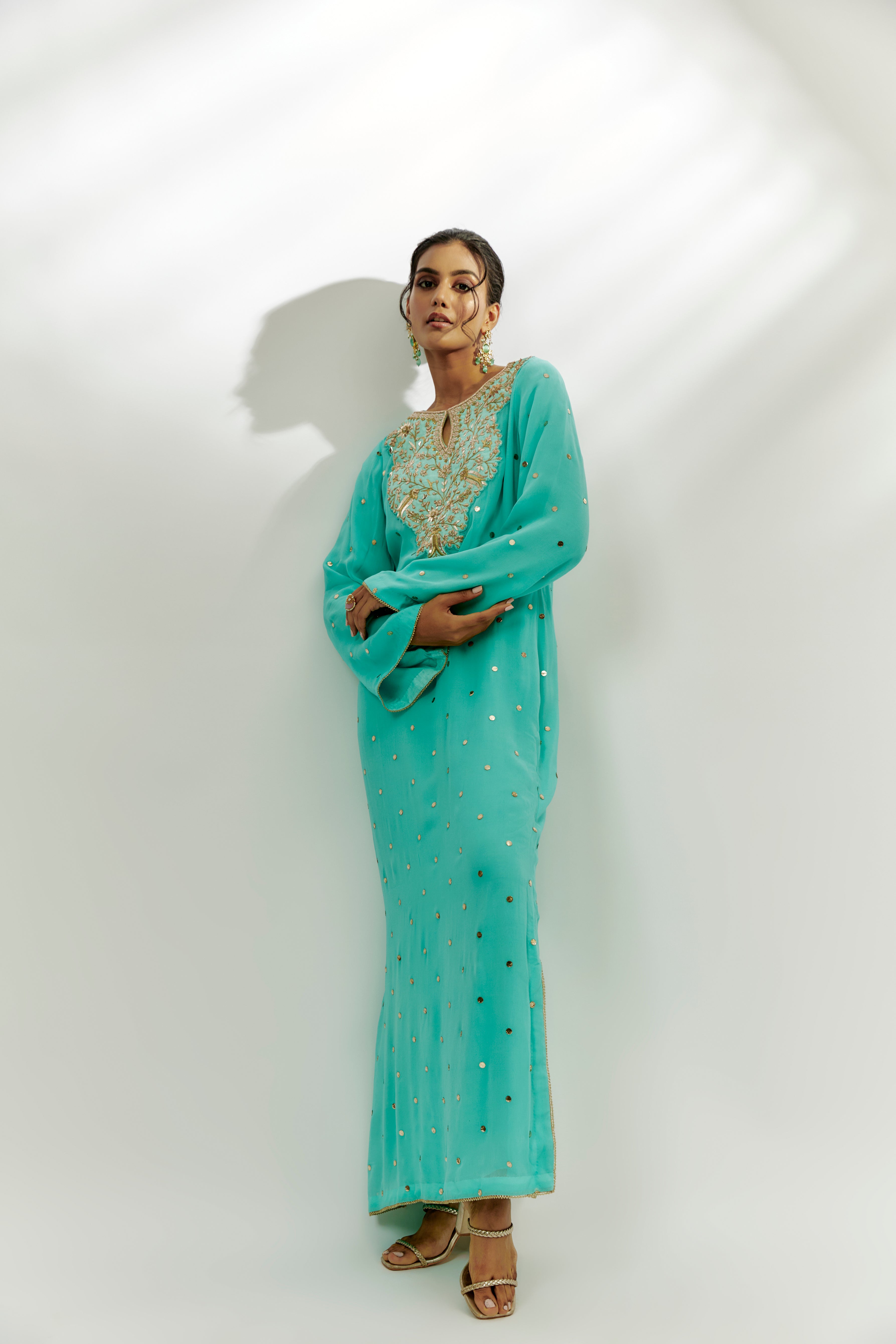يتميز بكفتان أزرق سماوي بقاعدة جورجيت مع تطريز زاردوسي ومارودي. أبرزه بمجوهرات بارزة وكعب عالٍ لمناسبة احتفالية.