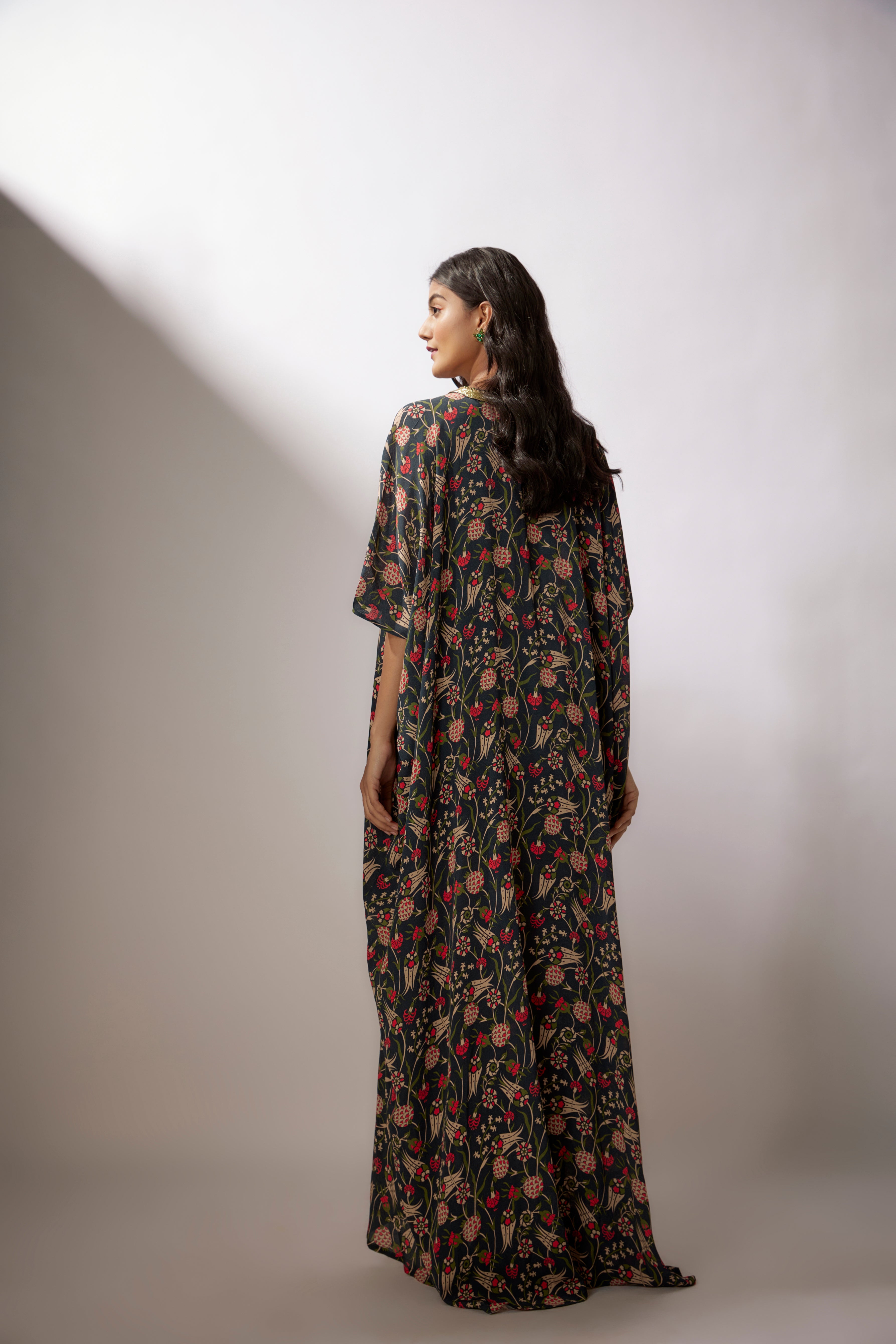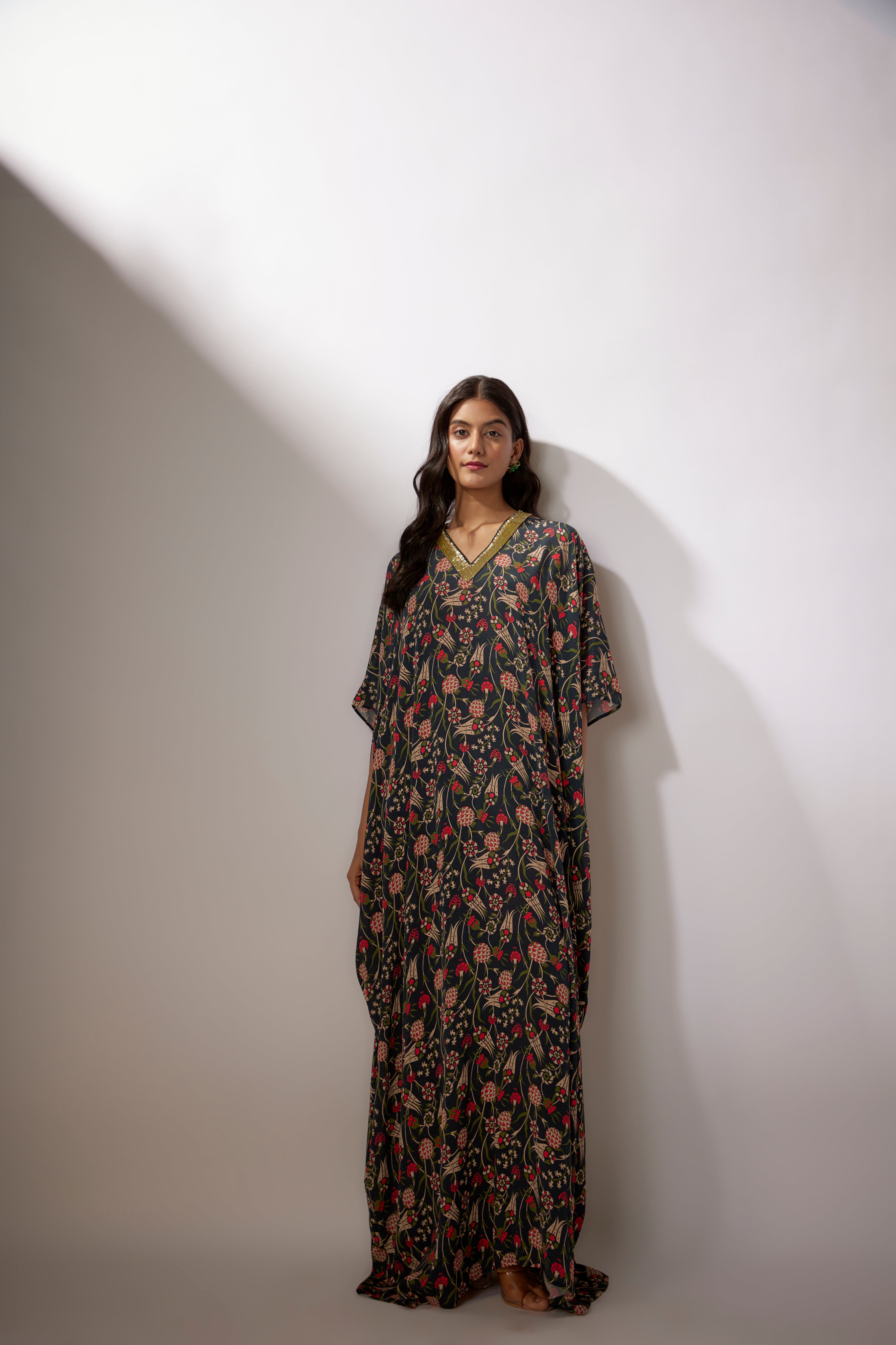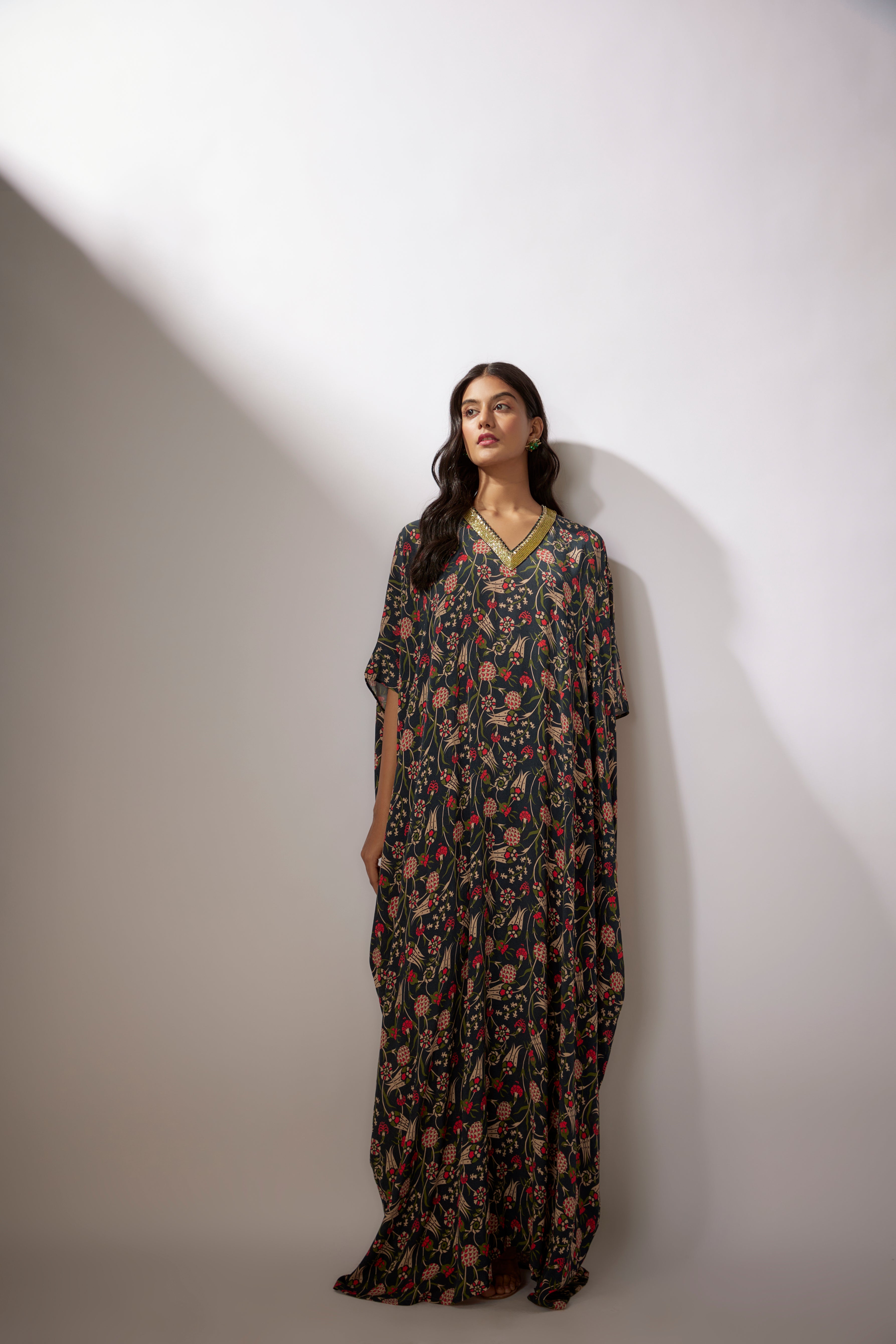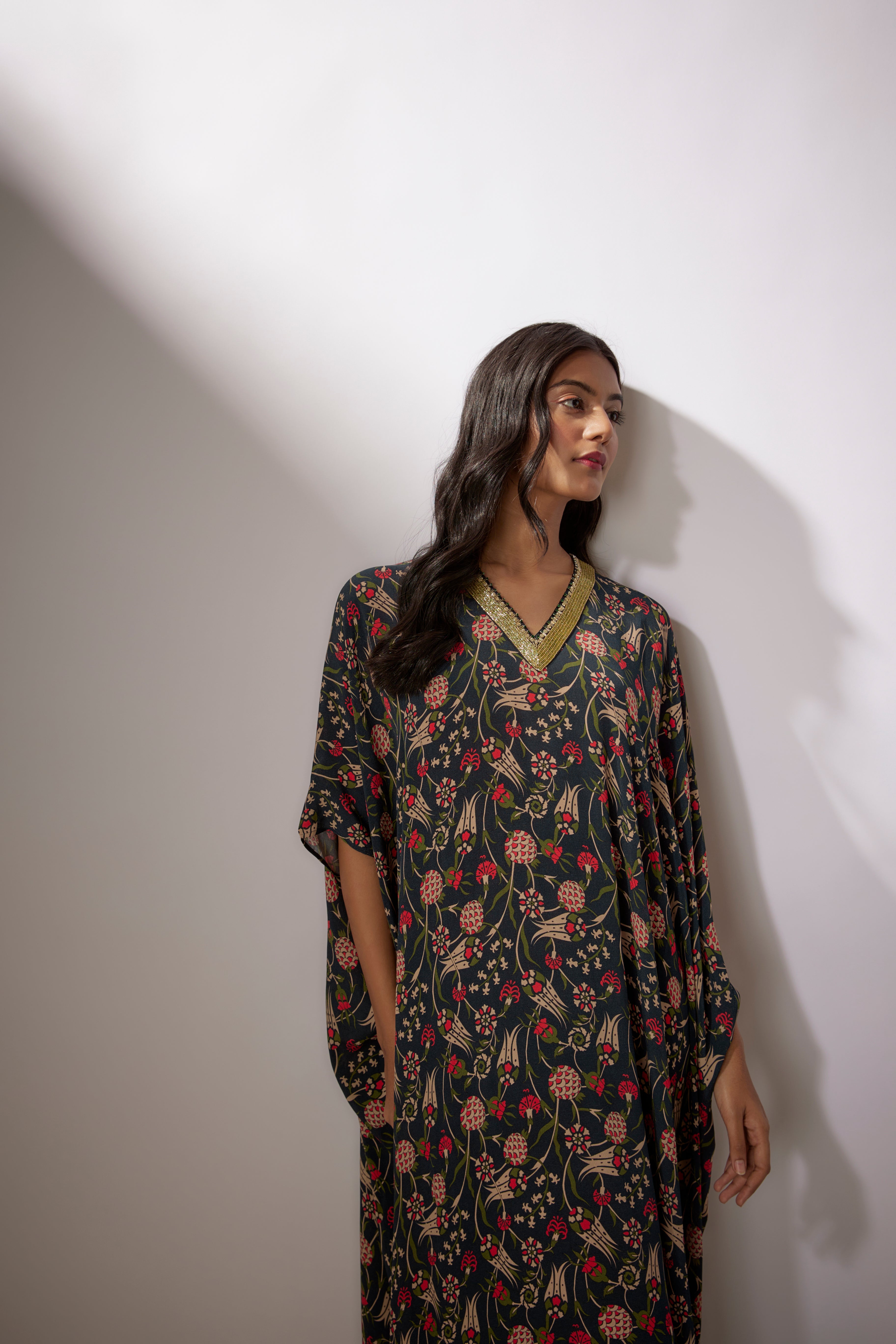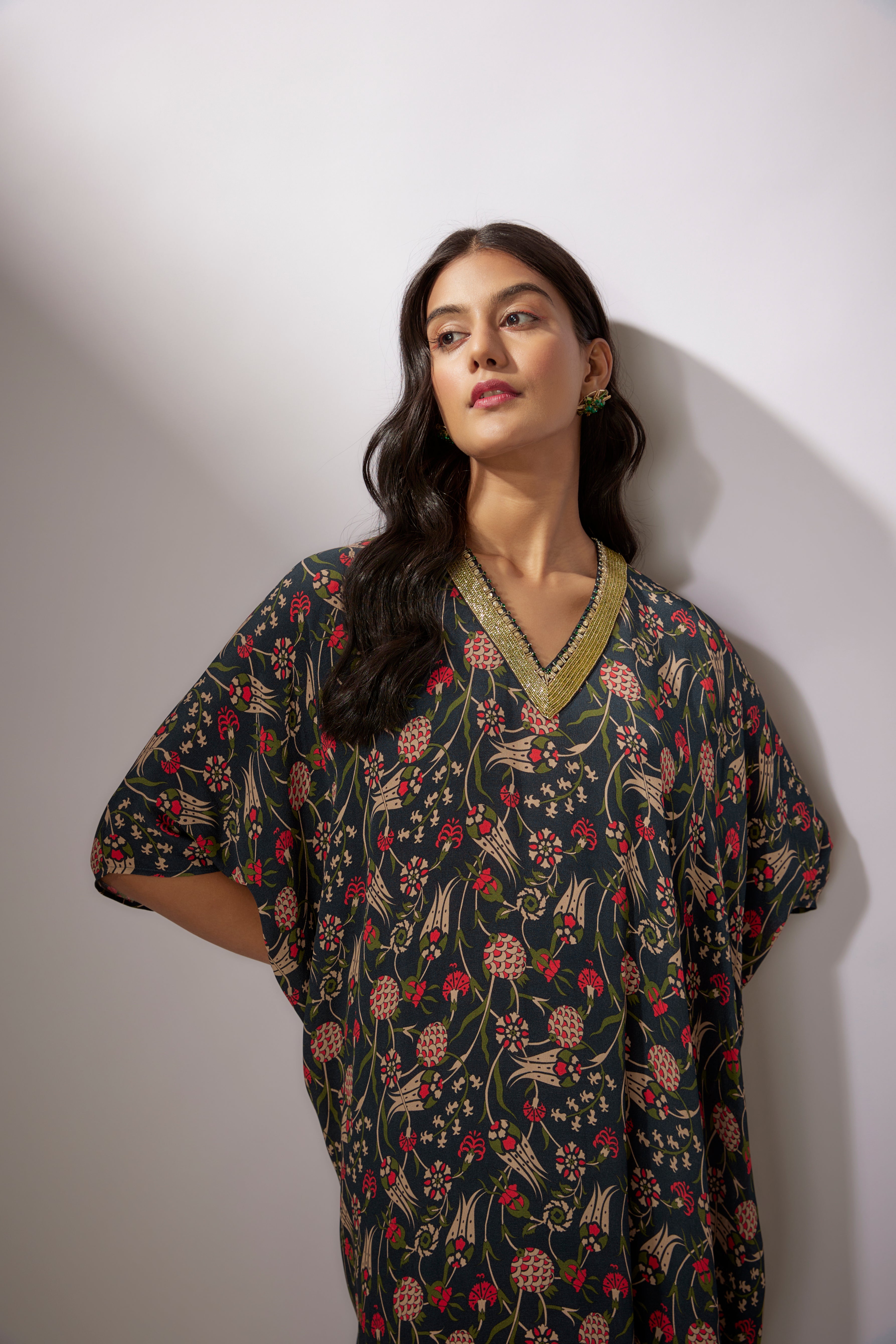 يتميز بقفطان أزرق كحلي مطبوع من قماش الكريب مع تطريز بالترتر على خط العنق.