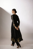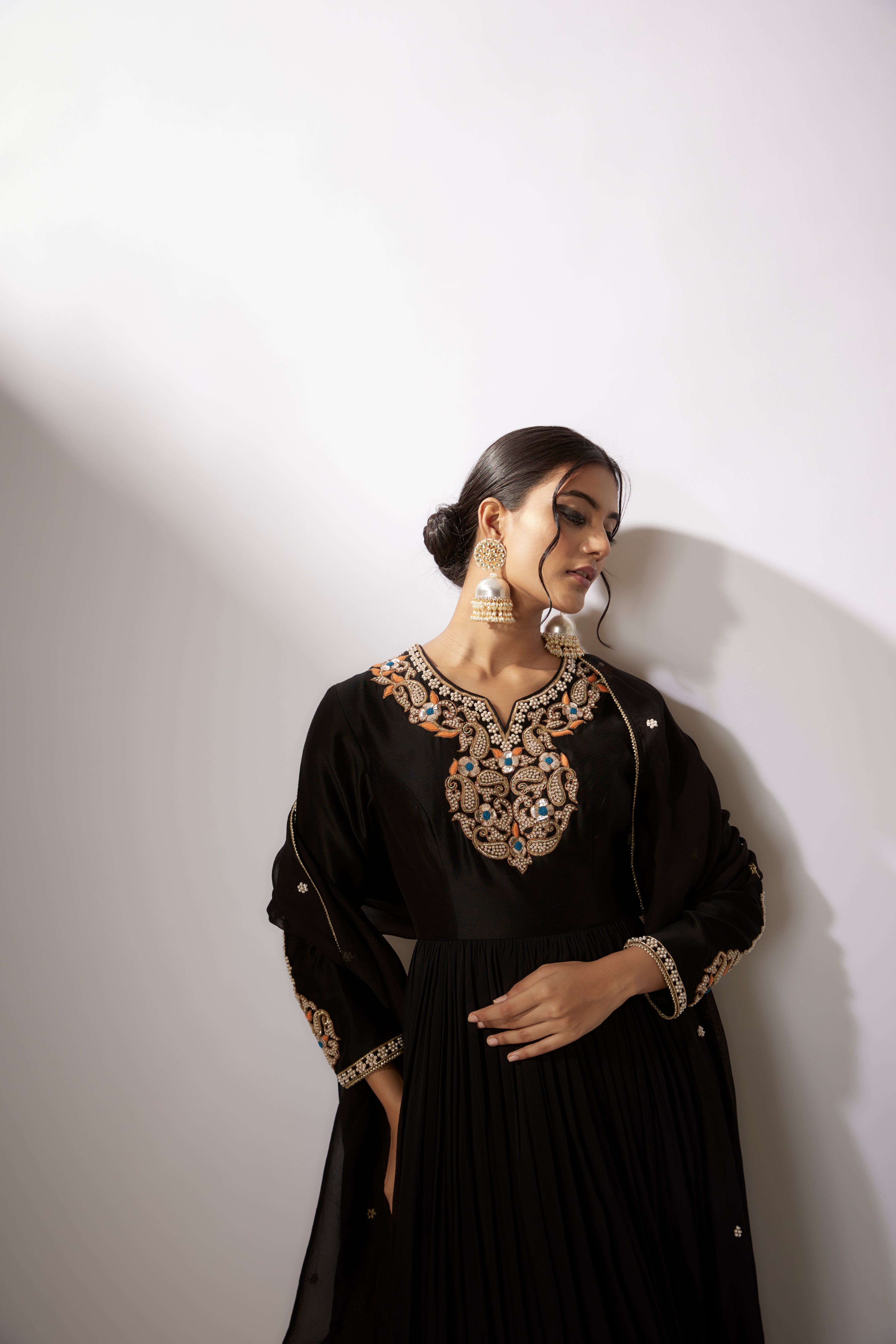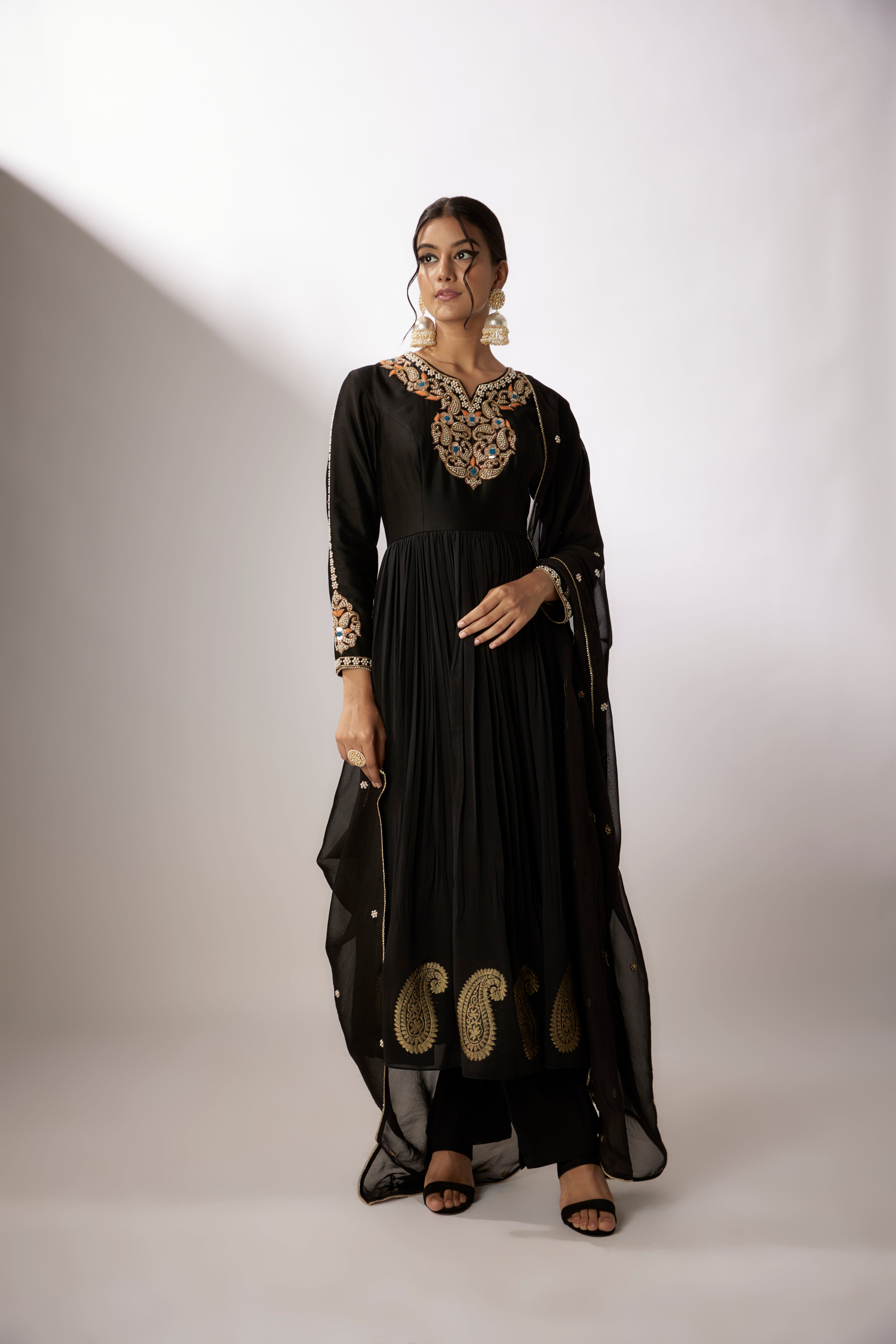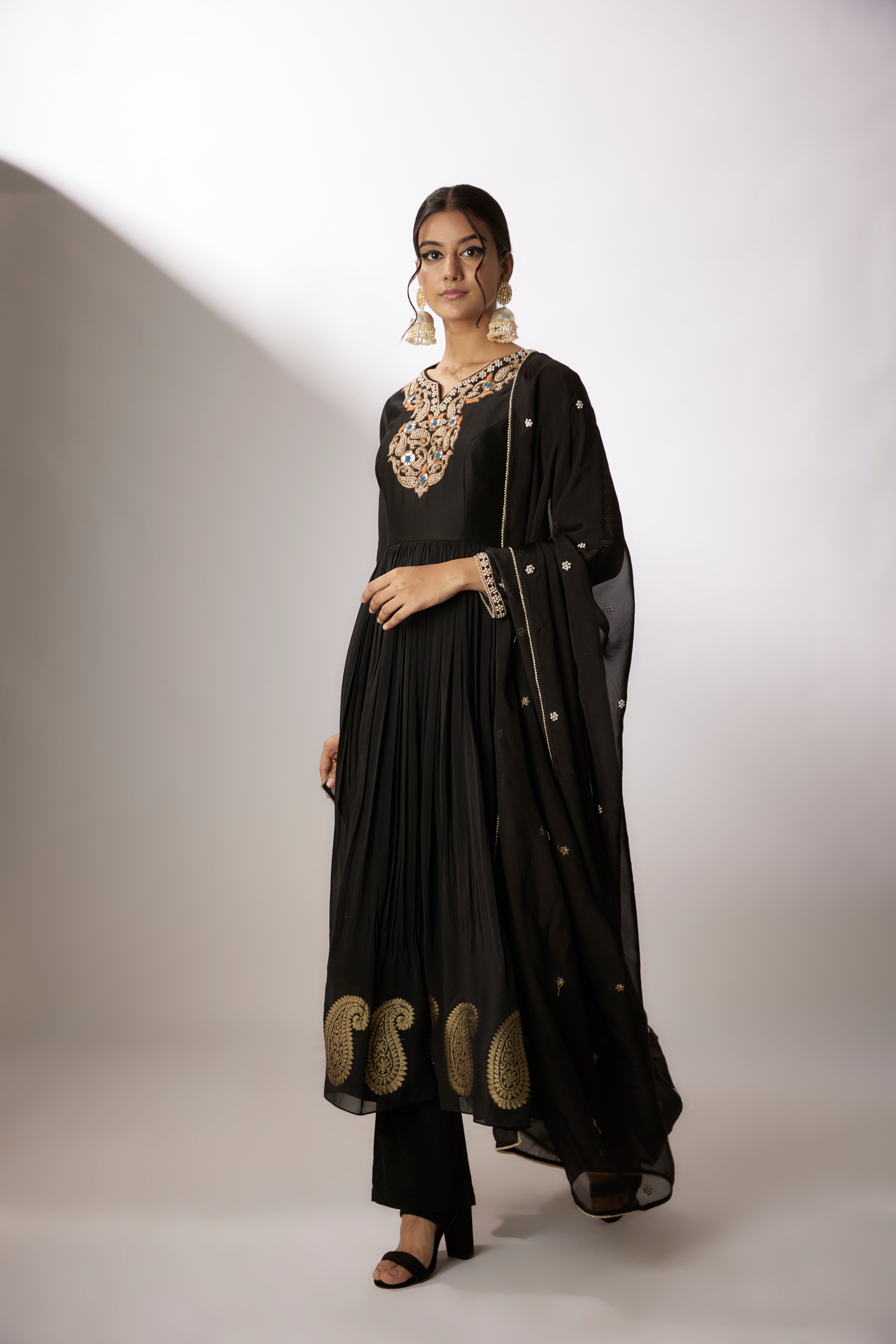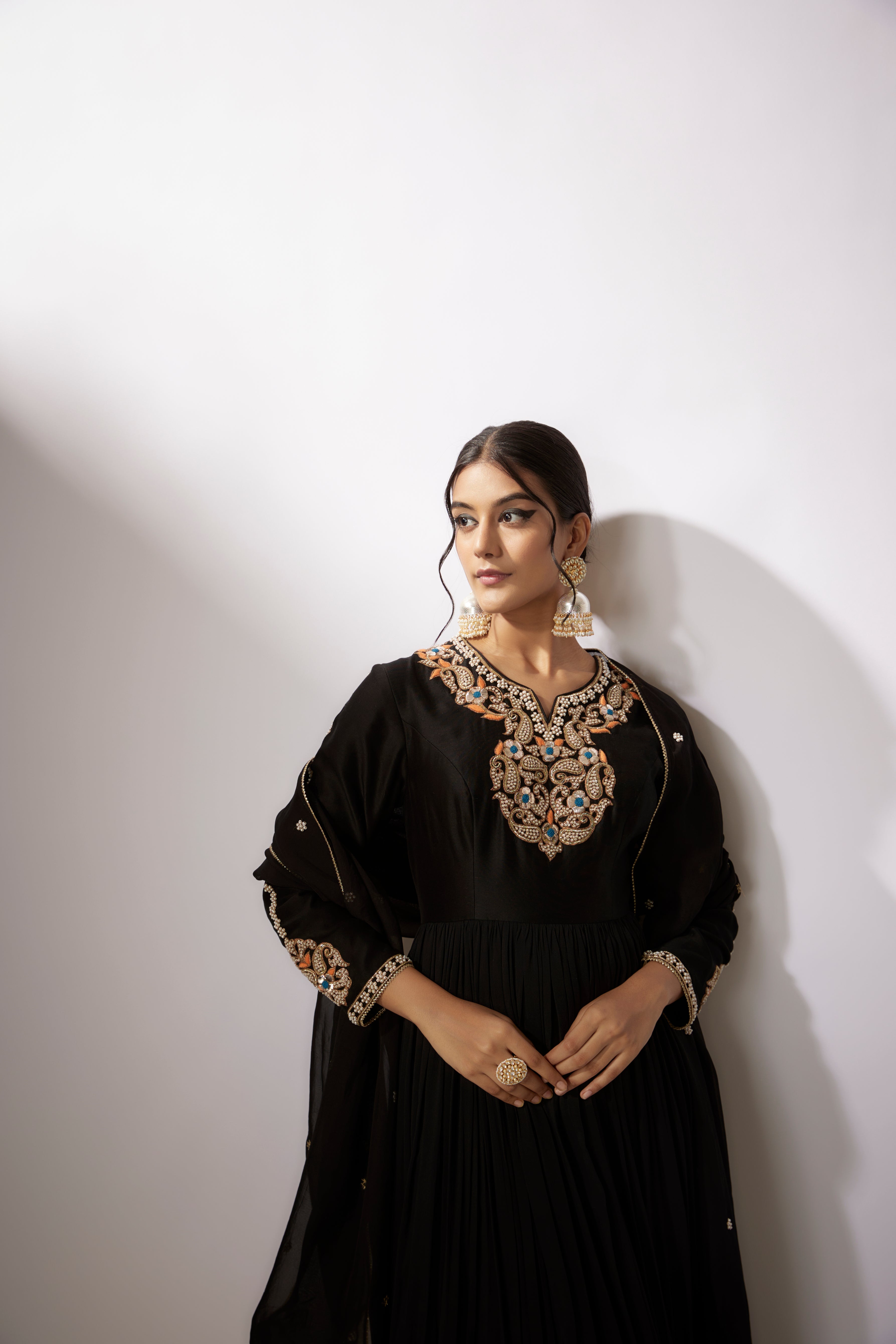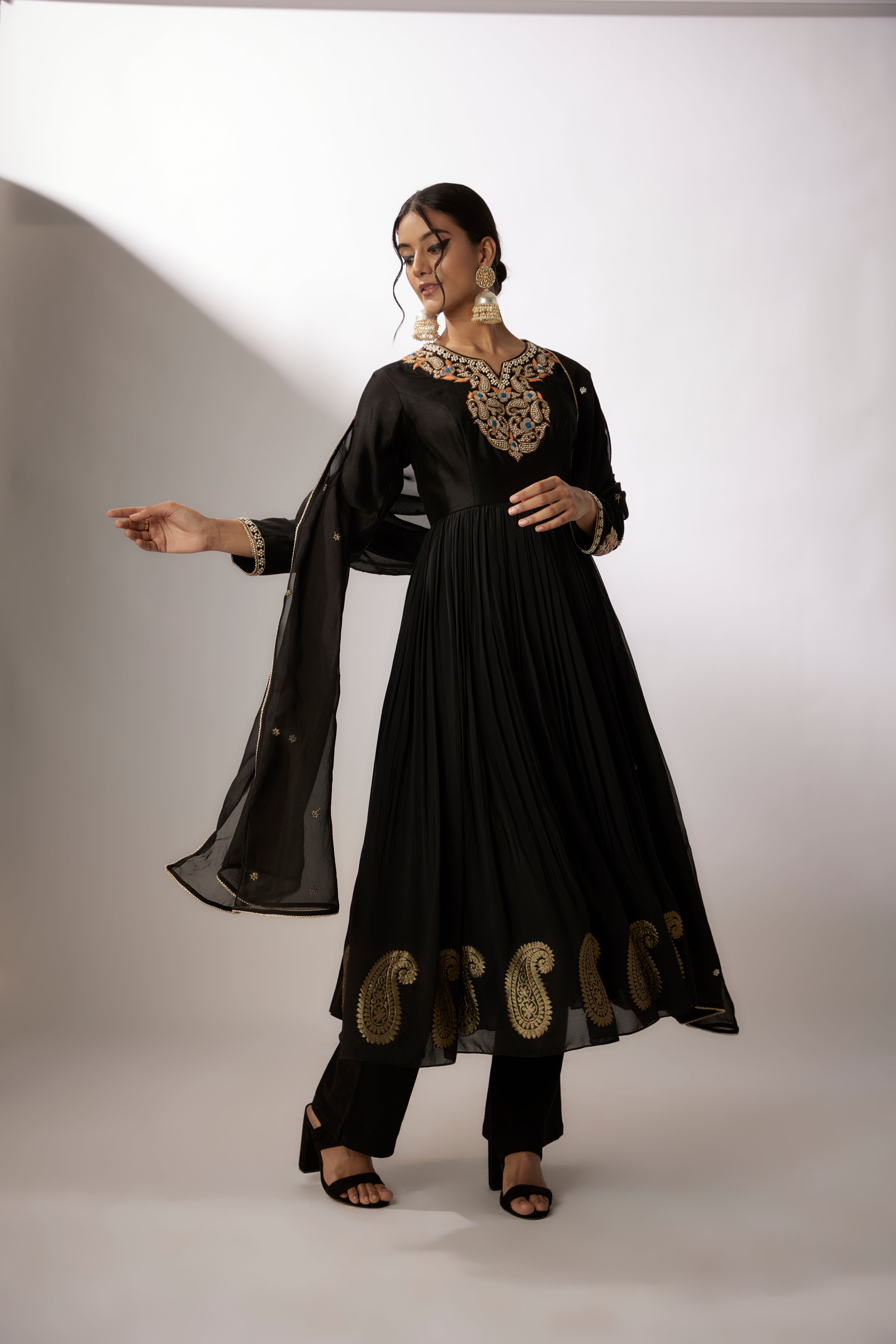 تتميز بأناركالي مطرزة باللون الأسود من قماش تشانديري مع تطريز زاردوسي ولؤلؤ ونسيج جورجيت بنقشة بيزلي. تأتي مع دوباتا أورجانزا مطابقة مع عمل زاردوسي.