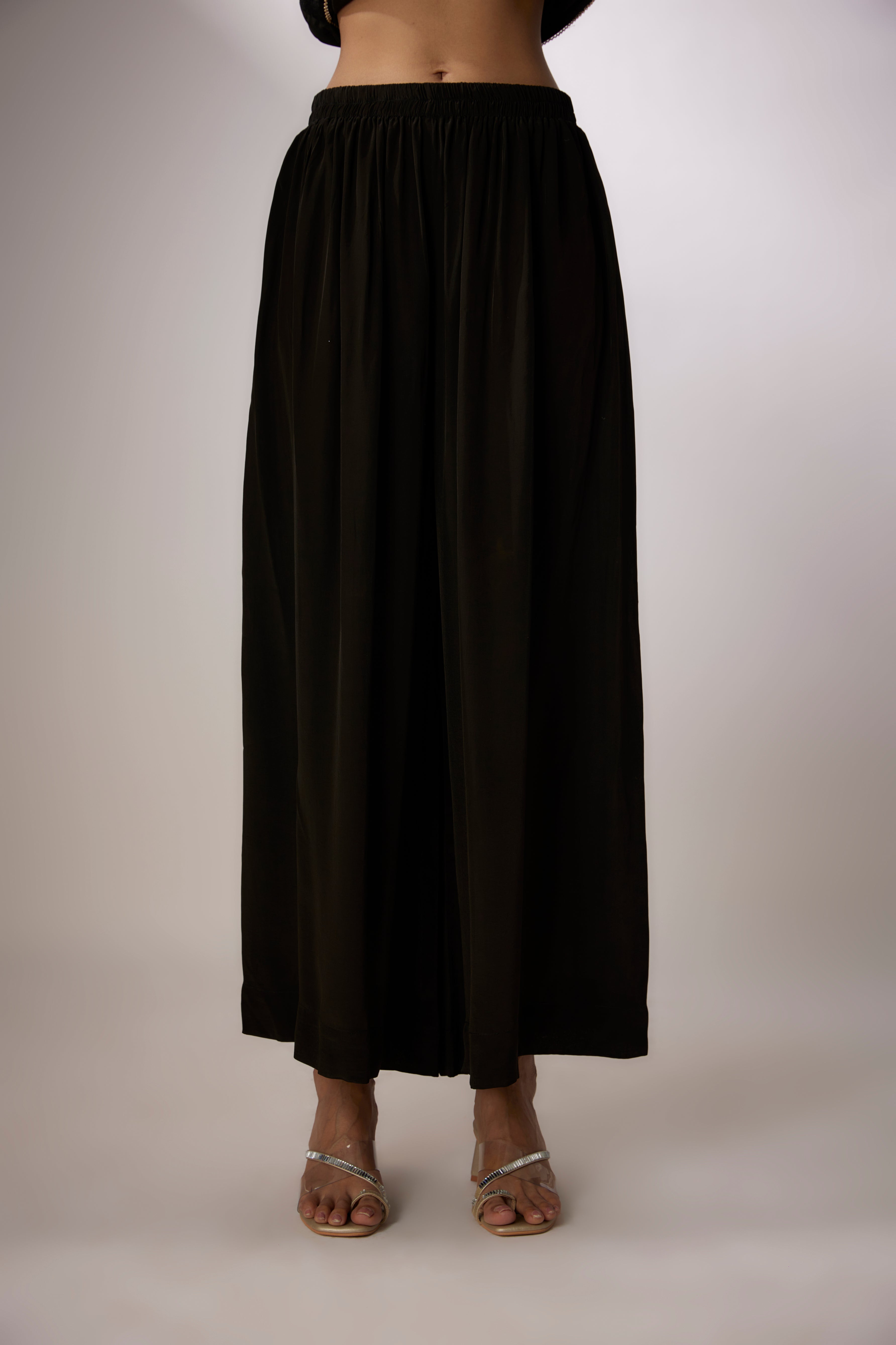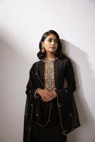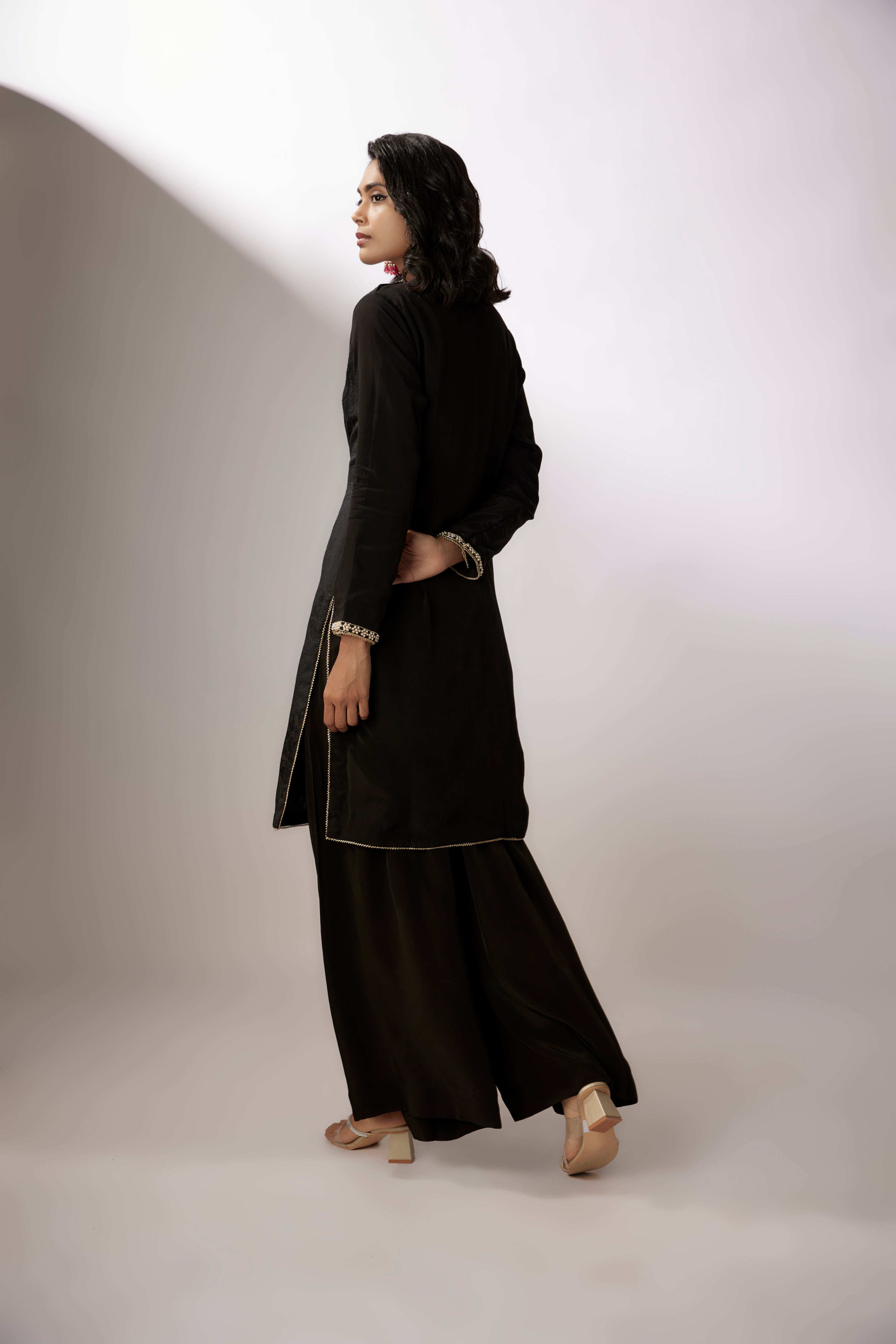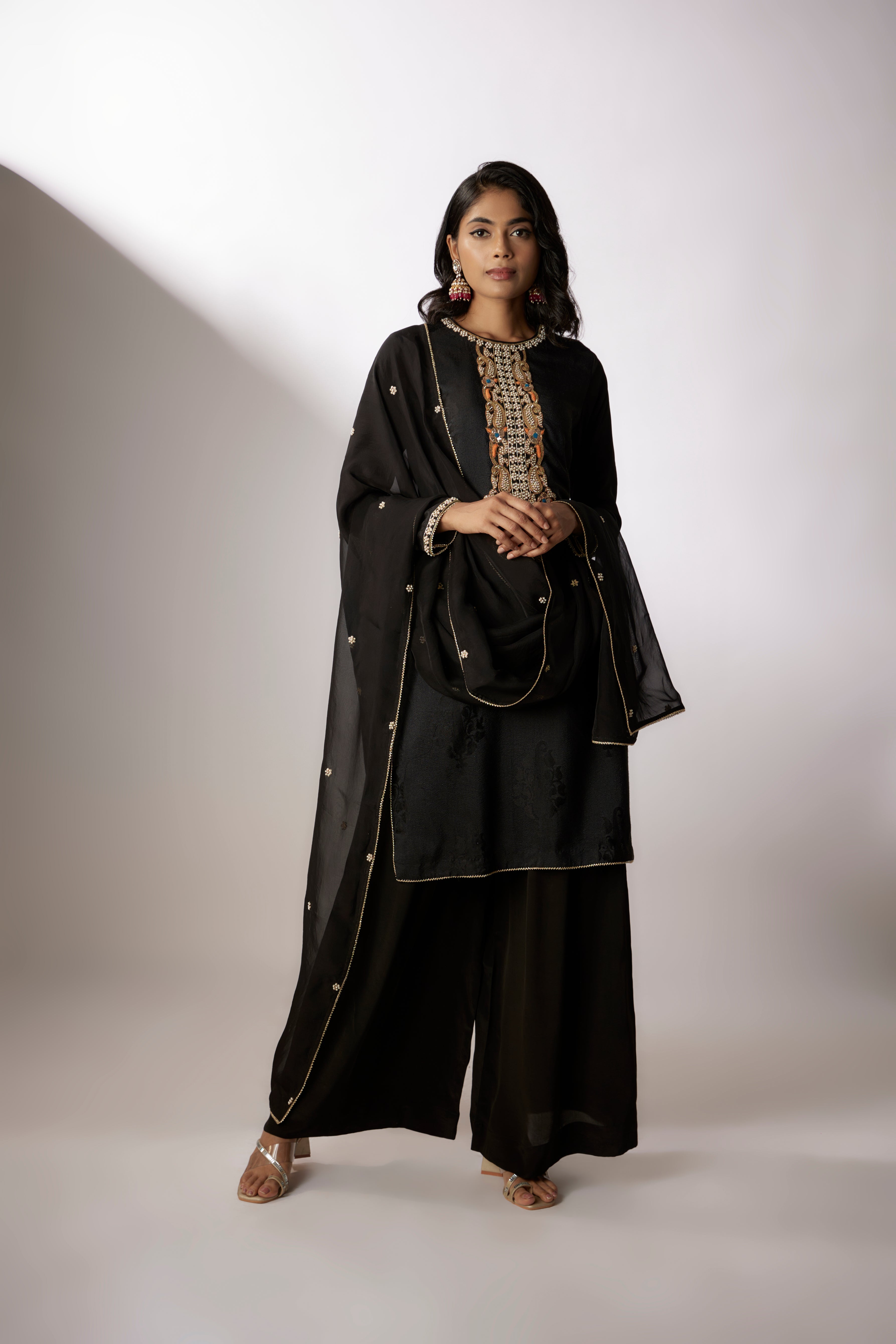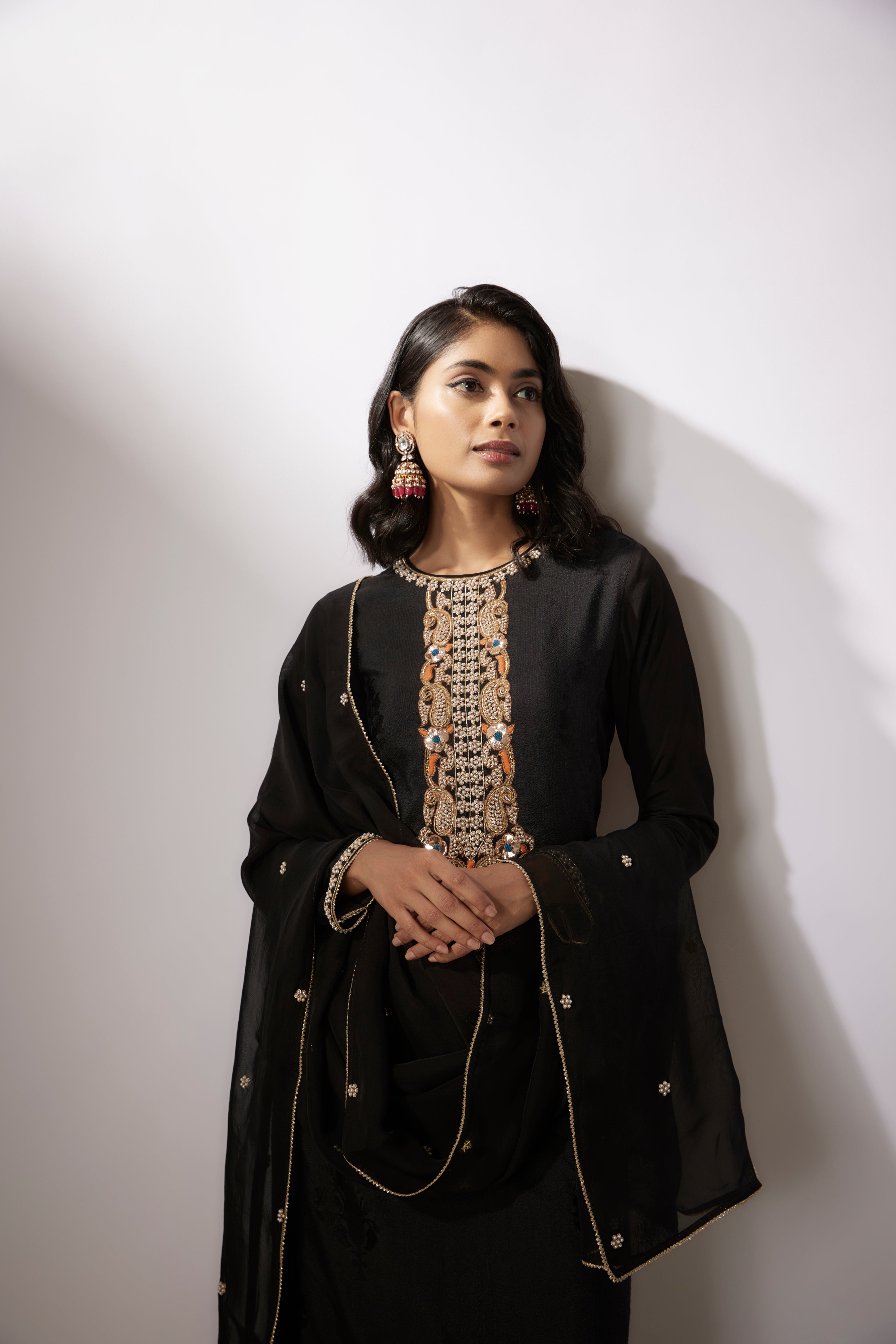 تتميز قميص كورتا أسود مطرز من قماش الحرير مع تطريز زردوسي ولؤلؤ. يأتي مع دوباتا أورجانزا متناسقة مع عمل زردوسي وبنطلون متناسق من قماش الكريب.