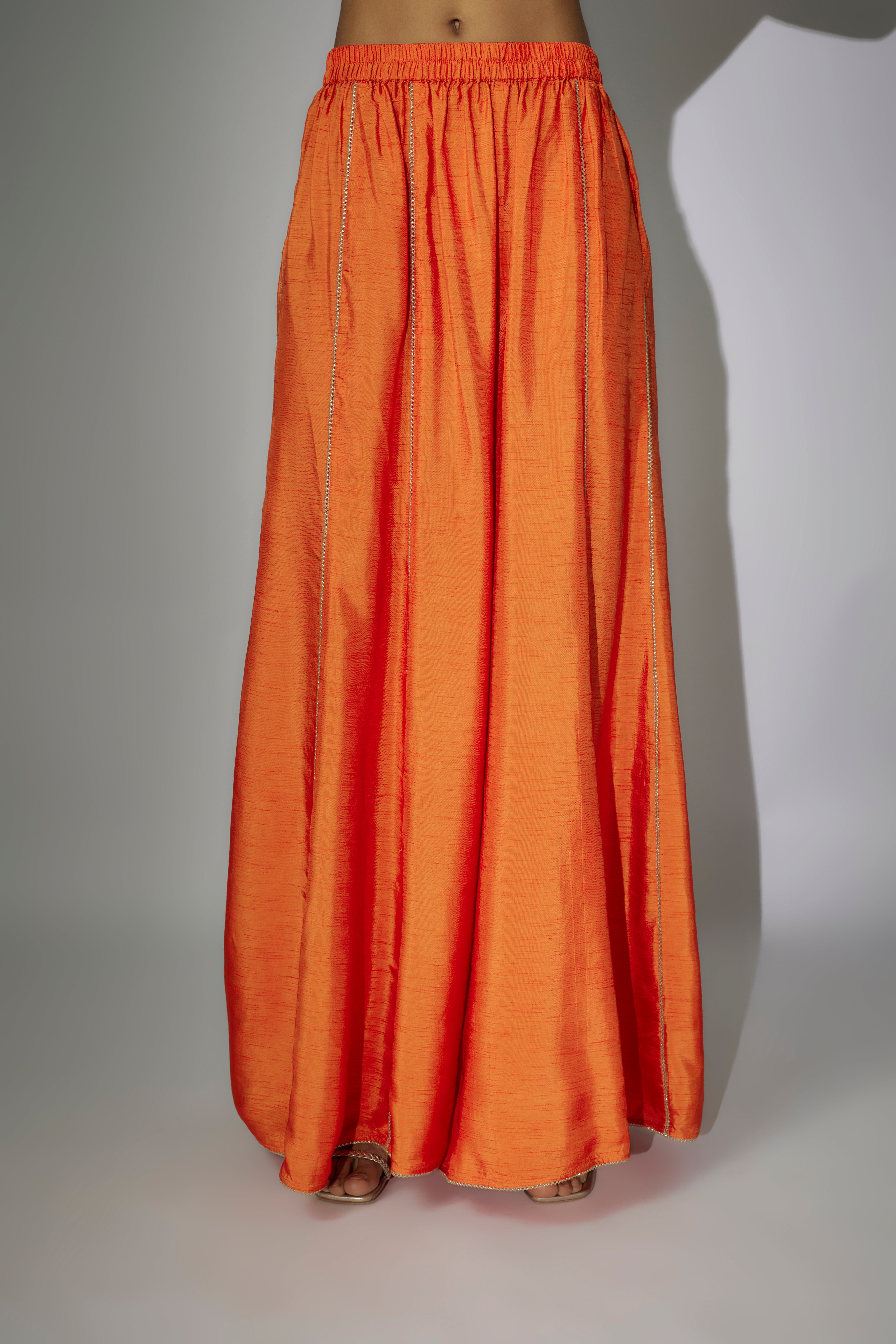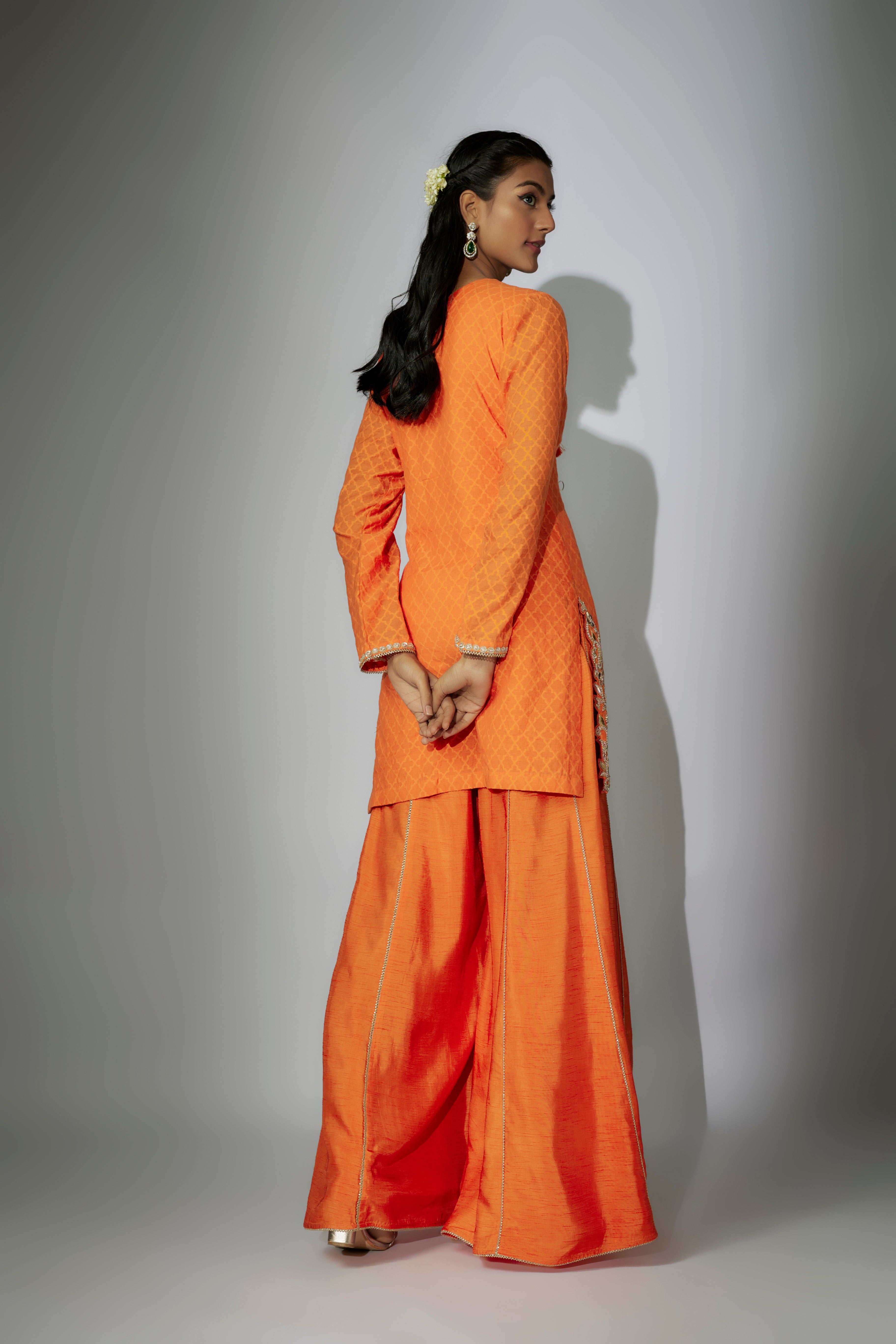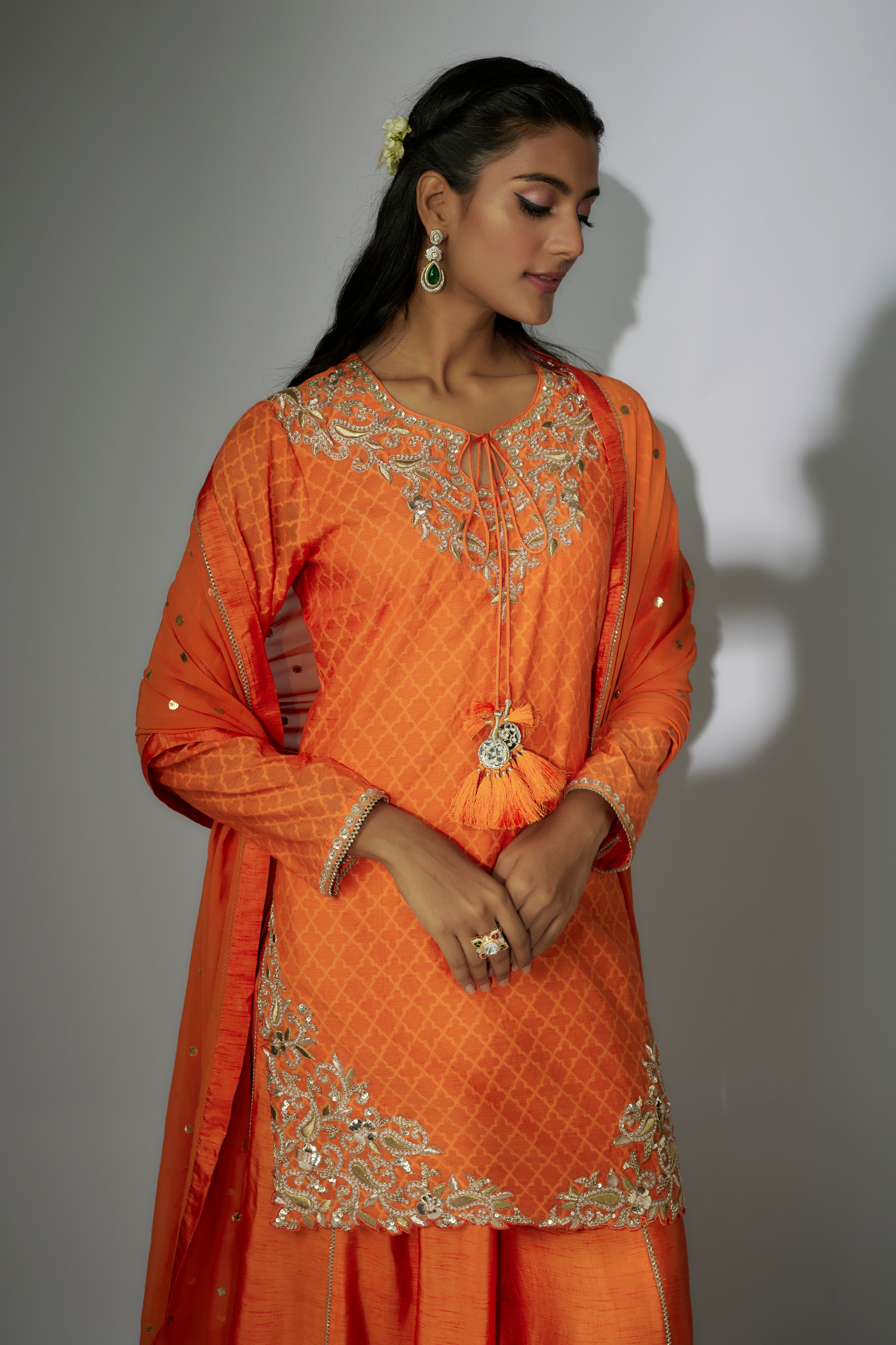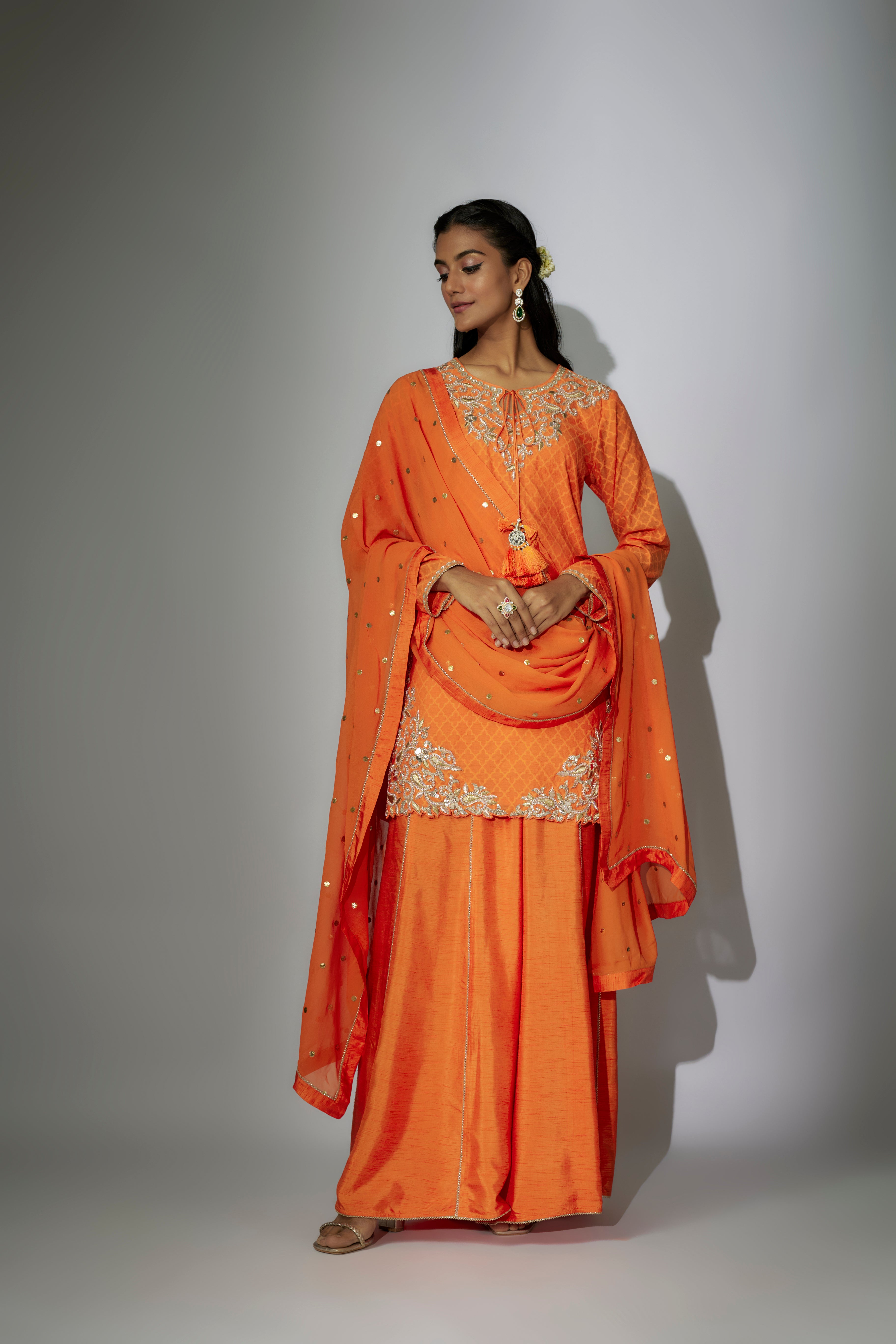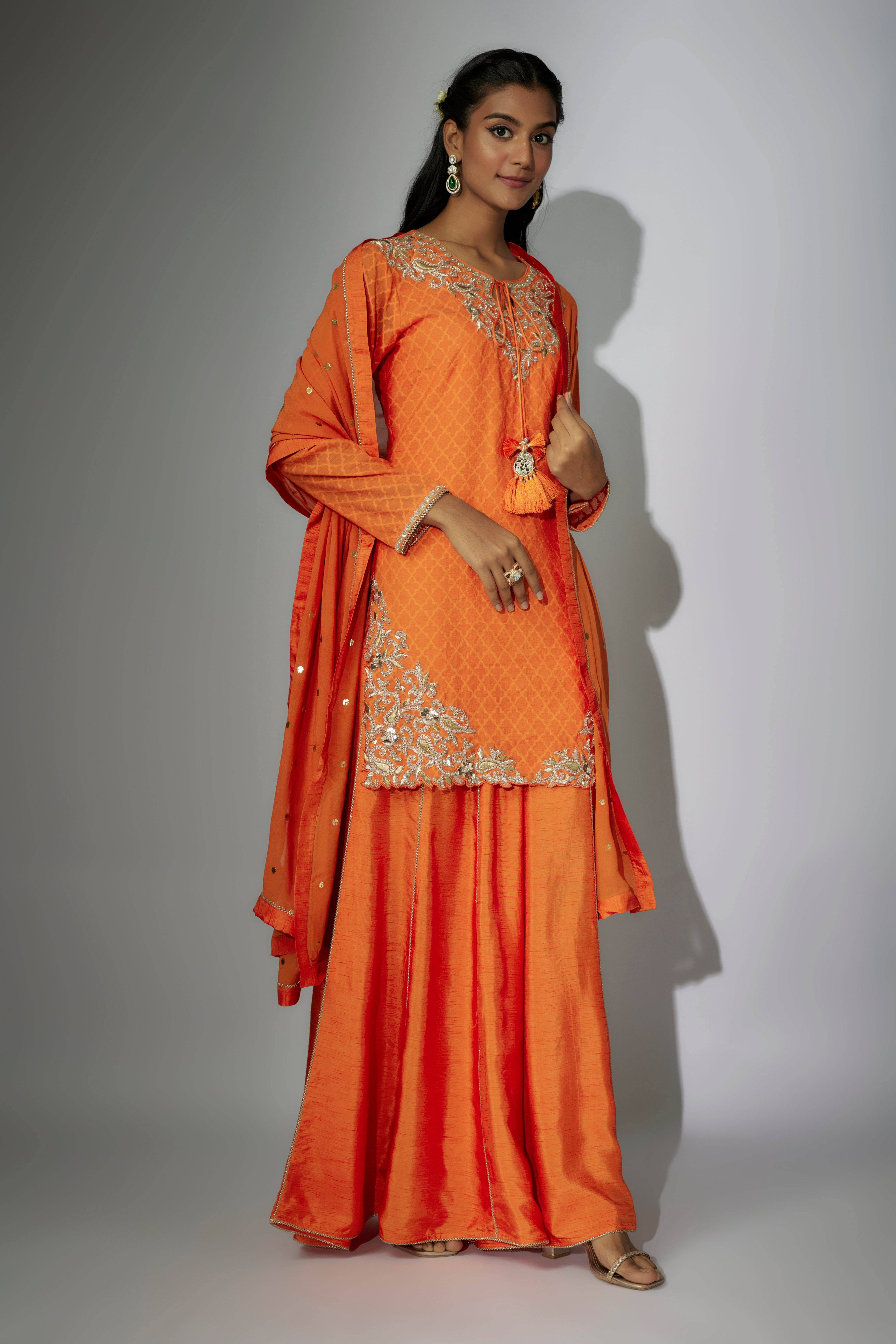 كورتا قصيرة برتقالية من تشانديري مع تطريز زاردوسي ومارودي، مع بنطلون شارارا مطابق من حرير دوبون ودوباتا جورجيت.