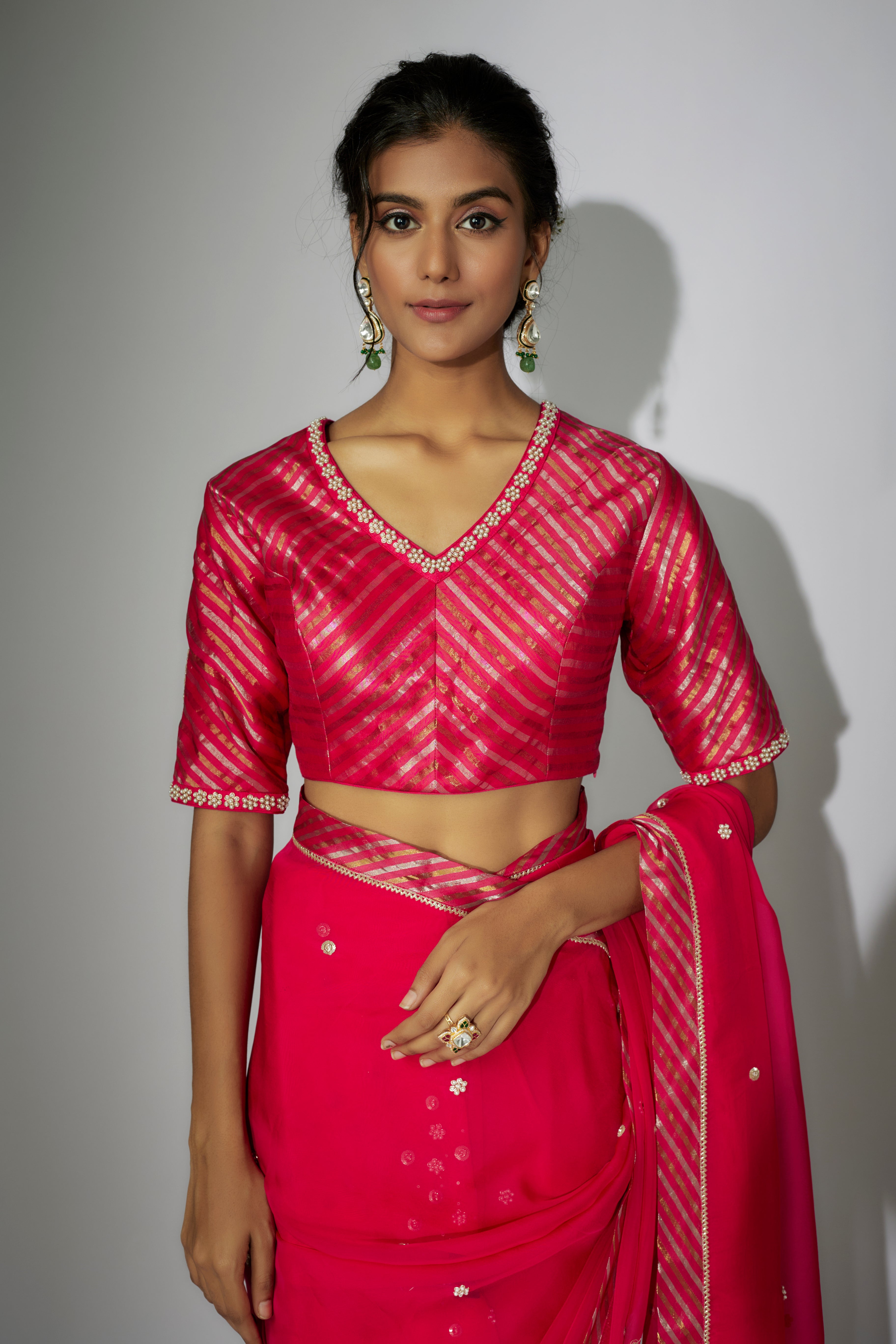 "ساري أورجانزا وردي ساخن مع تطريز زاردوسي مع بلوزة تشانديري متطابقة."