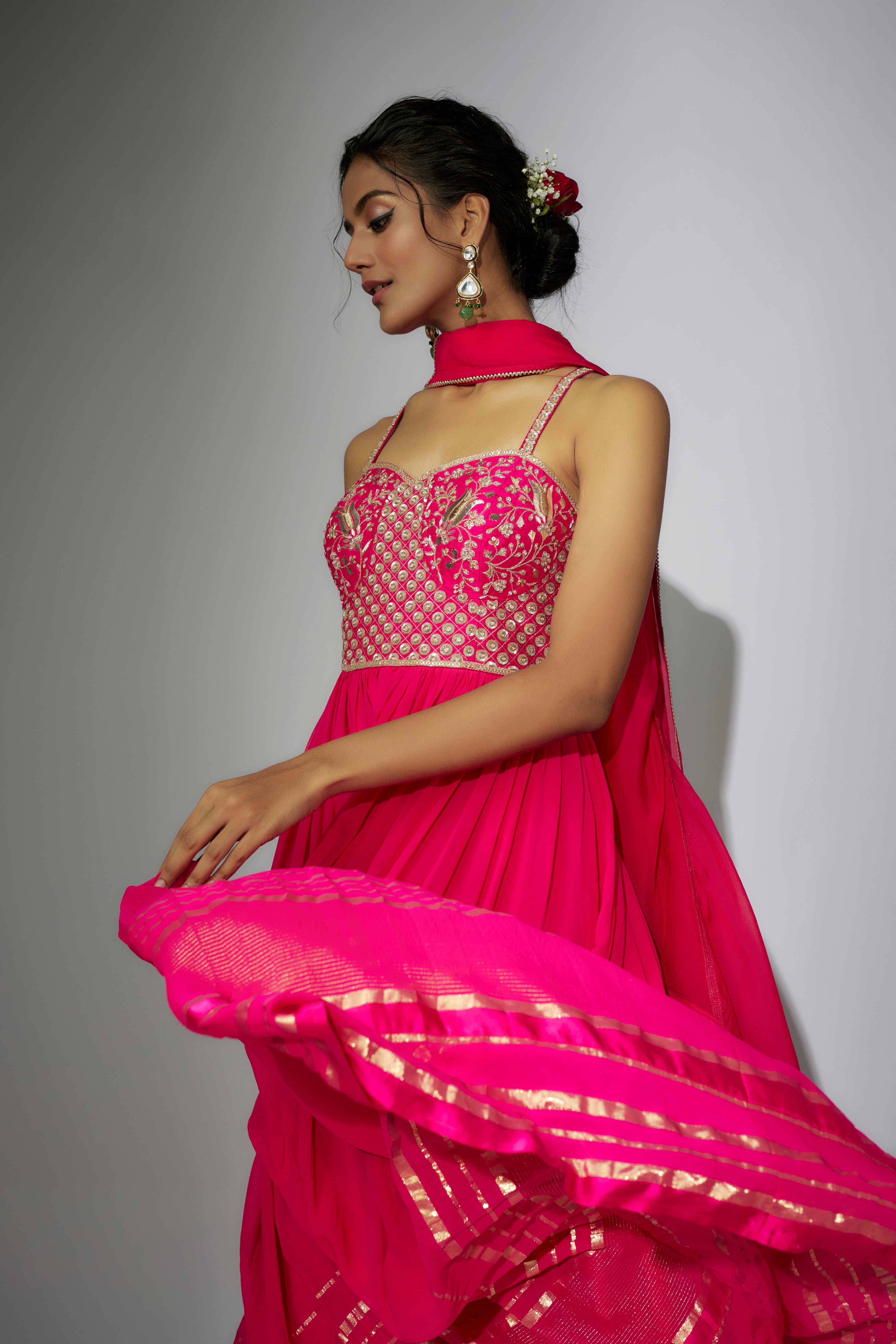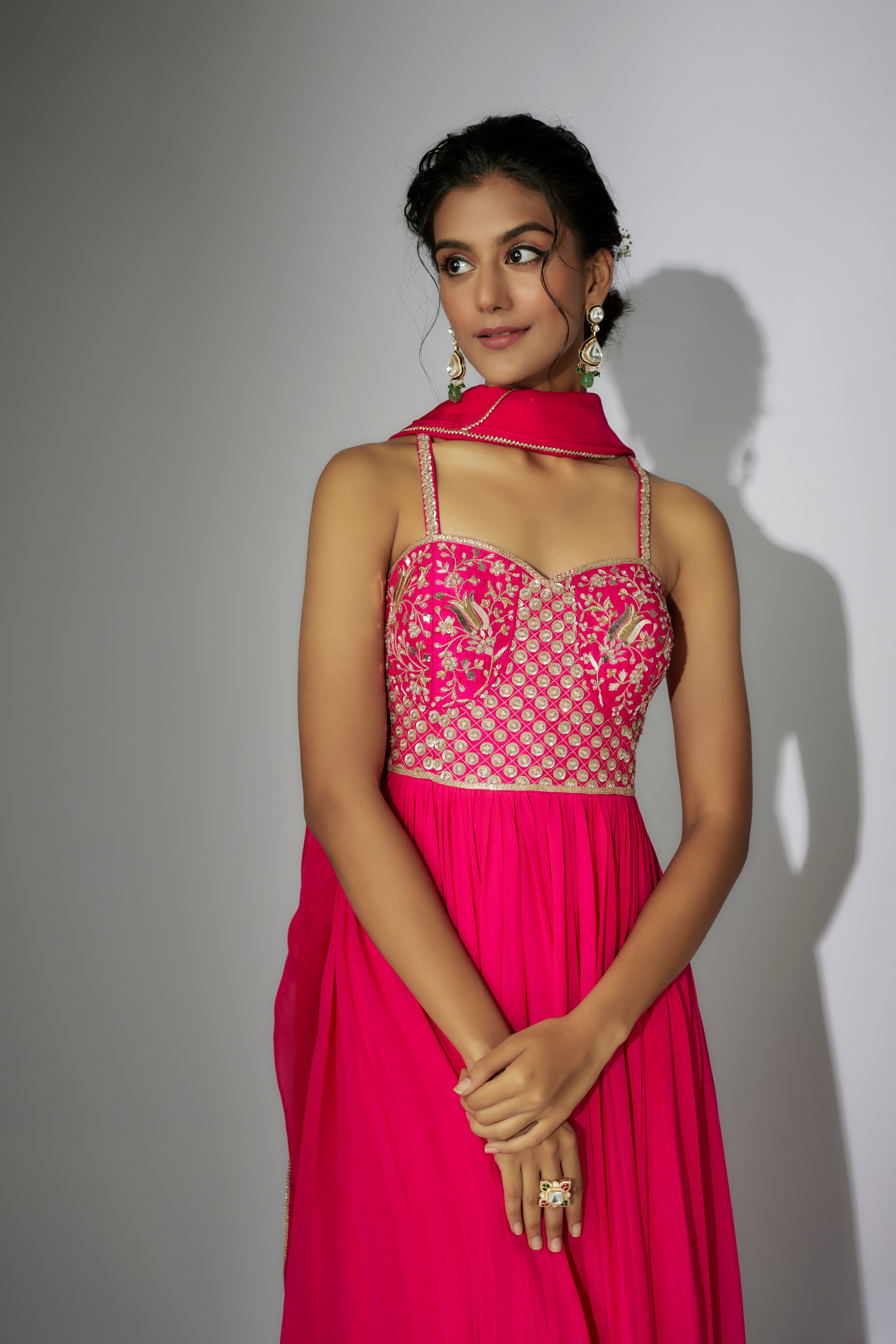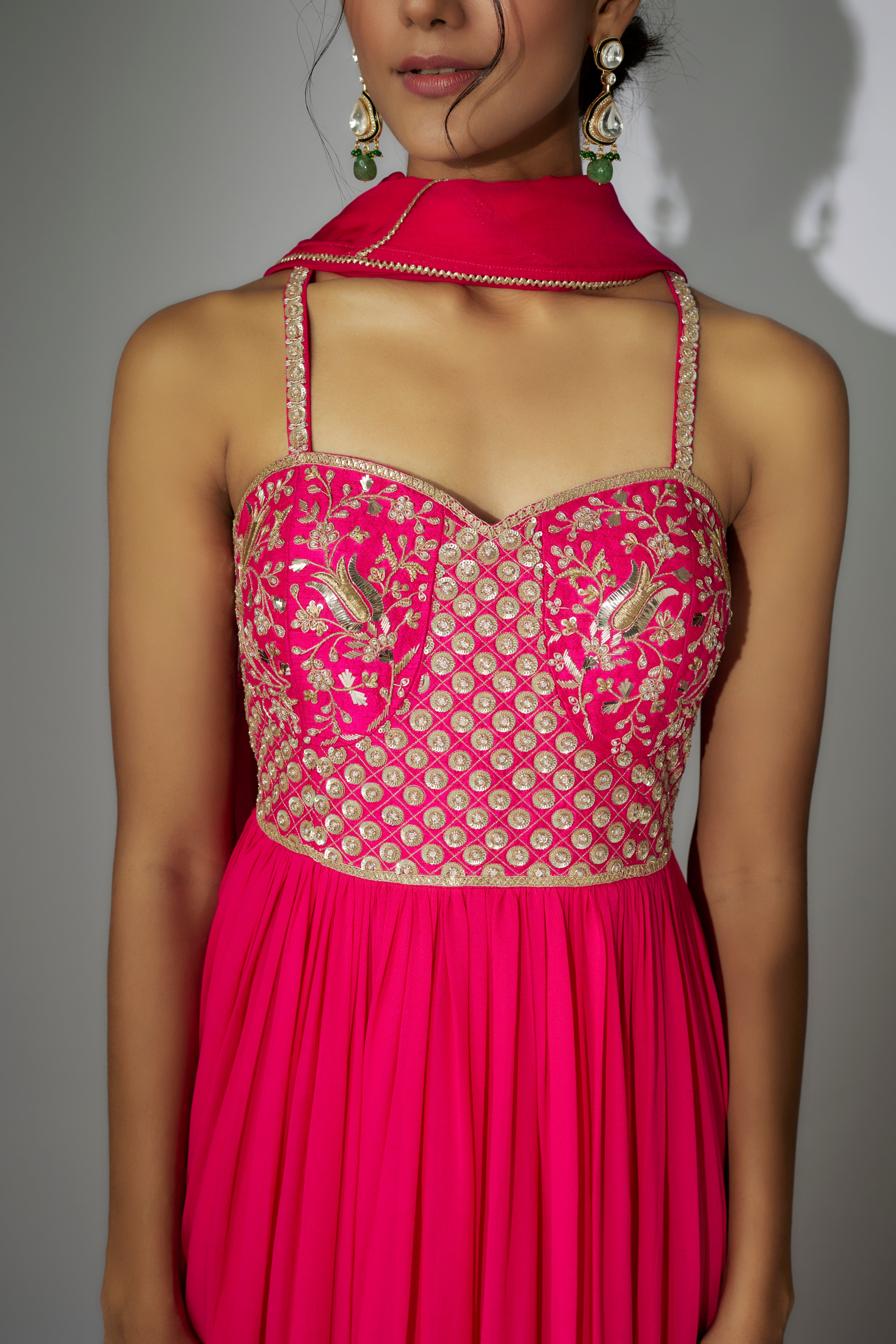 "فستان هالتر برقبة وردي ساخن من جورجيت المنسوج مع عمل زاردوسي ومارودي مع دوبتة أورجانزا متطابقة."