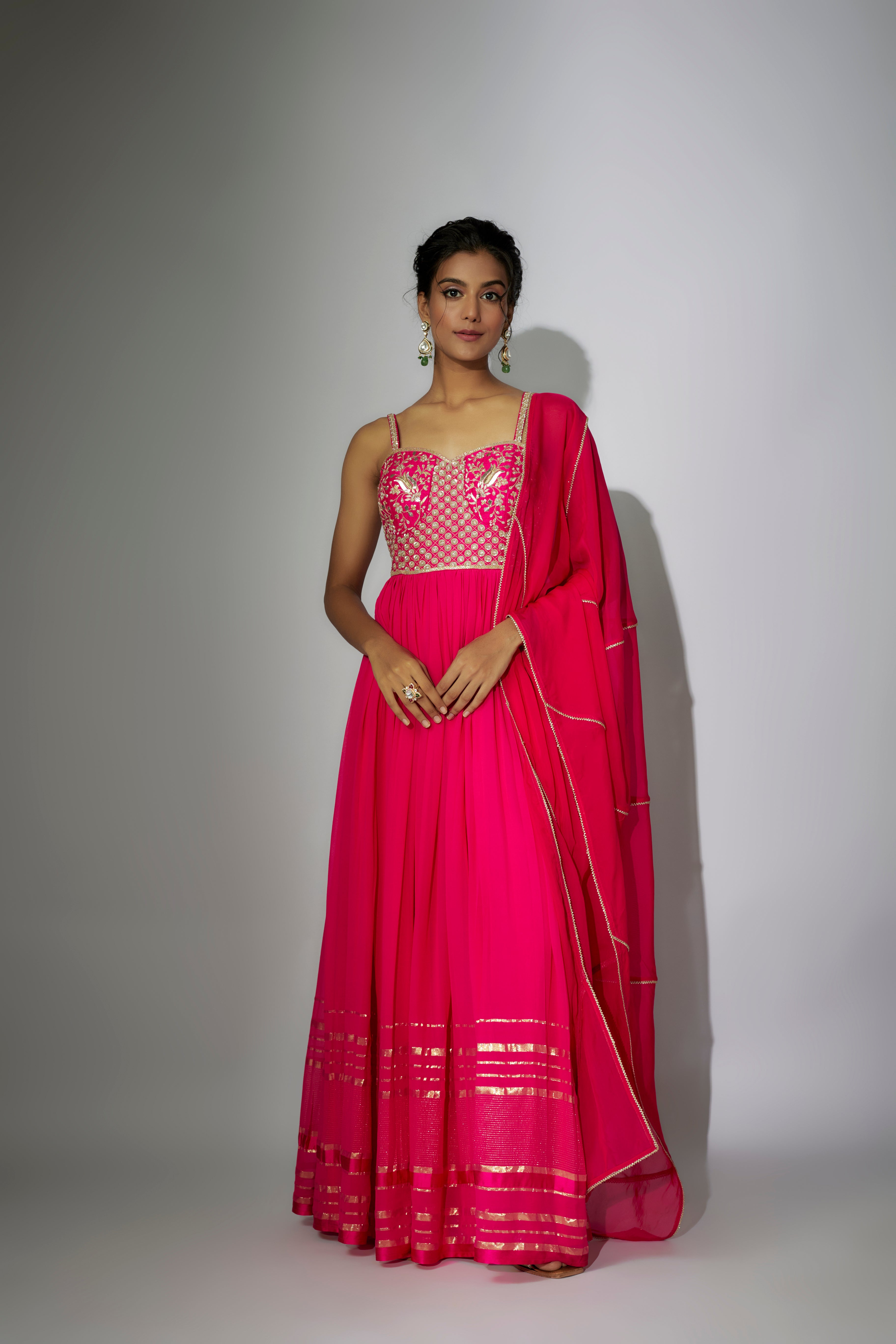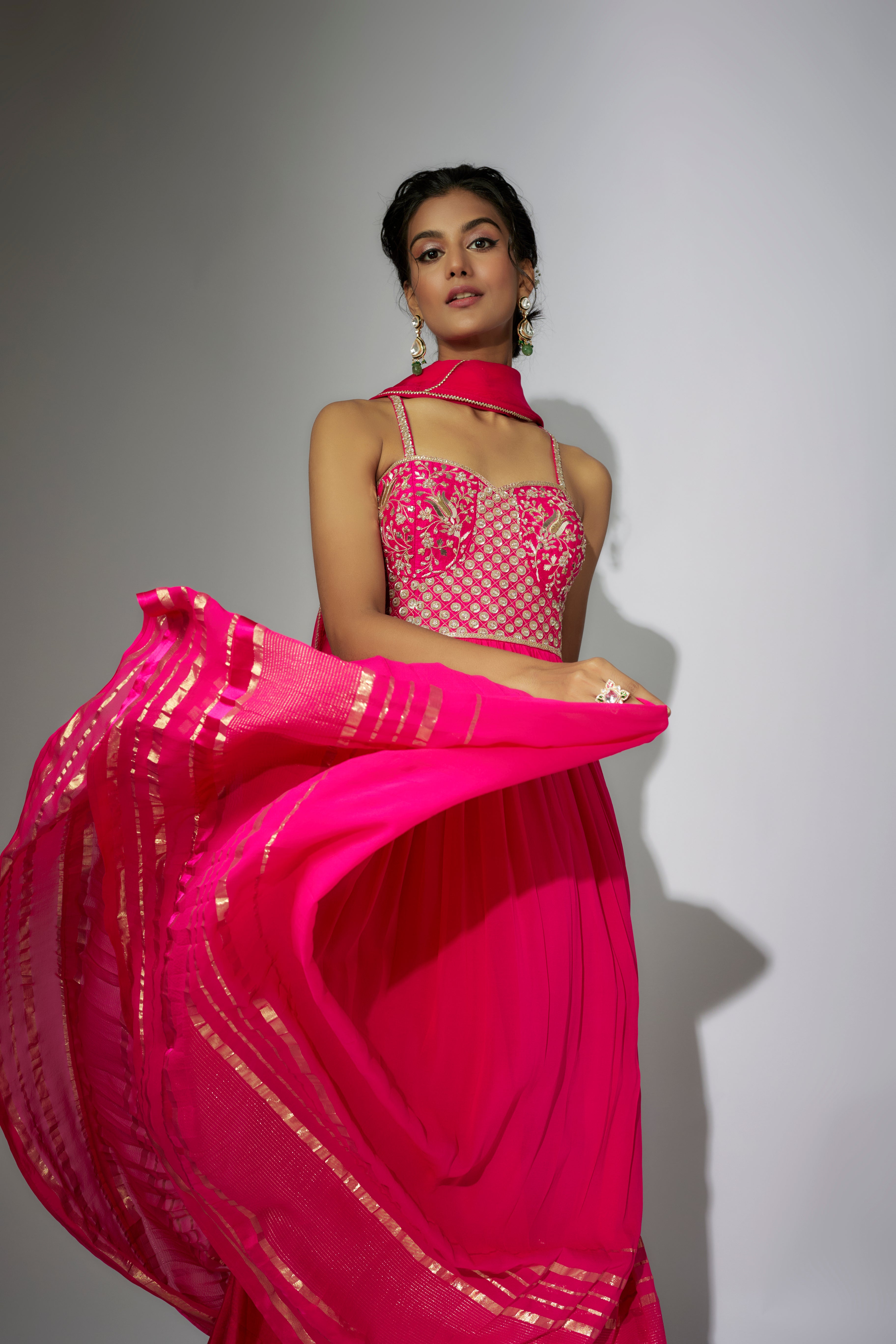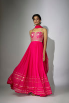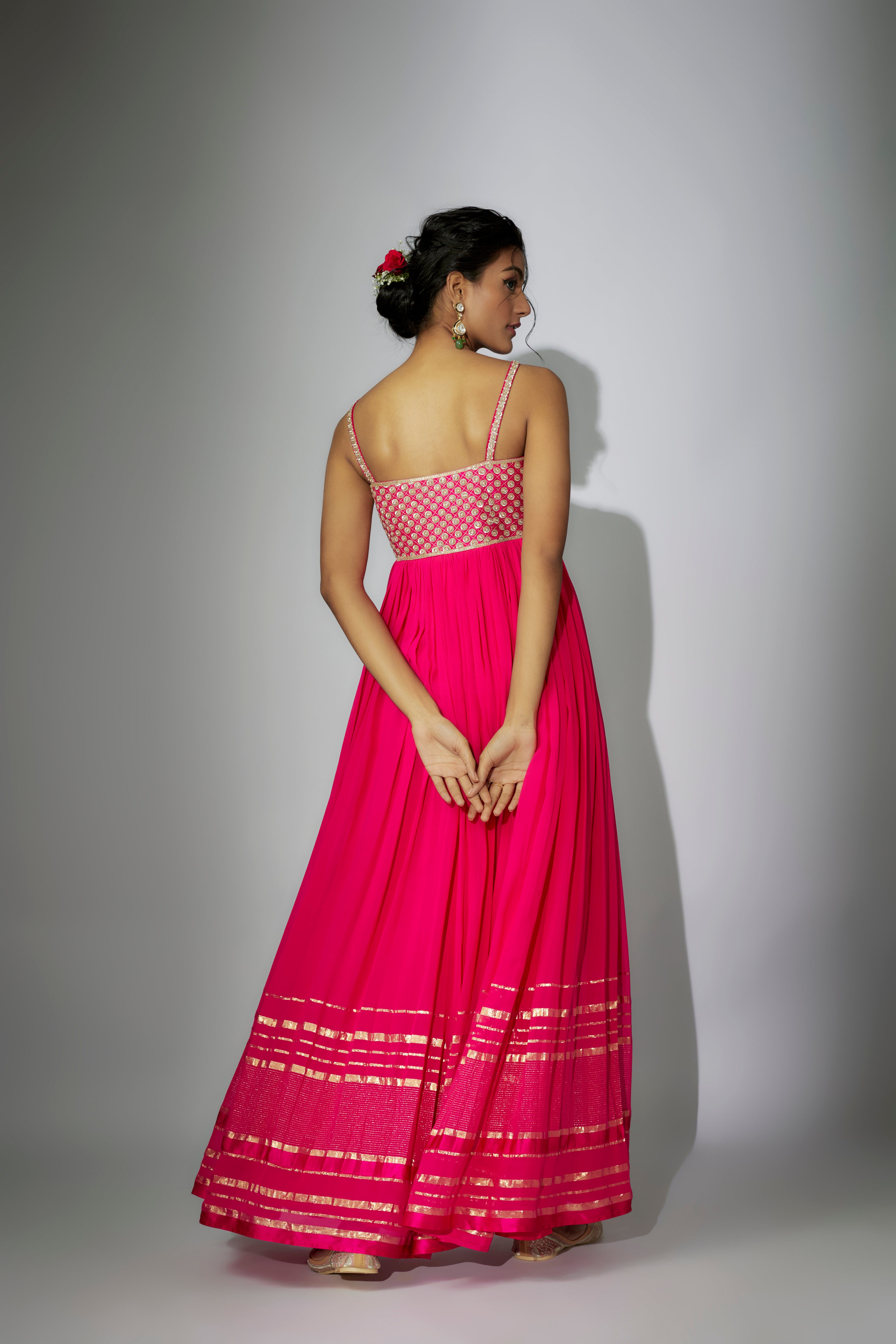 "فستان هالتر برقبة وردي ساخن من جورجيت المنسوج مع عمل زاردوسي ومارودي مع دوبتة أورجانزا متطابقة."