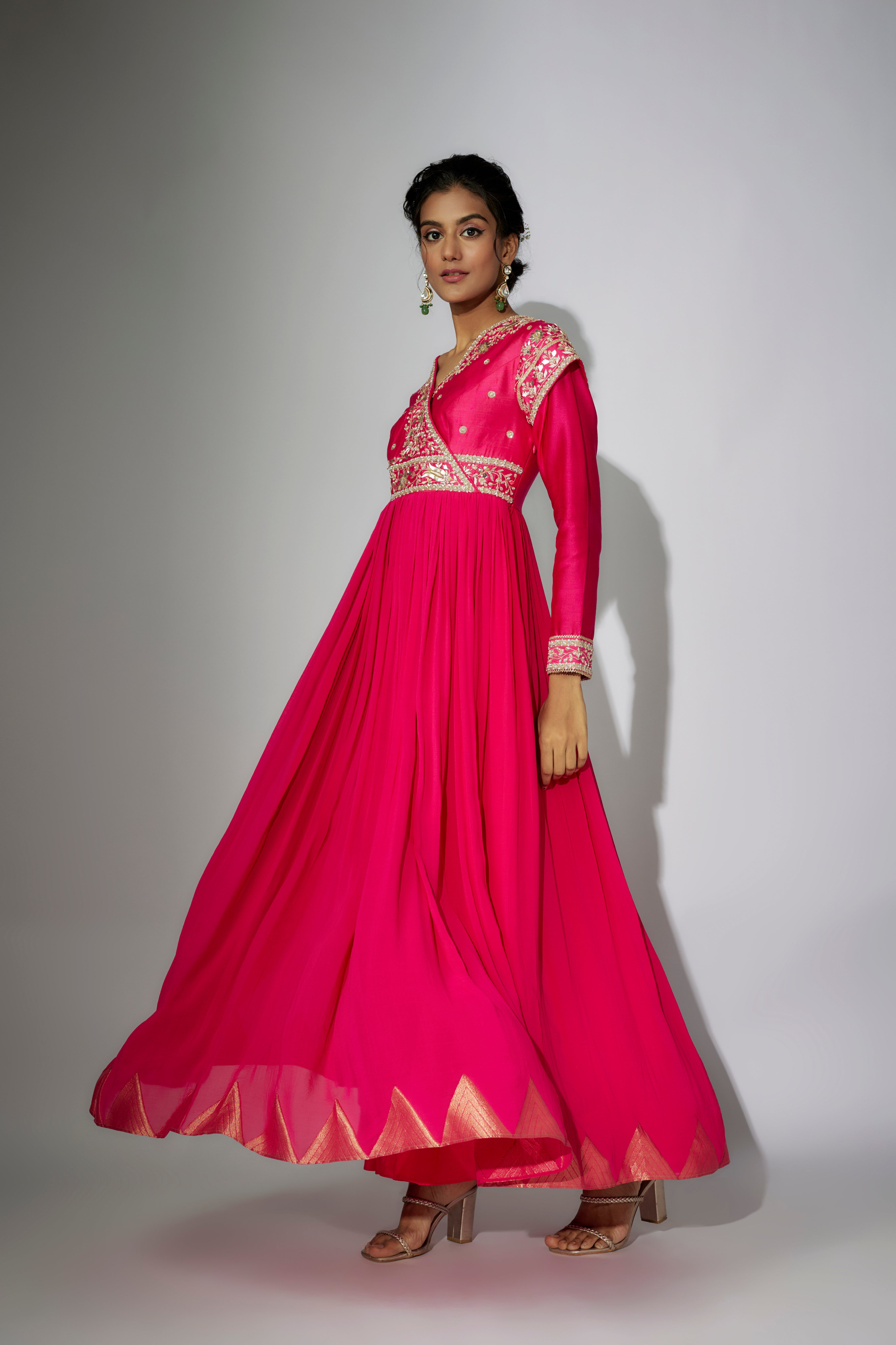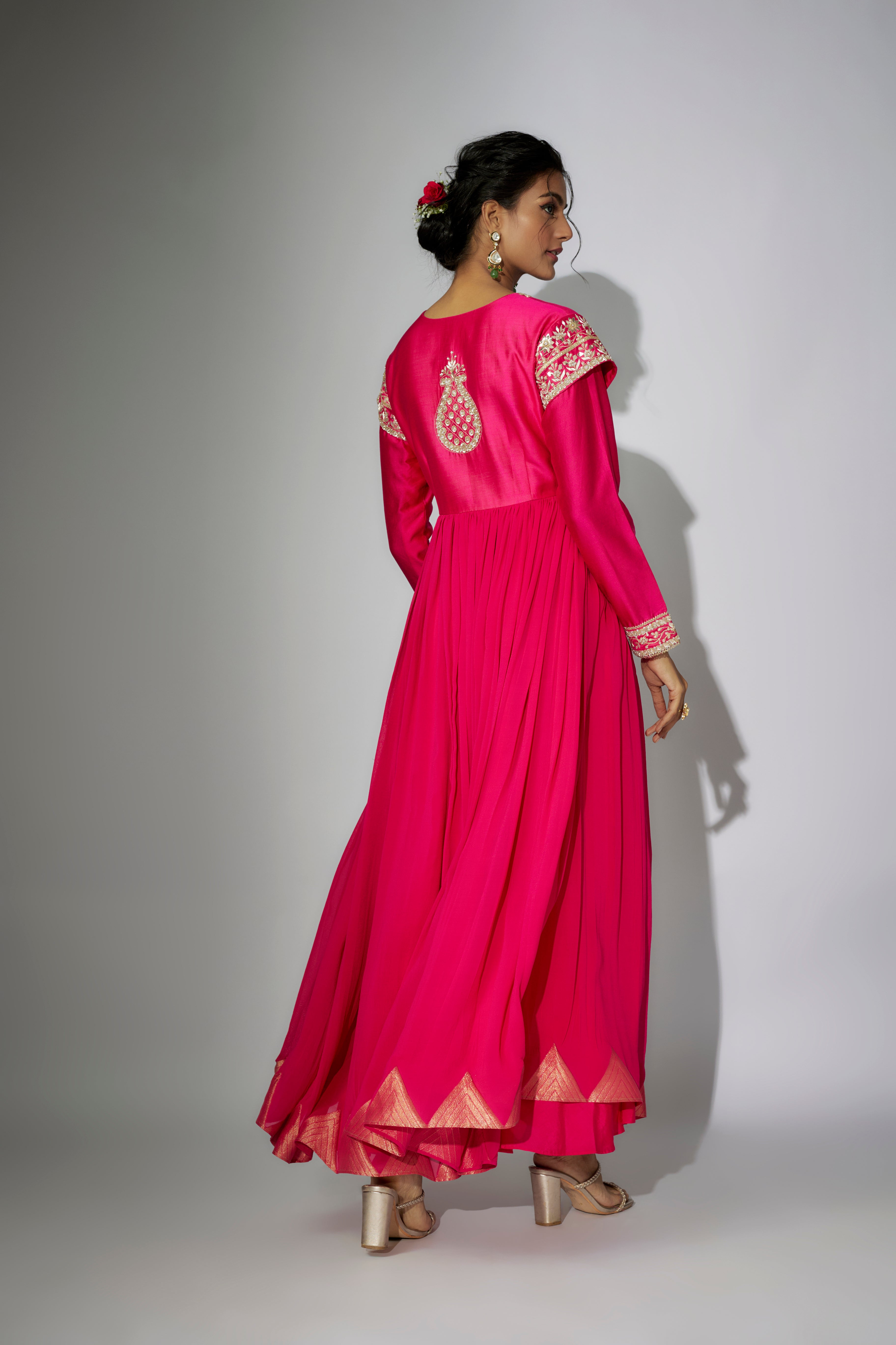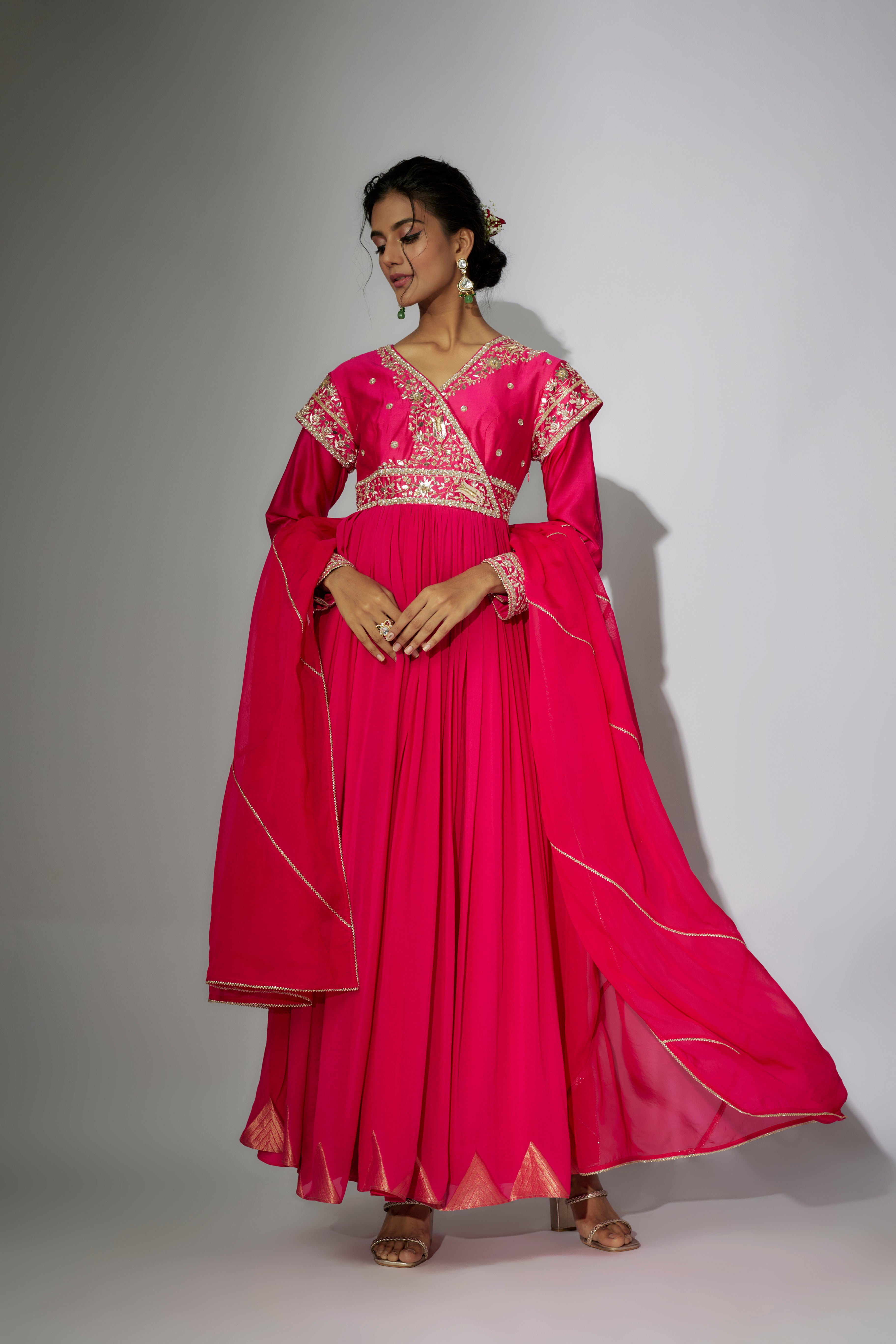 أناركالي بطول الأرض باللون الوردي الساخن على طراز أنغراخا في تشانديري وجورجيت منسوج مع تطريز زاردوسي ومارودي، مع دوباتا أورجانزا متطابقة.