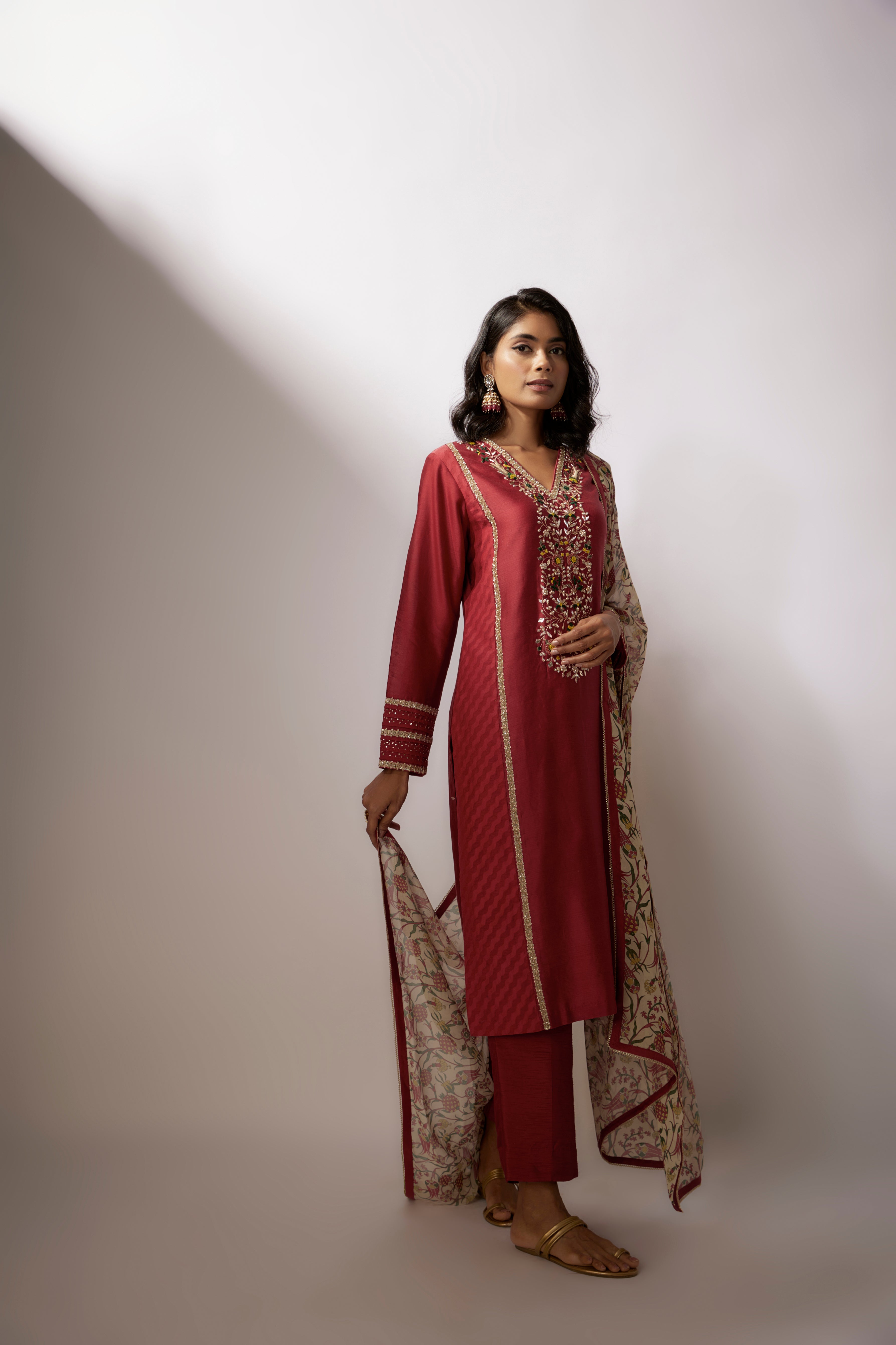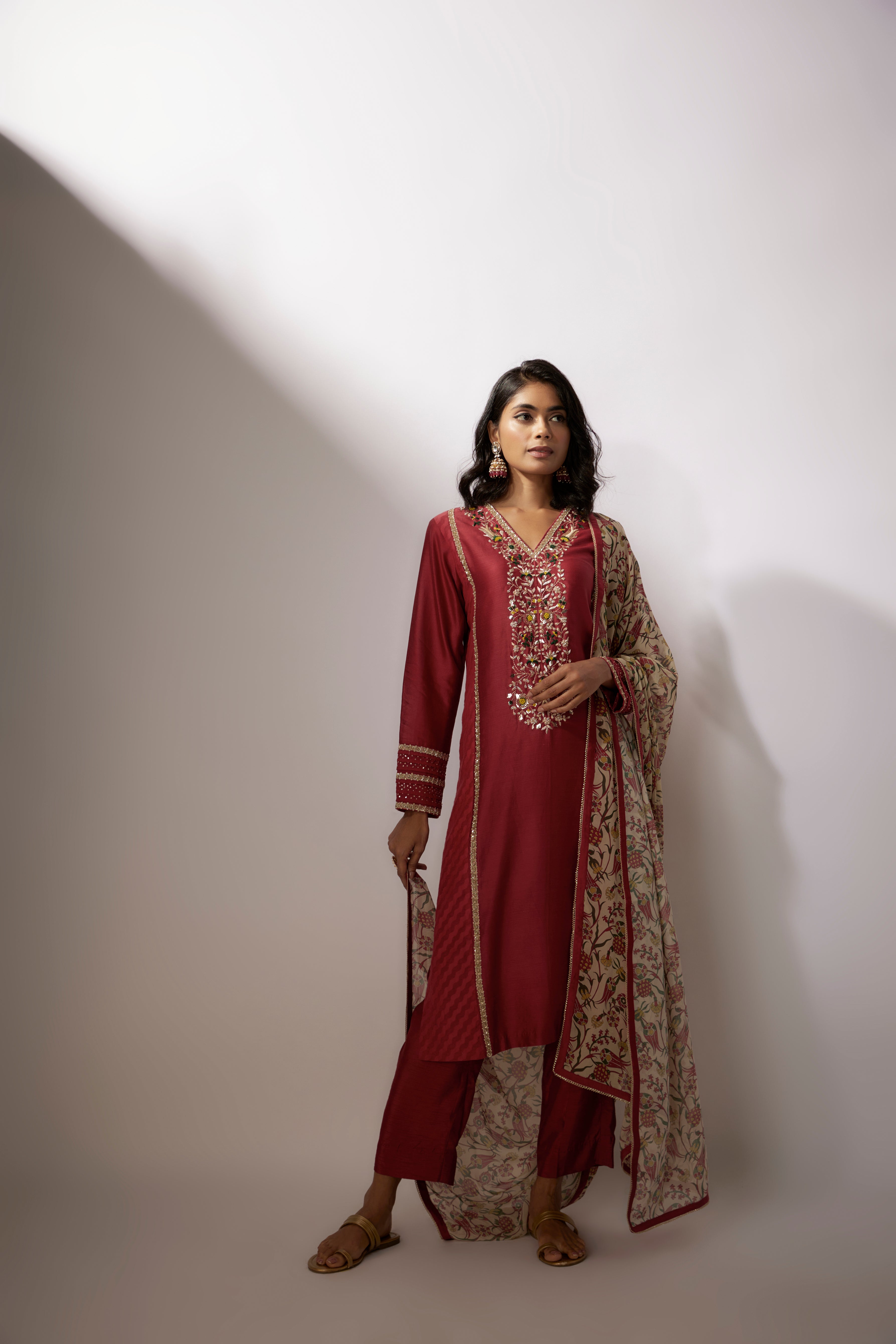 يتميز بكورتا مطرزة باللون العنابي من قماش تشانديري مع تطريز زاردوسي. يأتي مع بنطلون مستقيم مطابق من حرير دوبون وشال مطبوع باللون البيج من قماش جورجيت.