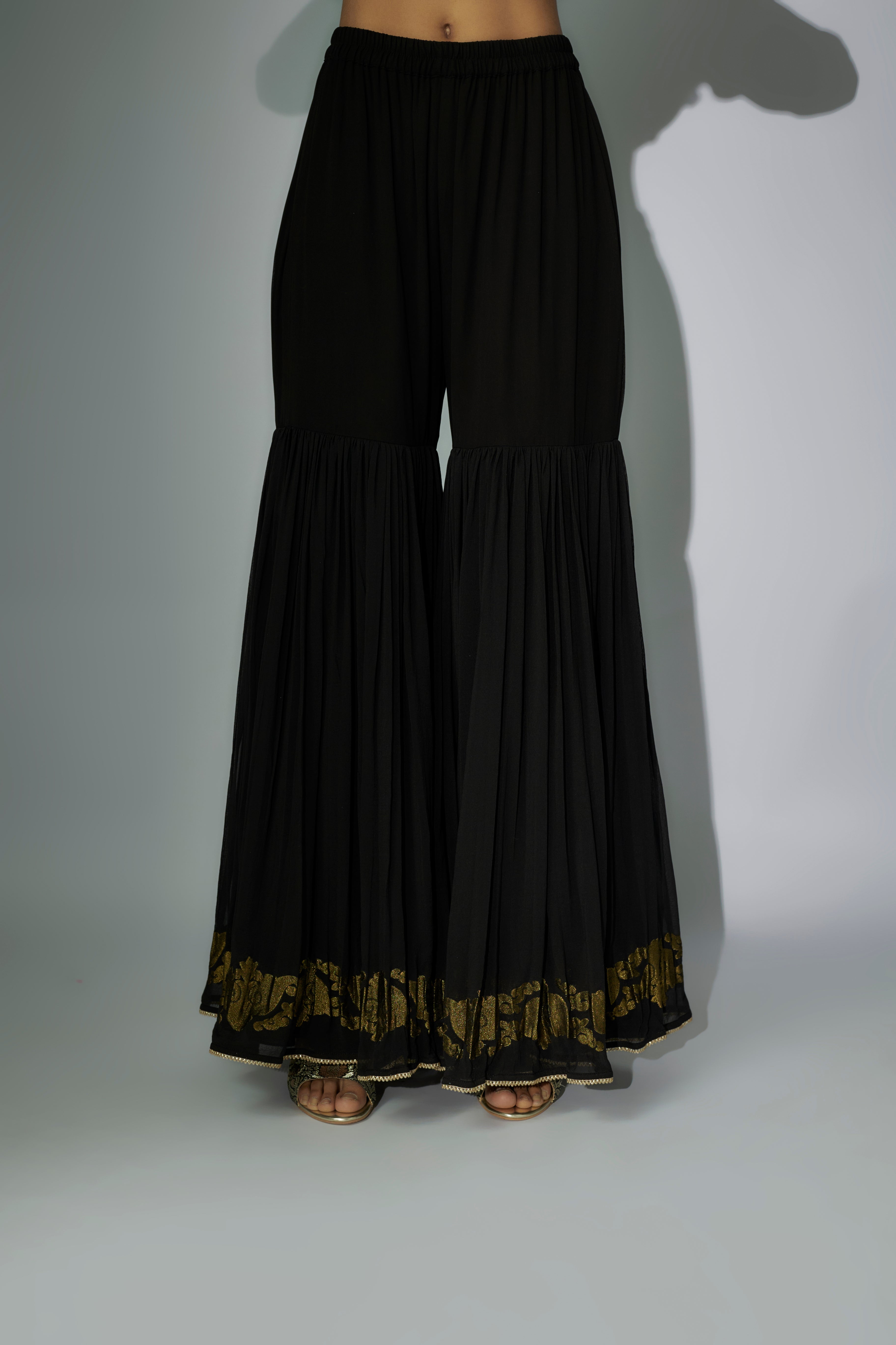 توب بيبلوم أسود من تشانديري وجورجيت منسوج مع تطريز زاردوسي ومارودي. مزود مع بنطلون جارارا ودوباتا من جورجيت.