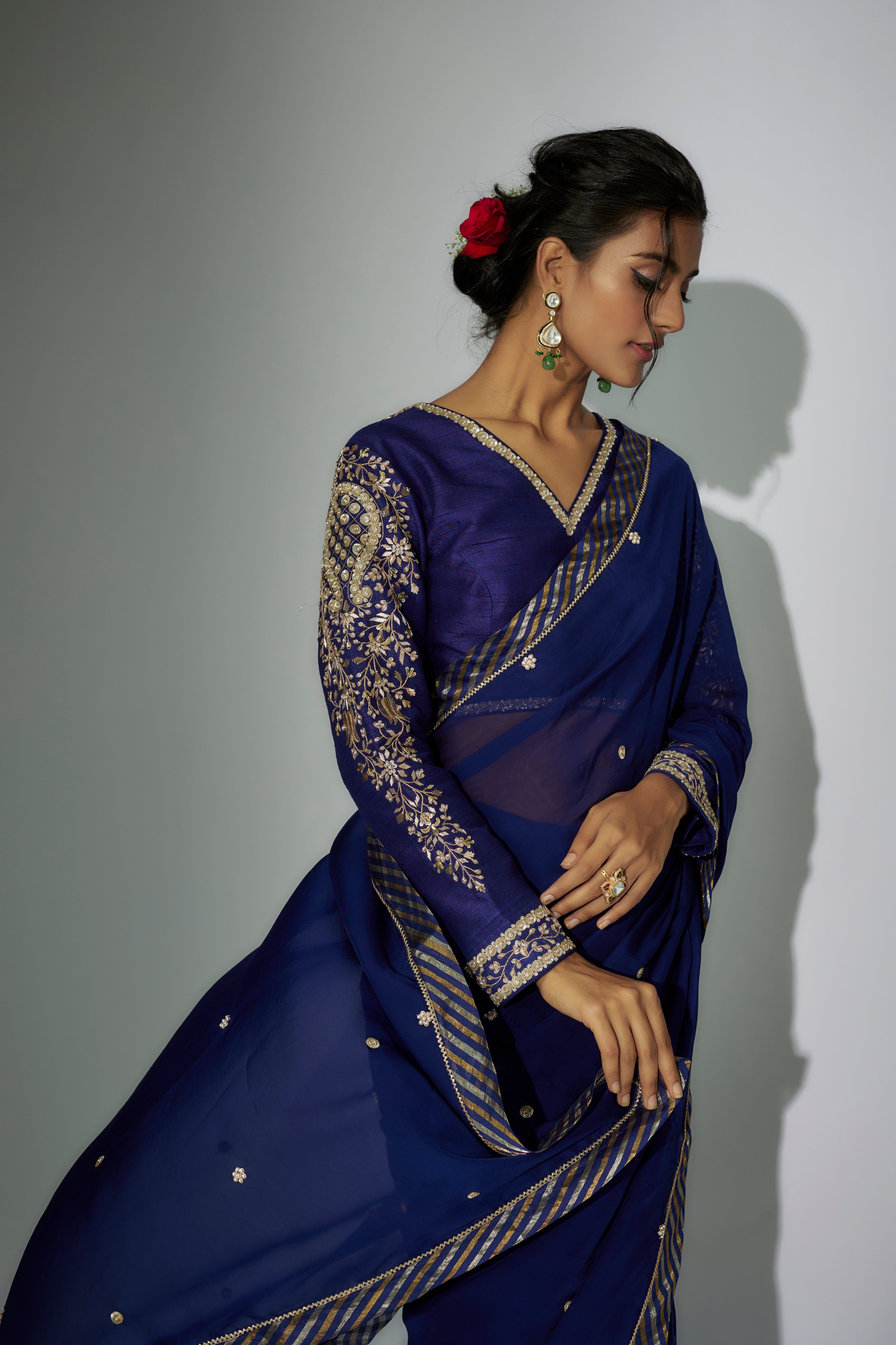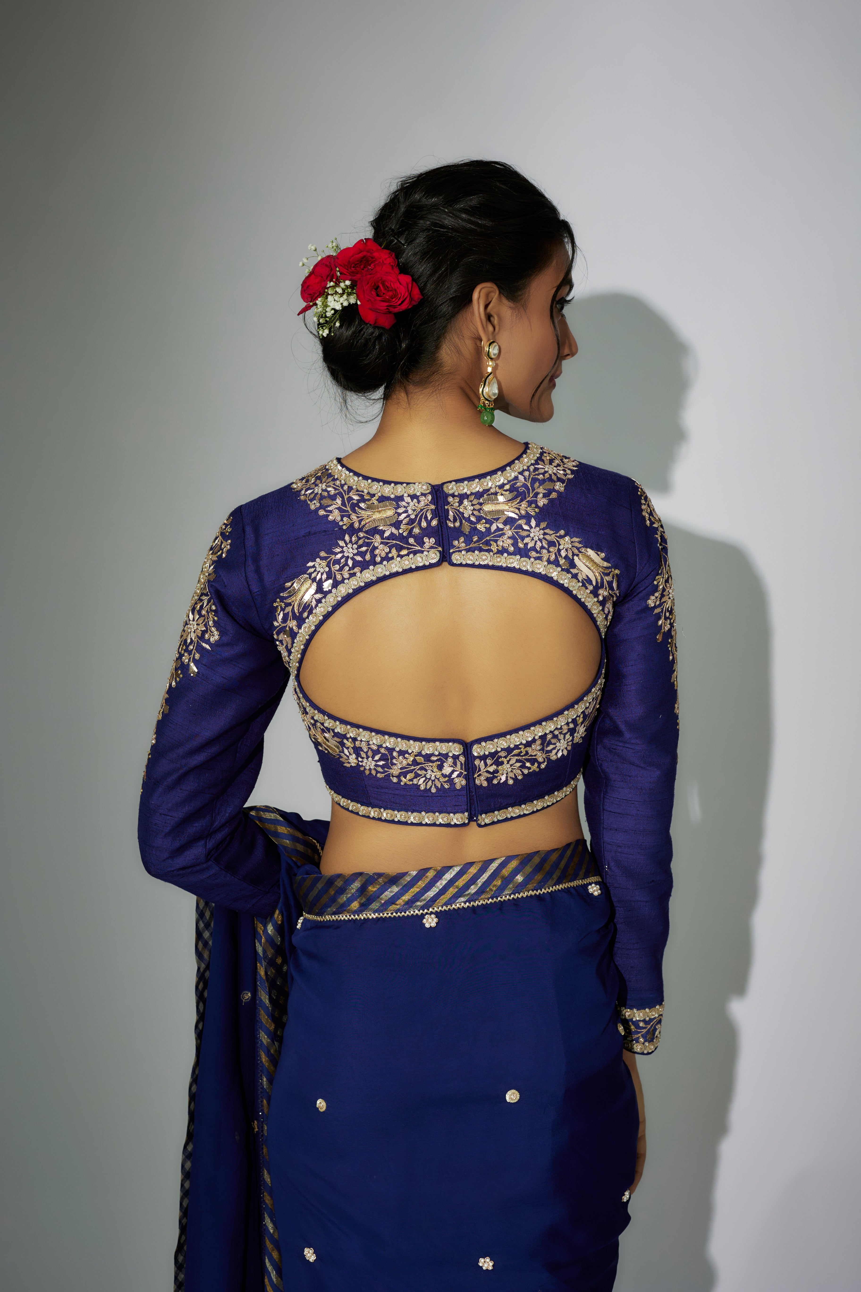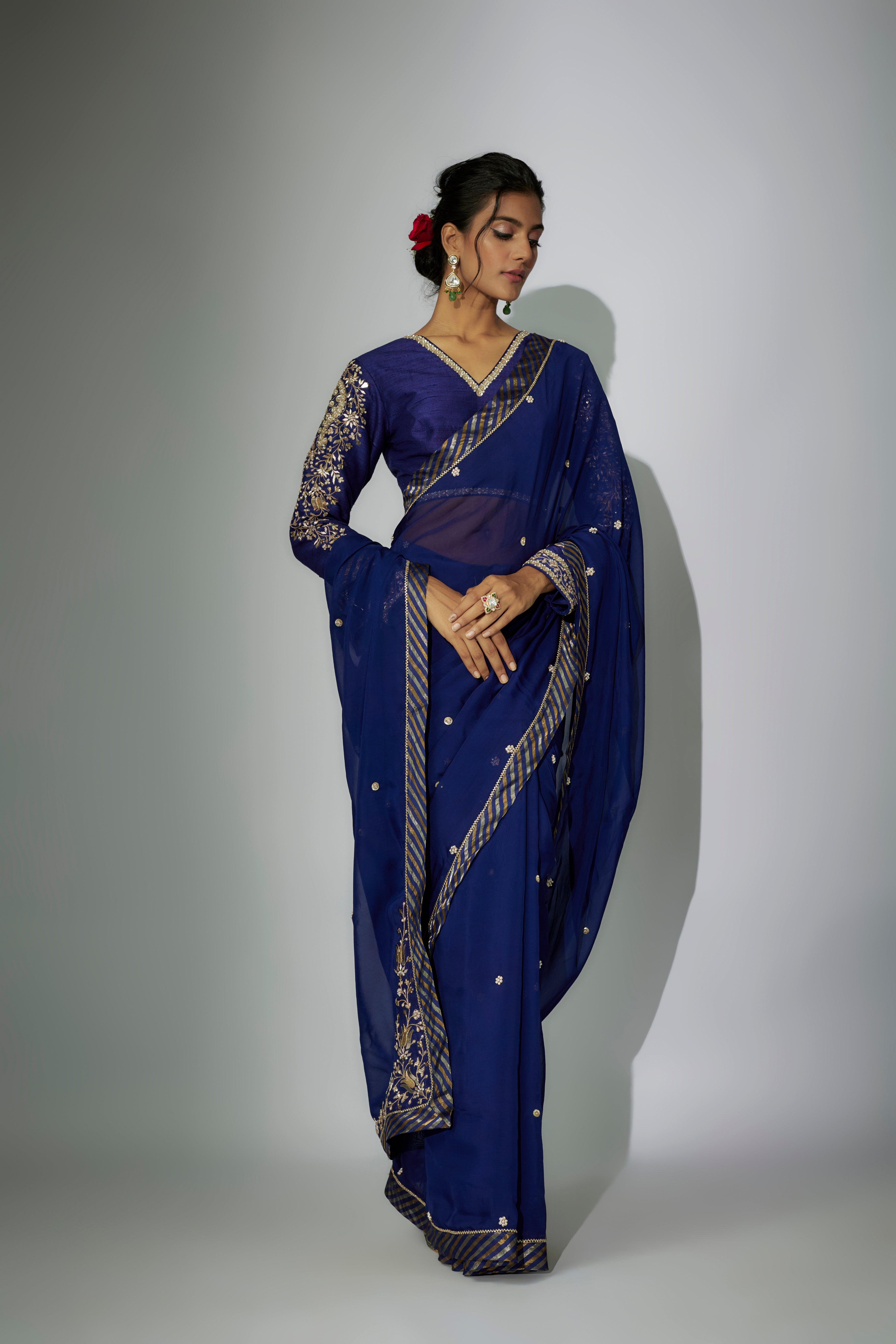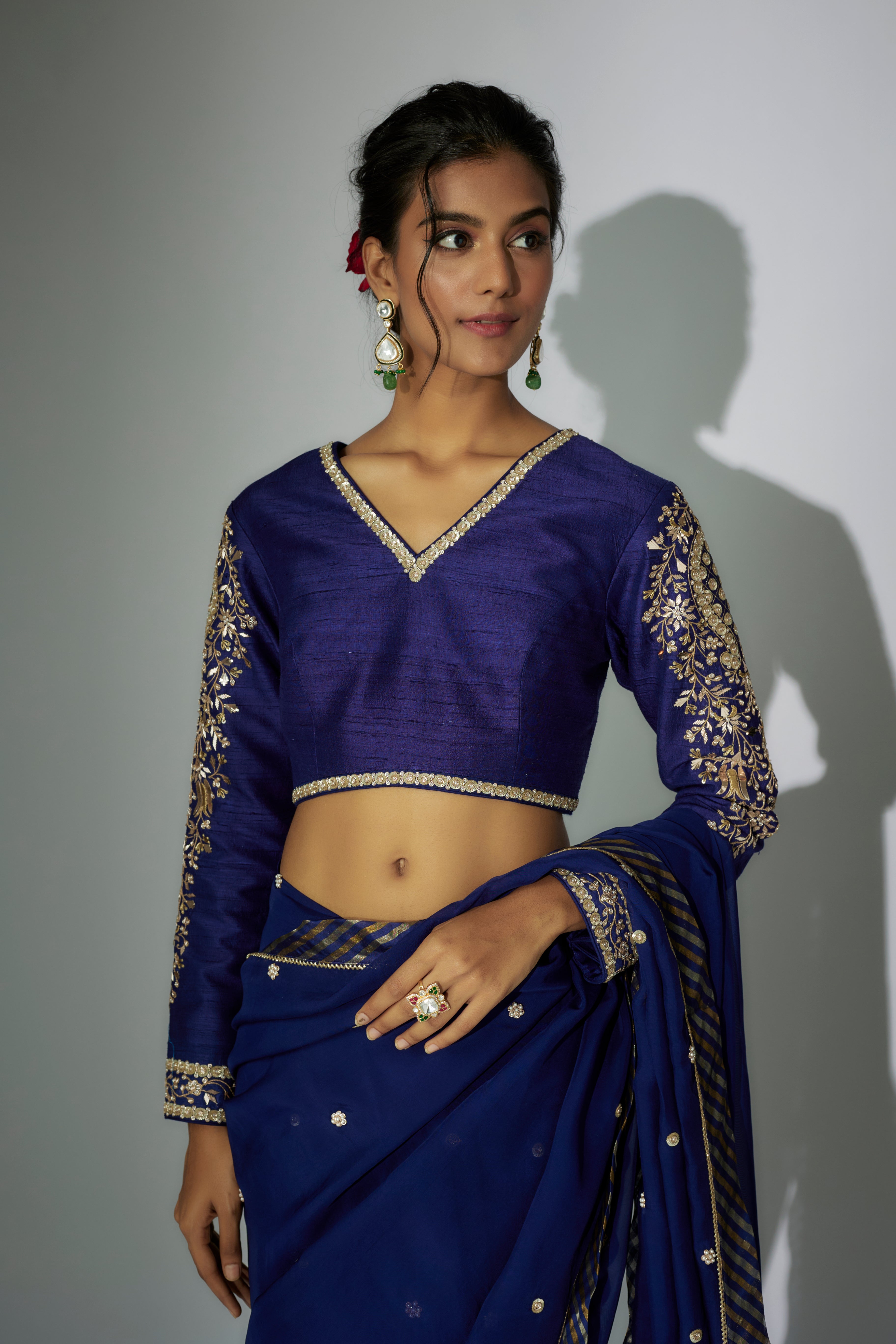 "ساري أورجانزا Royal Blue مع عمل زاردوسي، مقترن ببلوزة من الحرير الخام مع تطريز مارودي وزاردوسي."