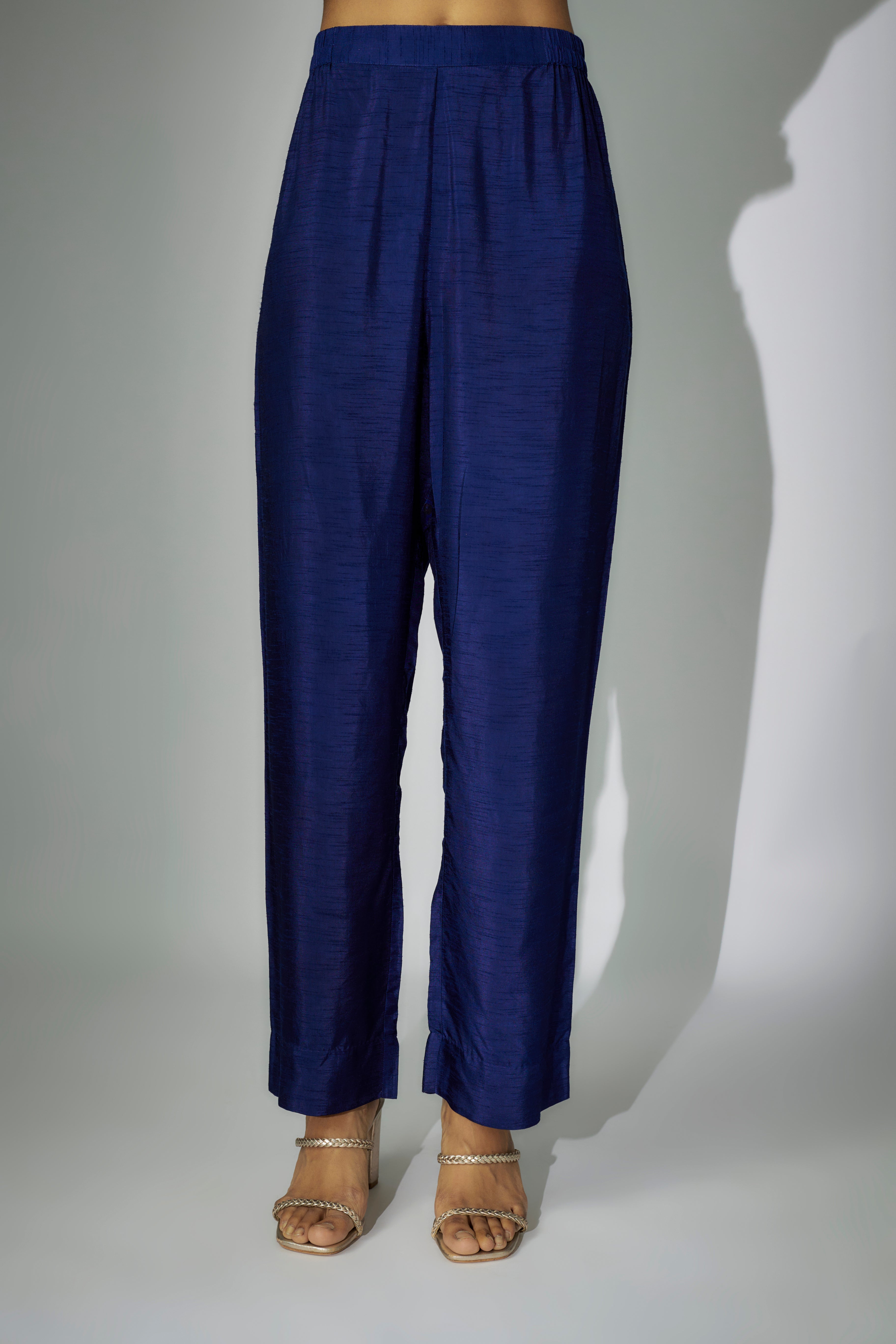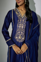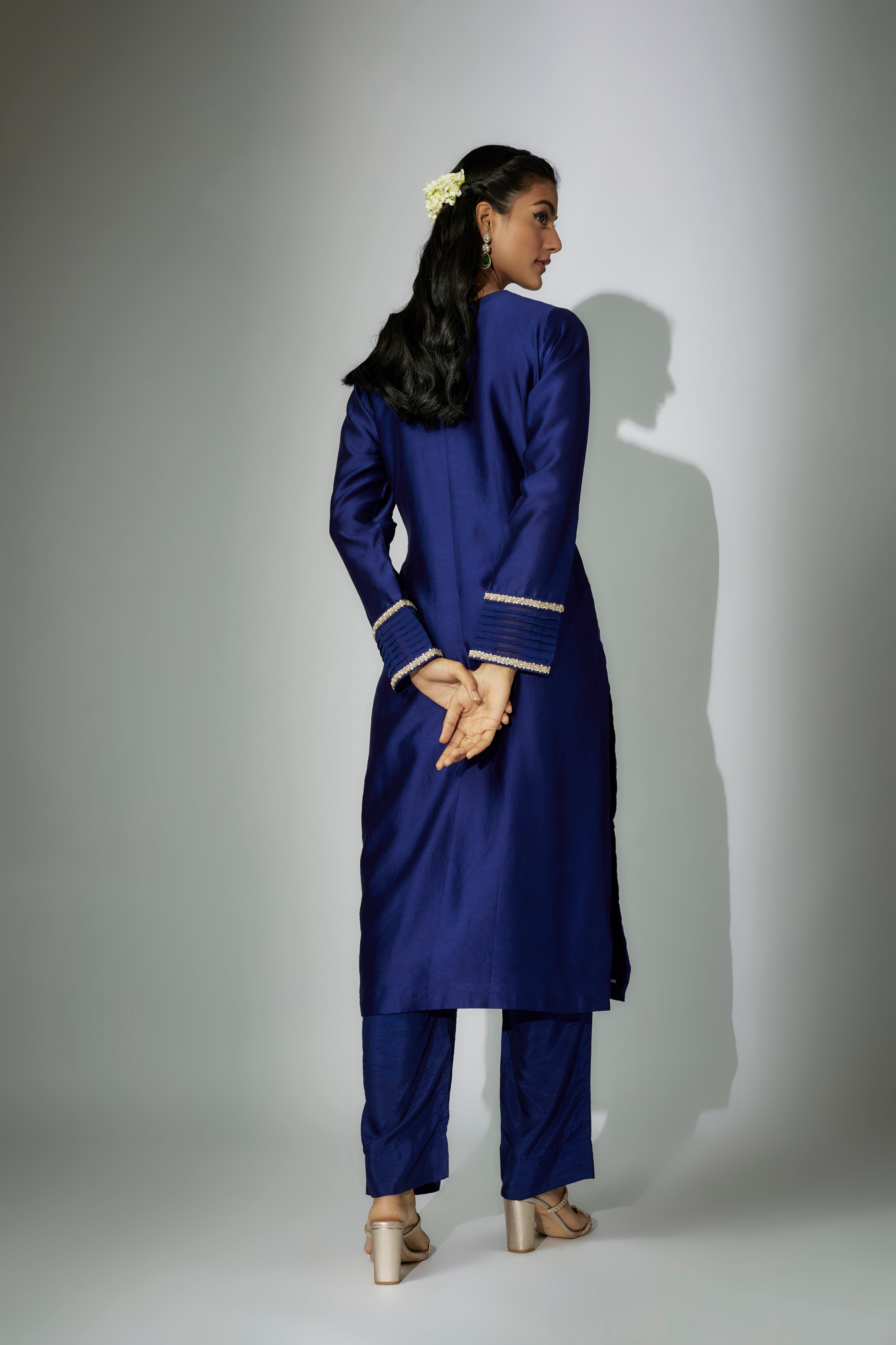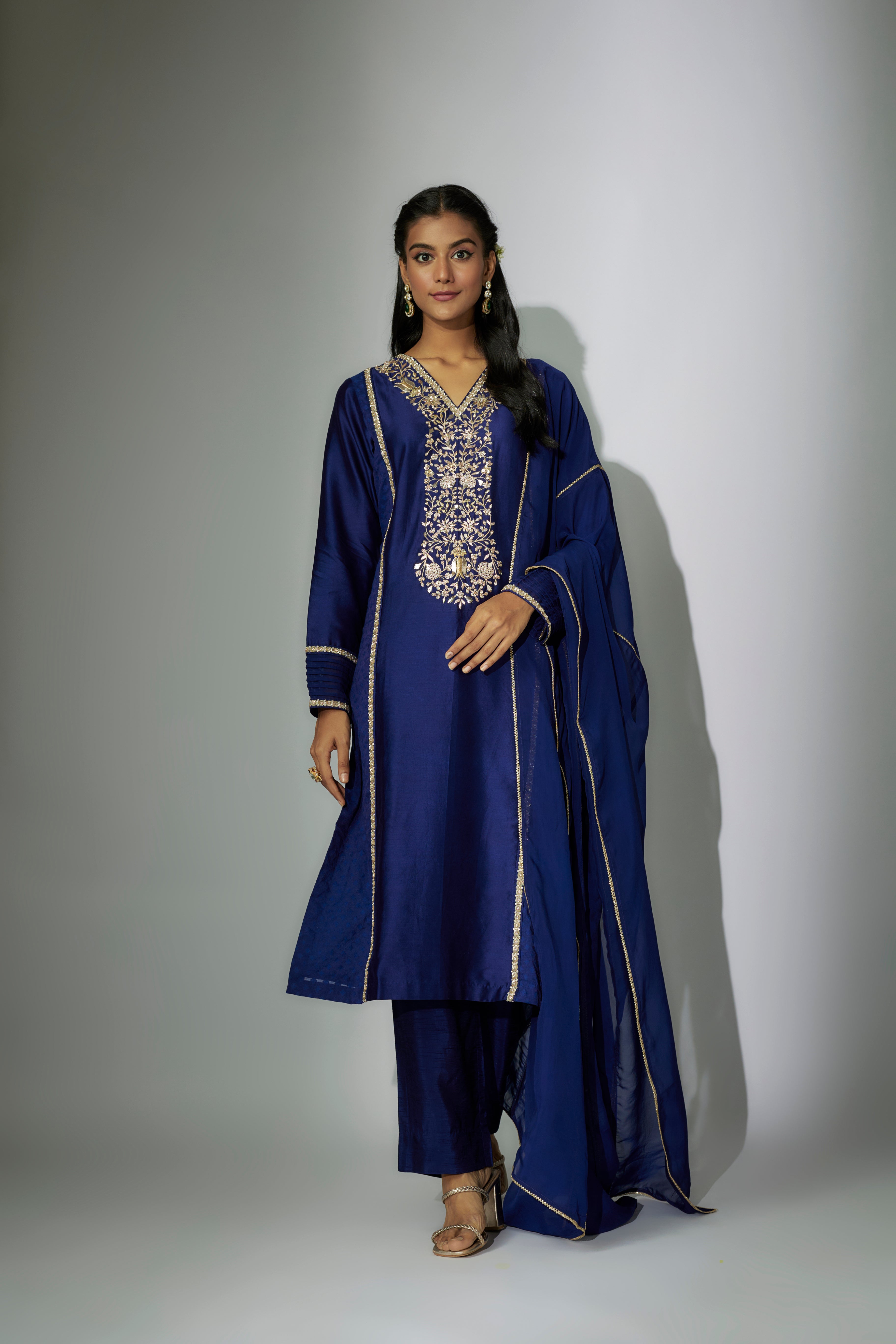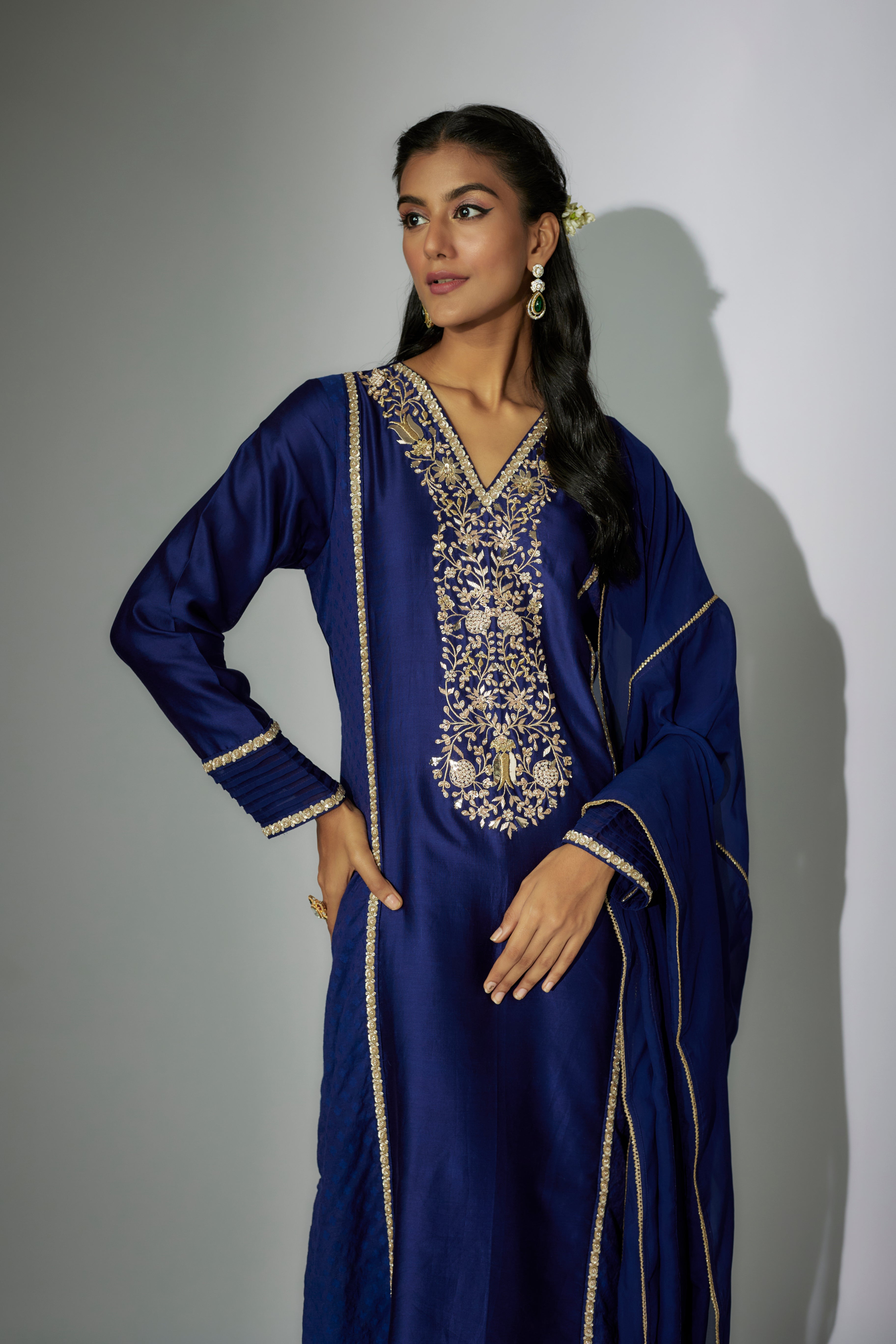 "كورتا أزرق ملكي من تشانديري مع تطريز مارودي وزاردوسي، مع بنطلون مستقيم مطابق من حرير دوبون ودوباتا أورجانزا"