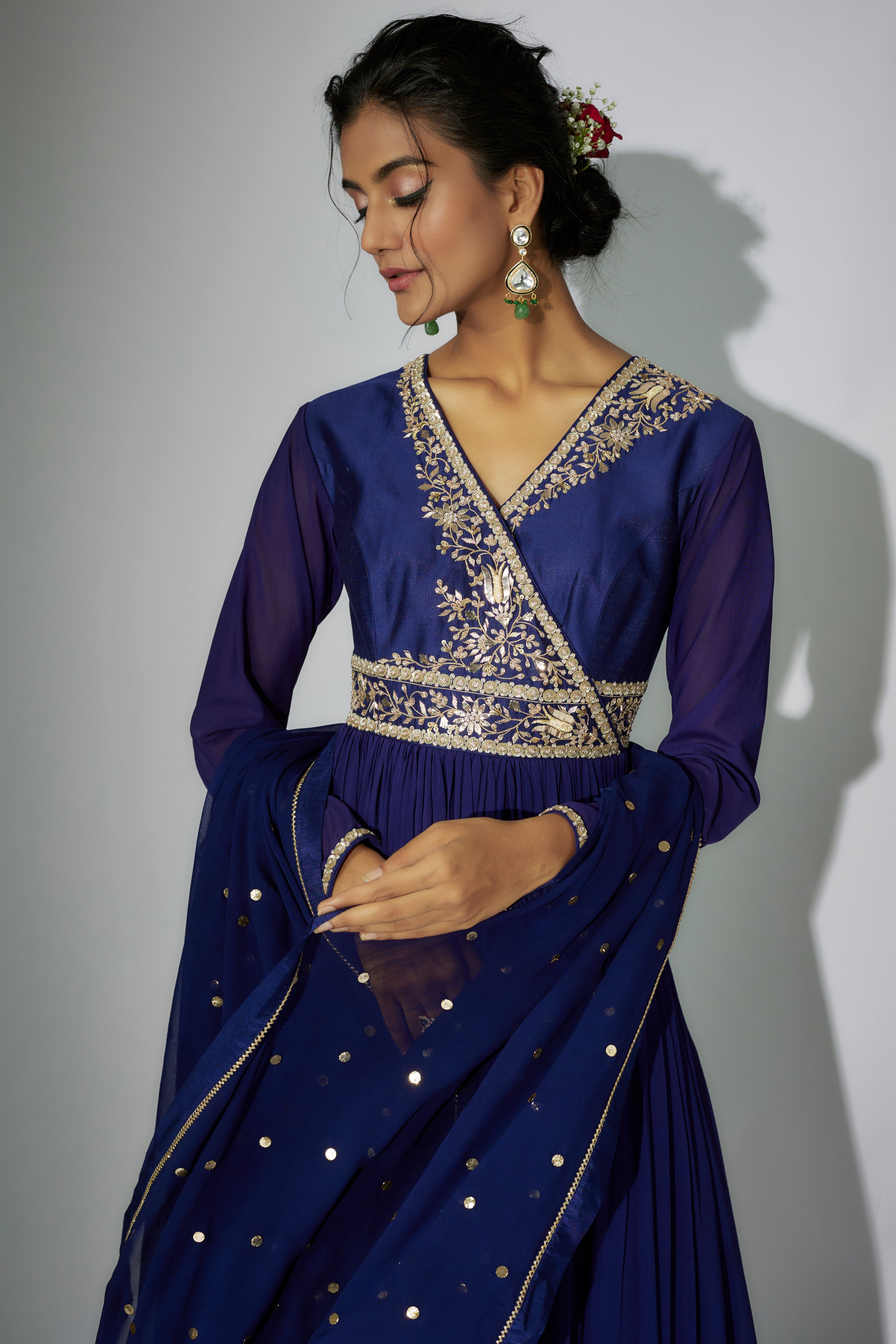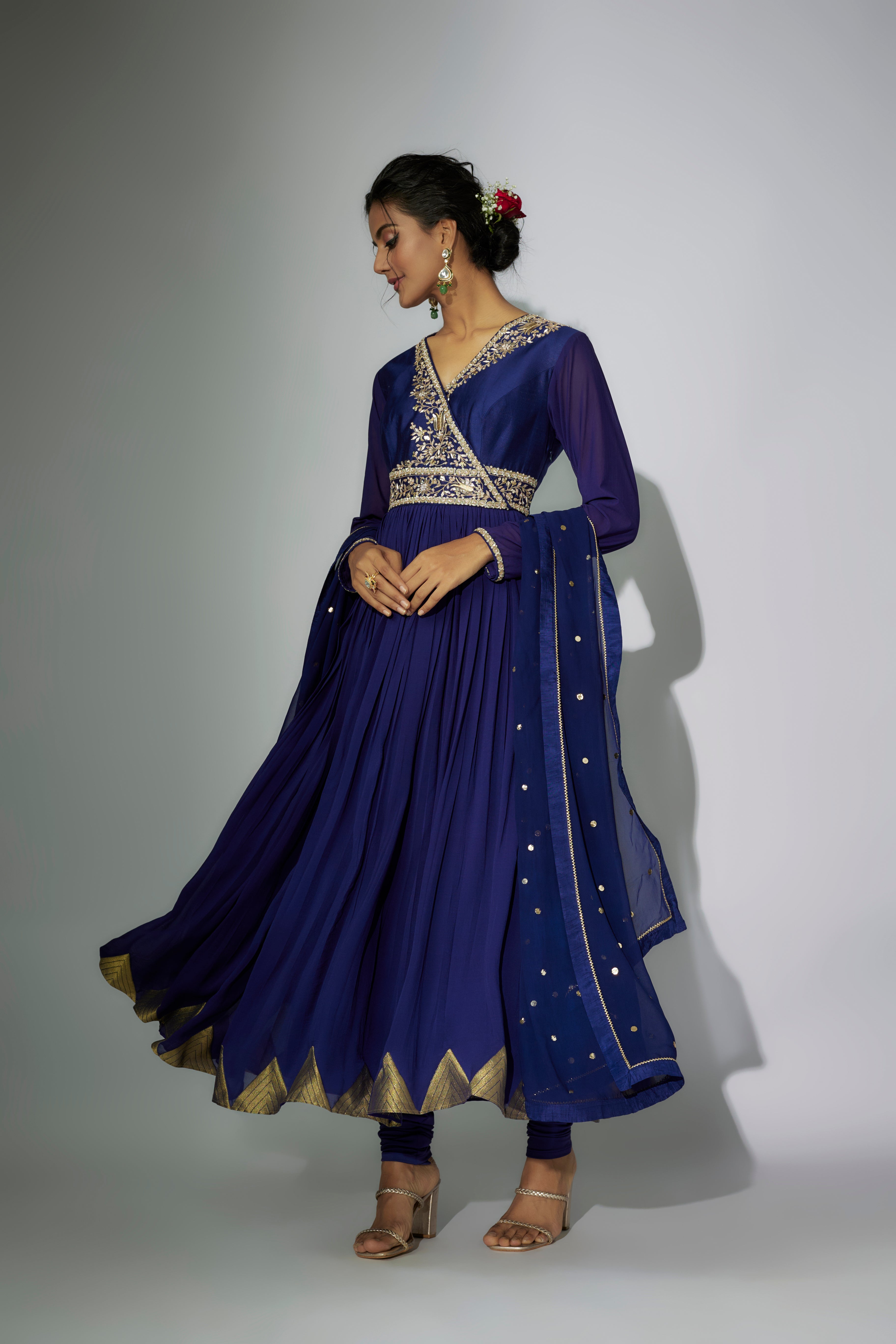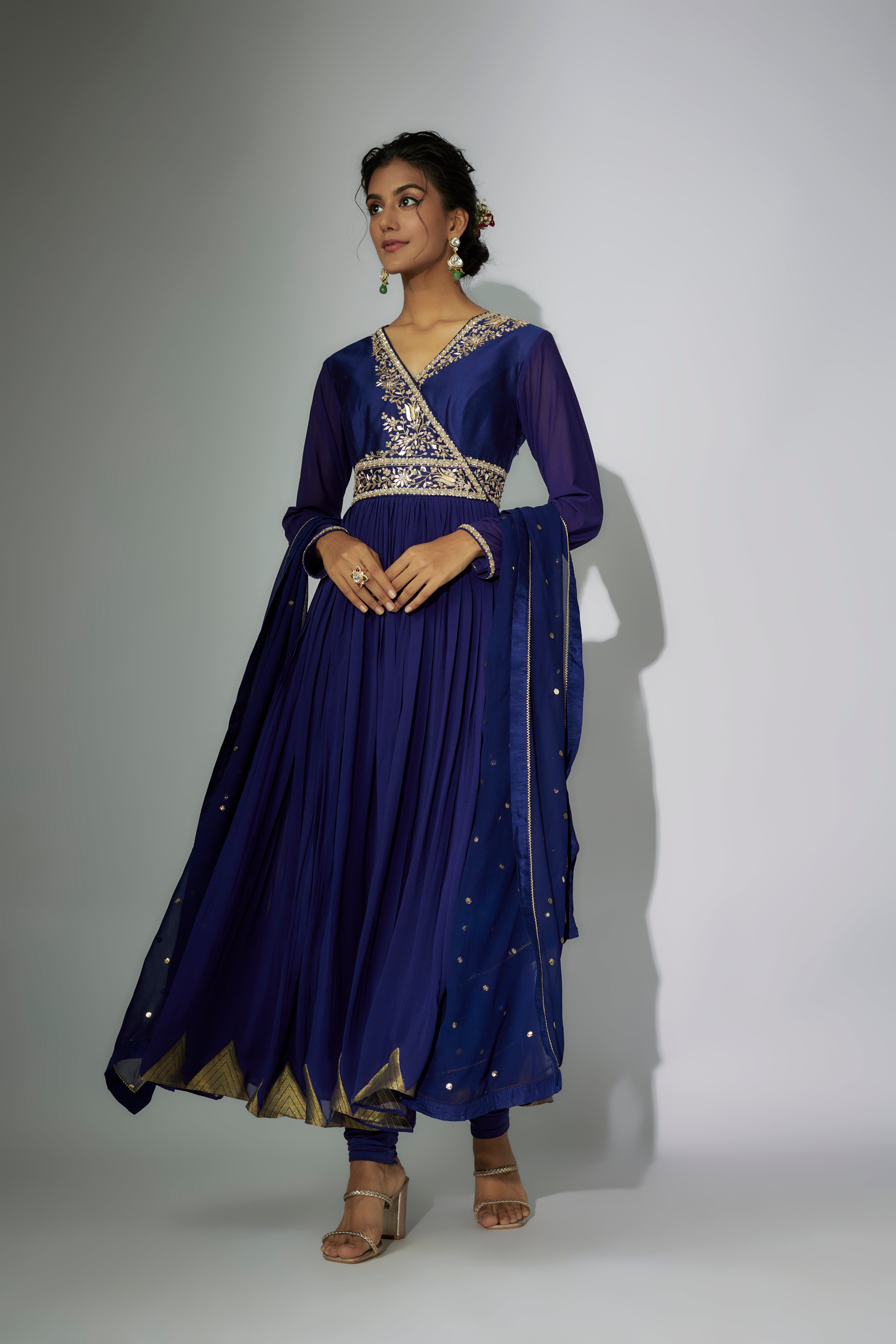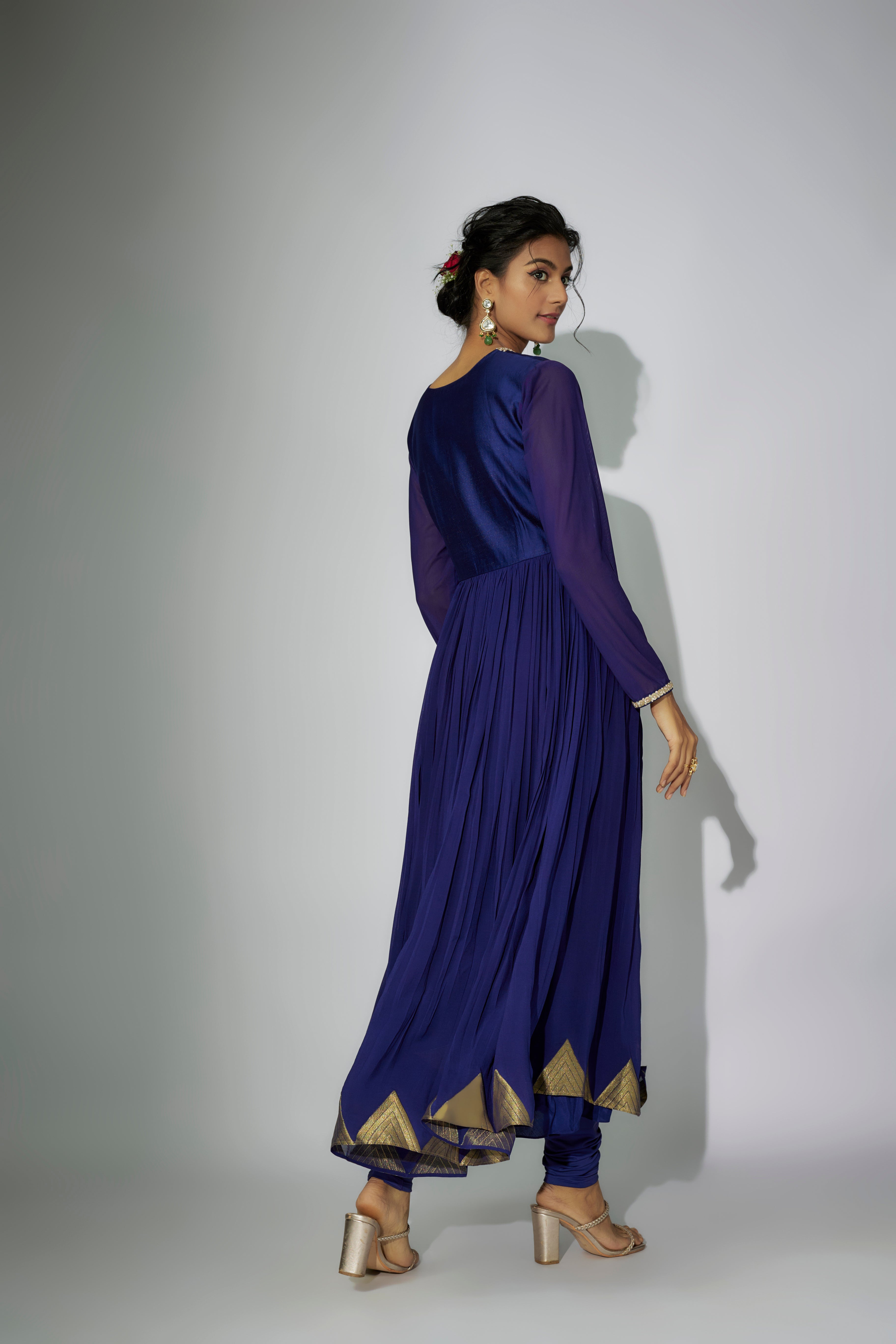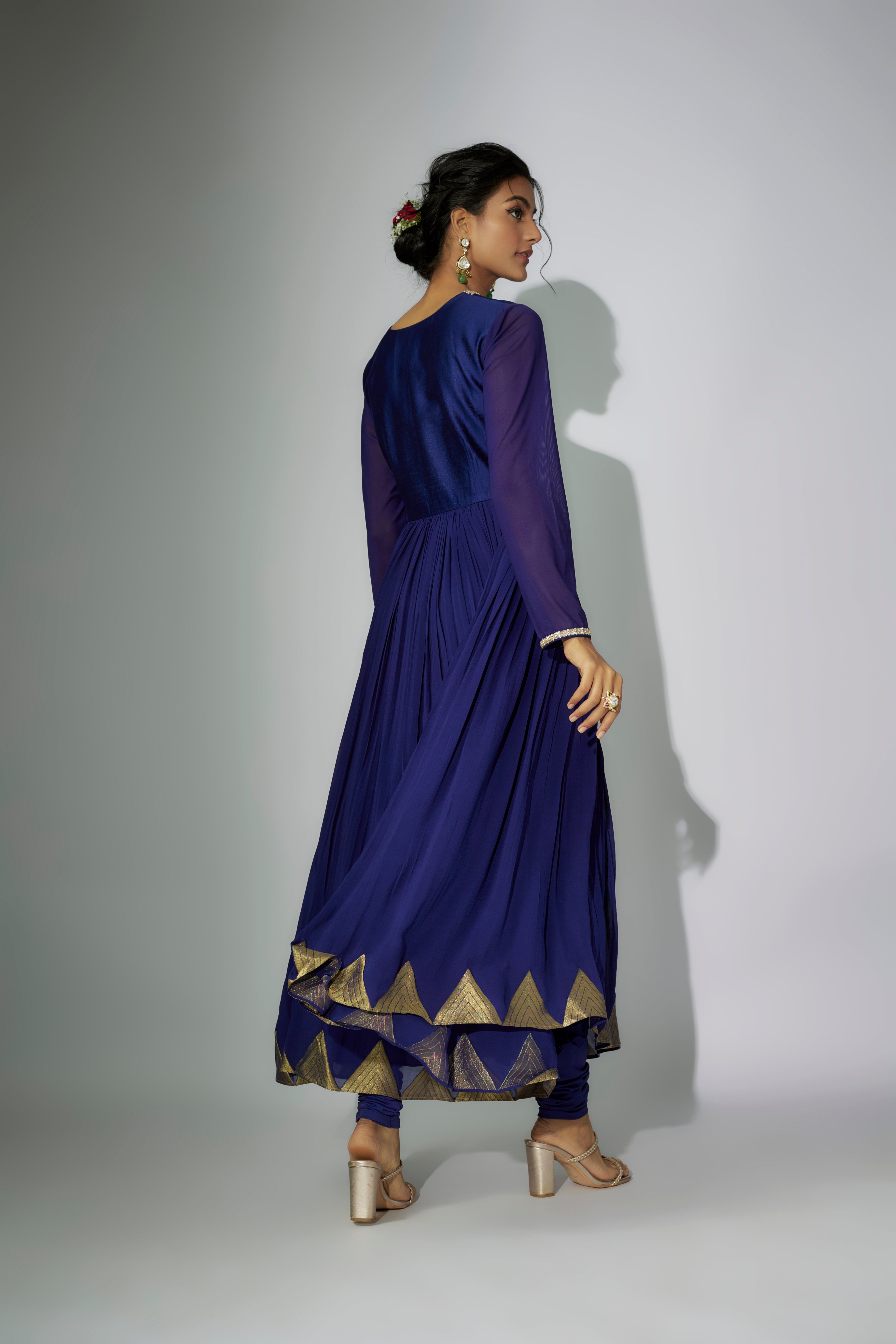 "أناركالي بأسلوب أنغارخا باللون Royal Blue من قماش تشانديري وجورجيت المنسوج مع تطريز زاردوسي ومارودي، مع تشوريدار من ليكرا ودوباتا مزينة بعمل موكايش من جورجيت."