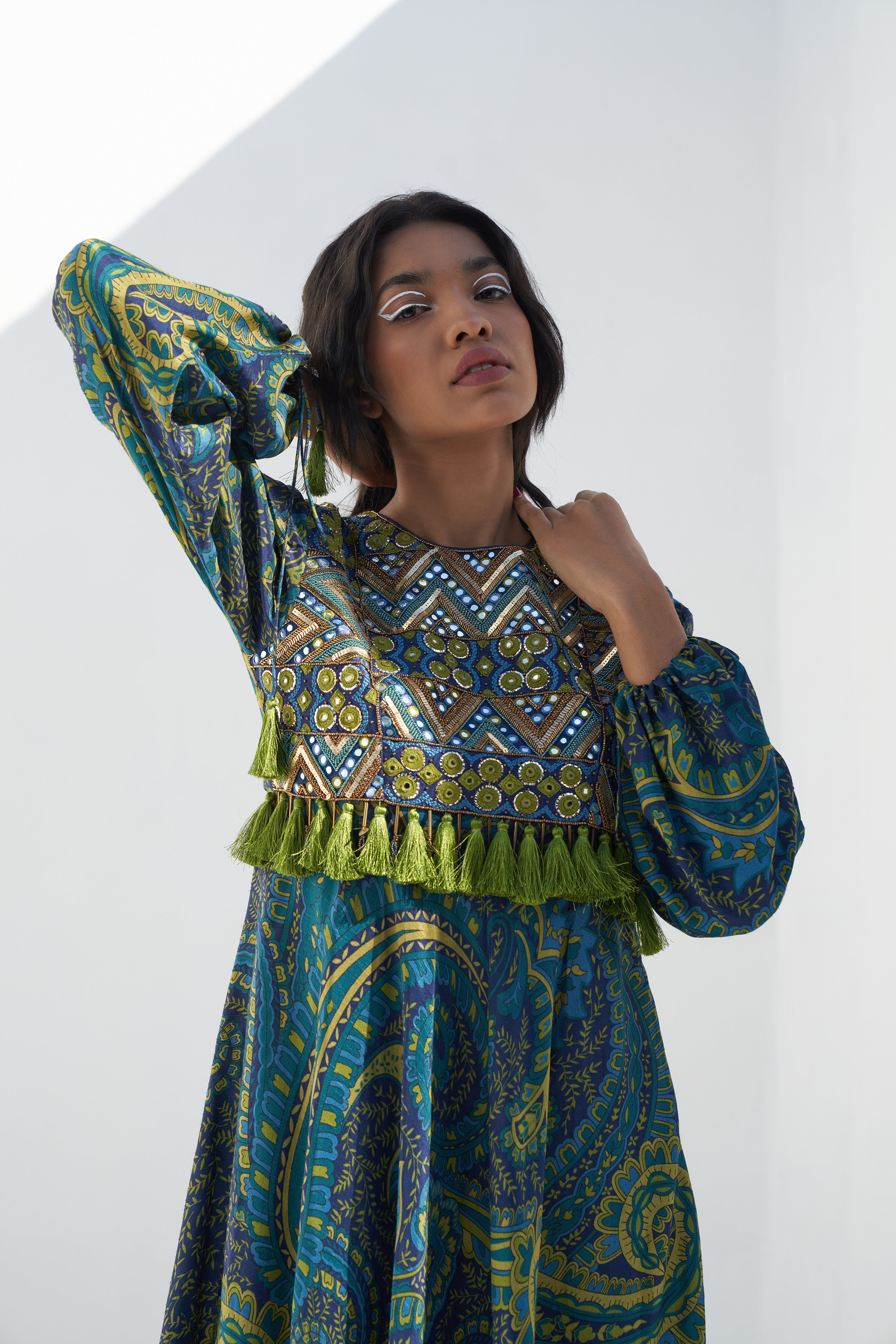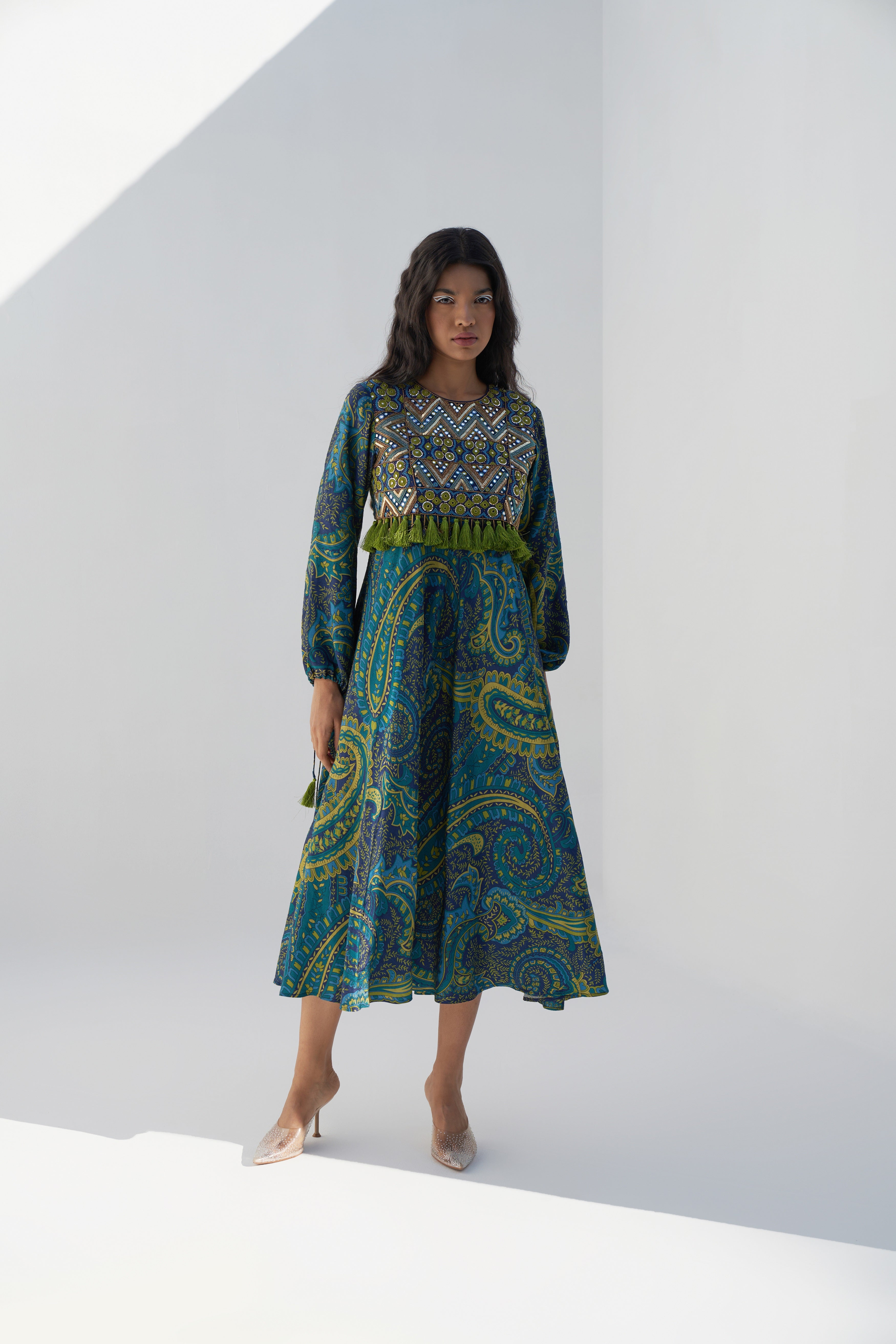 يتميز بفستان ميدي أخضر زمردي من قماش جورجيت مع تفاصيل من الخيوط، وطباعة بايسلي، وأبلا، وتطريز دوري.