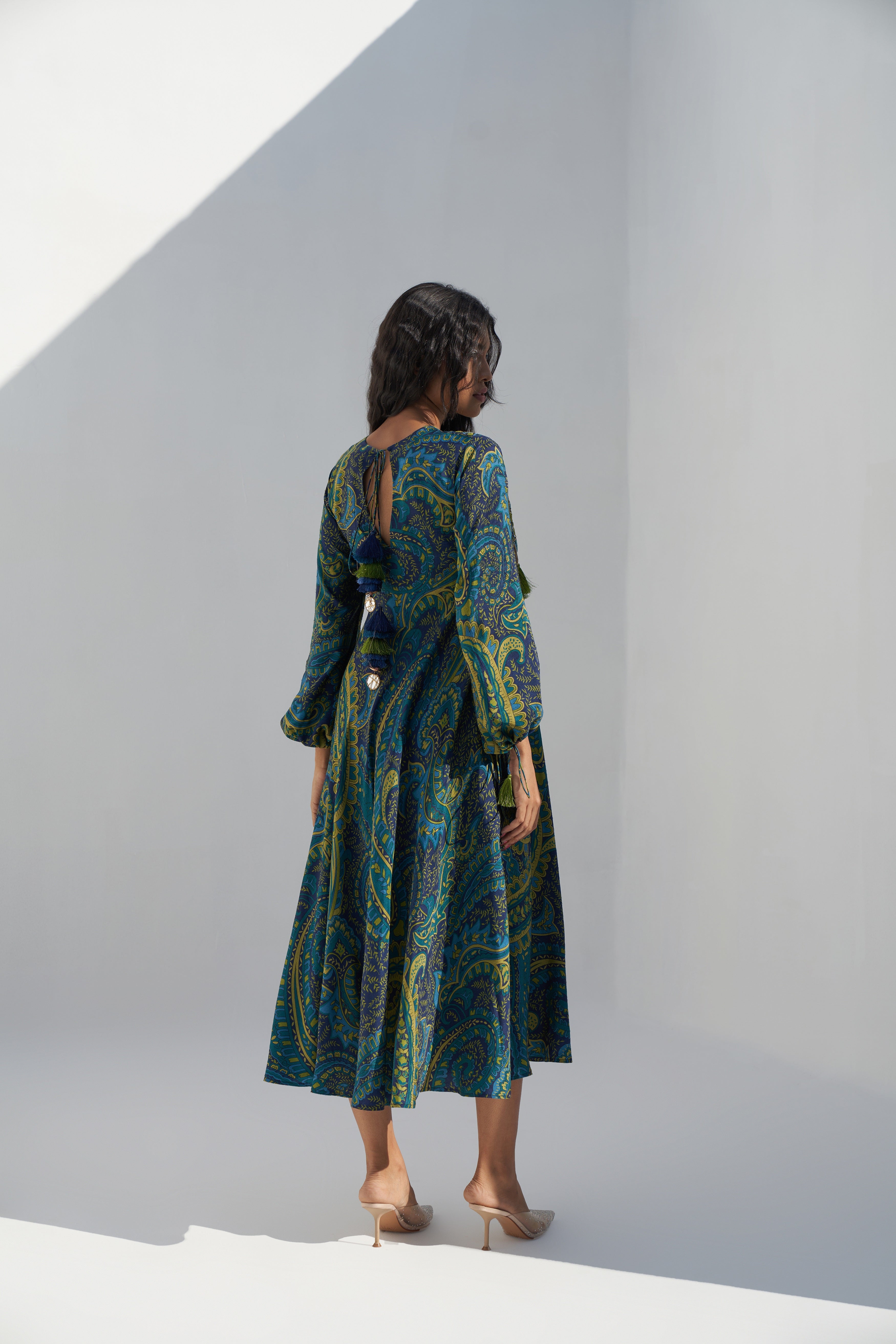 فستان ميدي مطبوع بنقشة بايزيلي من ديوبيون أخضر زمردي