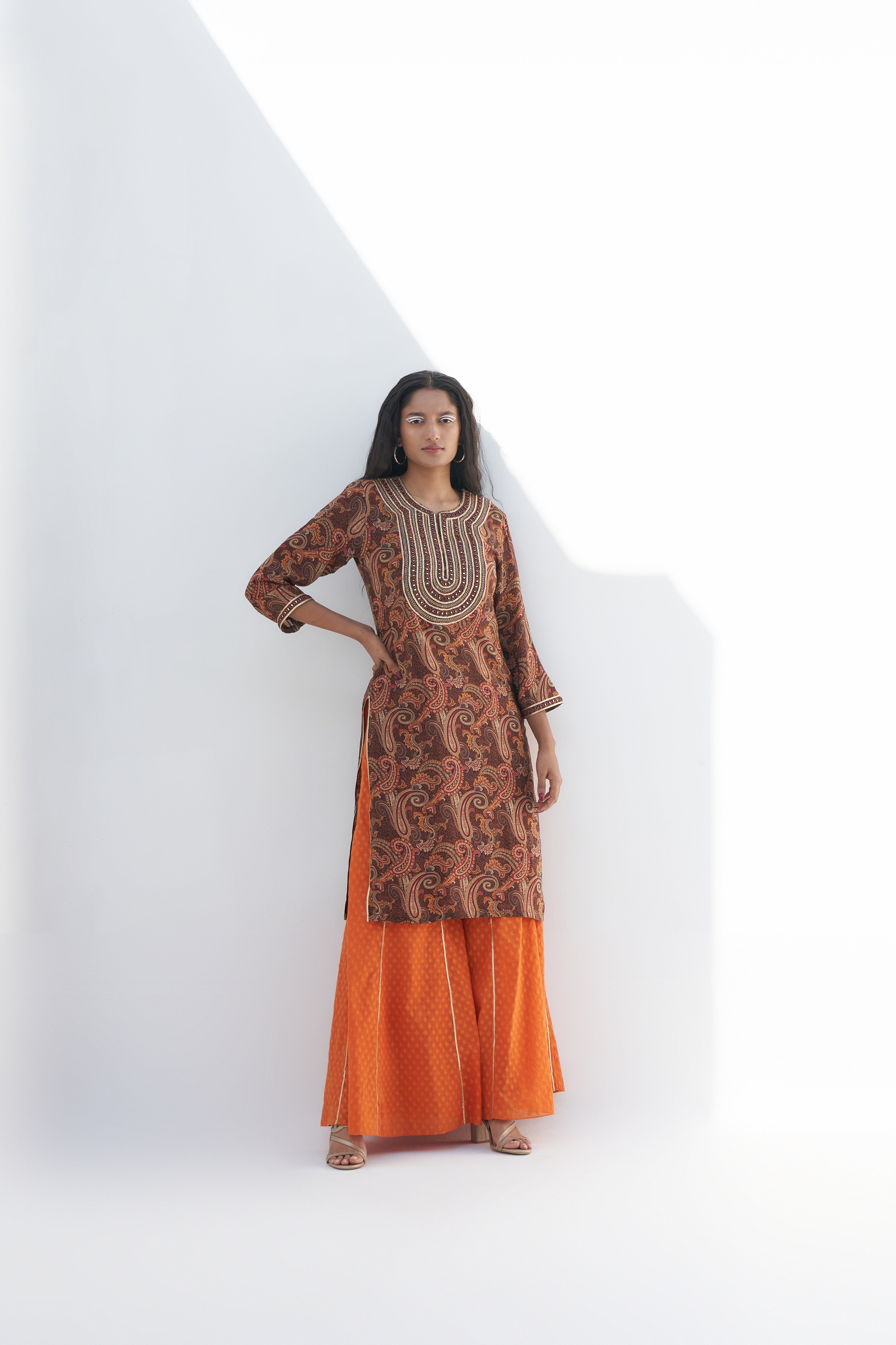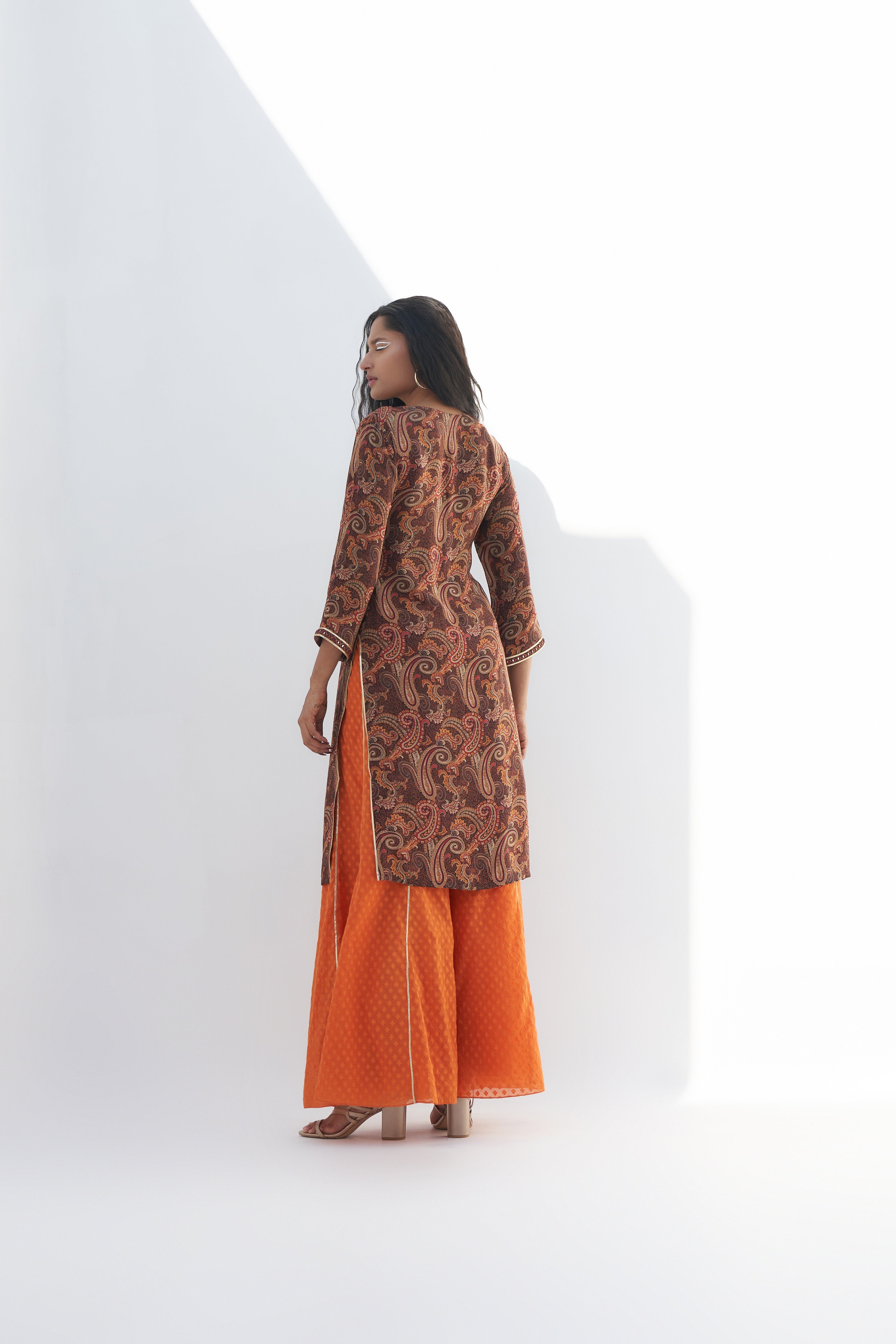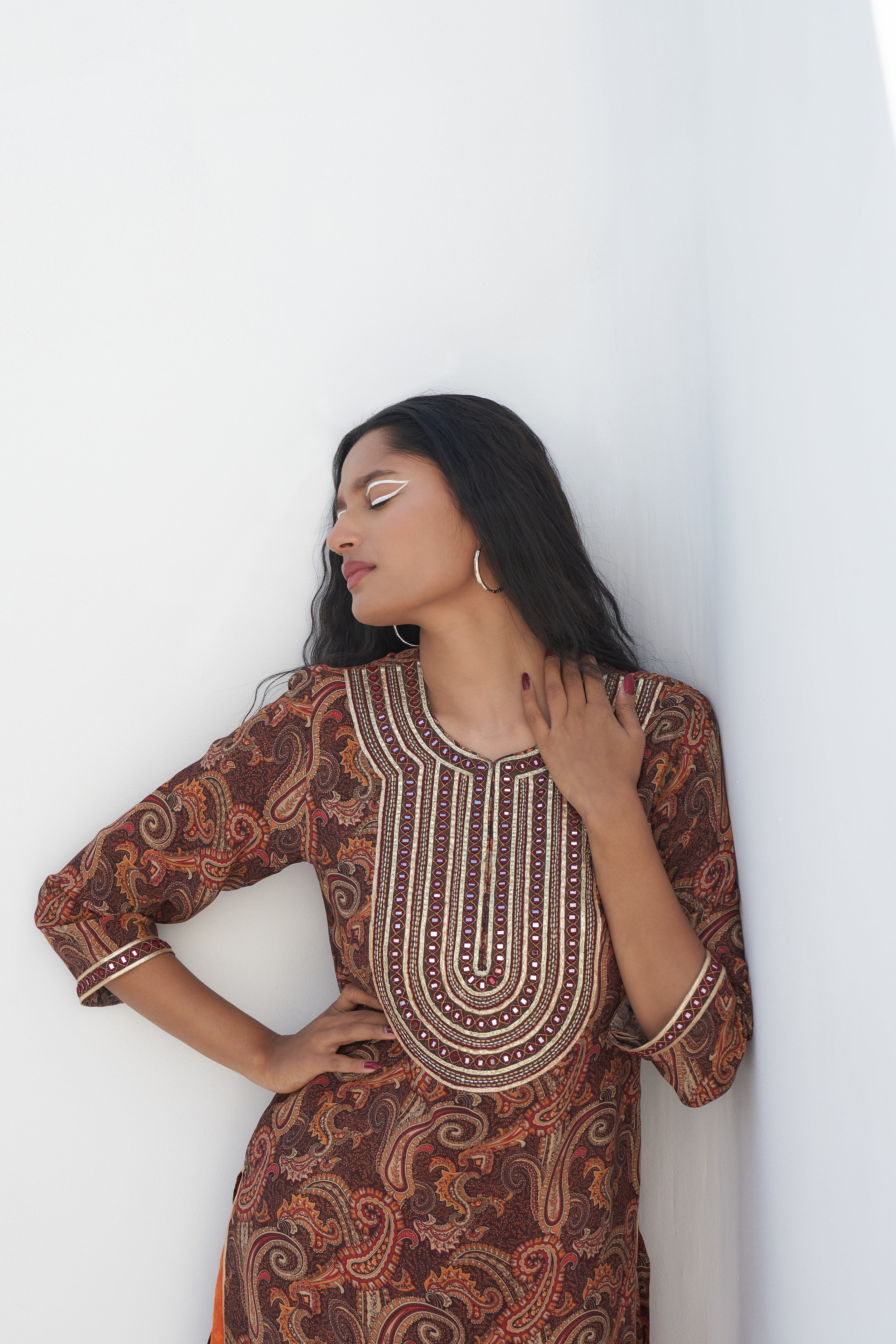 قميص كريب بني بطبعة بيزلي مع عمل مرايا مطرزة على الصدر. يحتوي هذا المنتج على قطعة واحدة فقط.