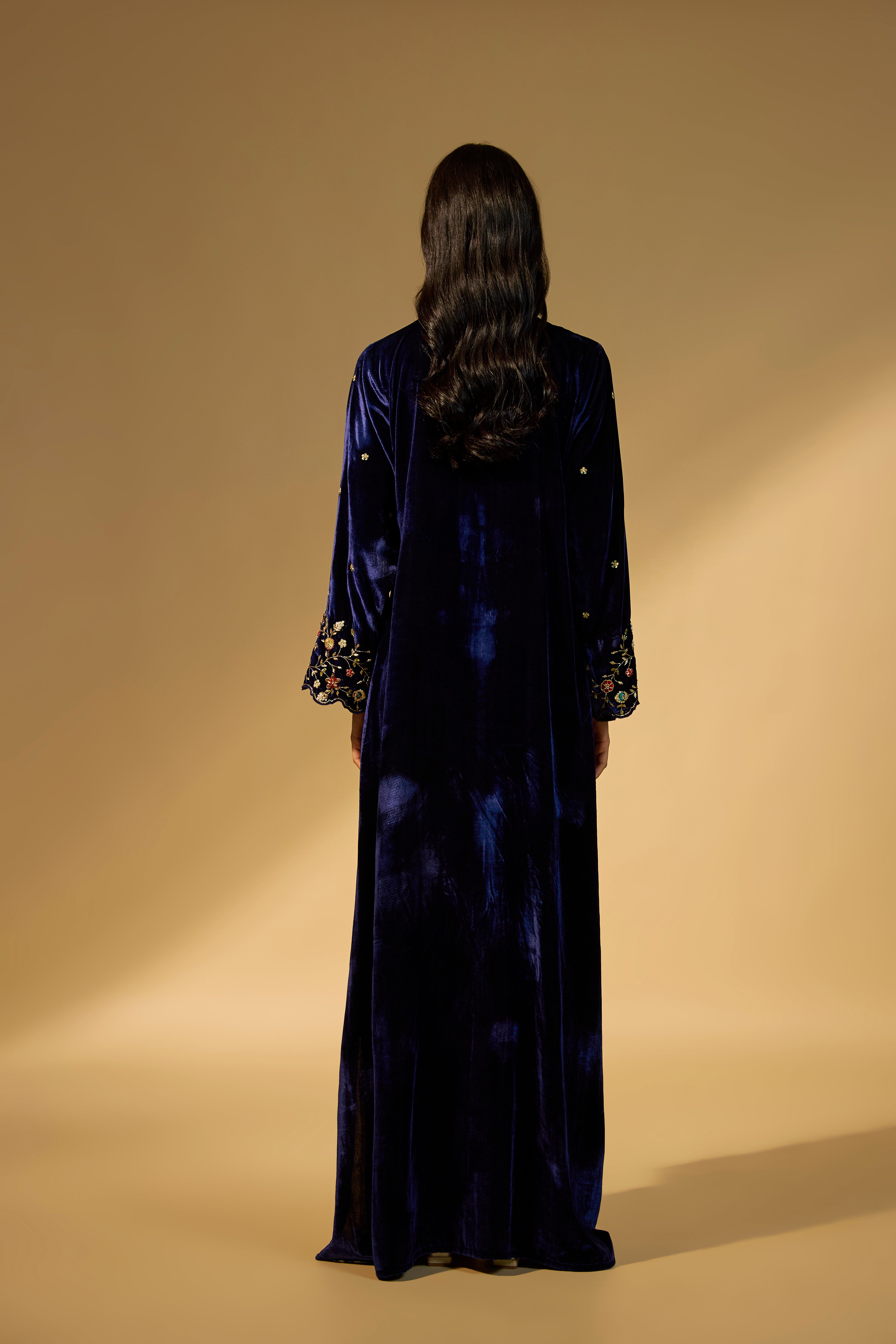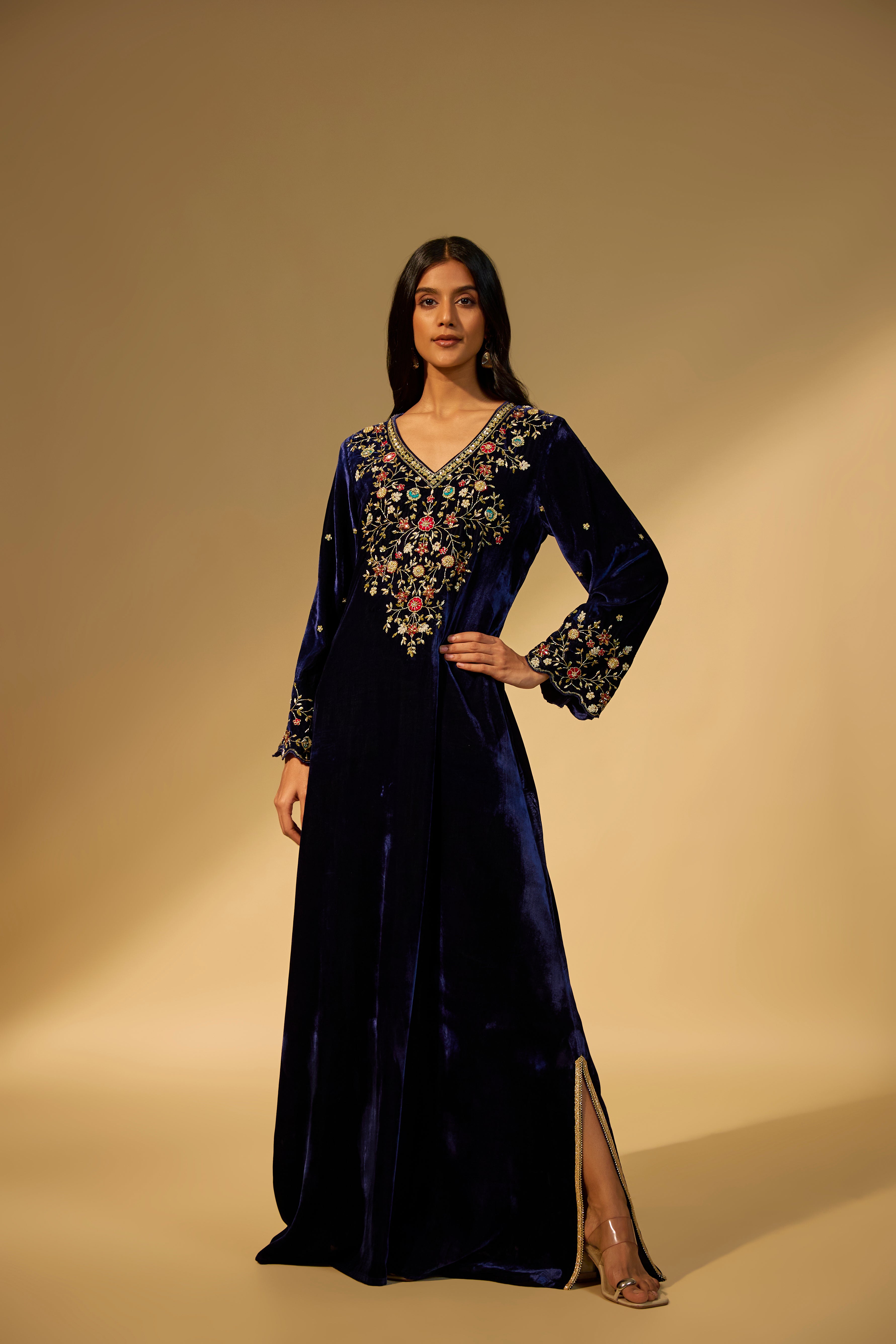 تتميز بفستان كافتان برتقالي من قماش الكريب مطبوع مع ترتر وتطريز لؤلؤ وتفاصيل شرابة ذهبية.