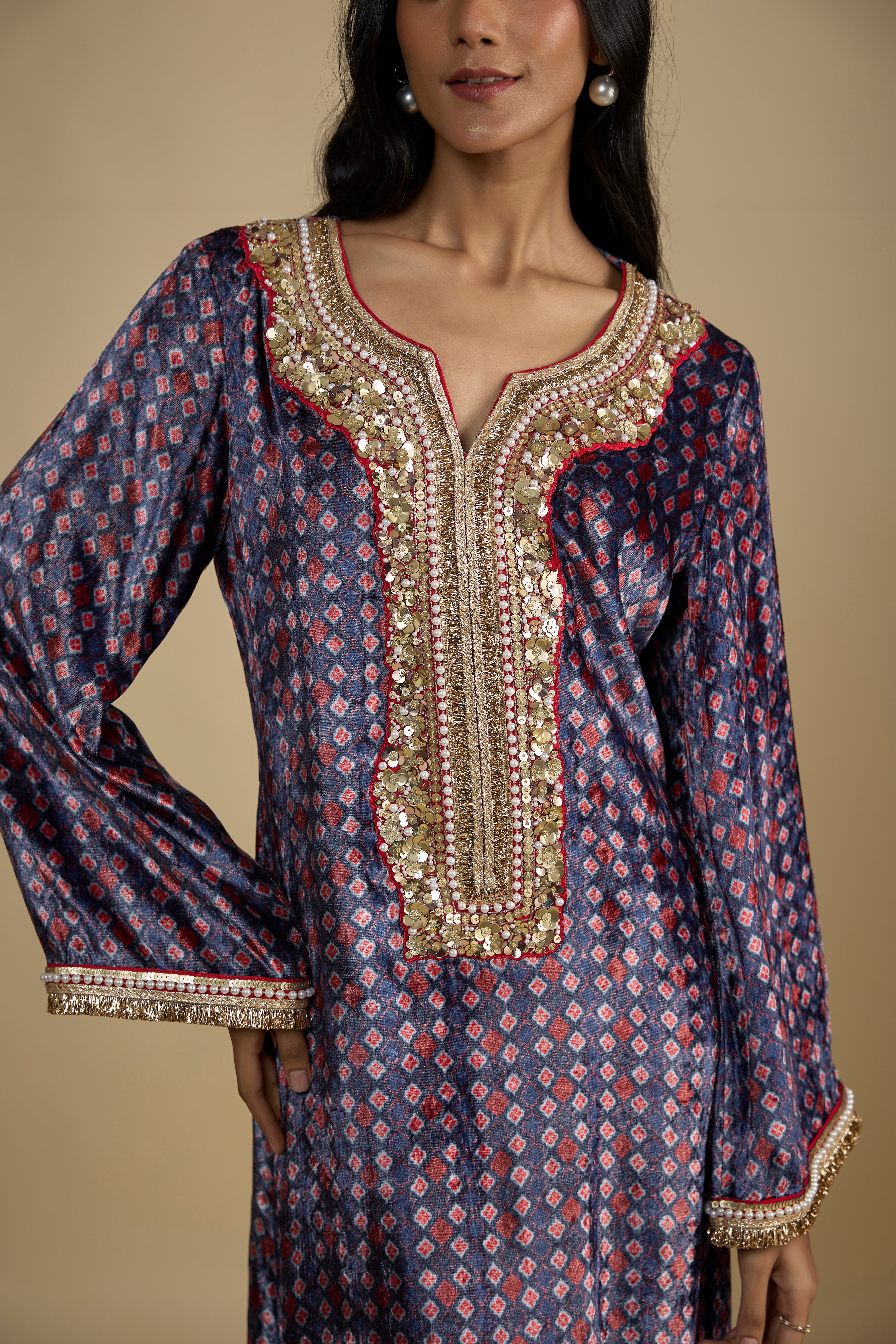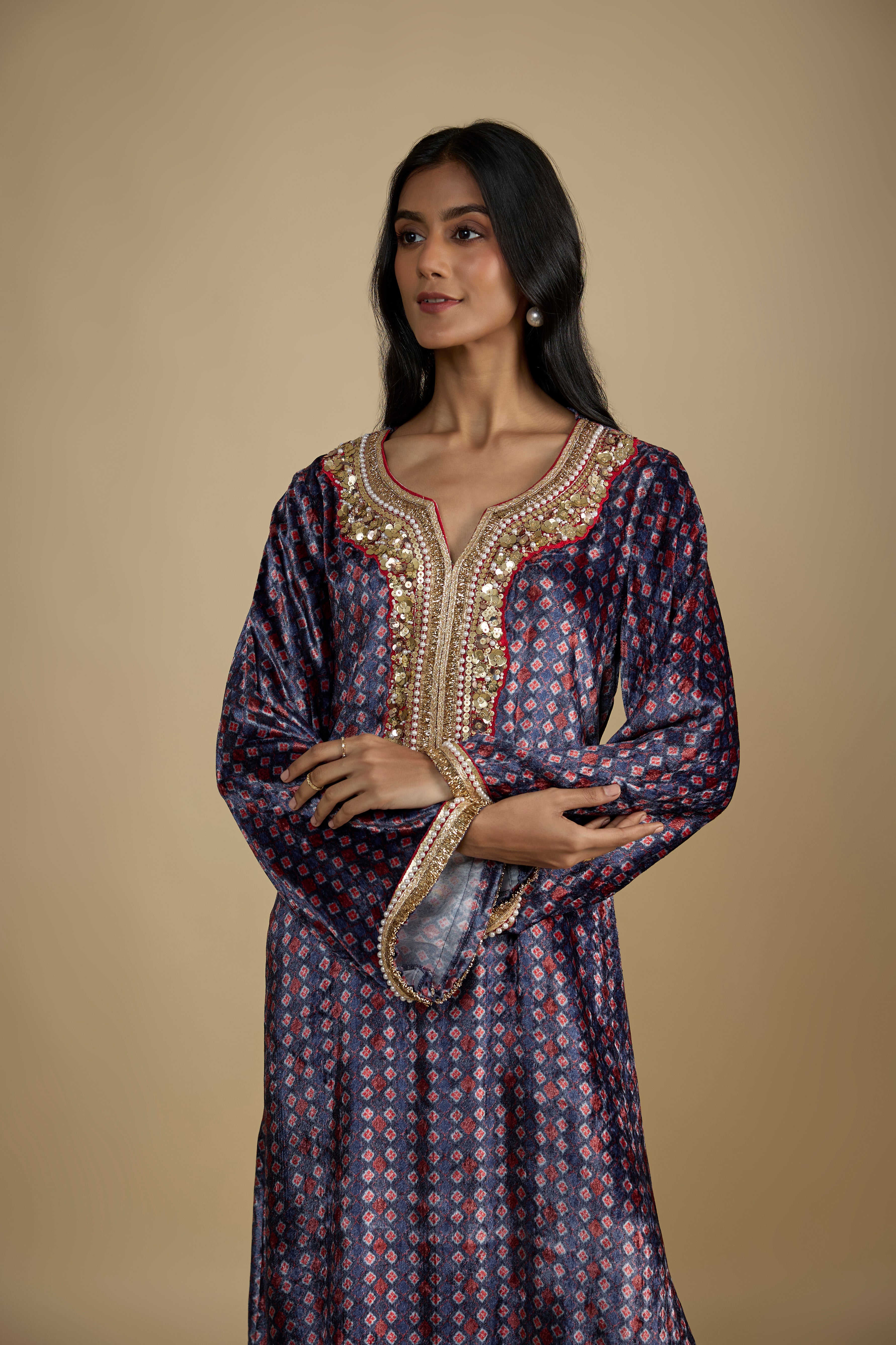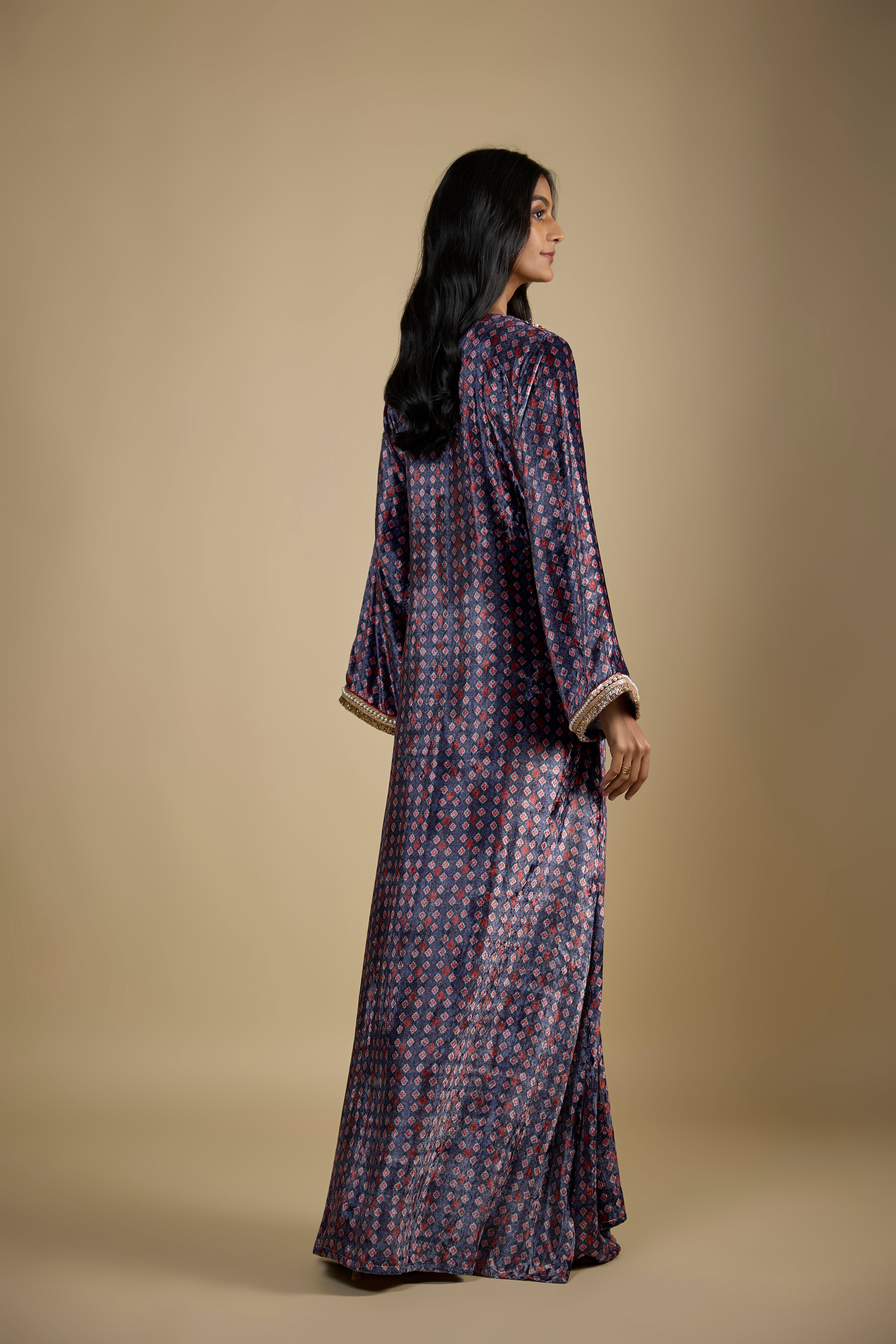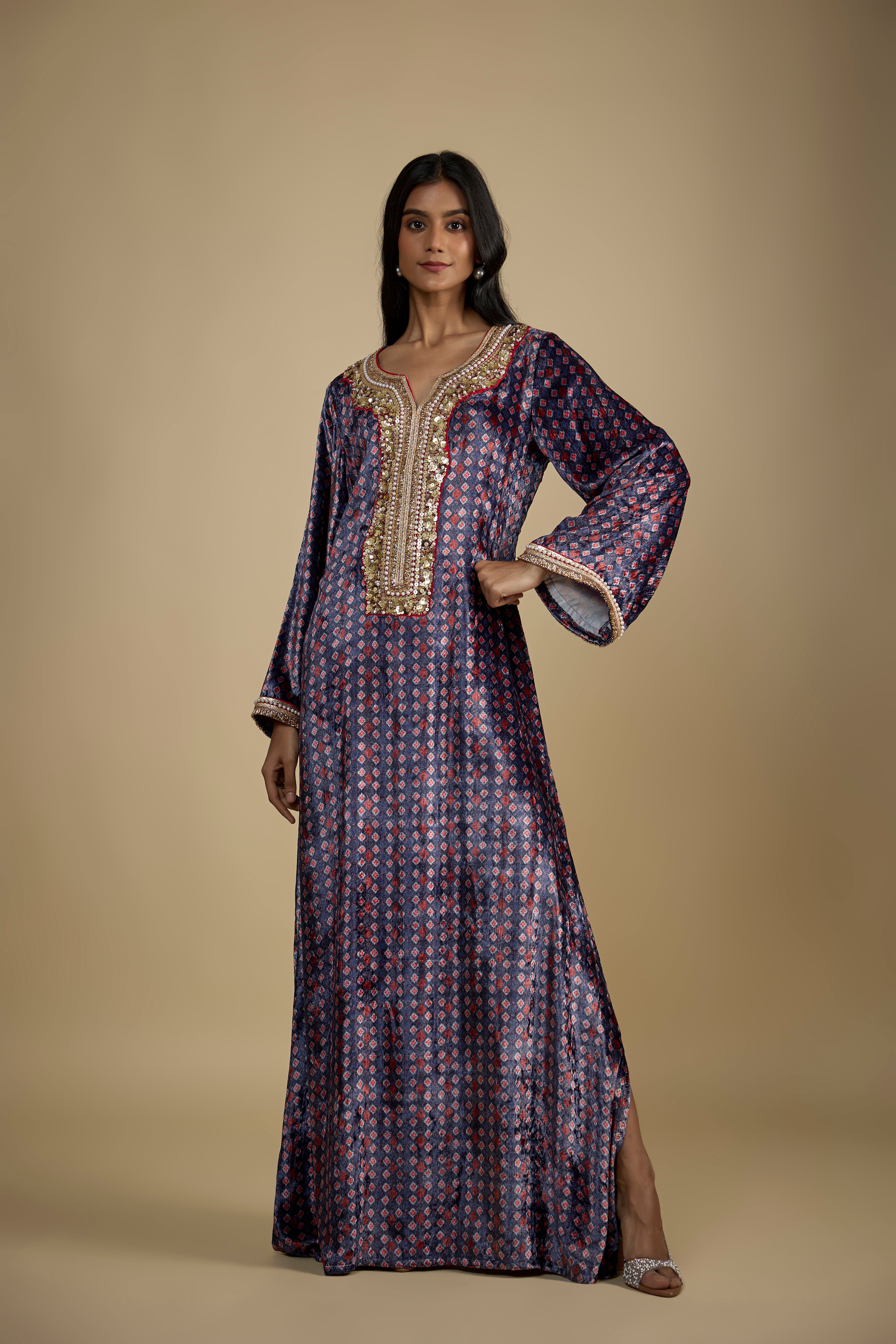 تتميز بفستان كافتان برتقالي من قماش الكريب مطبوع مع ترتر وتطريز لؤلؤ وتفاصيل شرابة ذهبية.