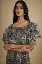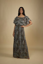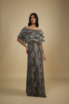 يتميز بفستان كافتان متعدد الطبقات بطبعة ثعبان بدون أكتاف مع قاعدة كريب ودرابيه جورجيت في الأعلى مع ترتر وتطريز لؤلؤي، شرابات وتفاصيل حافة ذهبية.
