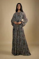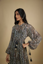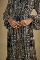 يتميز بفستان كافتان متعدد الطبقات بطبعة ثعبان بدون أكتاف مع قاعدة كريب ودرابيه جورجيت في الأعلى مع ترتر وتطريز لؤلؤي، شرابات وتفاصيل حافة ذهبية.