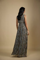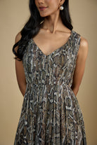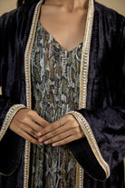 يتميز بفستان كافتان متعدد الطبقات بطبعة ثعبان بدون أكتاف مع قاعدة كريب ودرابيه جورجيت في الأعلى مع ترتر وتطريز لؤلؤي، شرابات وتفاصيل حافة ذهبية.