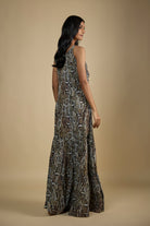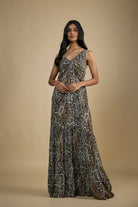 يتميز بفستان كافتان متعدد الطبقات بطبعة ثعبان بدون أكتاف مع قاعدة كريب ودرابيه جورجيت في الأعلى مع ترتر وتطريز لؤلؤي، شرابات وتفاصيل حافة ذهبية.