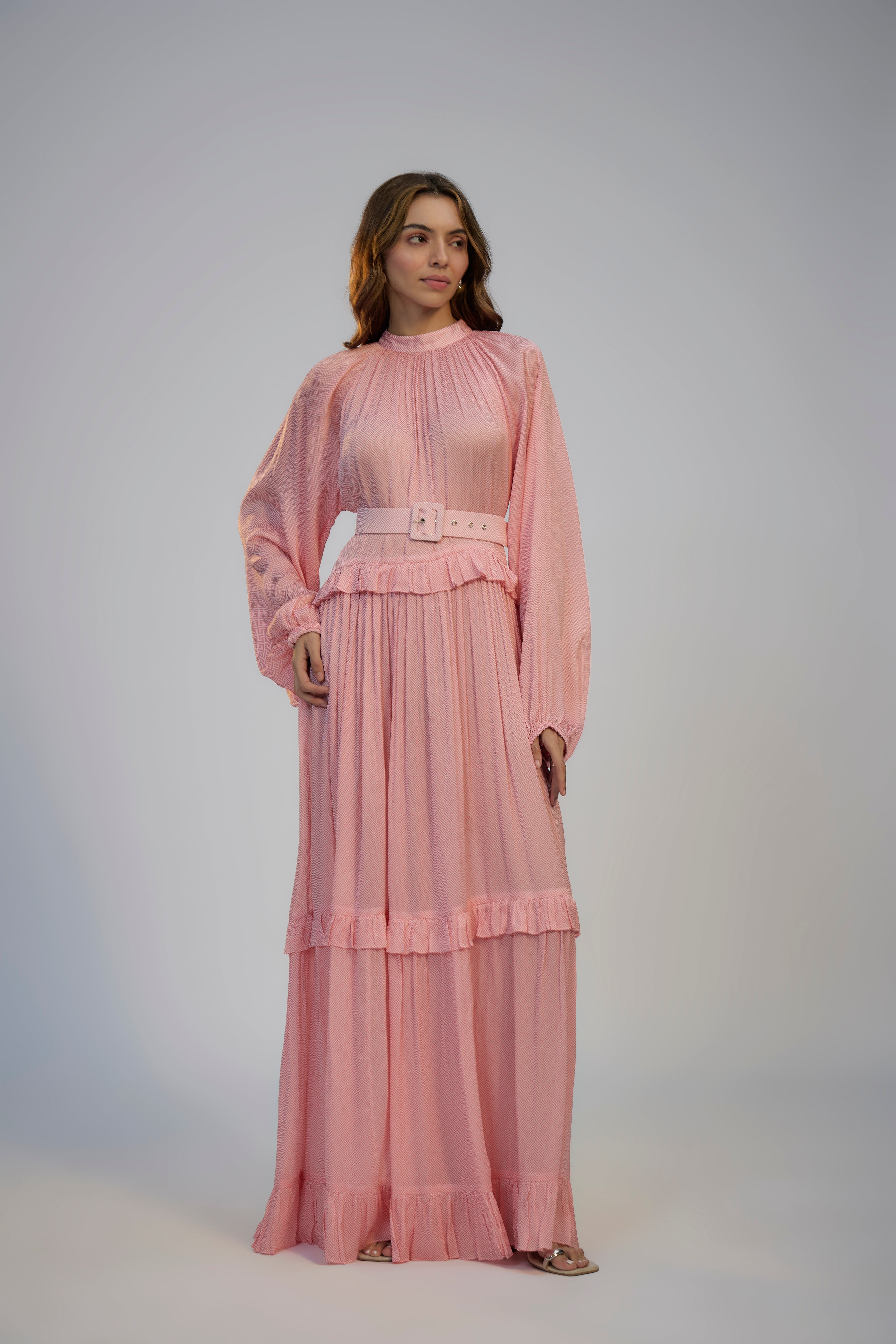 يتميز بفستان مطبوع من القطن بلون وردي فاتح مع حزام مطرز من الكريب.